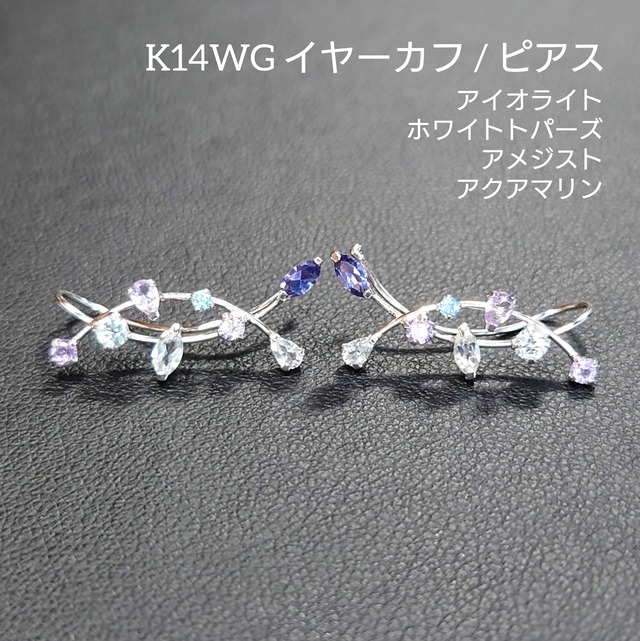 K14WG マルチ イヤーカフ/ピアス Iolite Amethyst White Topaz Aquamarine