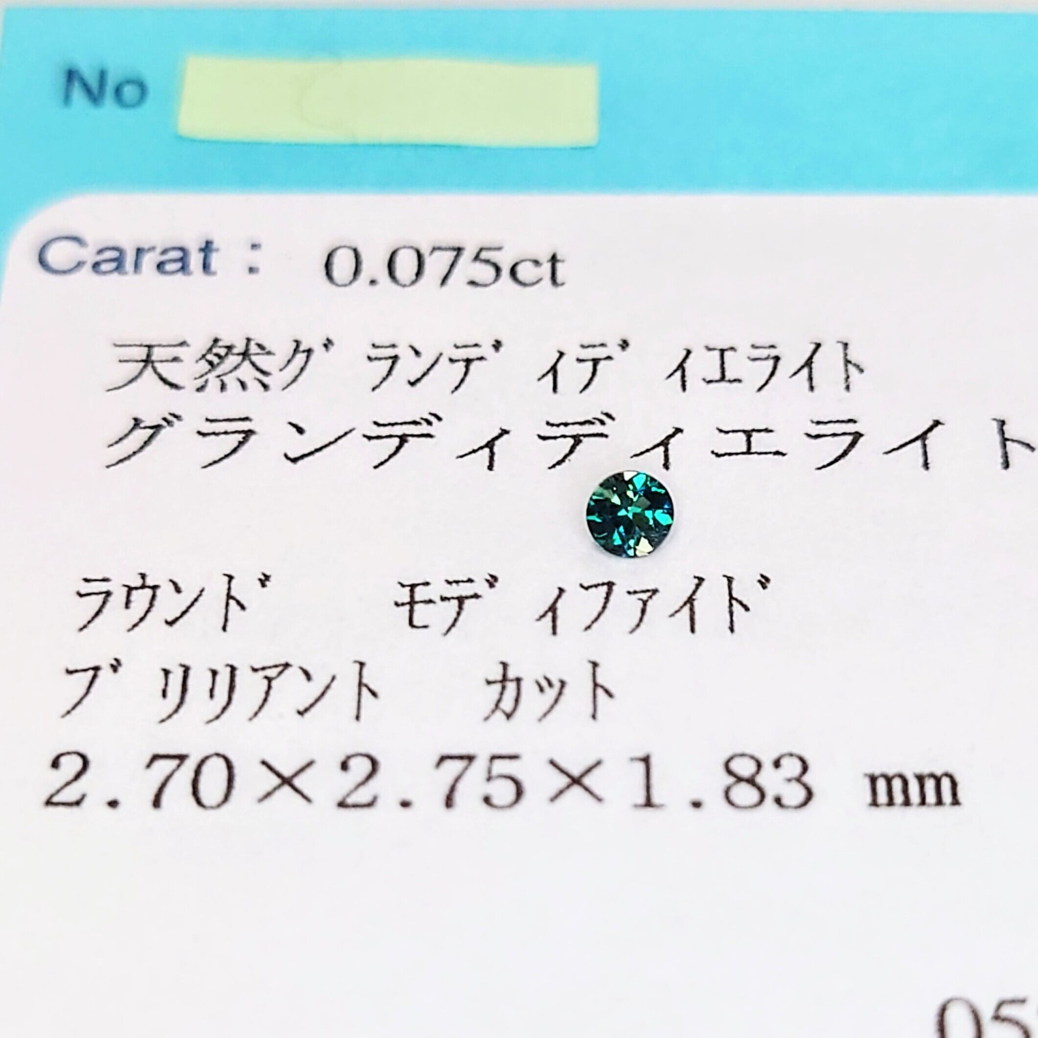鮮やかなブルーグリーンの輝きを放つ、極めて希少な宝石「グランディディエライト」0.075カラットのルースです。