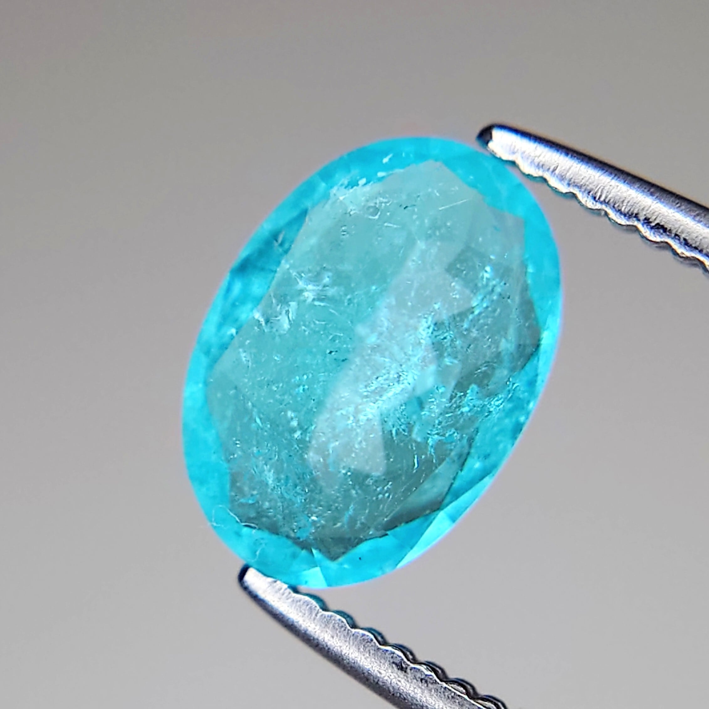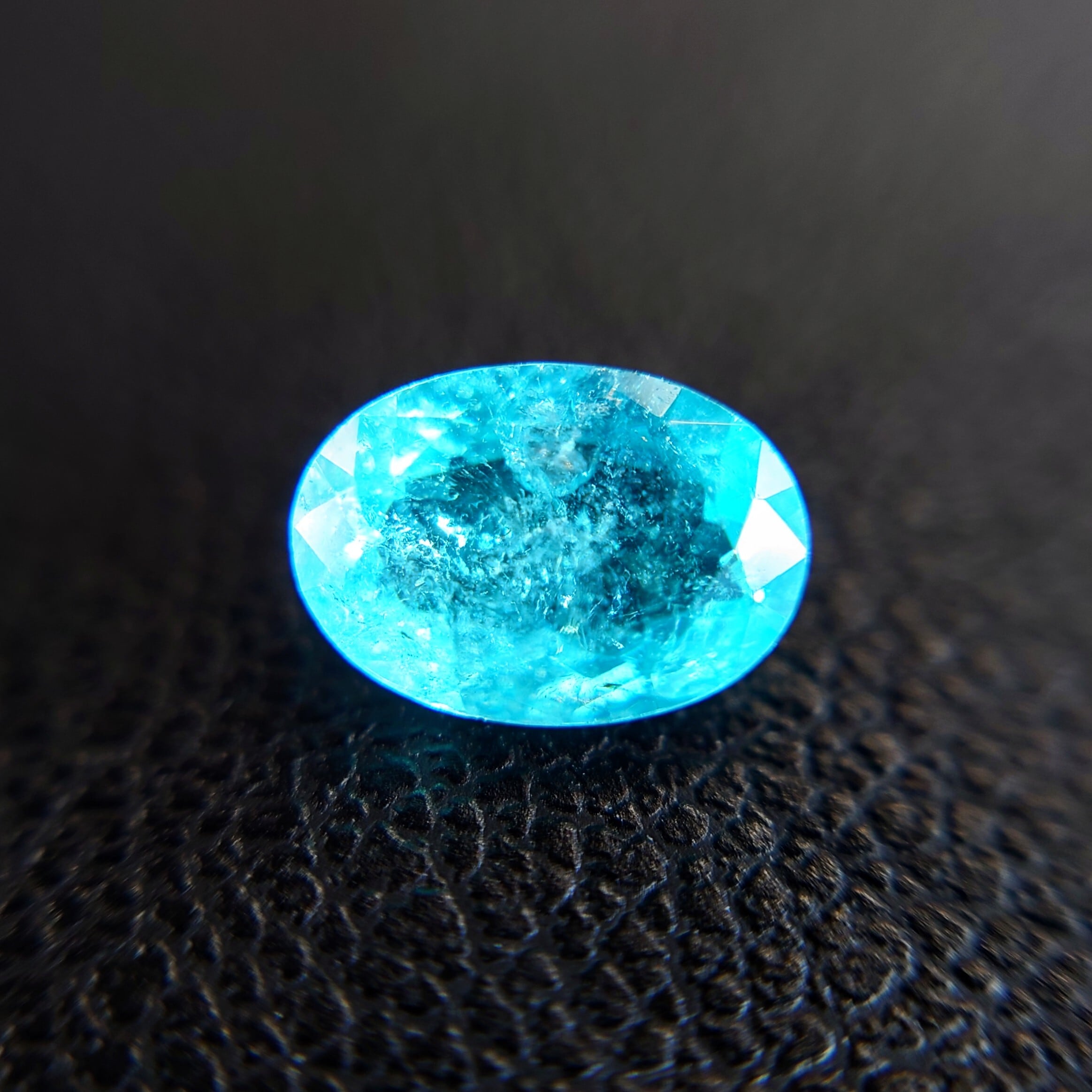 パライバトルマリンならではの、まるで南国の海を思わせるネオンブルーが魅力。光の下で鮮やかに輝きます。