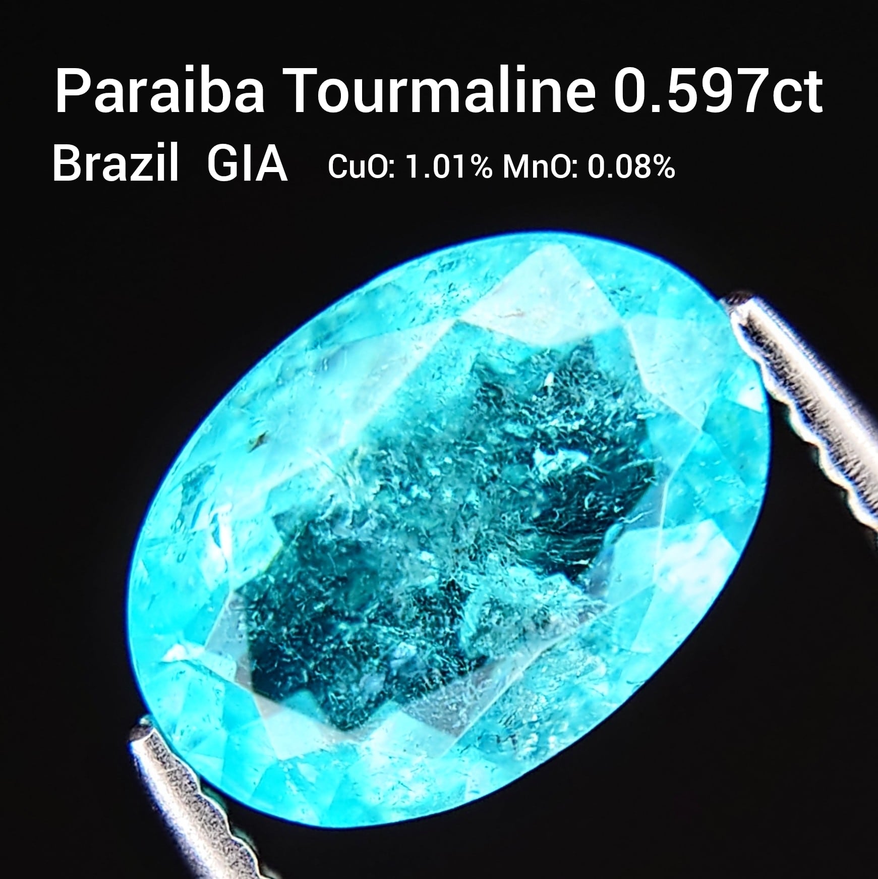 パライバトルマリンの中でも特に人気の高いブラジル産。銅(CuO 1.01%)とマンガン(MnO 0.08%)を含有し、しっかりと産地・成分が証明されています。