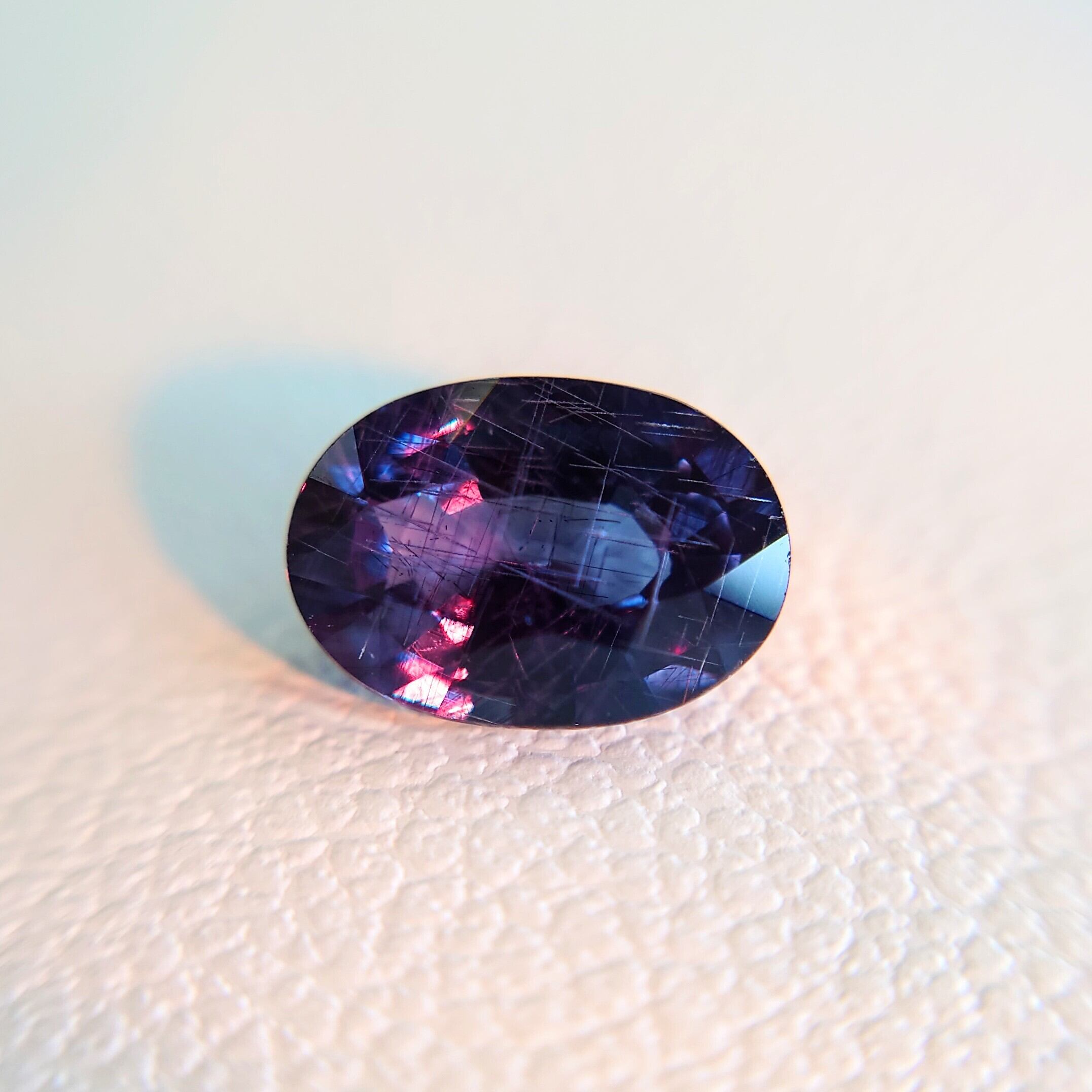 こちらはマダガスカル・ベキリー鉱山由来とされる、希少な「ベキリーブルーガーネット」1.115カラットのルースです。最大の特徴は、光源によって色が大きく変化する“カラーチェンジ効果”です。自然光や蛍光灯下では青みを帯びたブルー~ブルーグリーン、白熱灯やペンライトなど赤系光源下では鮮やかなパープル~レッドへと劇的に色が変わります。