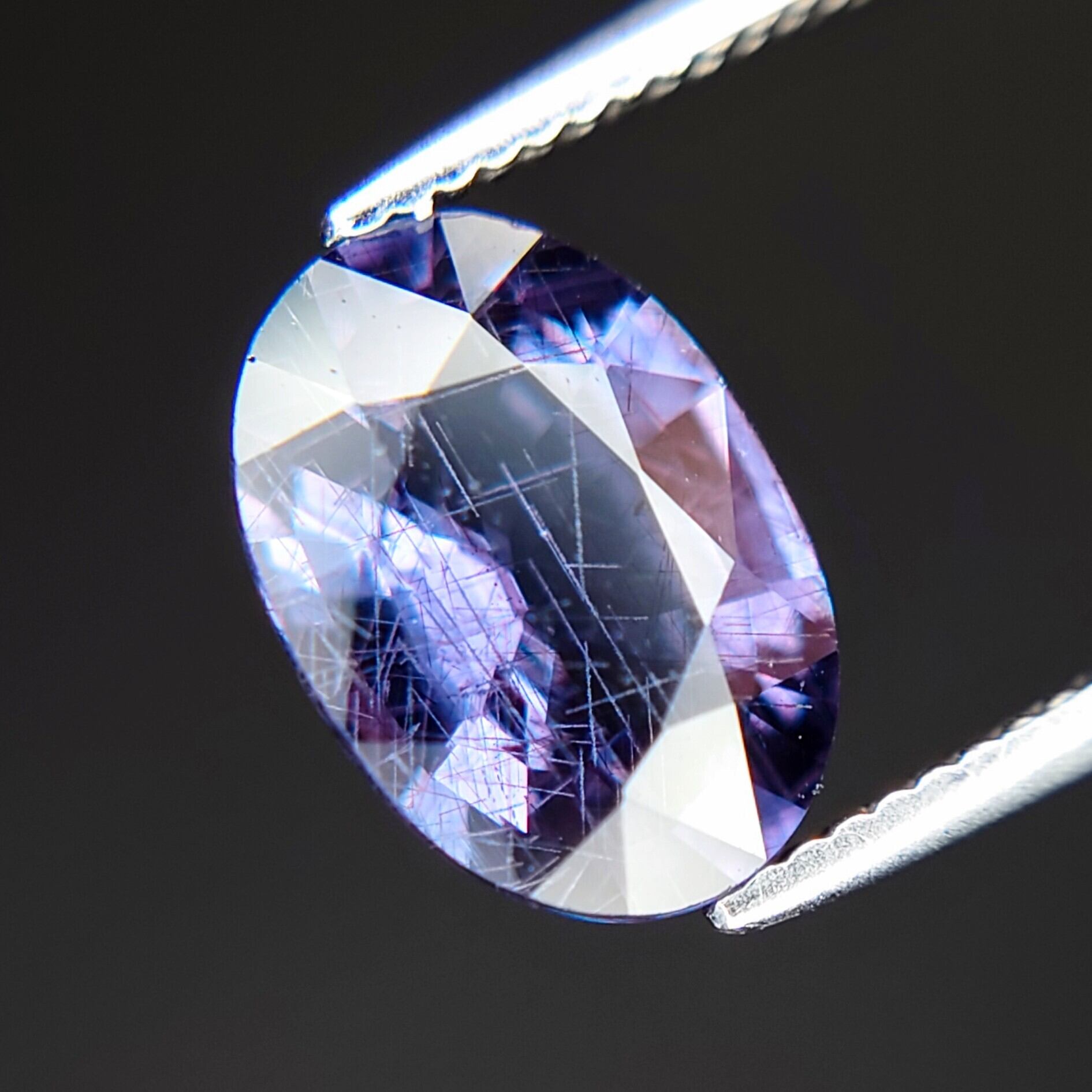 本ルースにはベキリーブルーガーネット特有の針状インクルージョン(ルチルニードル)が内包されており、光の反射や内部のきらめきに独特の個性と美しさを与えています。
