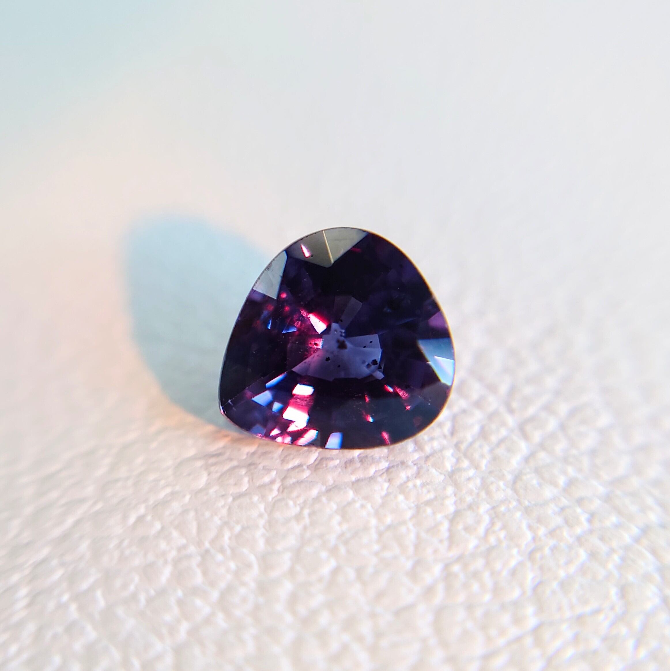 こちらはマダガスカル・ベキリー鉱山由来とされる、希少な「ベキリーブルーガーネット」0.622カラットのルースです。最大の特徴は、光源によって色が大きく変化する“カラーチェンジ効果”です。自然光や蛍光灯下では青みを帯びたブルー~ブルーグリーン、白熱灯やペンライトなど赤系光源下では鮮やかなパープル~レッドへと劇的に色が変わります。