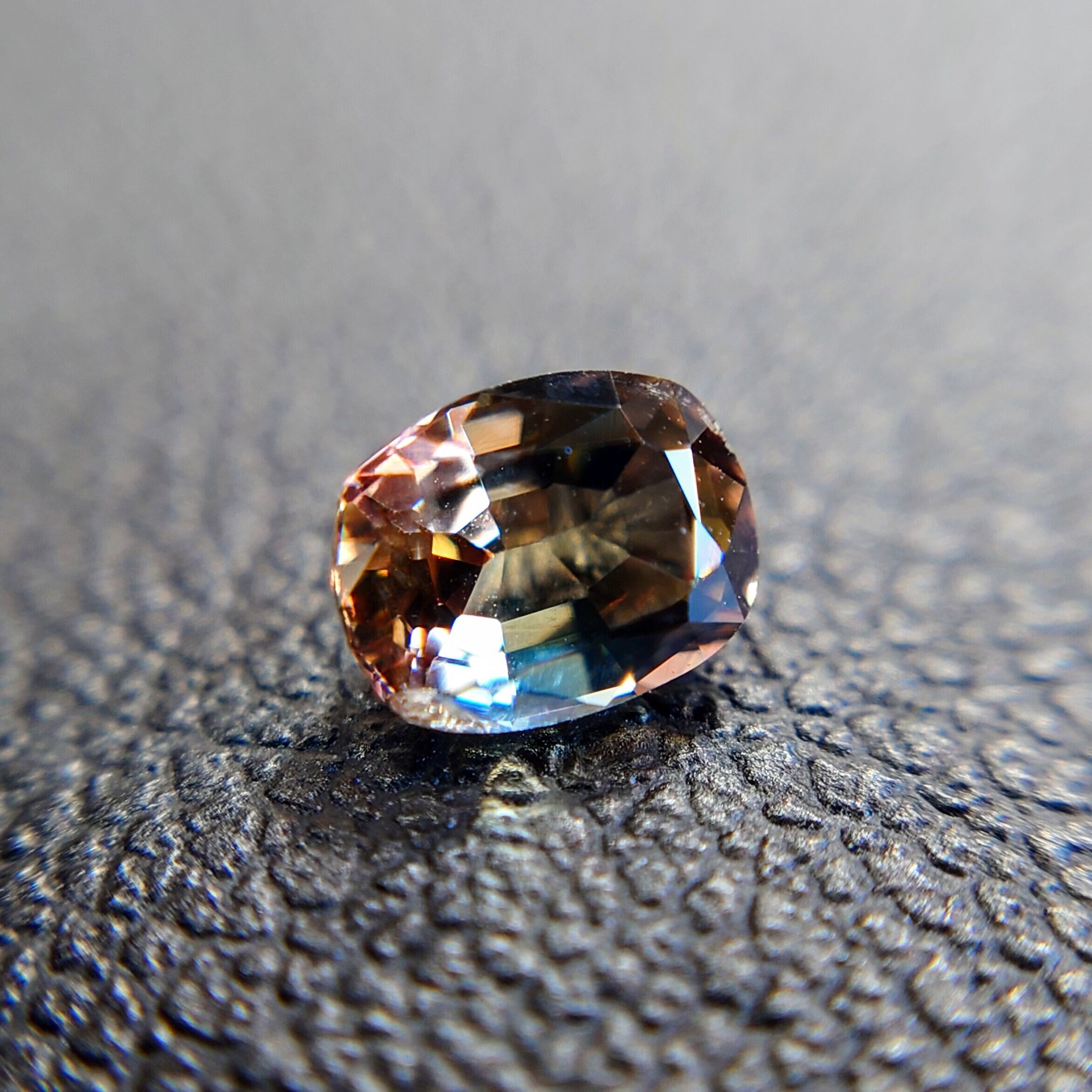 この石は、淡いパープルやブルーからブラウンへのグラデーションが幻想的に広がる、希少なバイカラータイプ。光の当たり方や角度によって様々な表情を見せてくれます。