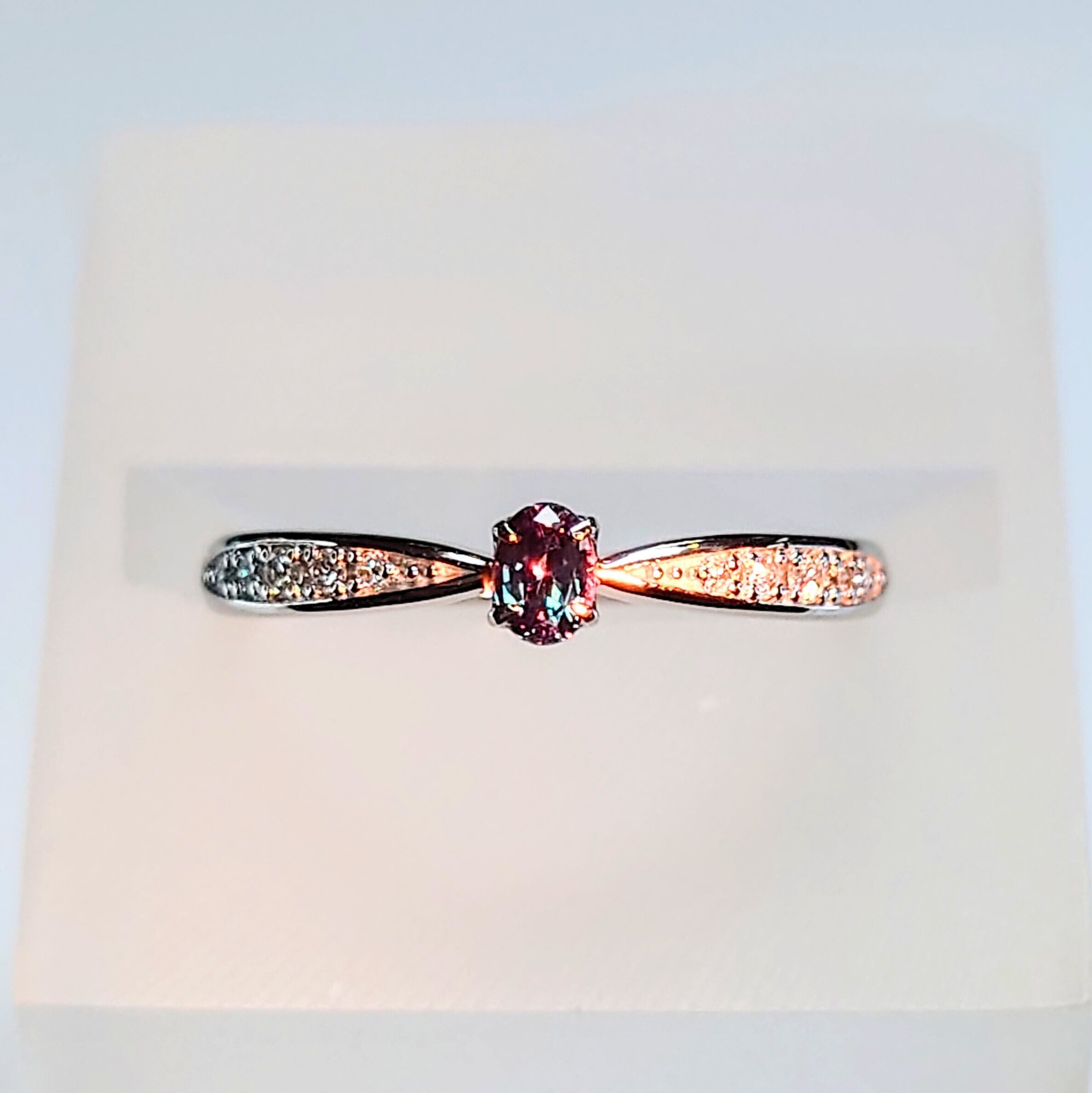 両サイドには合計0.07ctのダイヤモンドをセッティング。アレキサンドライトの美しさを引き立て、指元に上品な輝きを添えます。