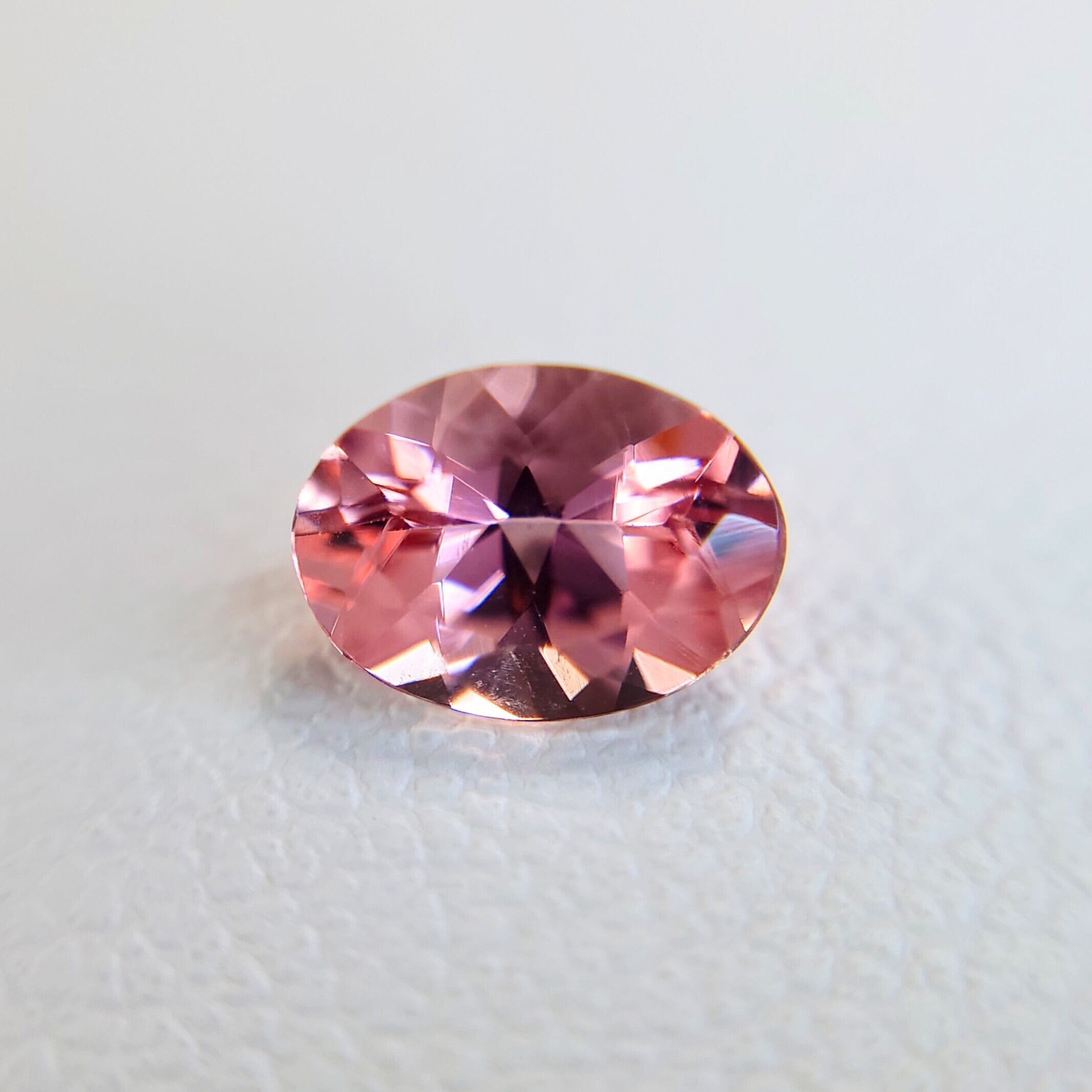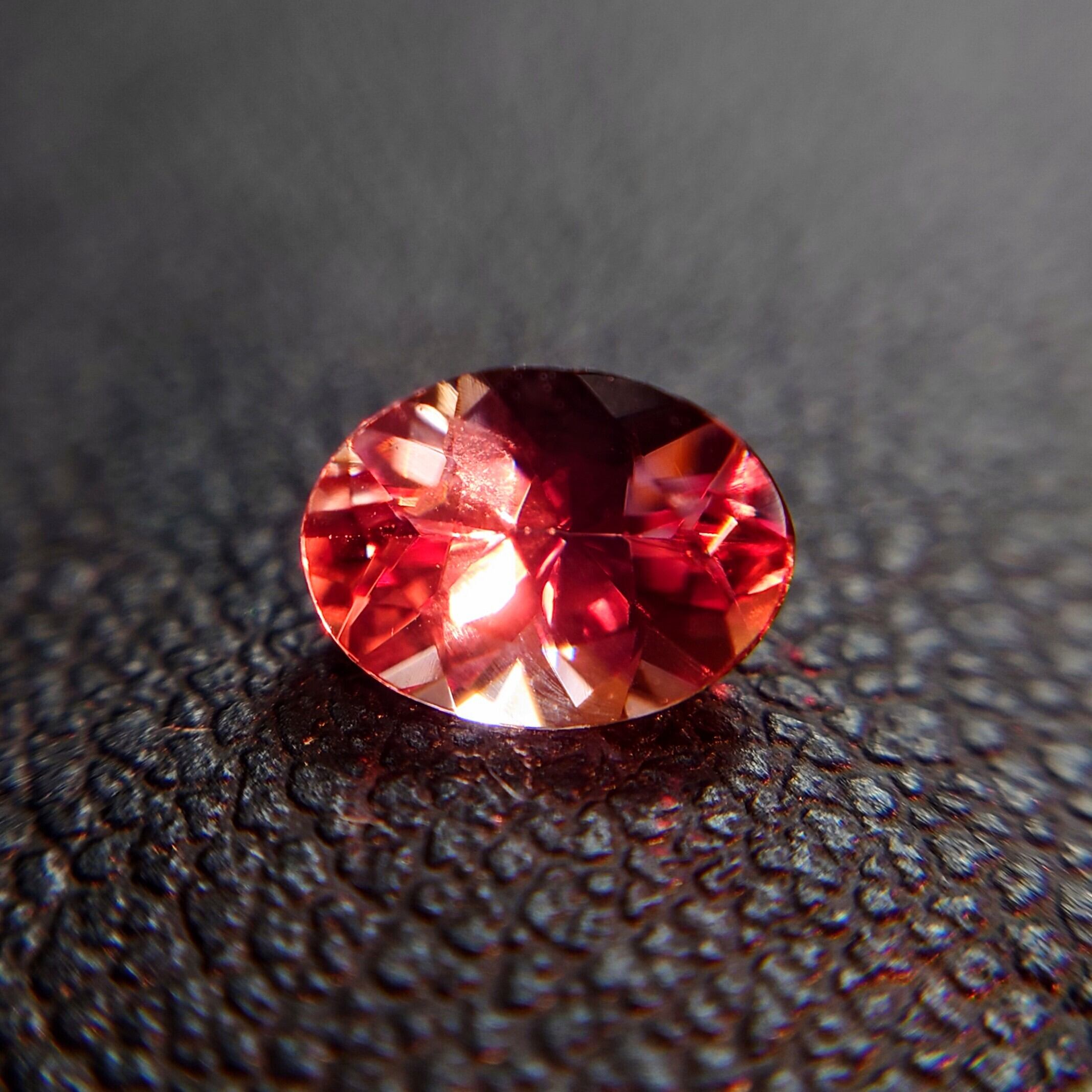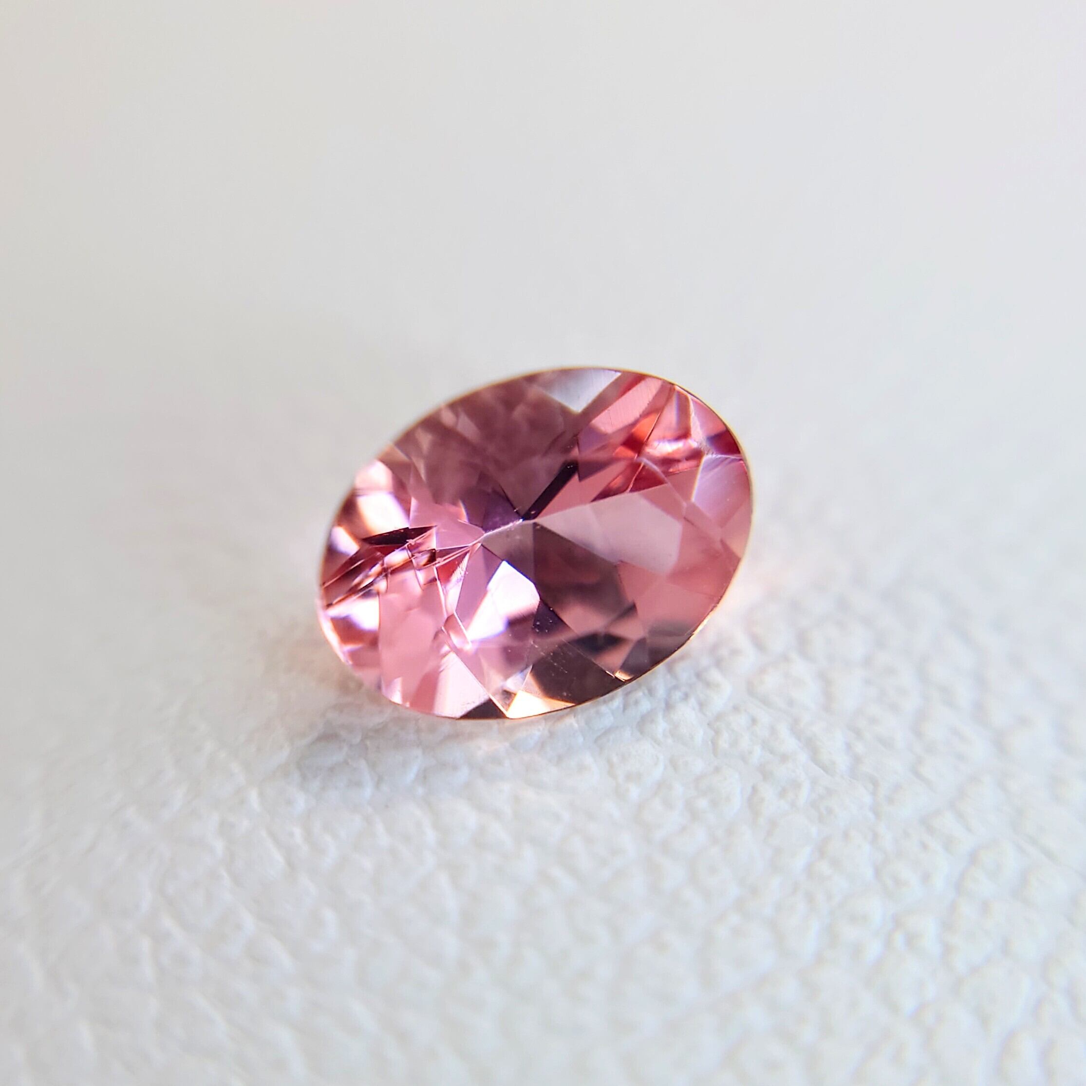 優美なオーバル モディファイド ブリリアント カットが、瑞々しい輝きを引き出し、繊細なピンクオレンジの煌めきが指先に温かな光を添えます。