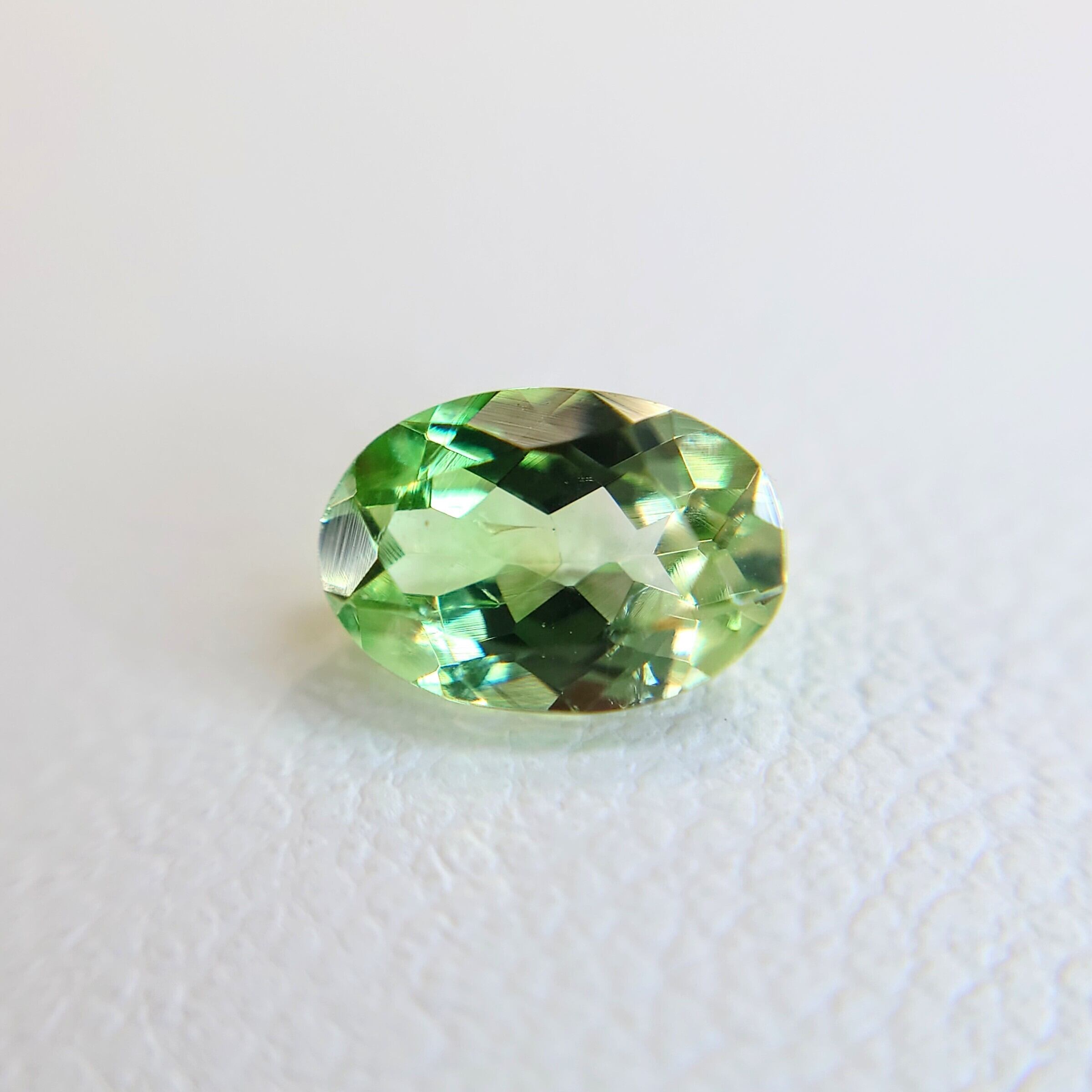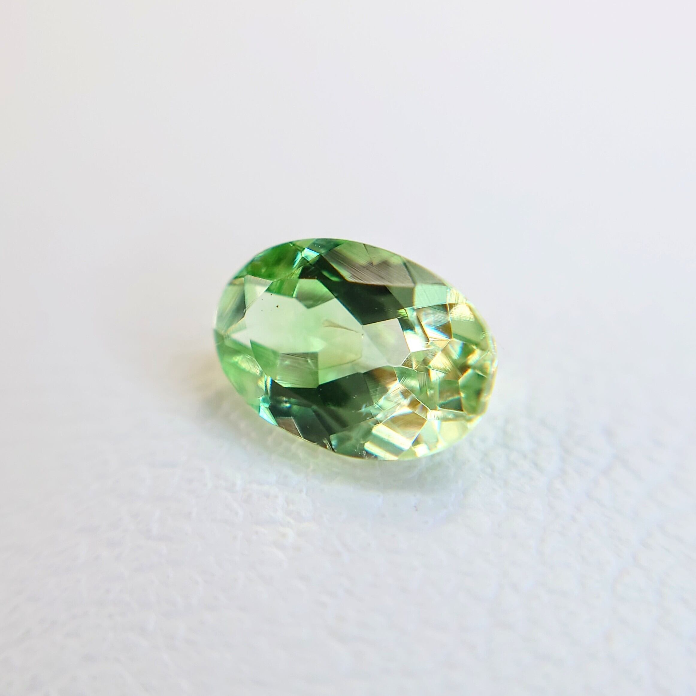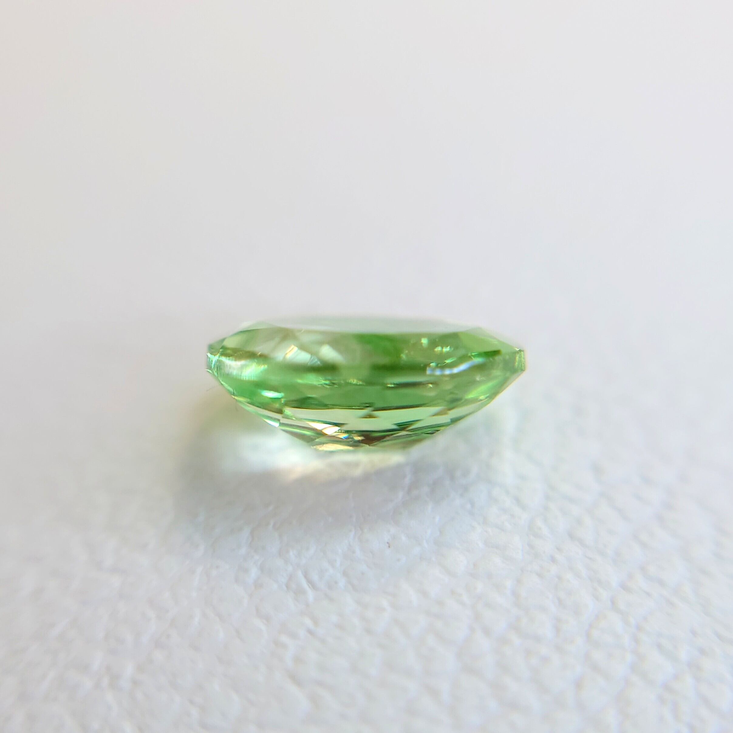繊細で清らかなライトグリーンが美しい、天然グリーン・グロッシュラーガーネット(通称ミントガーネット)。本品は0.717ctの程よいサイズで、6.72×4.70×2.80mmのオーバル・モディファイドブリリアントカットが、石の透明感と彩りを最大限に引き立てます。