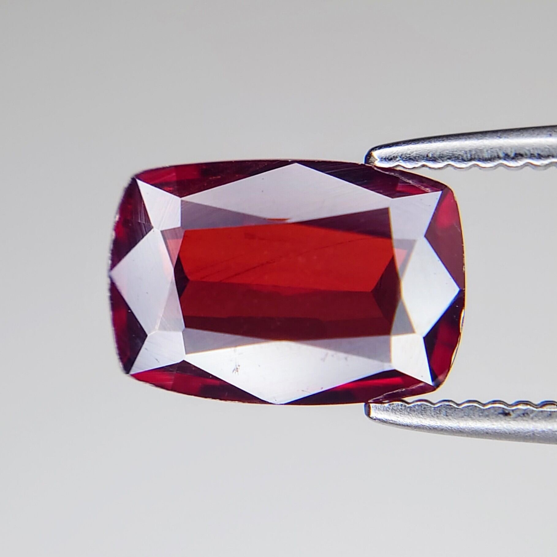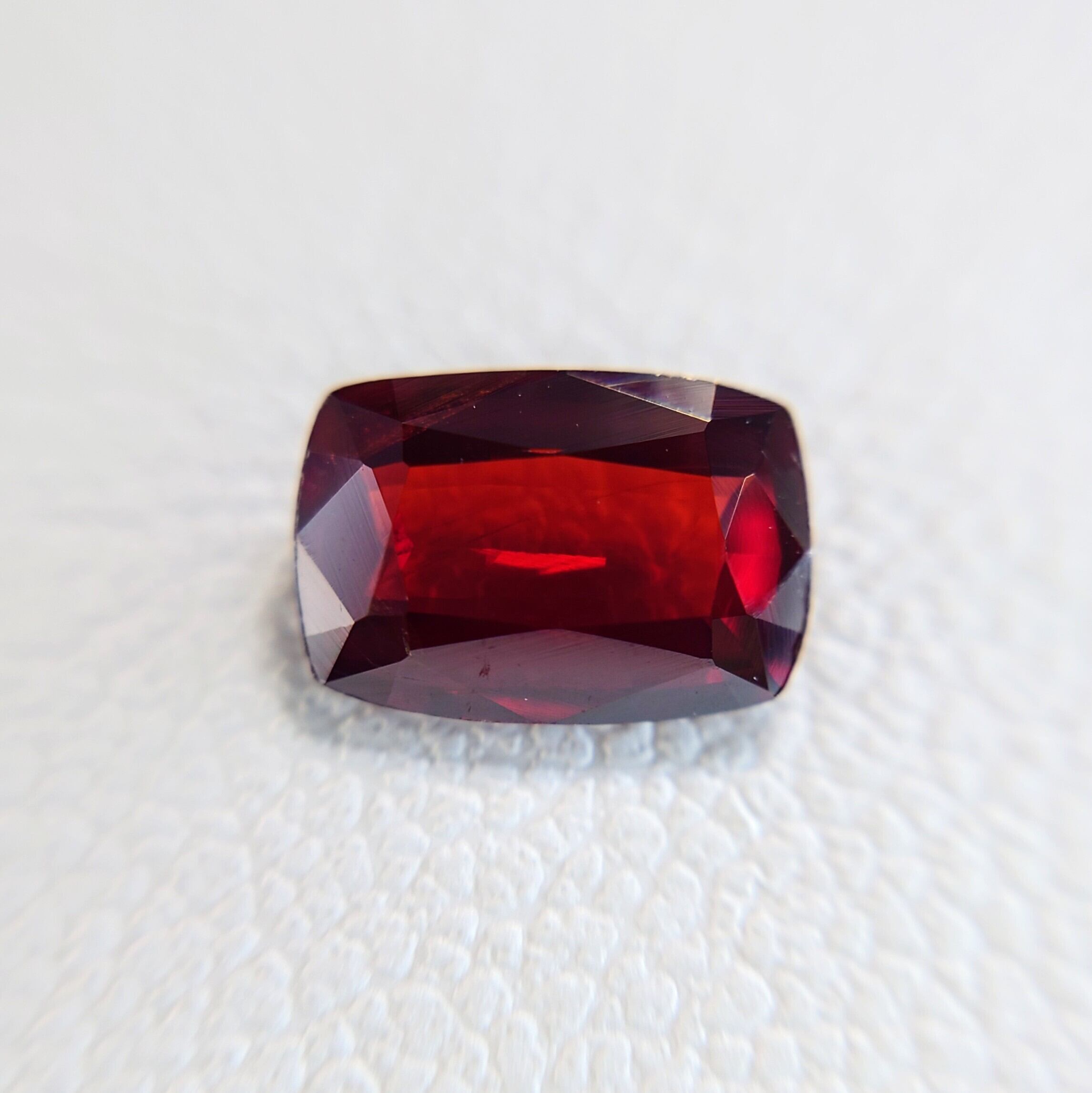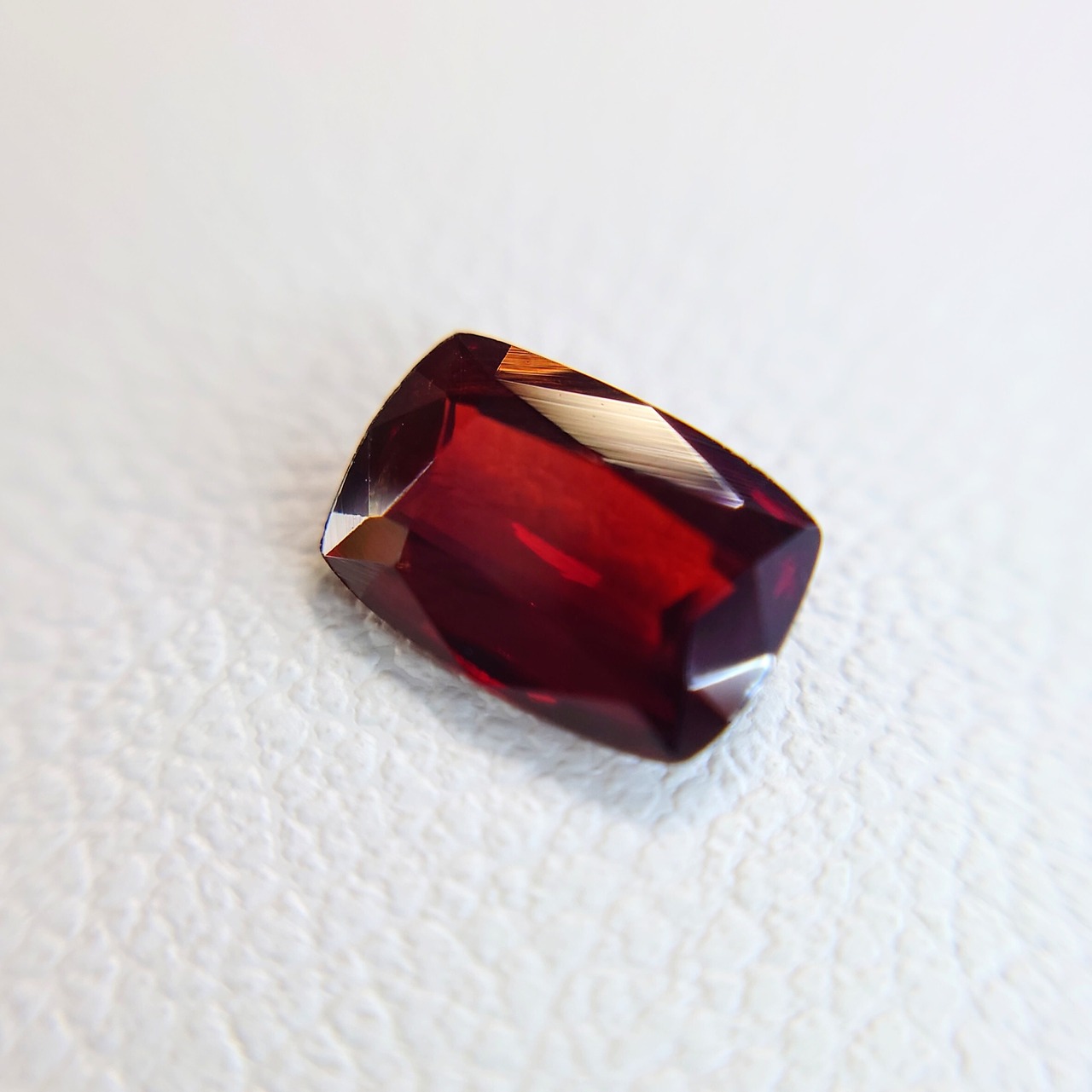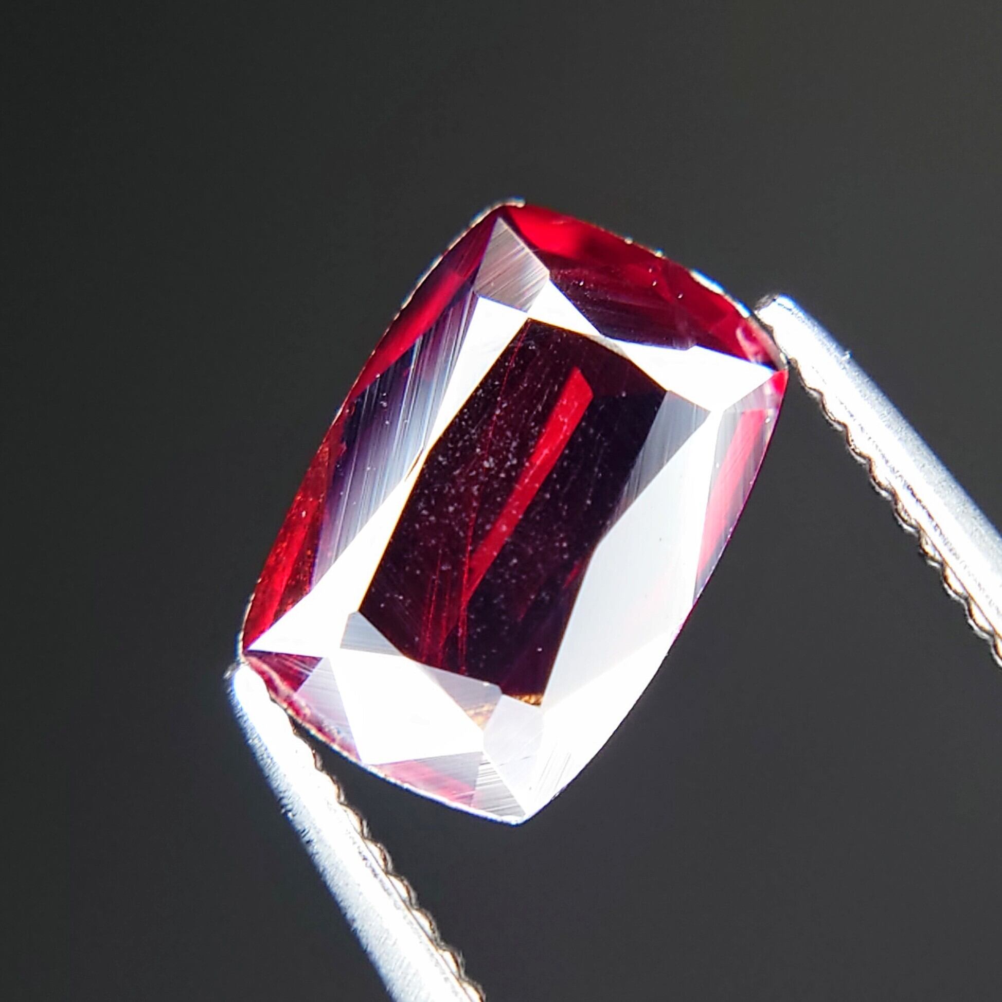 クッションミックスカットに仕上げられた本品は、正面からの光を鮮やかに受け止め、内側から輝くような濃厚な赤色を演出します。複屈折性や多色性も確認され、わずかな角度の変化で色調に豊かな変化が見られるのも魅力のひとつです。
