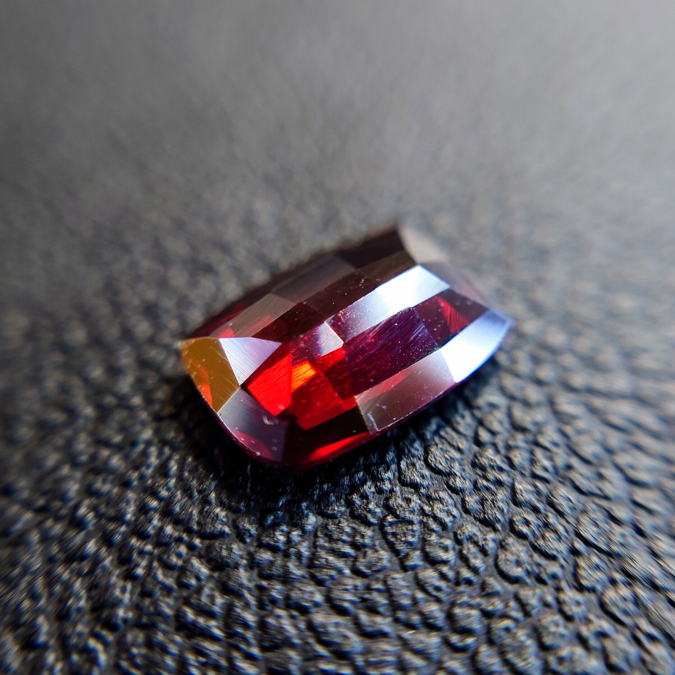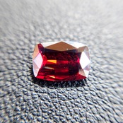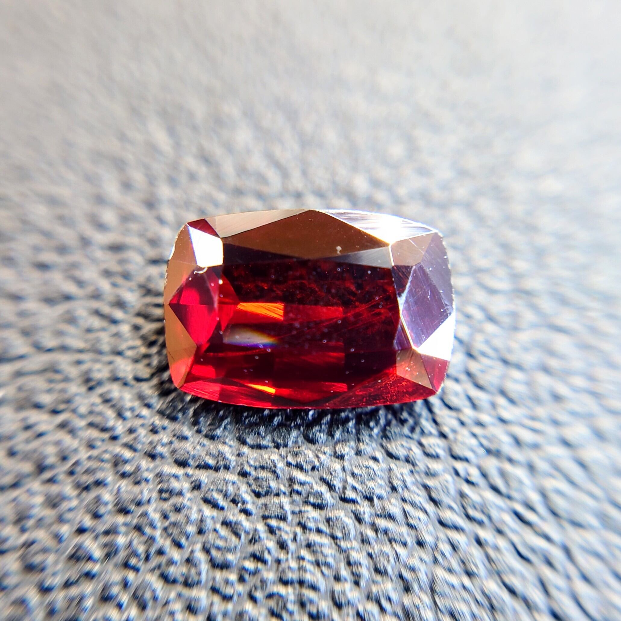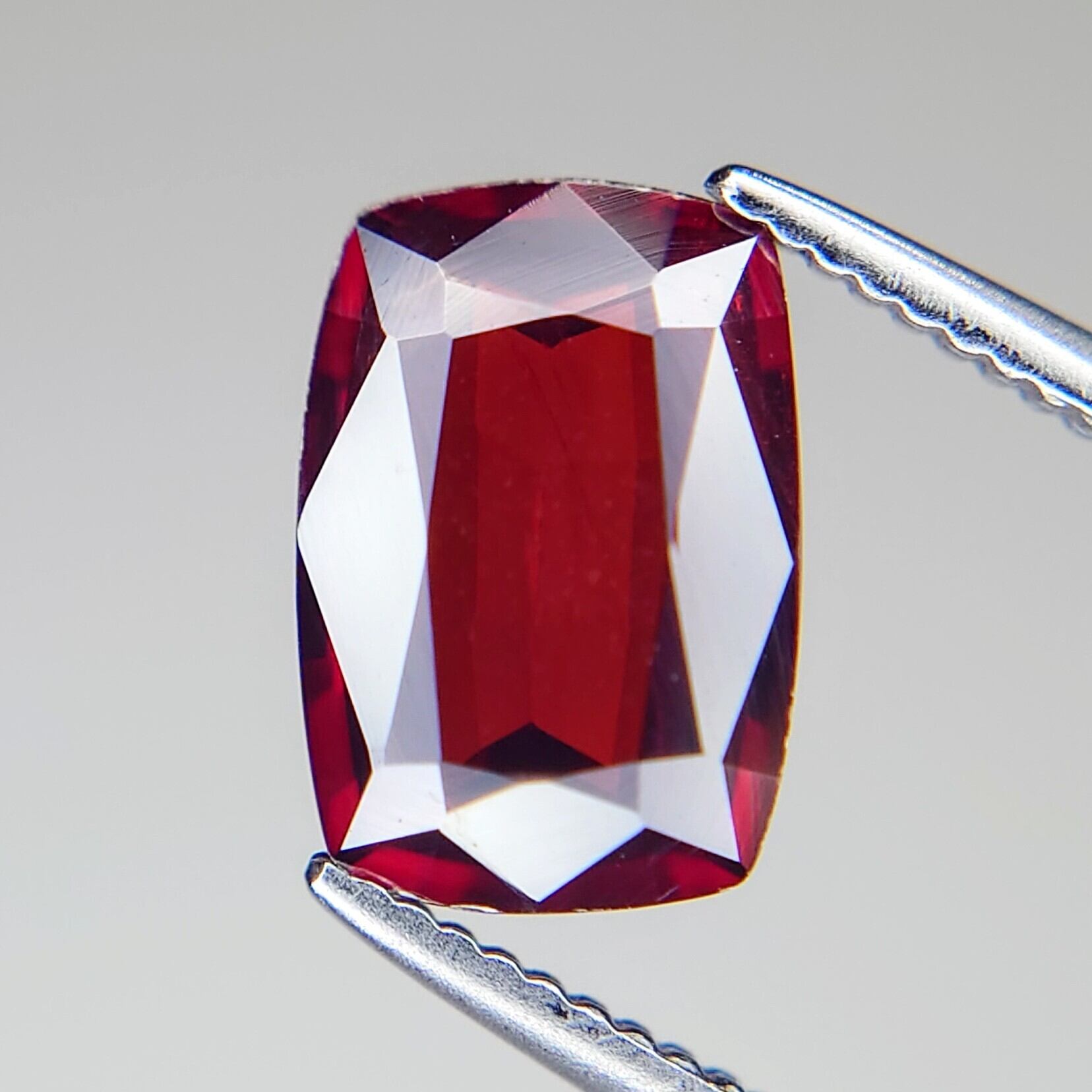 クッションミックスカットに仕上げられた本品は、正面からの光を鮮やかに受け止め、内側から輝くような濃厚な赤色を演出します。複屈折性や多色性も確認され、わずかな角度の変化で色調に豊かな変化が見られるのも魅力のひとつです。