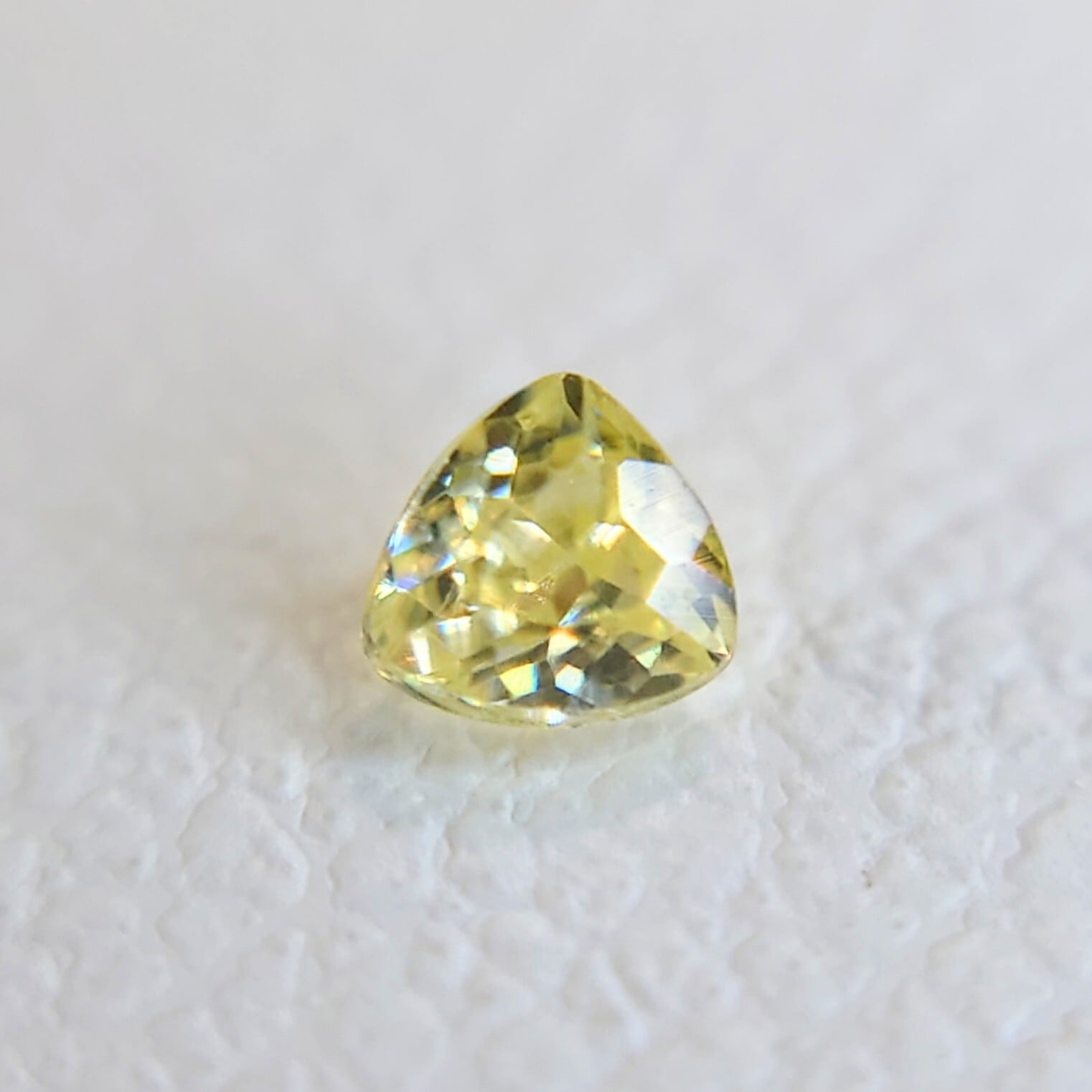 鮮やかなレモンイエローのような発色と、繊細なファセットカットによって生まれる光の反射が、見る角度によって優しく変化し、ミステリアスな表情を見せてくれます。