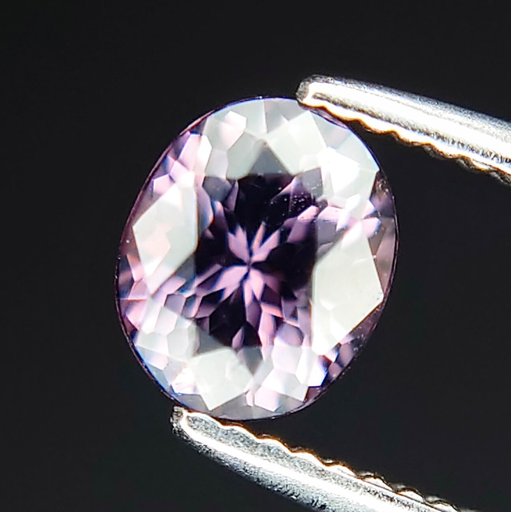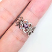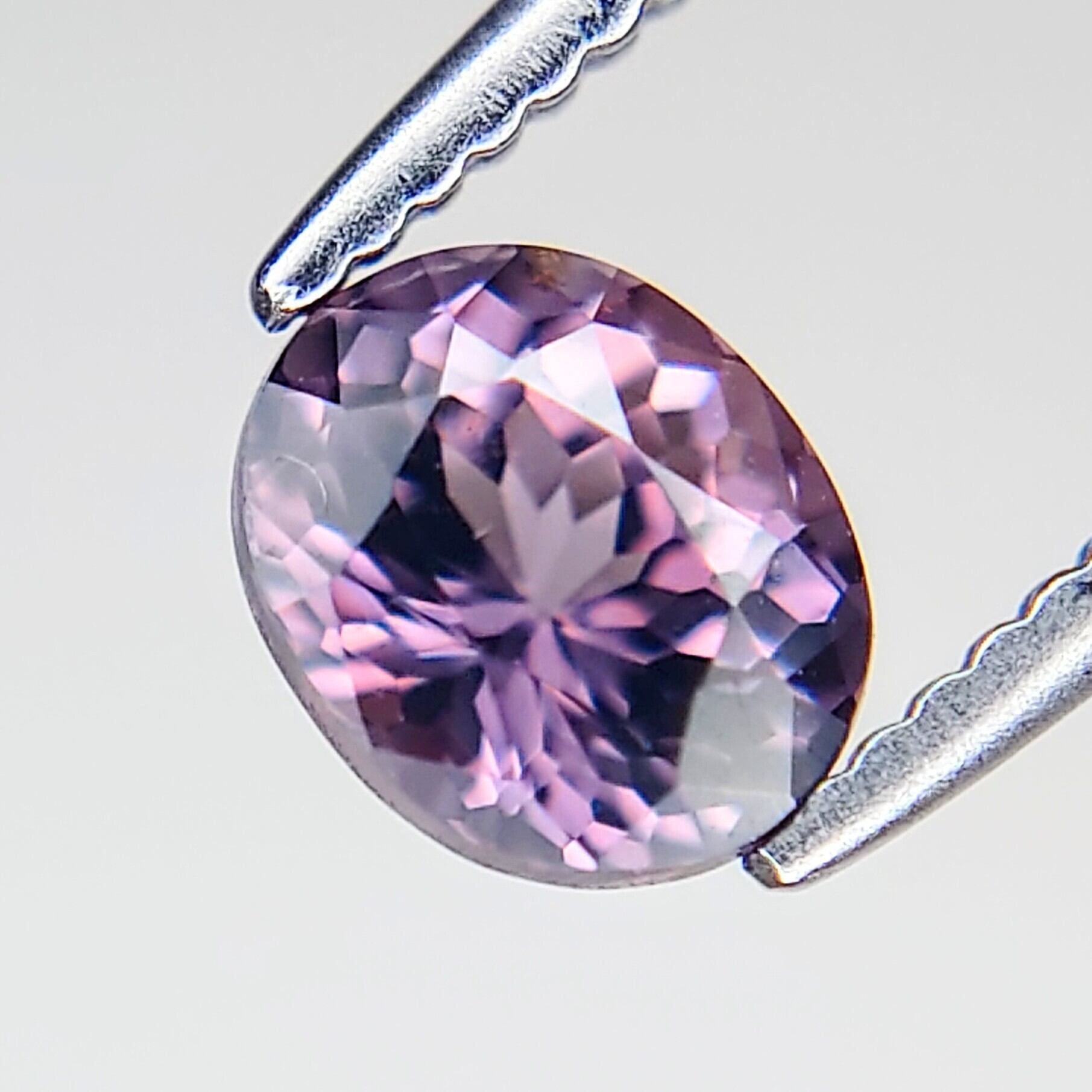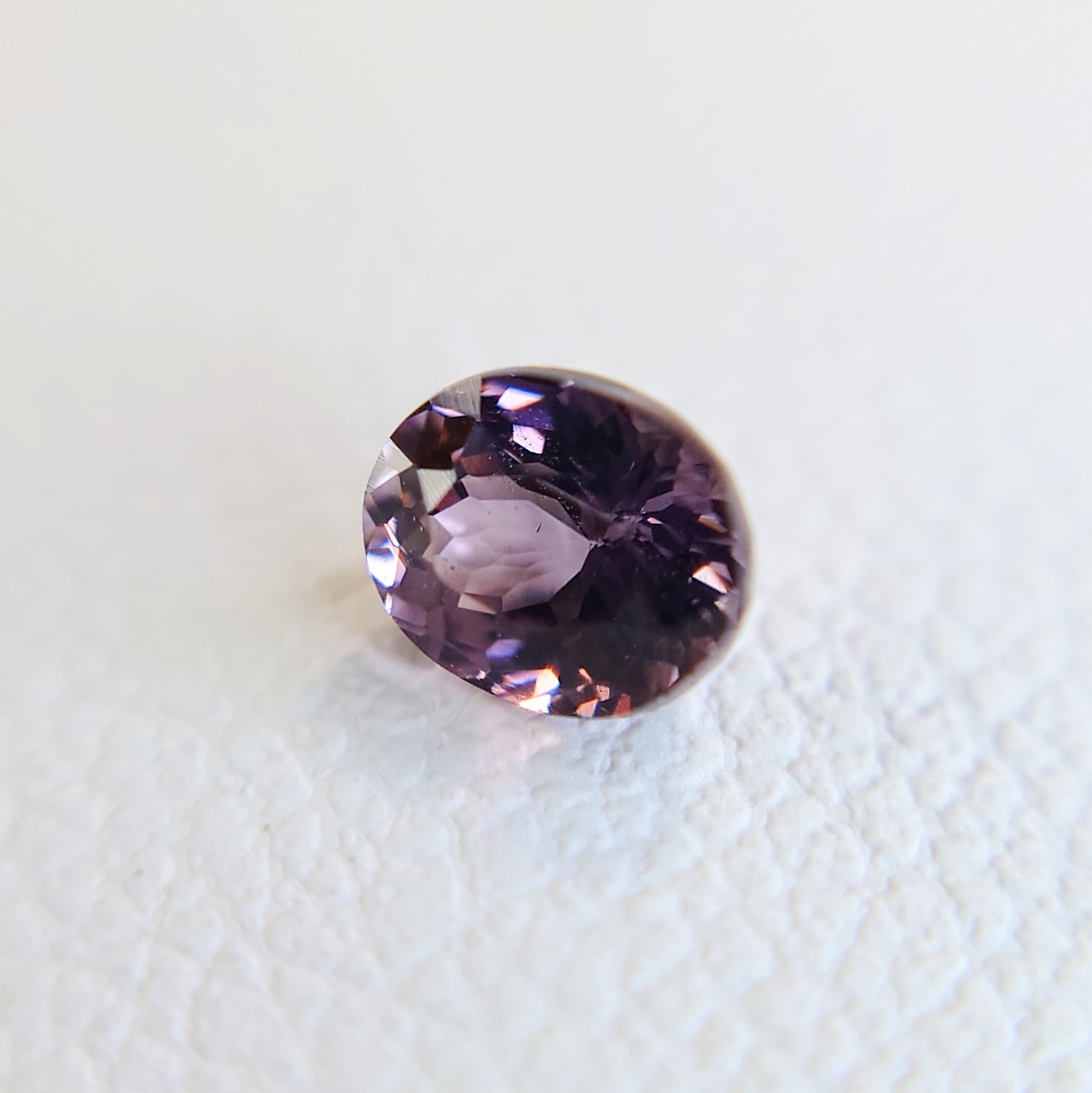 深みのあるラベンダーから赤紫色の輝きが印象的で、光の角度によって異なる色調を見せる多色性(プレオクロイズム)を堪能できます。丁寧に施されたオーバル・モディファイドブリリアントカットが、透明感のある輝きを一層引き立てています。