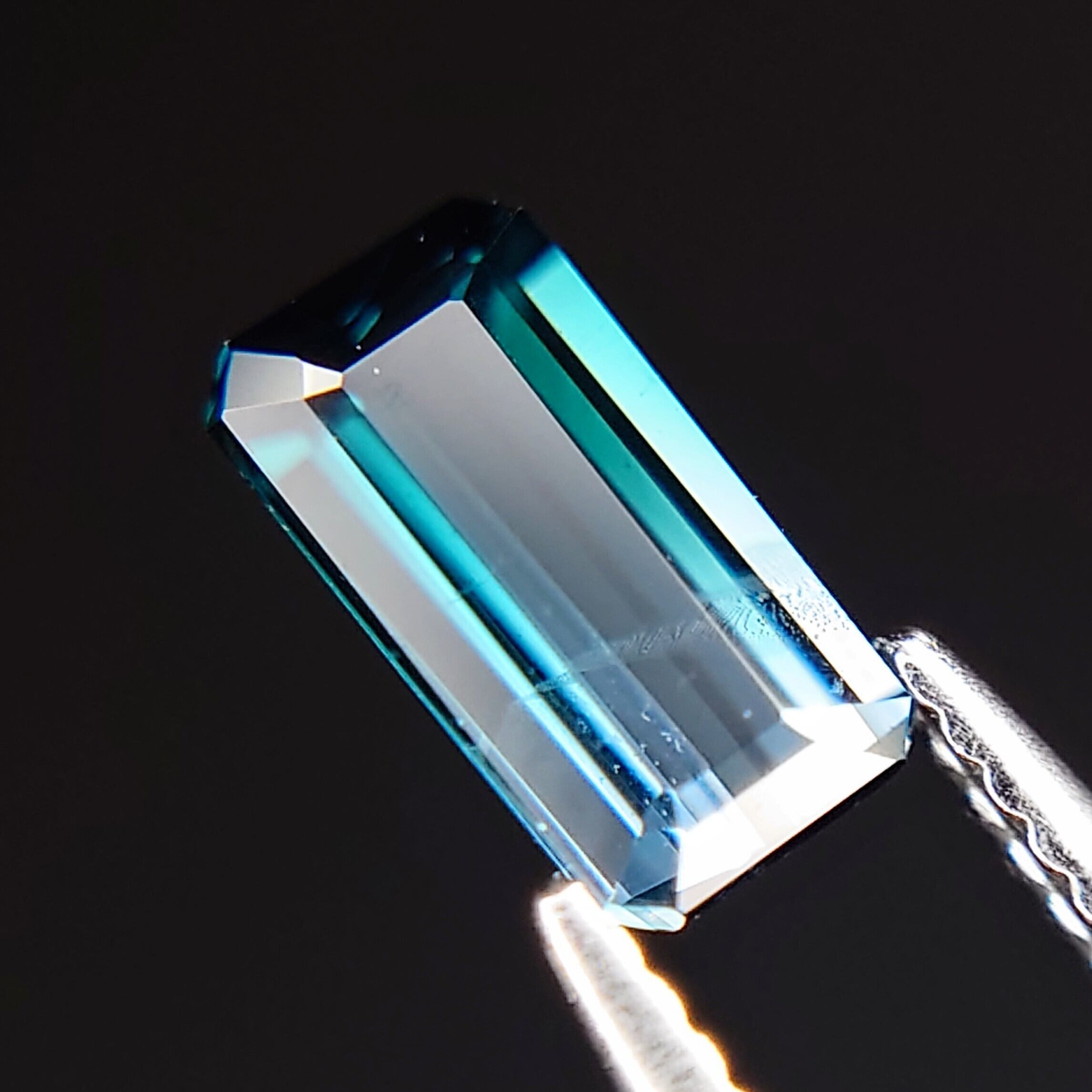 シャープな印象のコーナードレクタンギュラーステップカットが、直線的な色のグラデーションをより際立たせています。