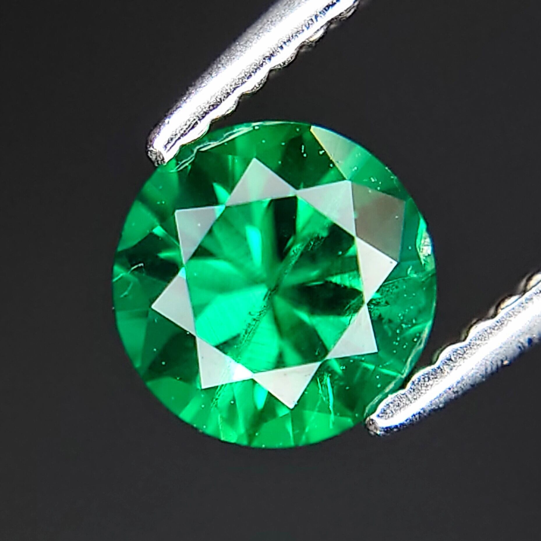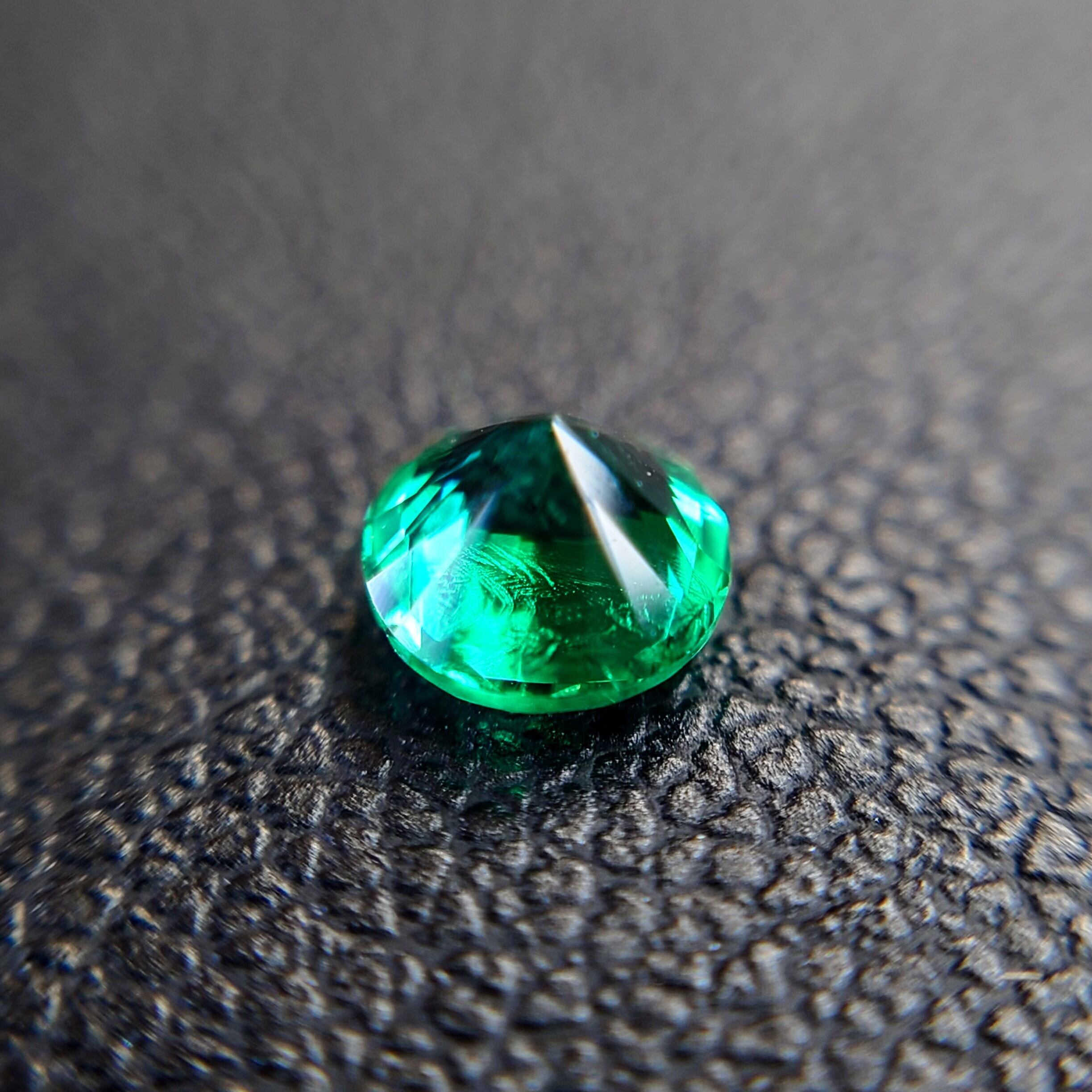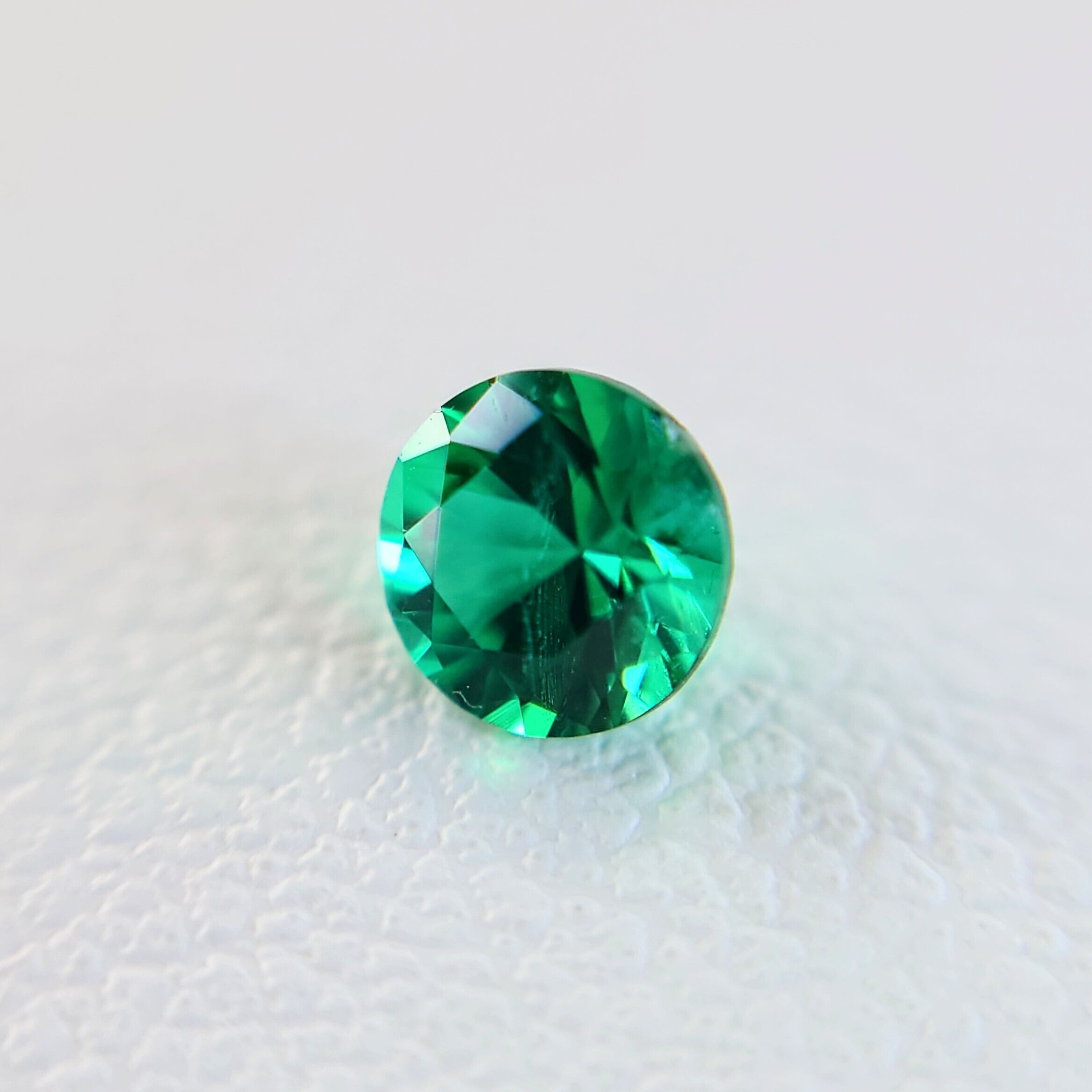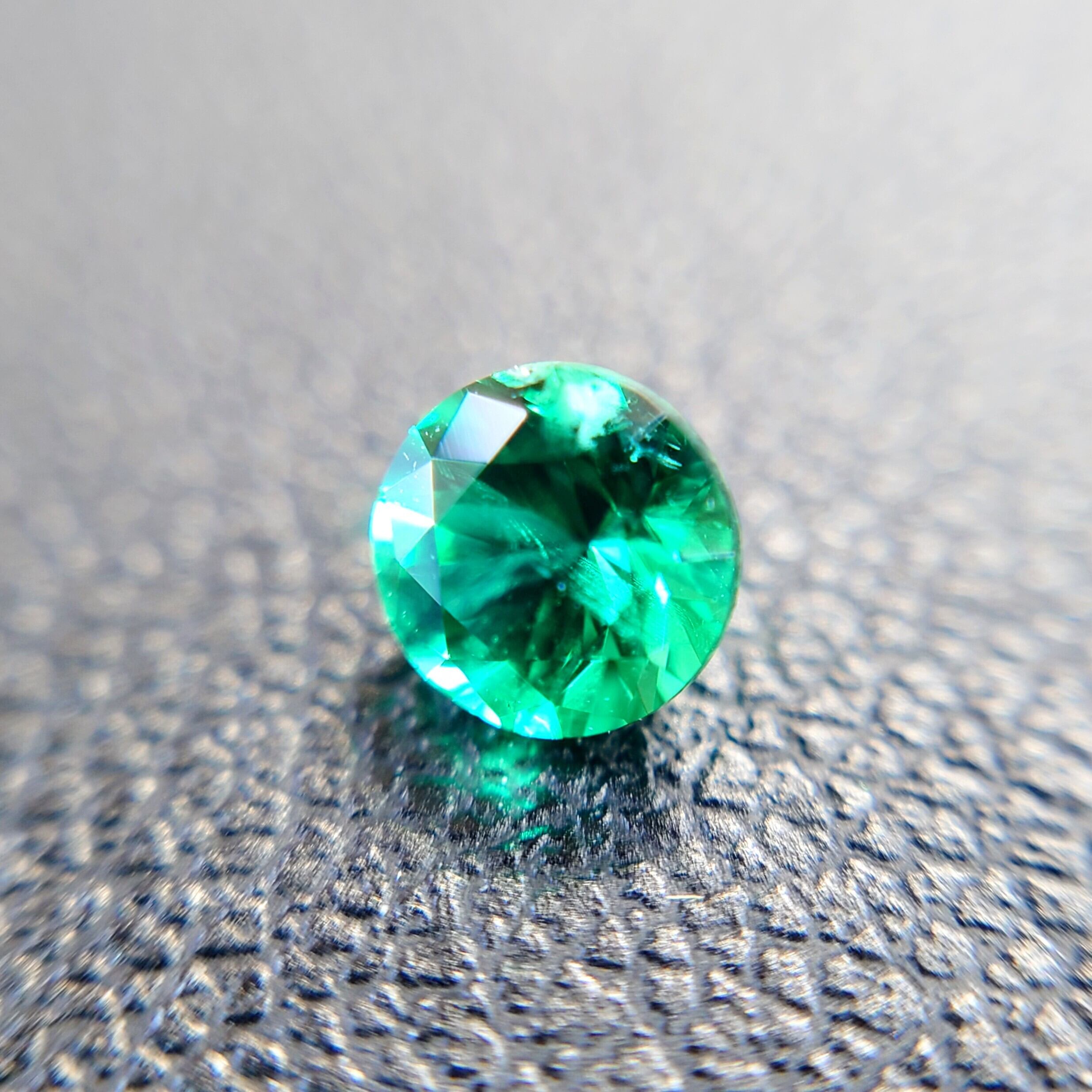 透明感のある鮮やかなグリーンを宿した、ラウンド・ブリリアントカットのエメラルドです。