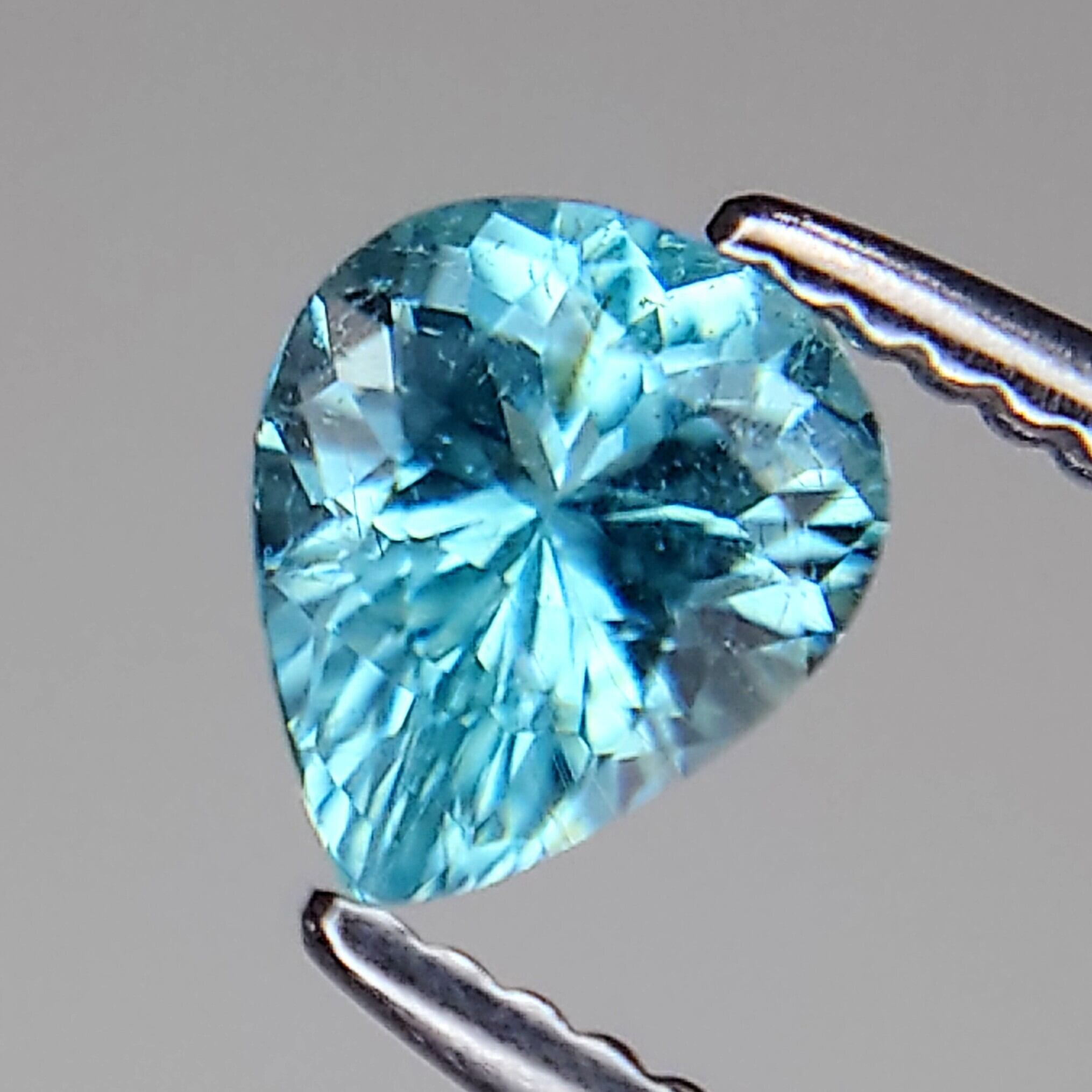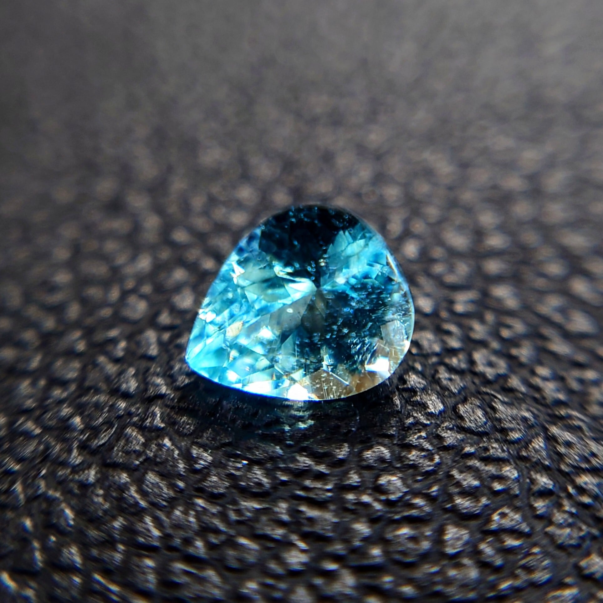 こちらはペアシェイプ・モディファイドブリリアントカットにより、透明感あふれる輝きと瑞々しい発色を最大限に引き出しています。光の加減によって鮮やかなブルーから深みのあるブルーグリーンまで多彩な表情を楽しめます。
