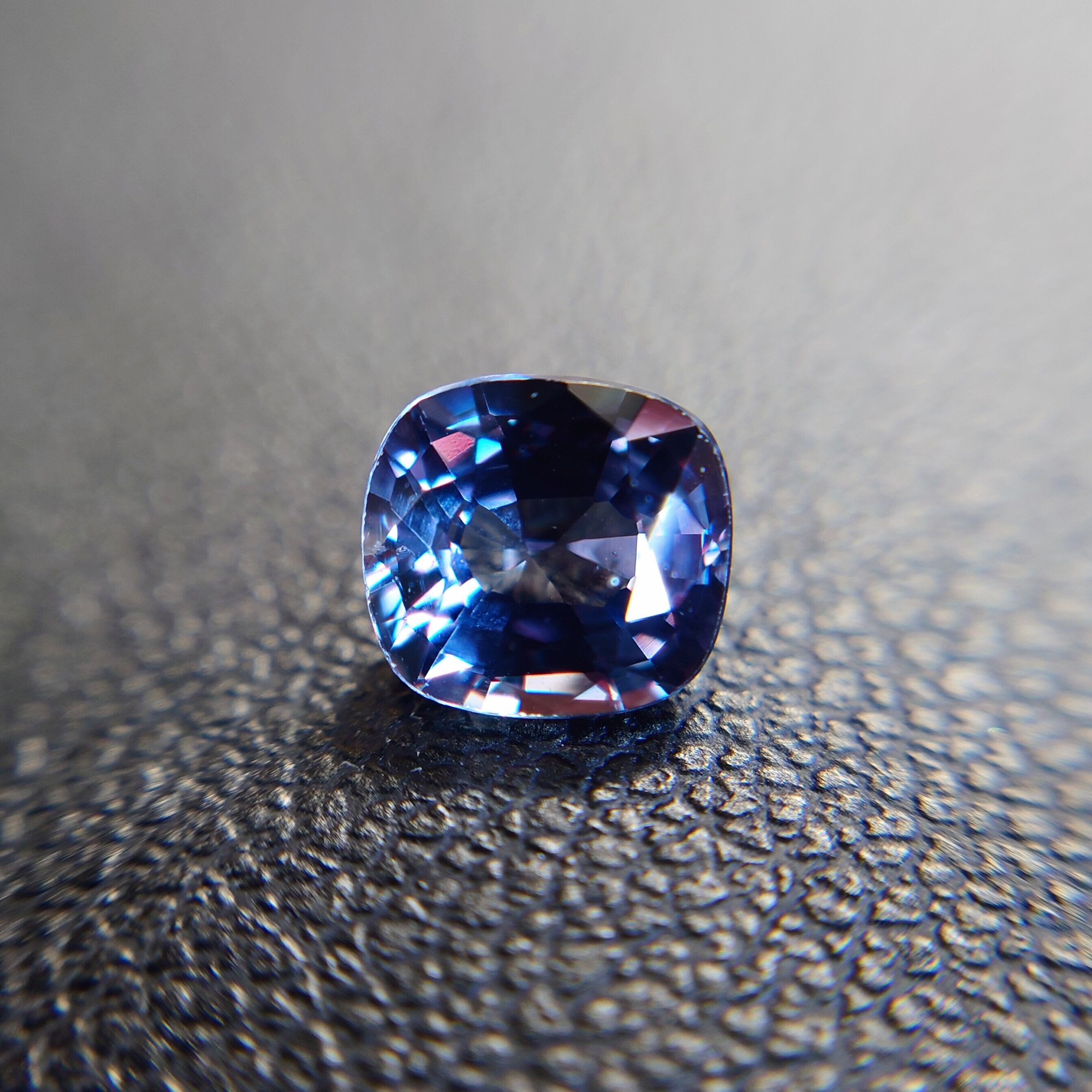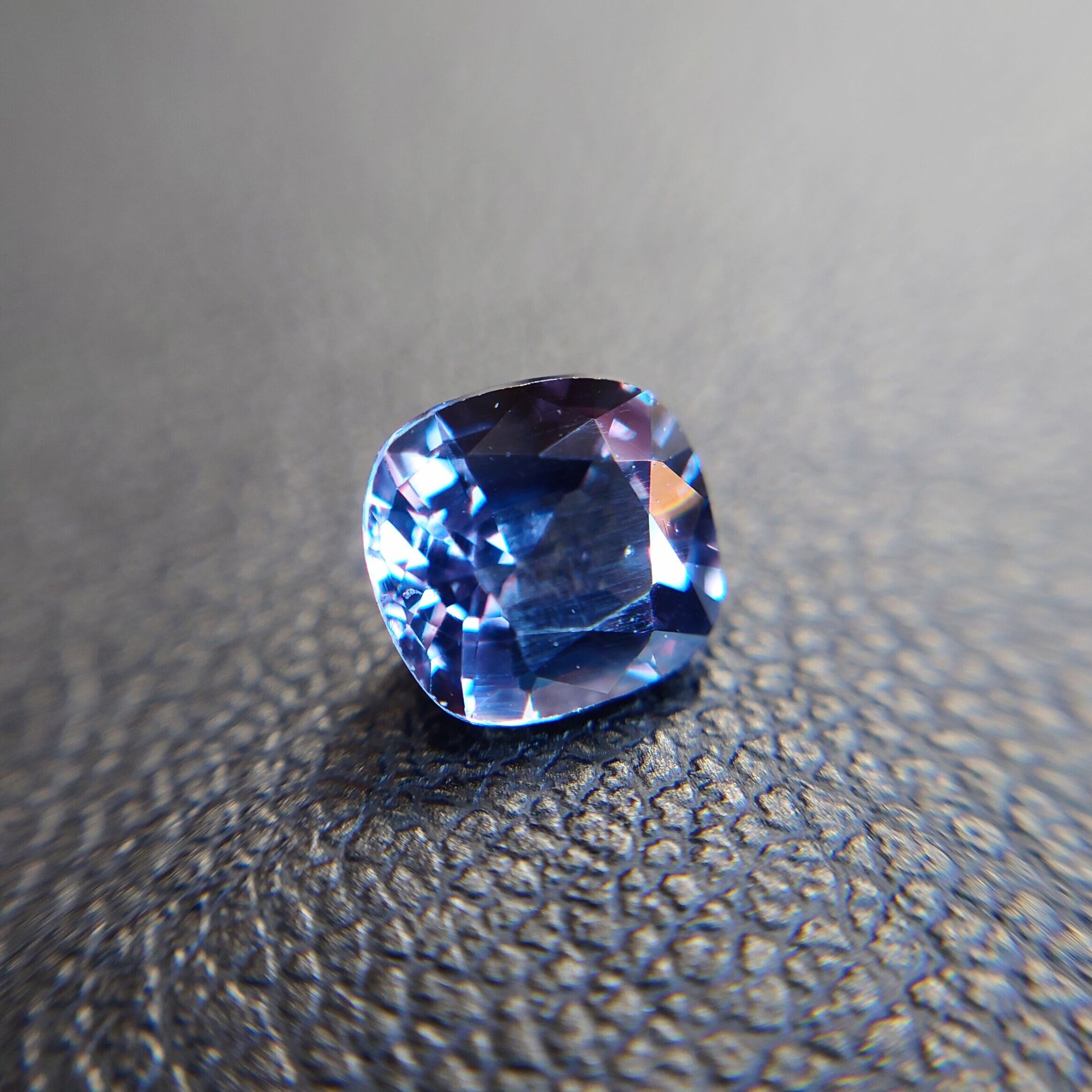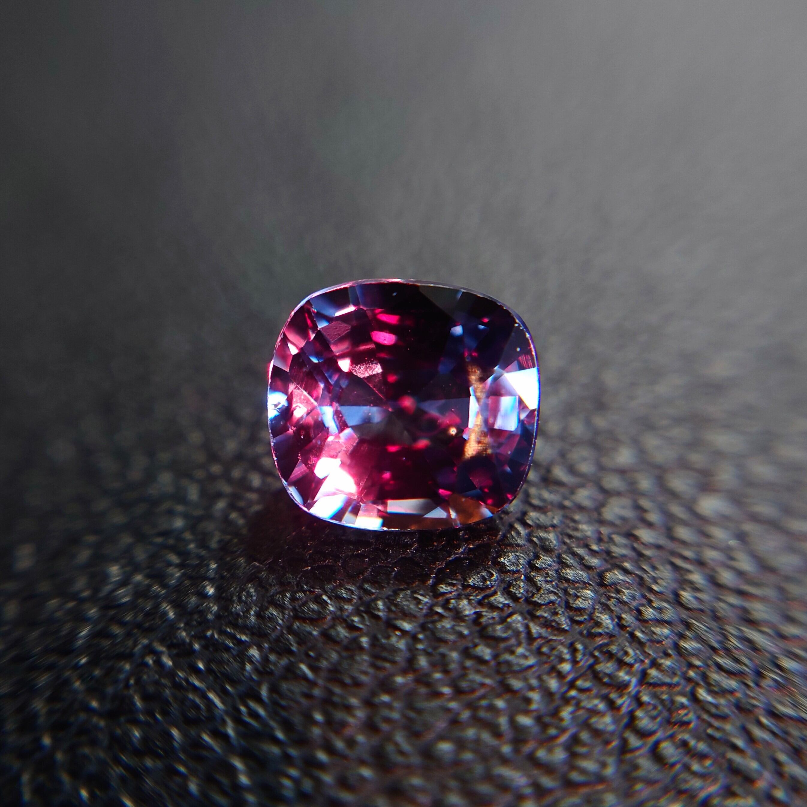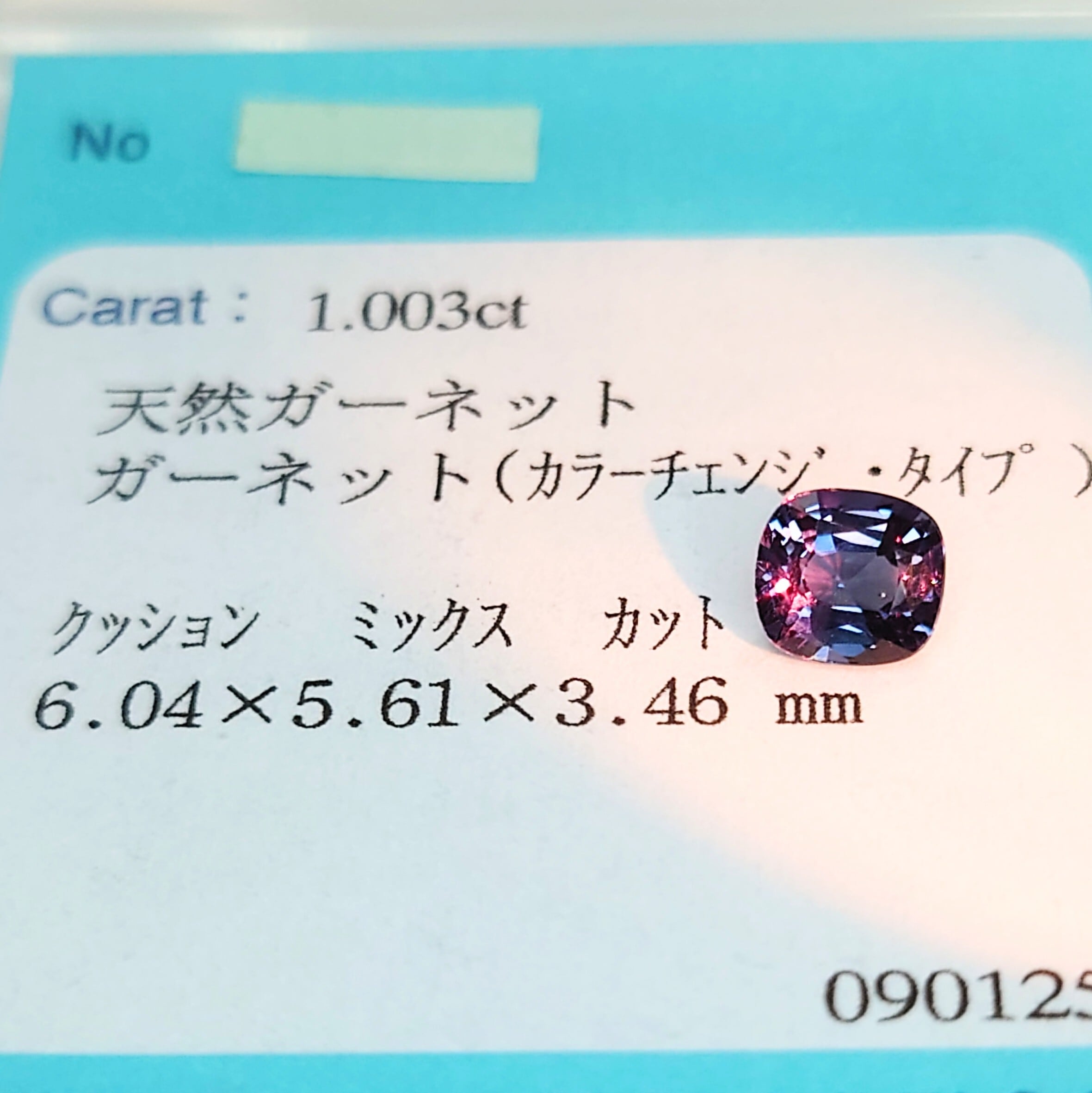 本品は1.003ct、6.04×5.61×3.46mm のクッションミックスカットで、透明感と照りの良さが際立つ一石です。まるでアレキサンドライトを思わせる強い変色効果を示し、角度を変えるたびに異なる表情を見せてくれます。