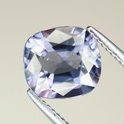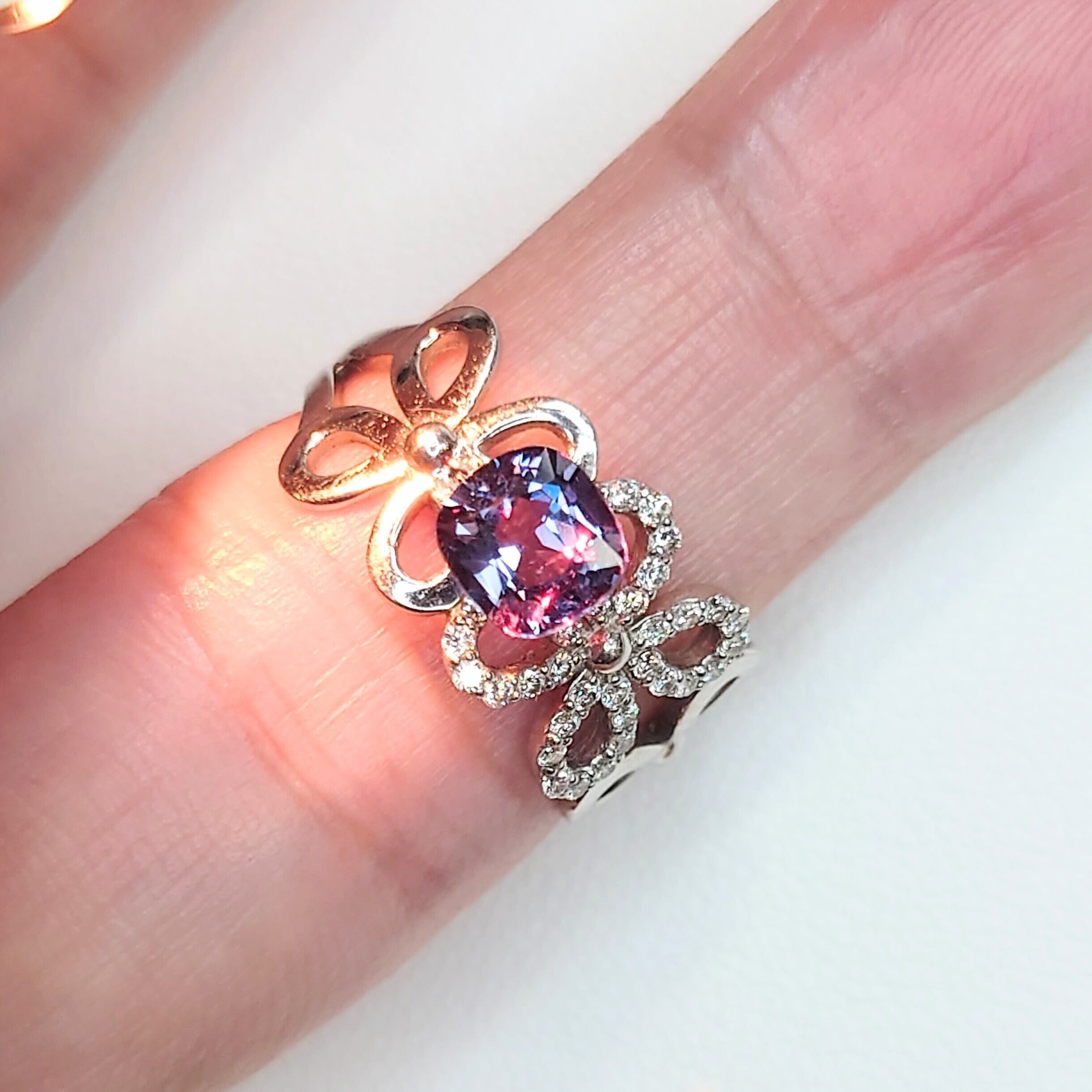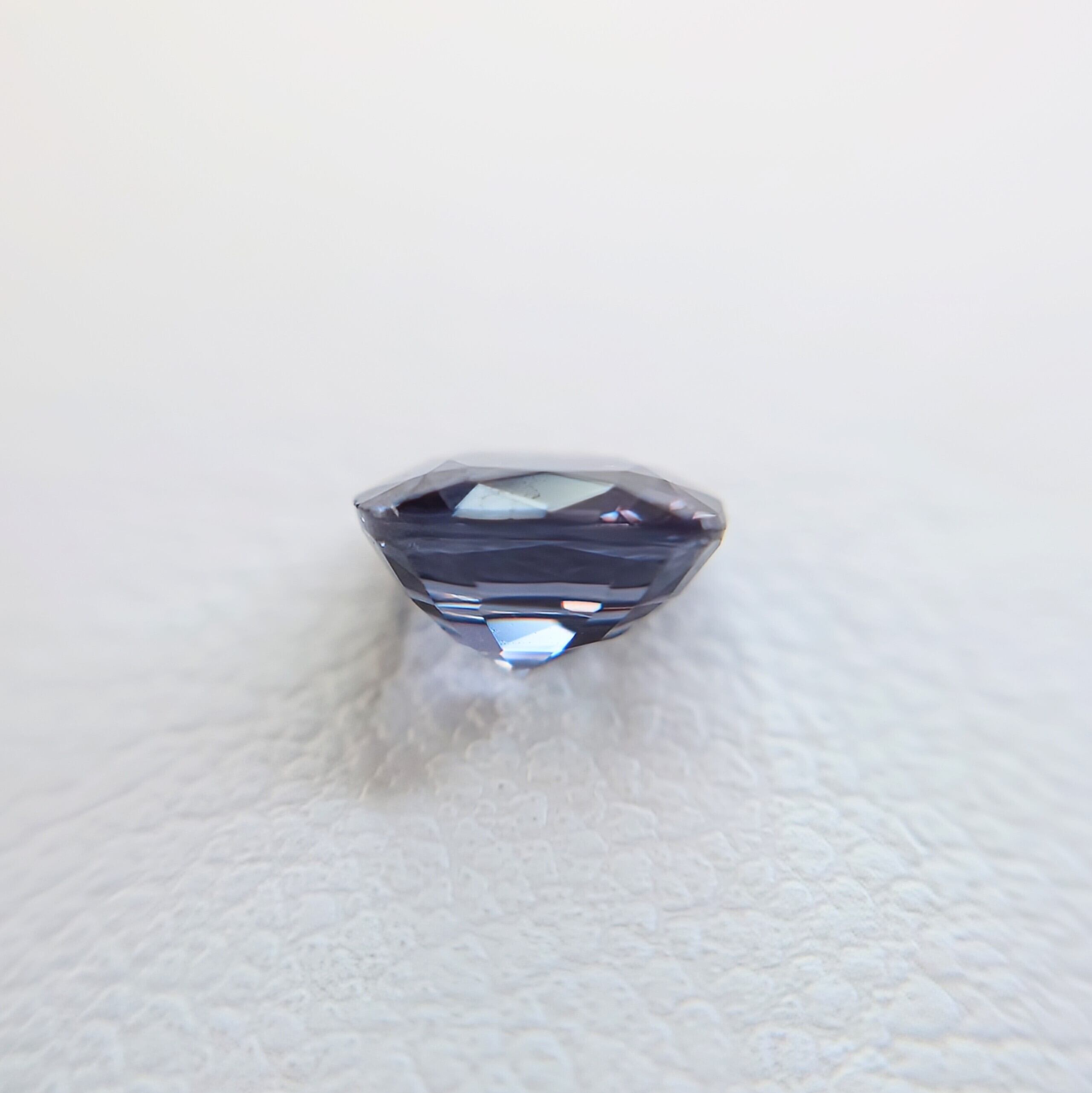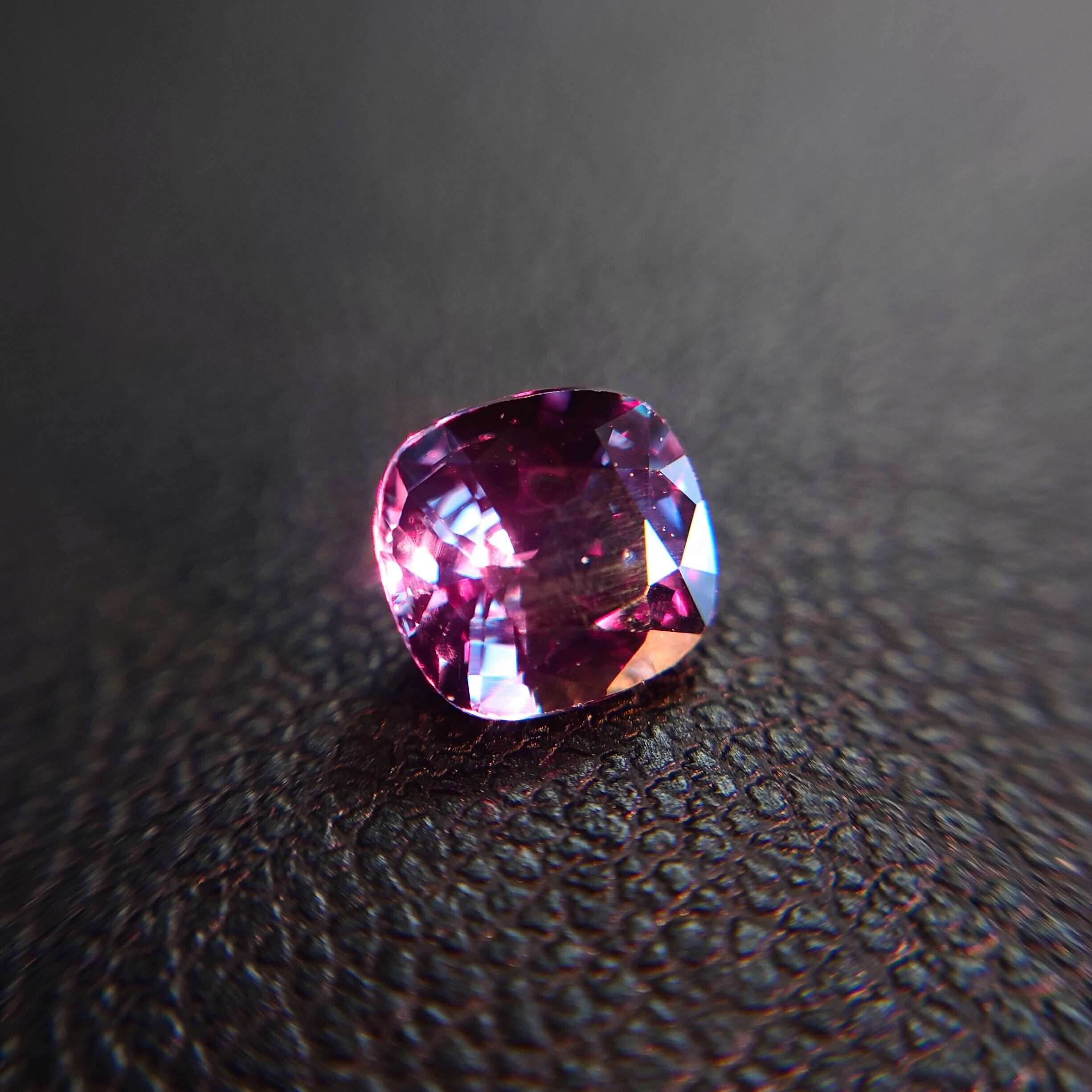 本品は1.003ct、6.04×5.61×3.46mm のクッションミックスカットで、透明感と照りの良さが際立つ一石です。まるでアレキサンドライトを思わせる強い変色効果を示し、角度を変えるたびに異なる表情を見せてくれます。