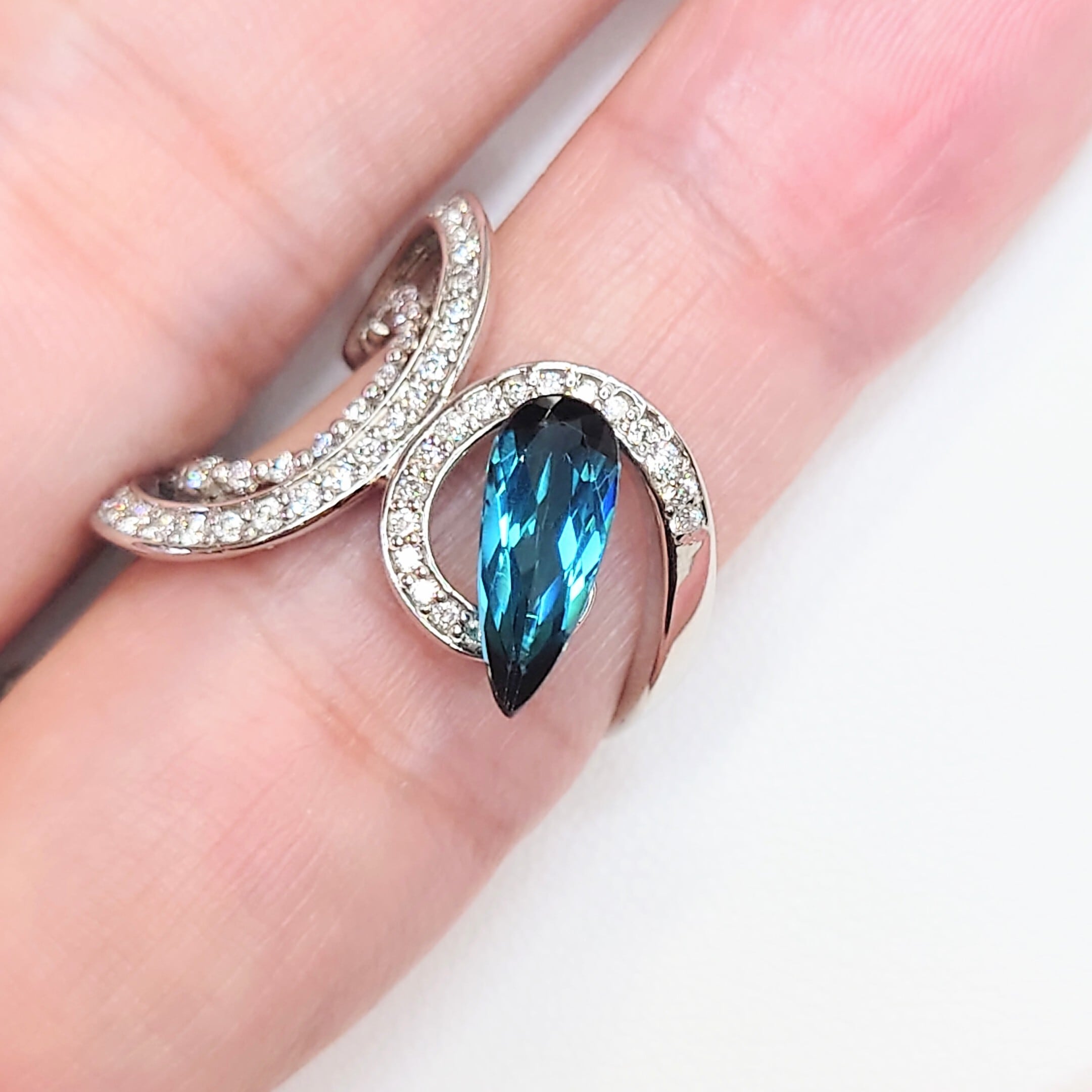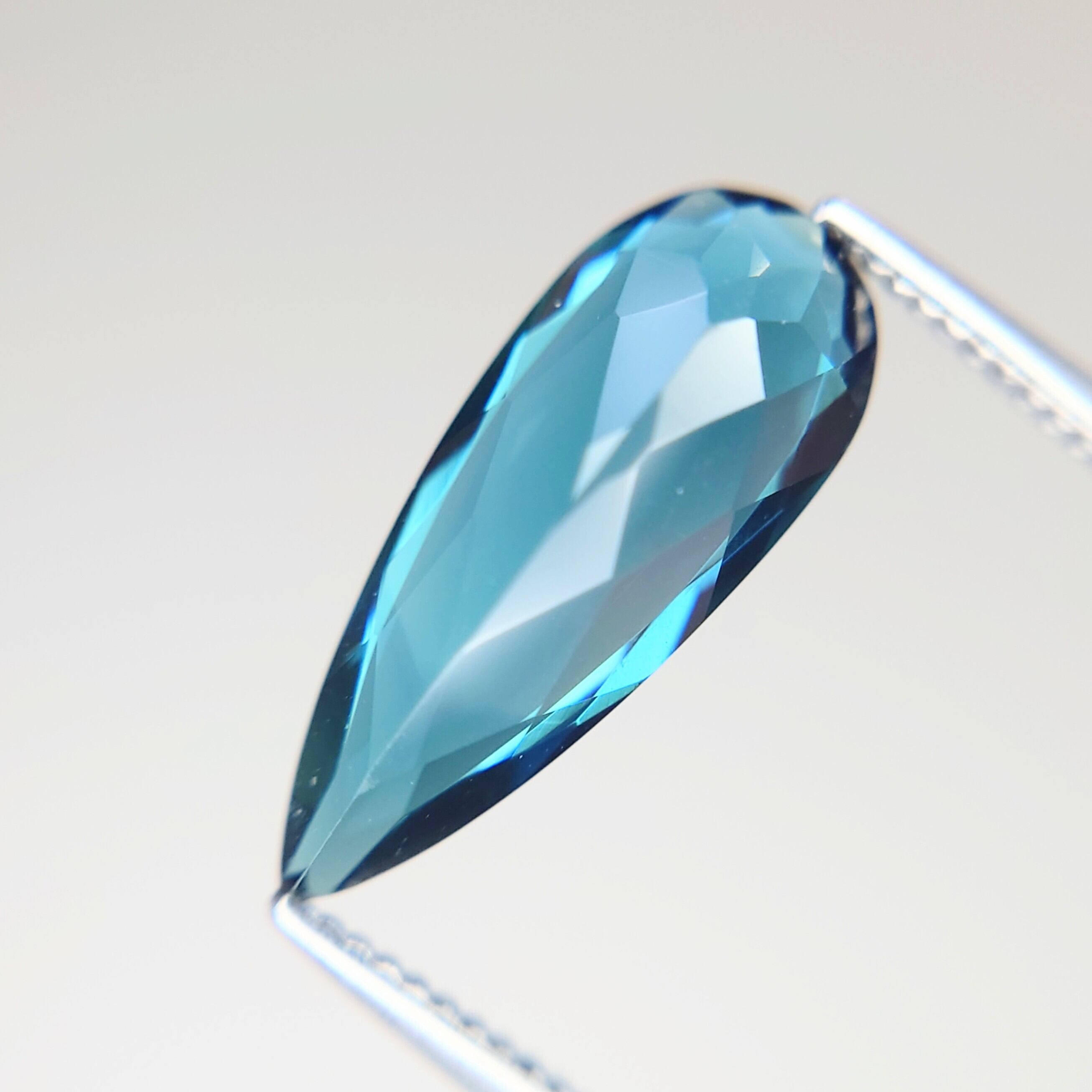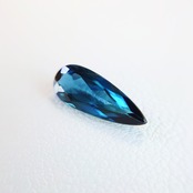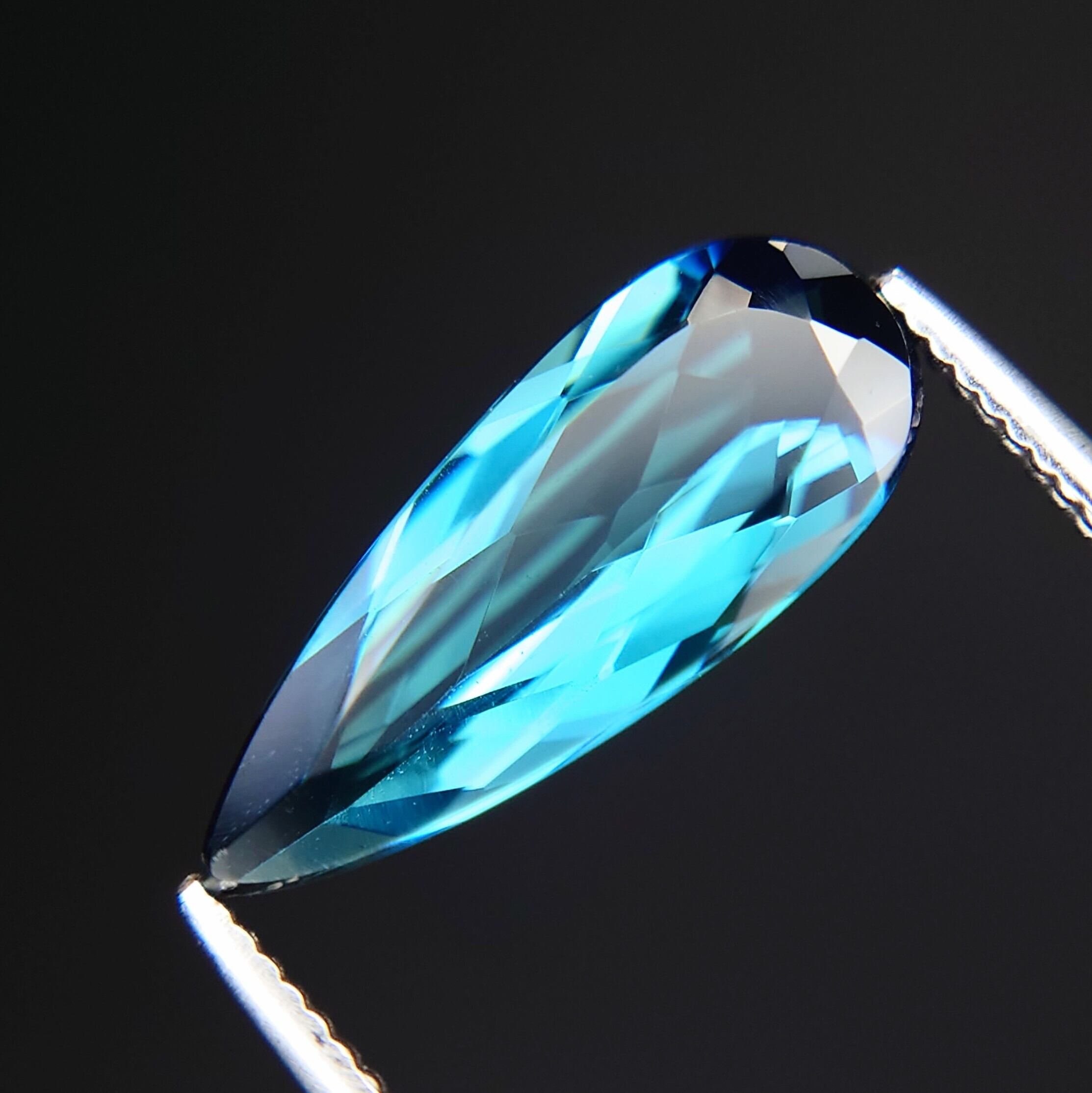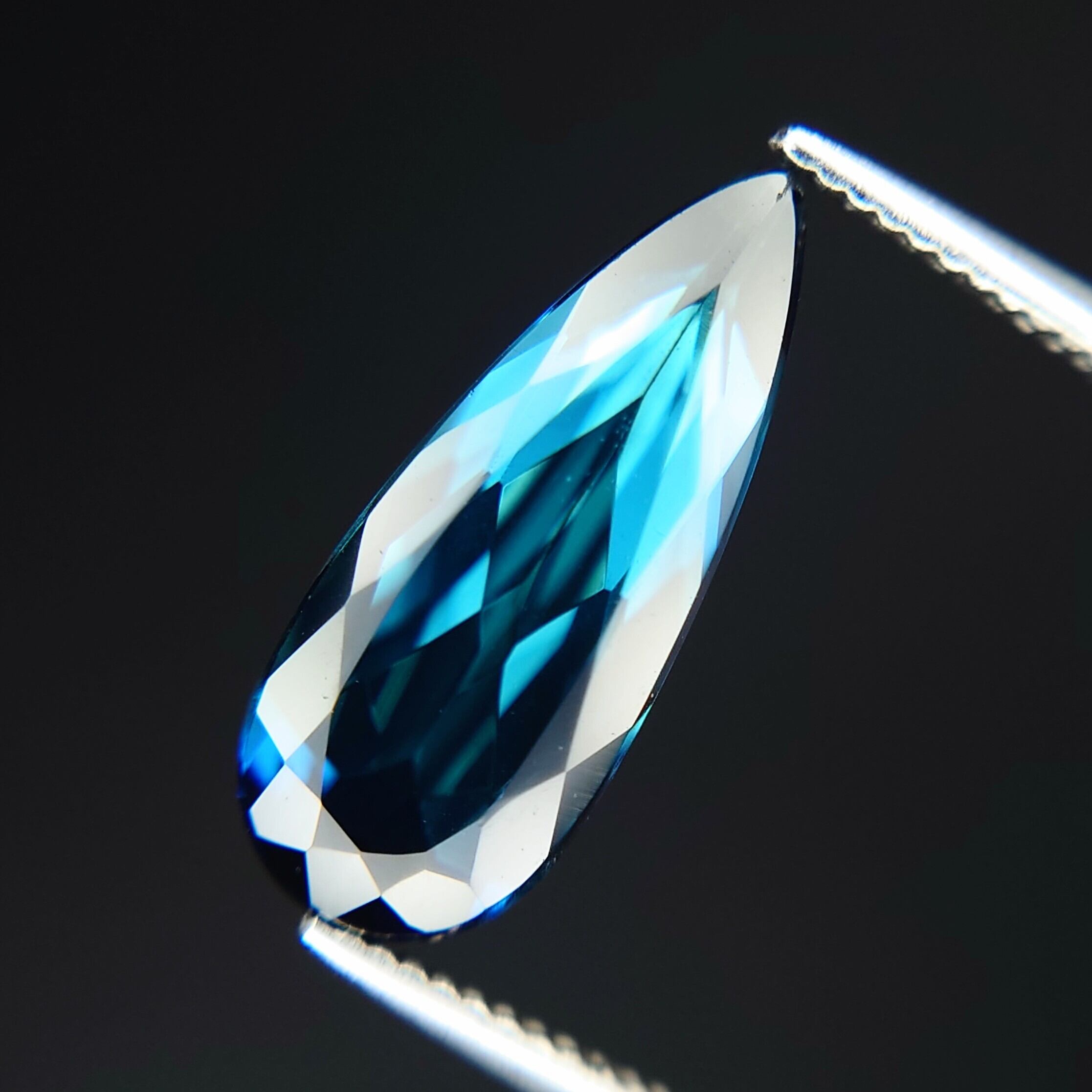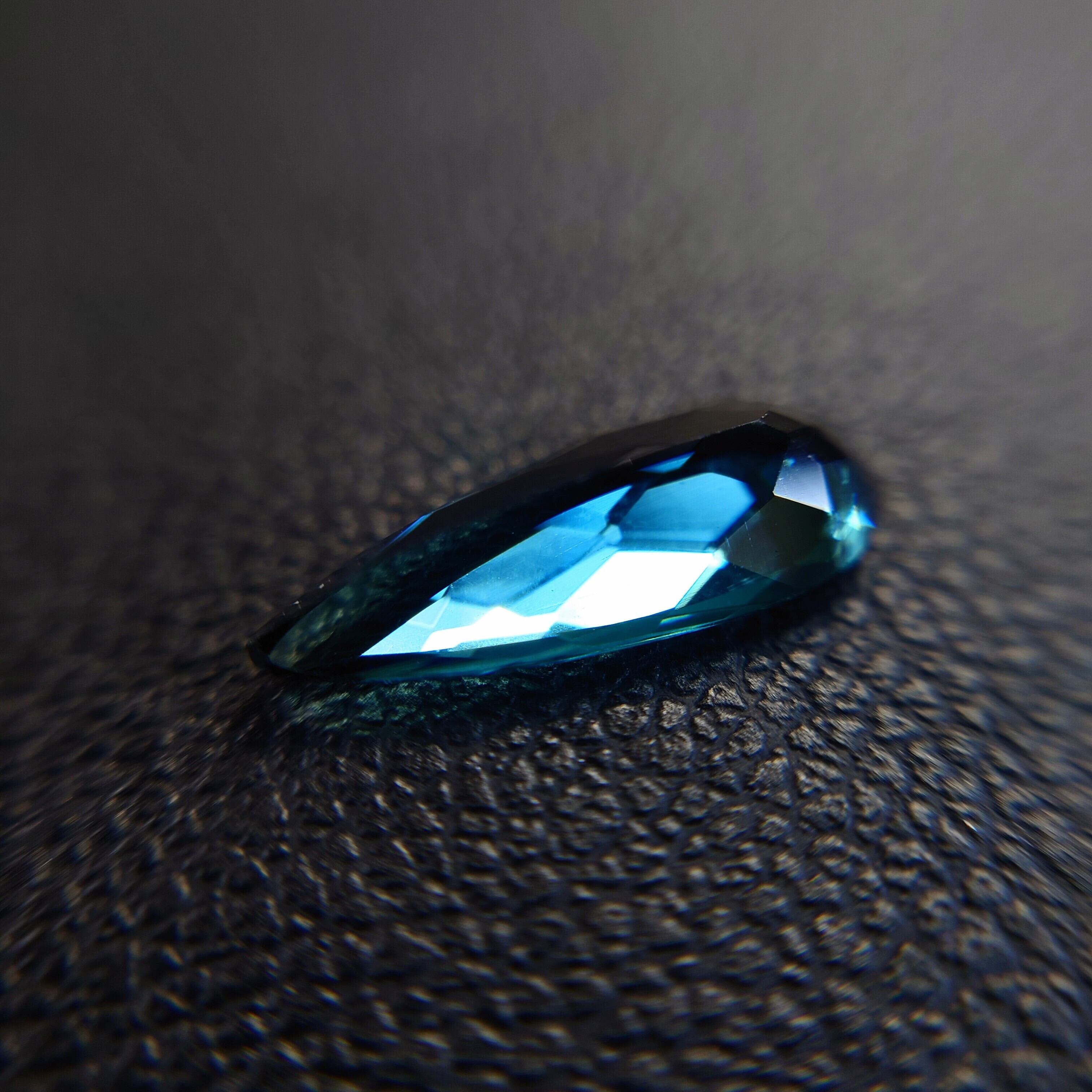 本石は ペア・モディファイド・ブリリアントカット が施され、縦長のプロポーション(12.14×4.93×2.87mm)がスタイリッシュな存在感を引き立てています。光を受けるたびに細やかなファセットが煌めき、深い青の中に透明感ある輝きが浮かび上がります。
