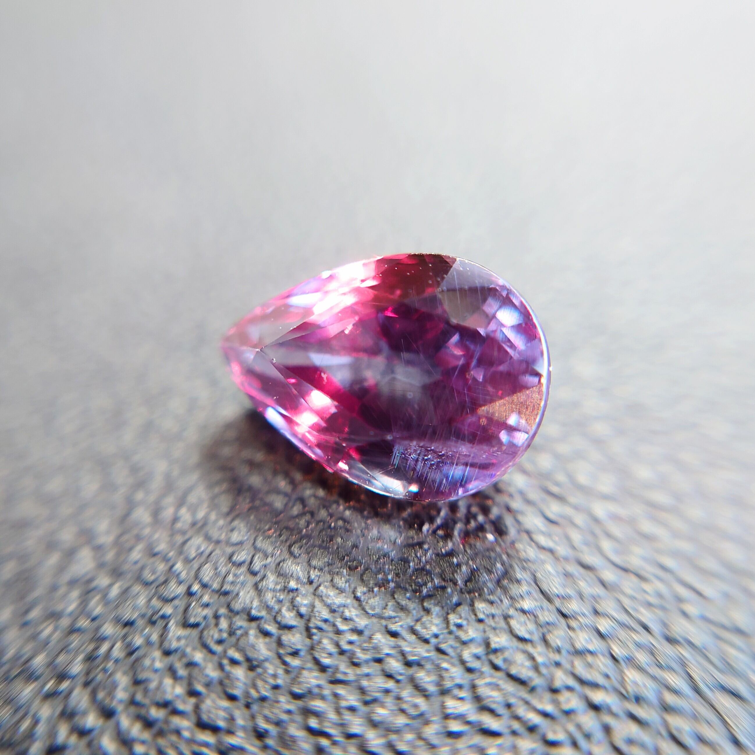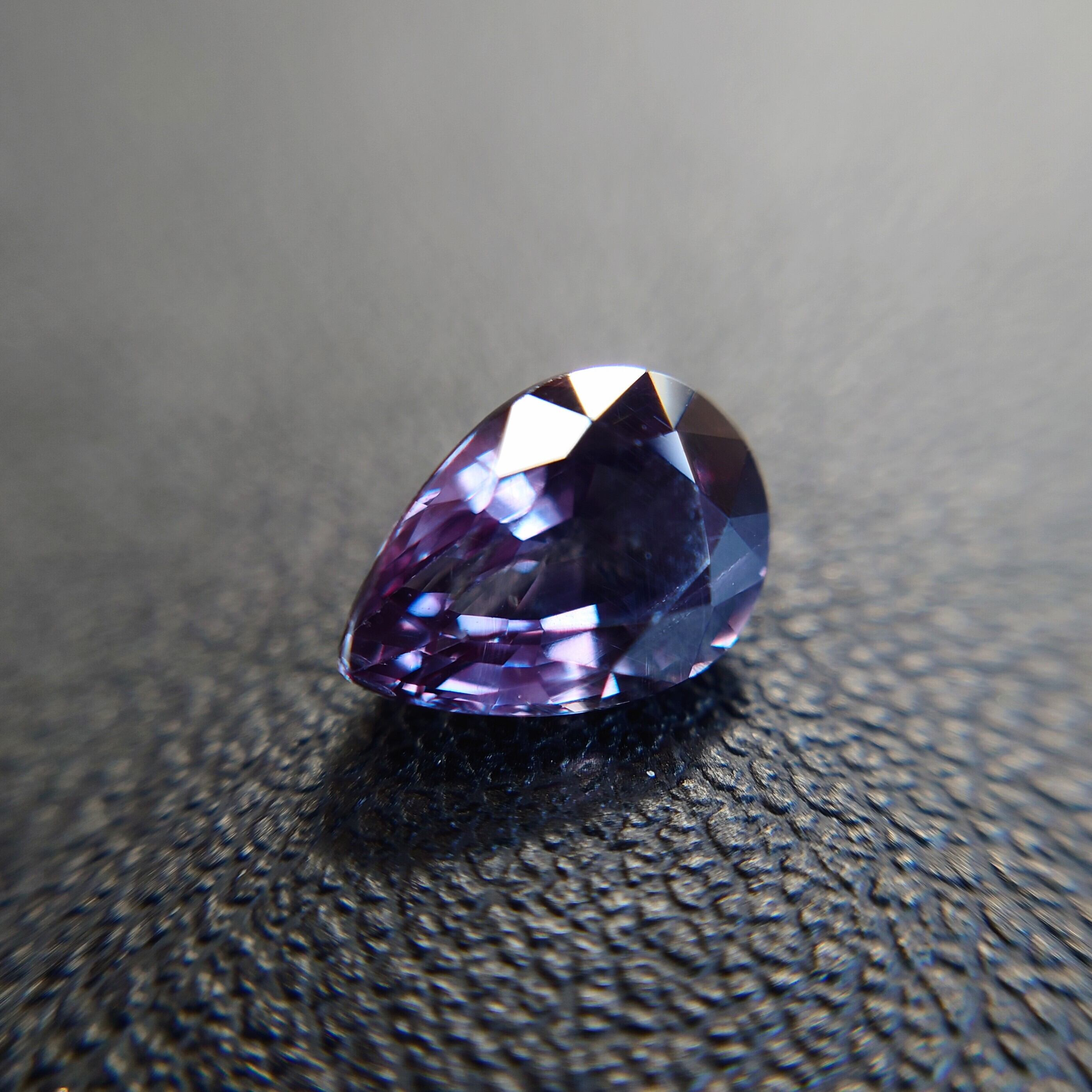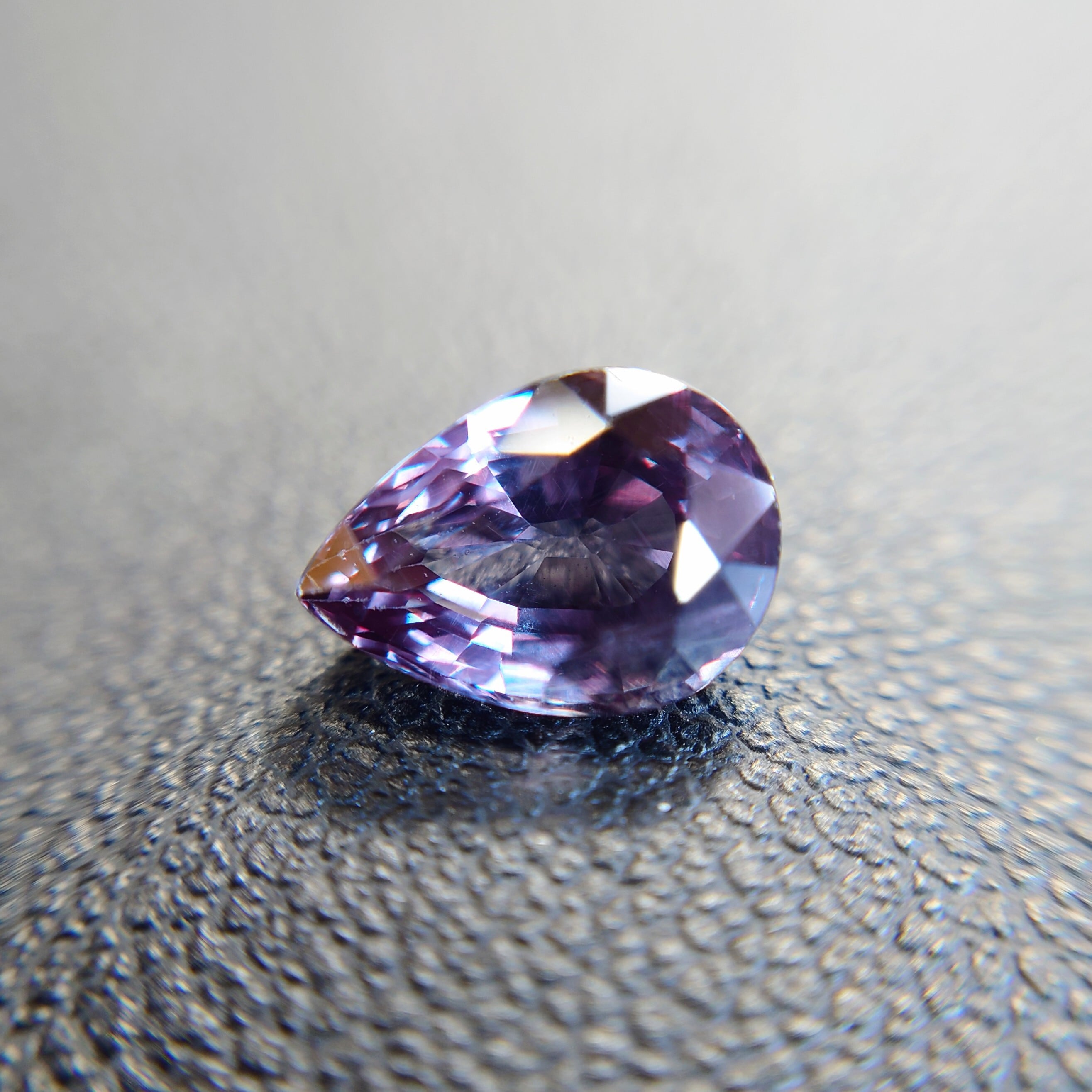 日光や蛍光灯の下では鮮やかなパープリッシュブルーが煌めき、白熱灯下では深みのあるピンキッシュレッドを呈します。
