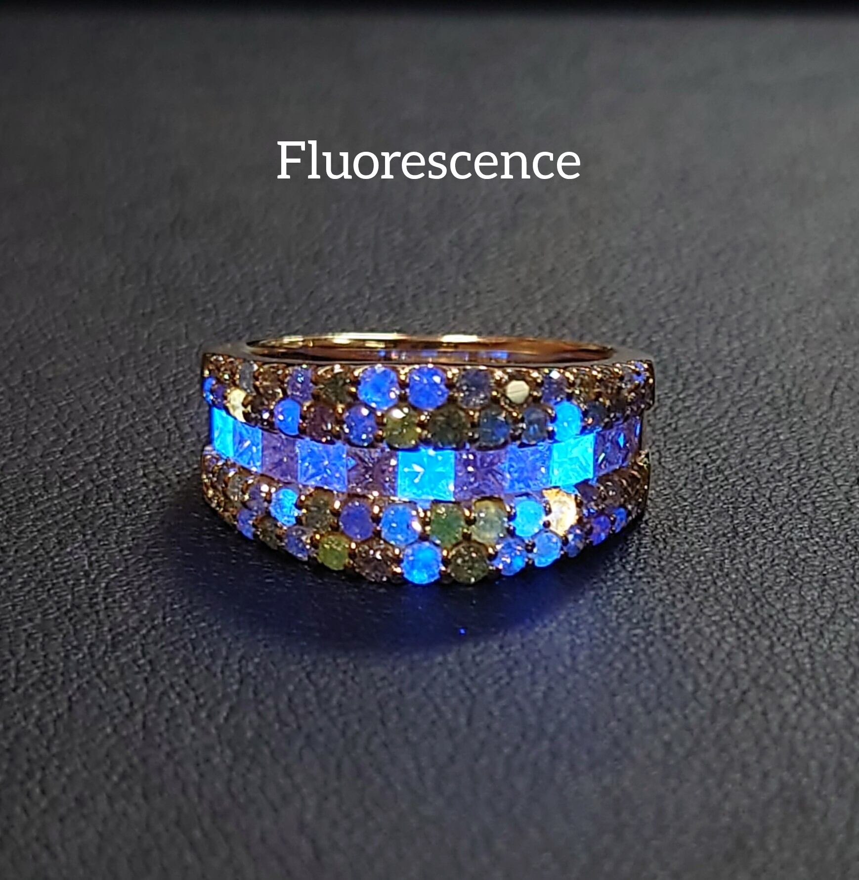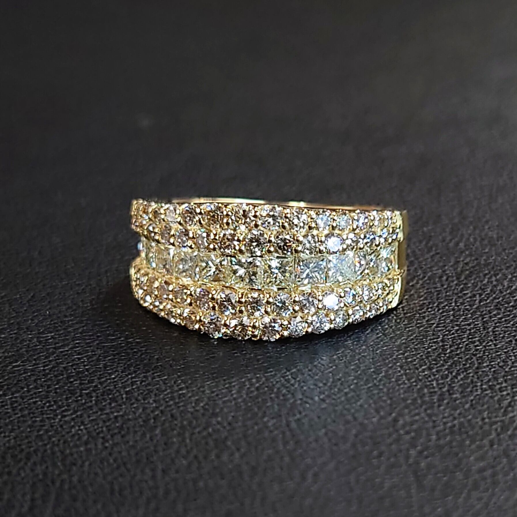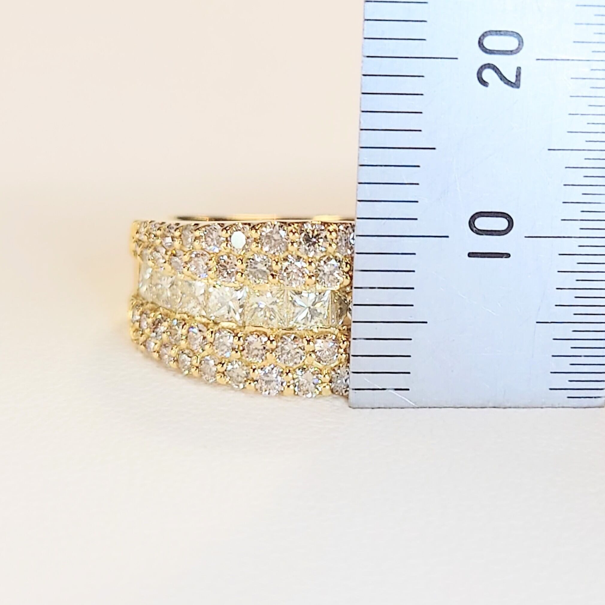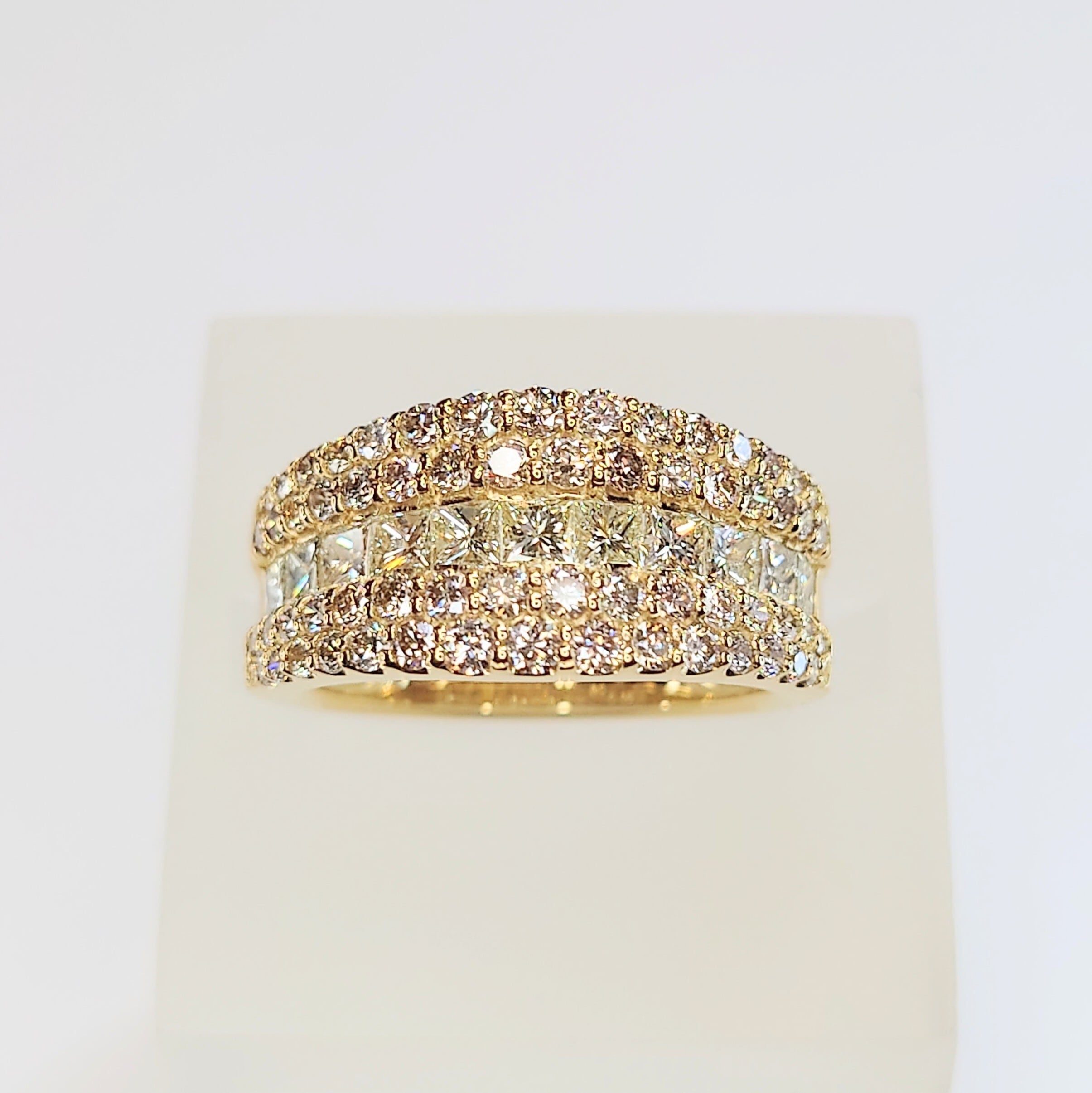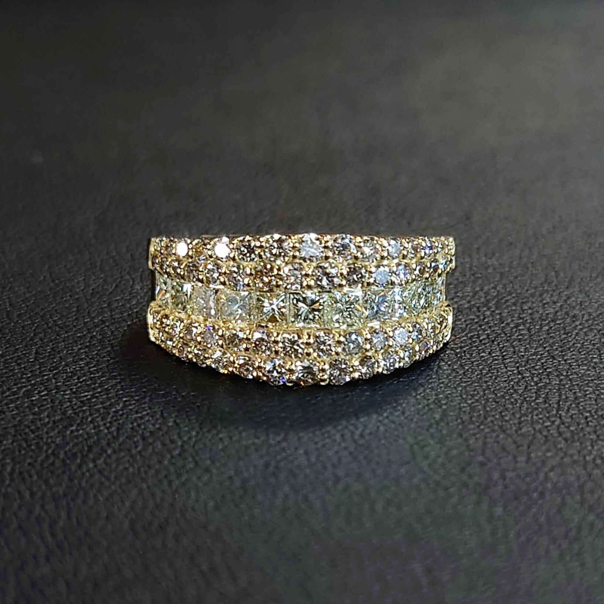 華麗なデザインリング、中央にライトイエローのプリンセスカットを11ピース配し、両サイドをライトブラウンのラウンドブリリアント62ピースで縁取ることで、力強い輝きと繊細な煌めきを融合させています。
