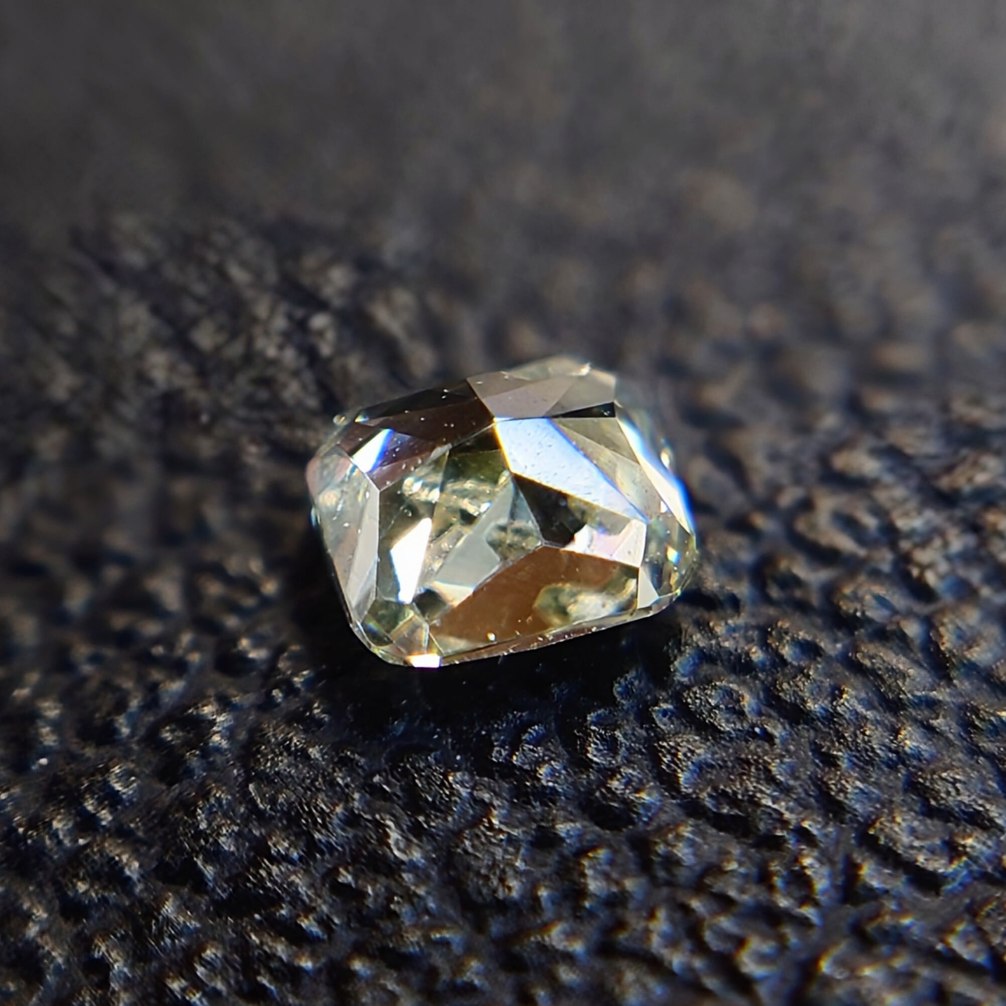 クッションカットのファセットが光をやさしく取り込み、