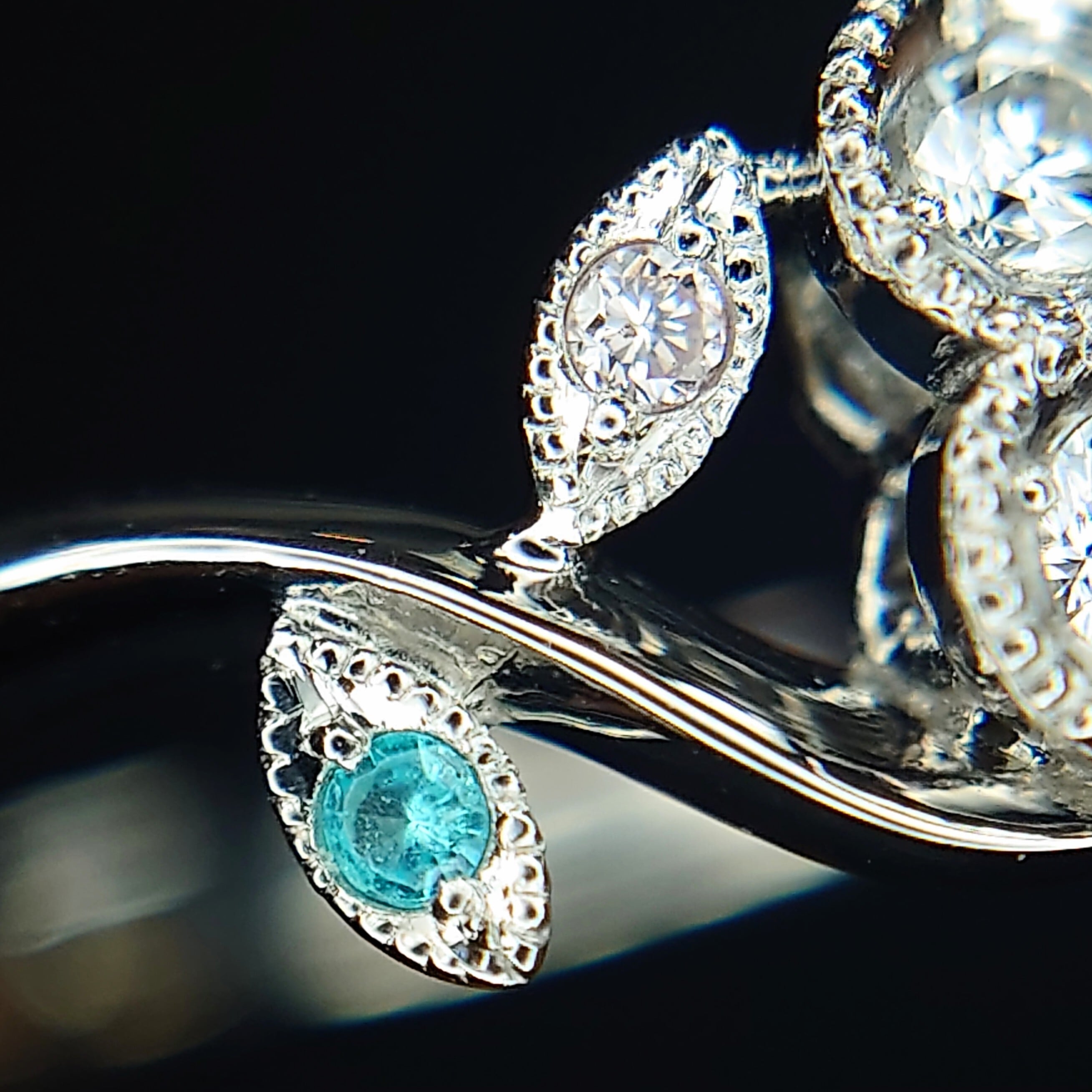 その周囲を繊細なメレダイヤモンドが花冠のように囲み、両サイドには南国の海を思わせるパライバトルマリンがアクセントとして輝きます。