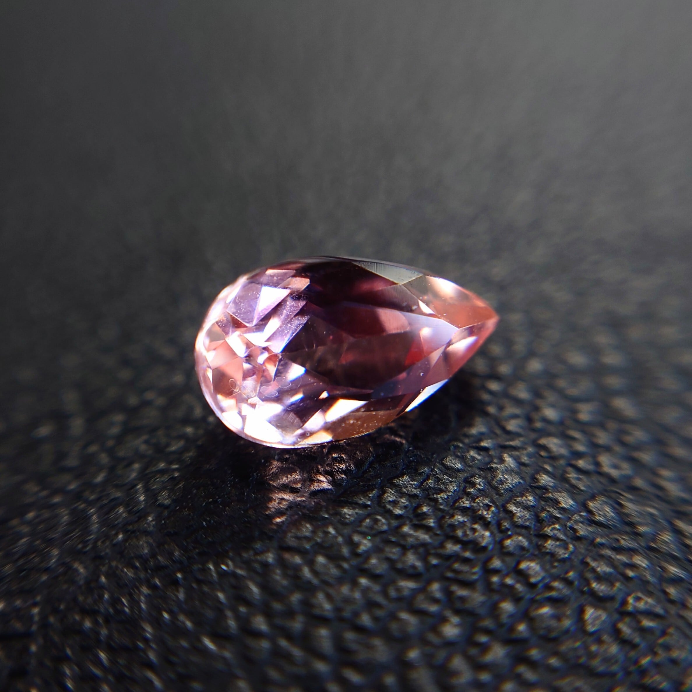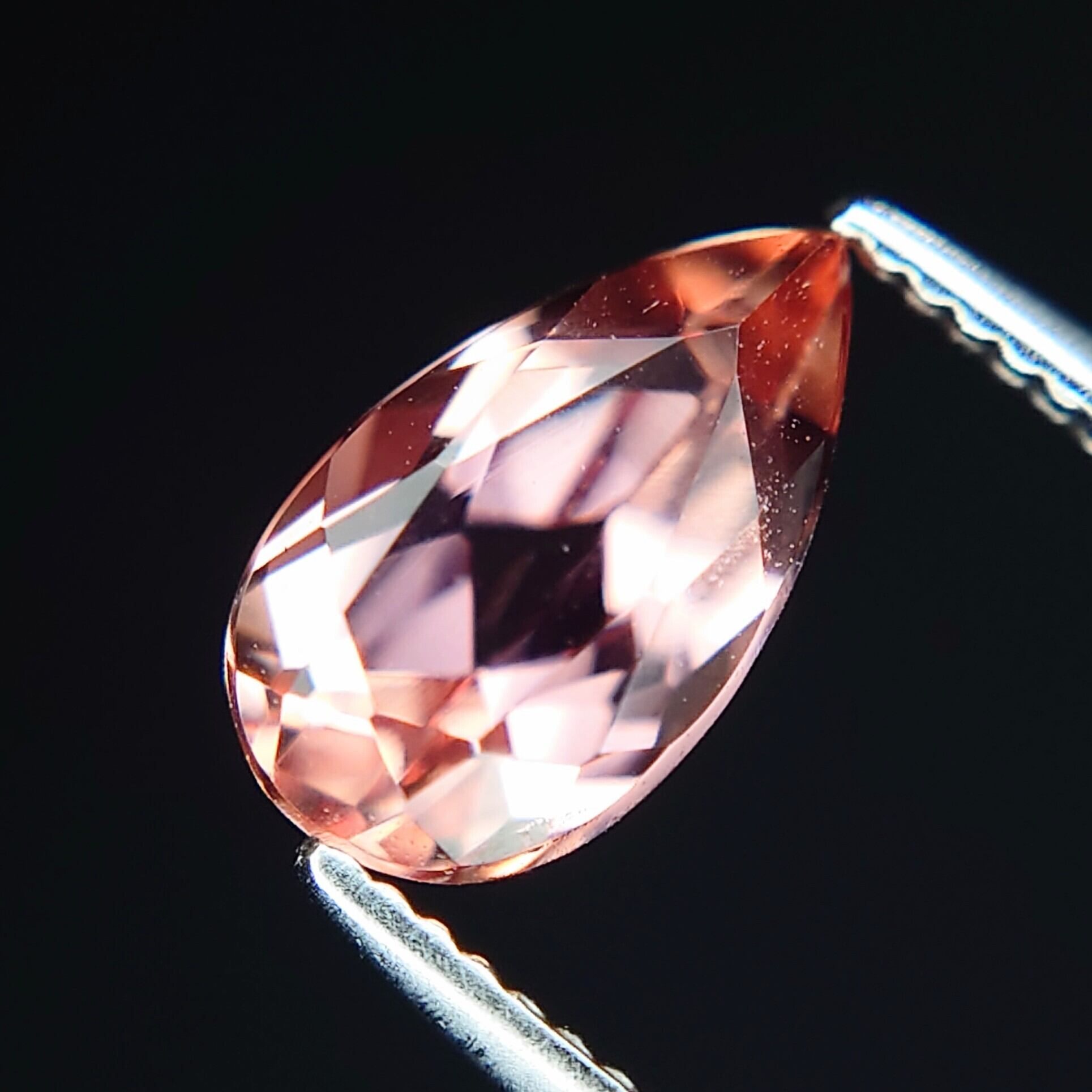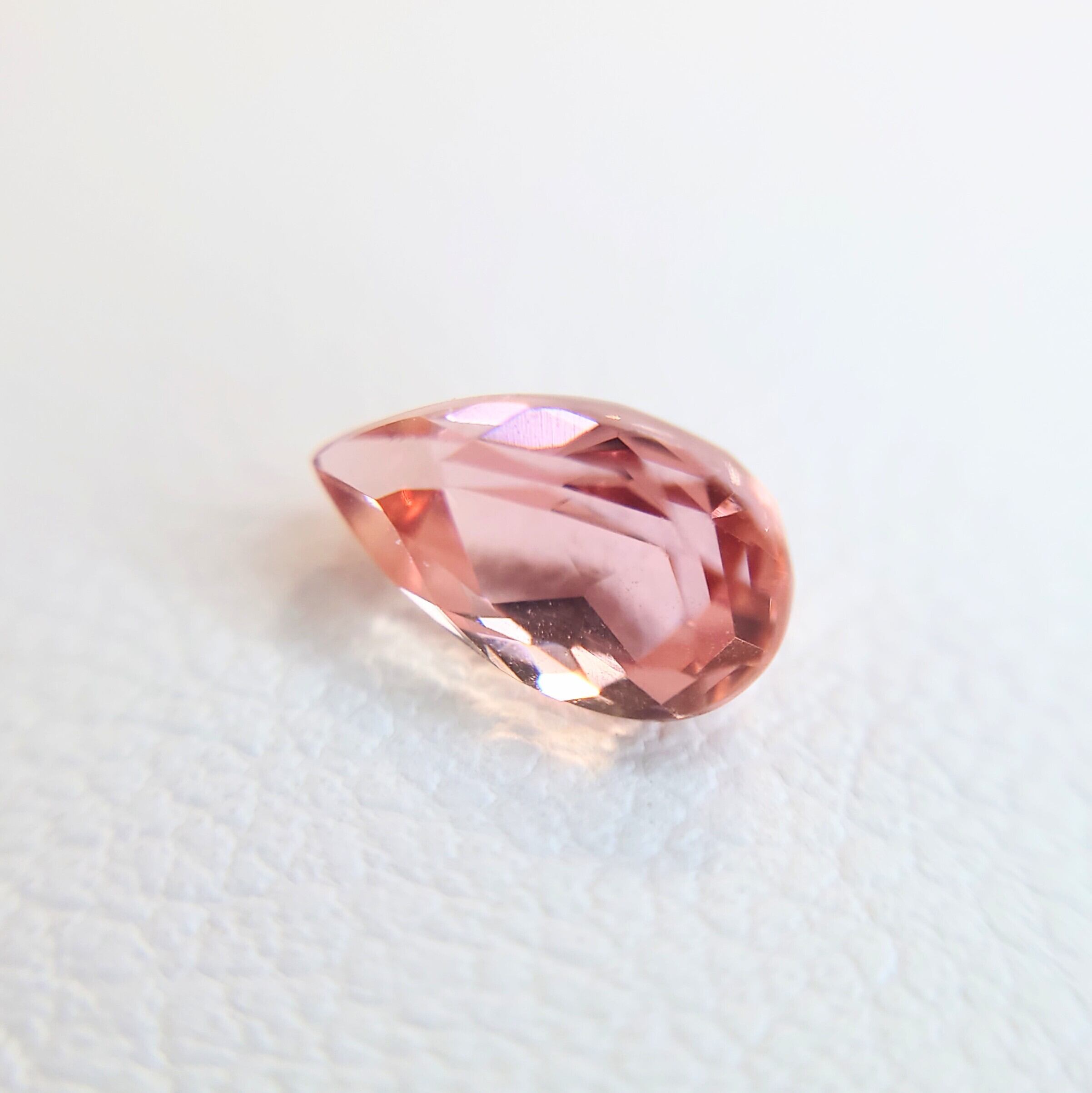 優美なペア モディファイド ブリリアント カットが、瑞々しい輝きを引き出し、繊細なピンクオレンジの煌めきが指先に温かな光を添えます。