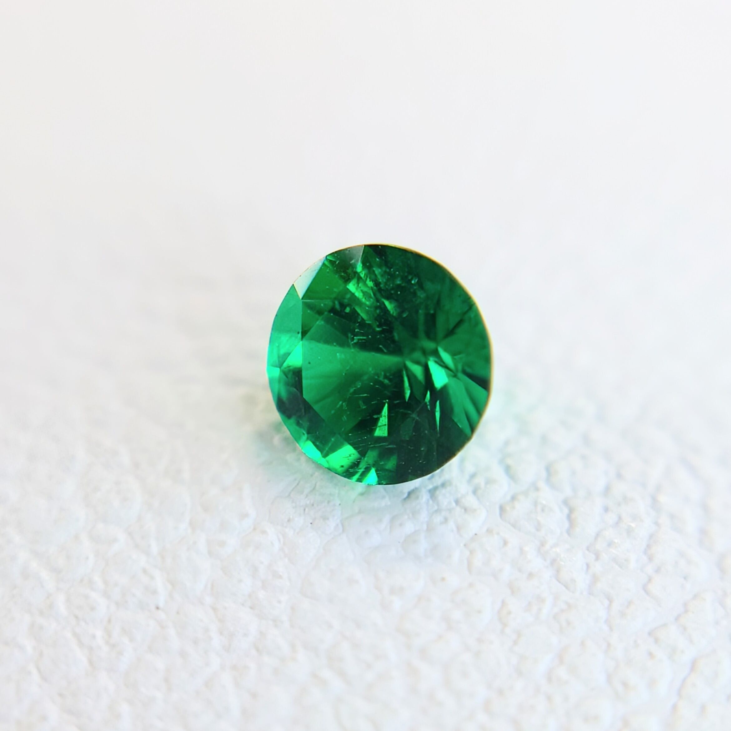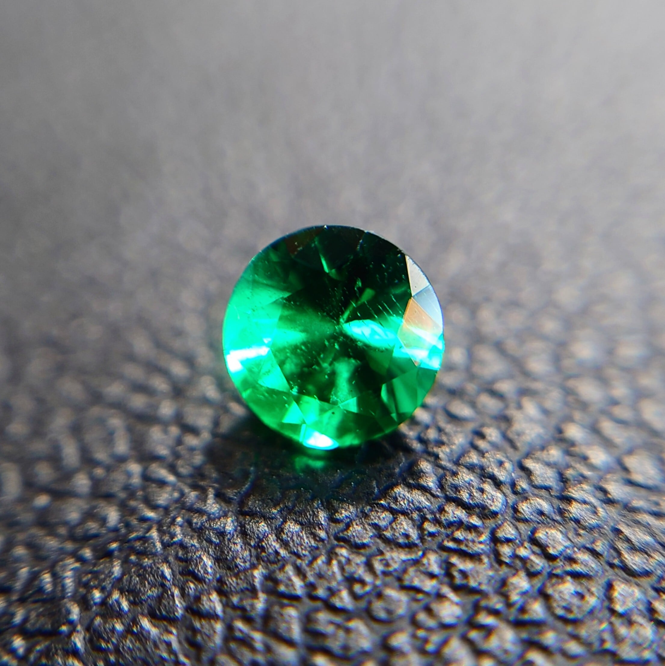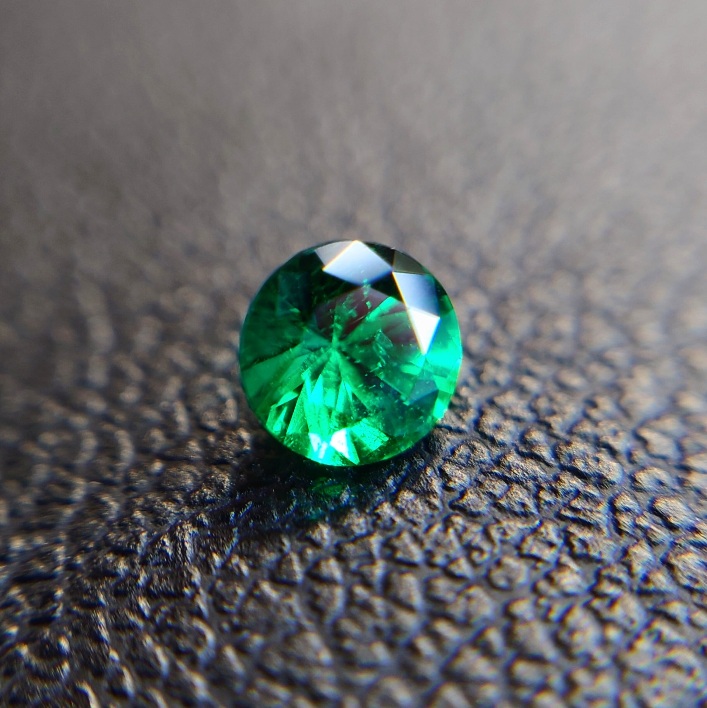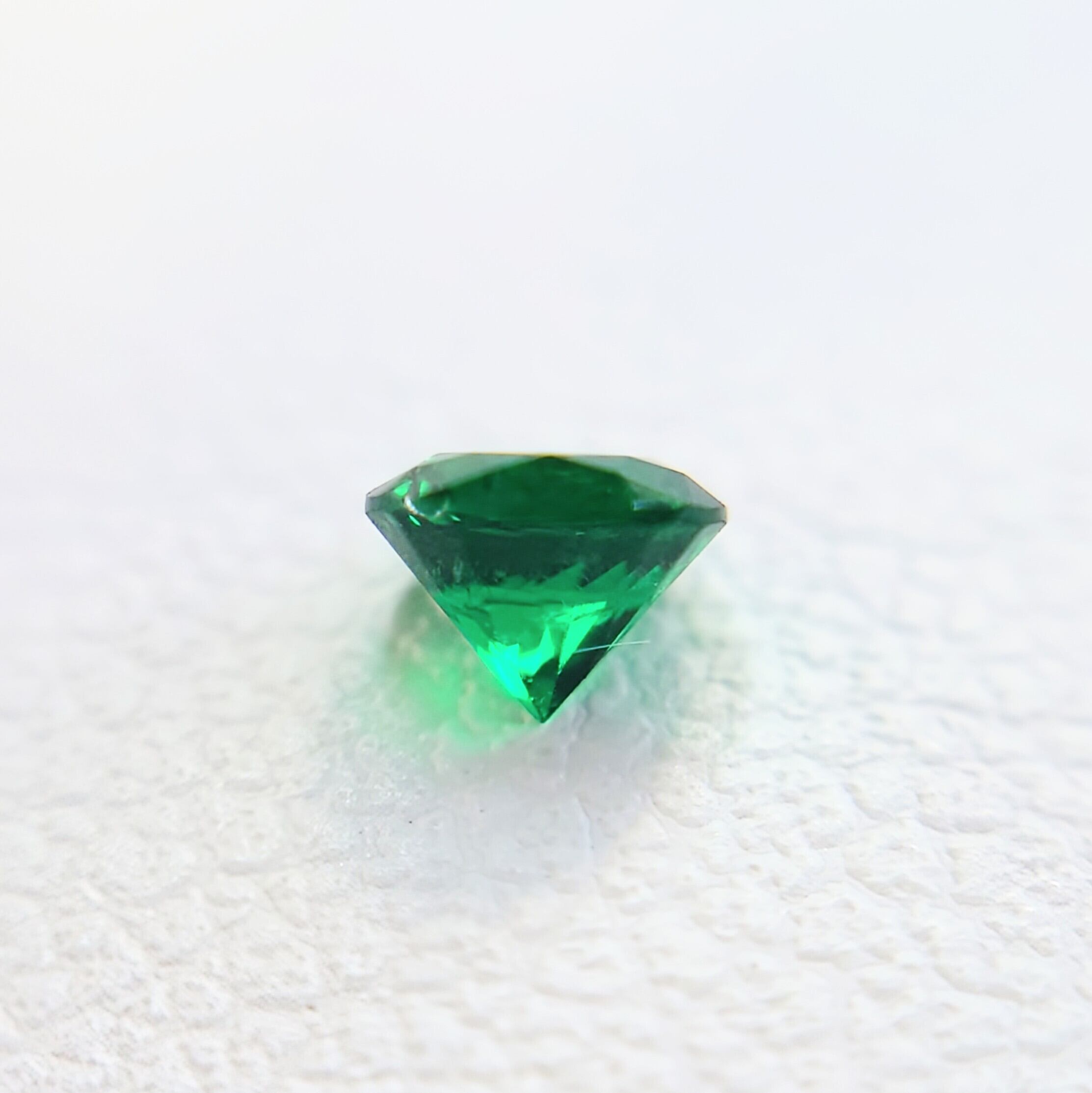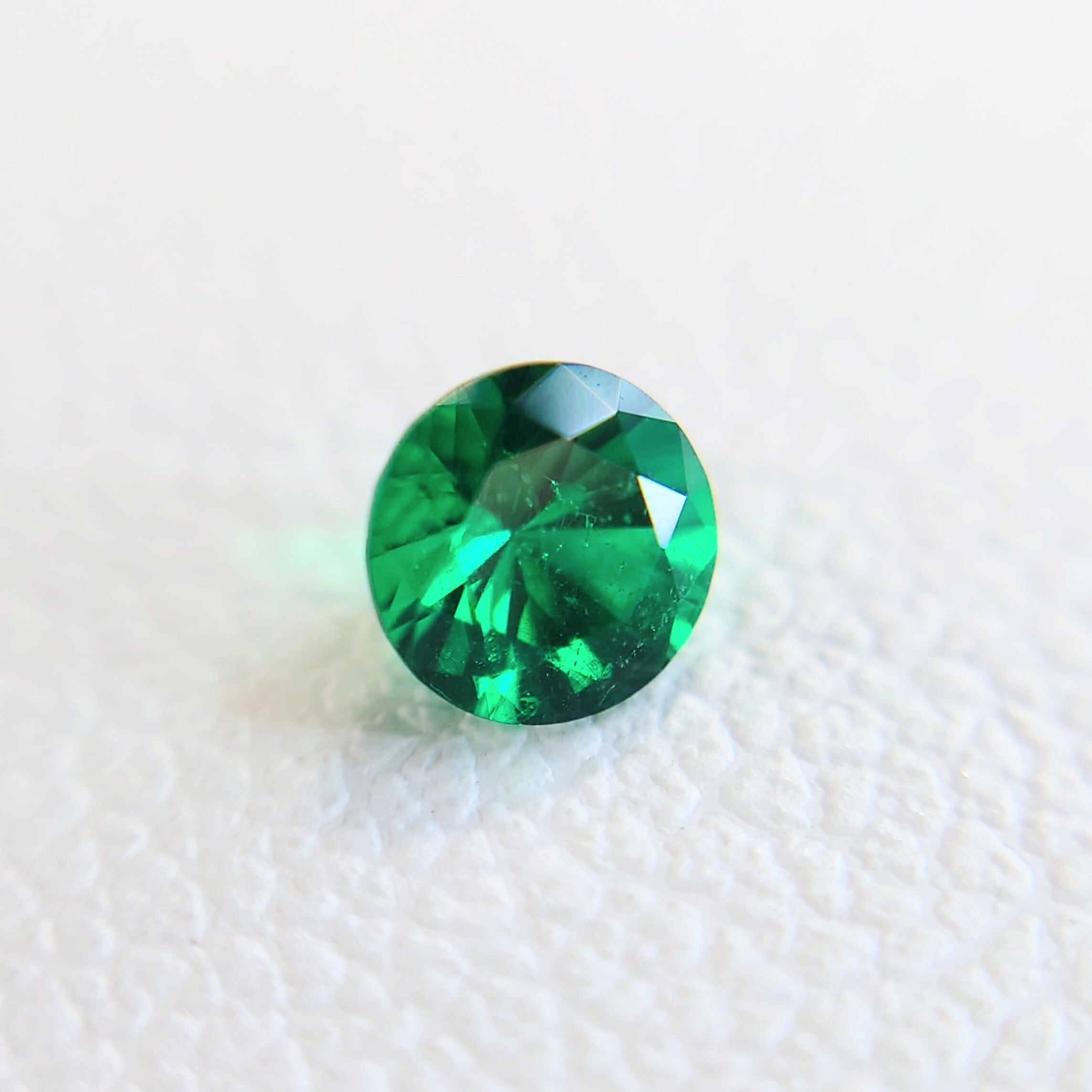 透明感のある鮮やかなグリーンを宿した、ラウンド・ブリリアントカットのエメラルドです。