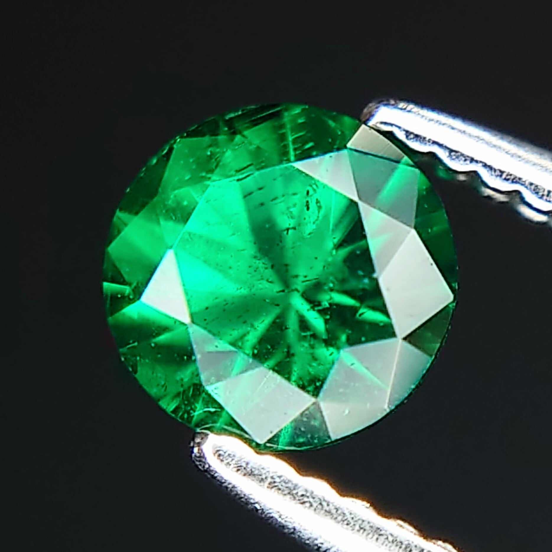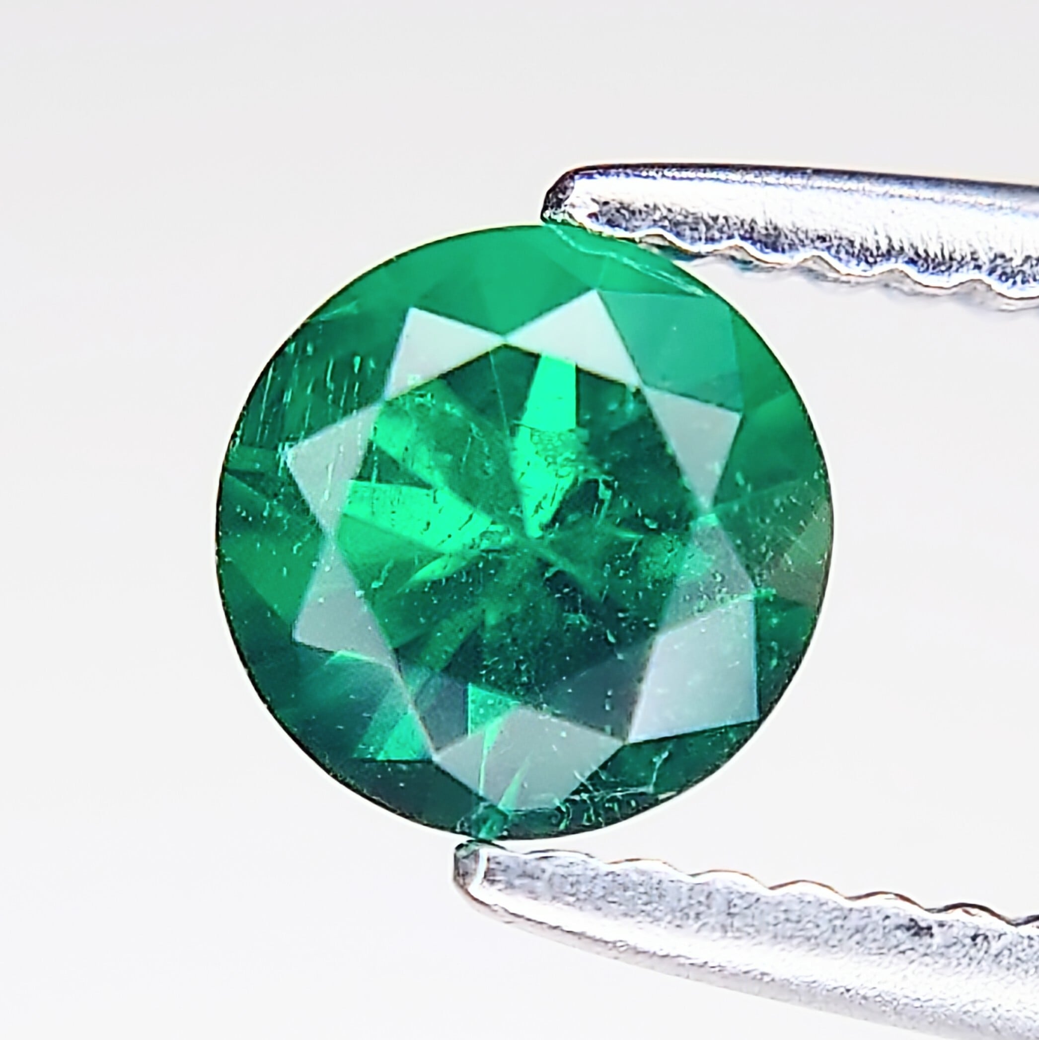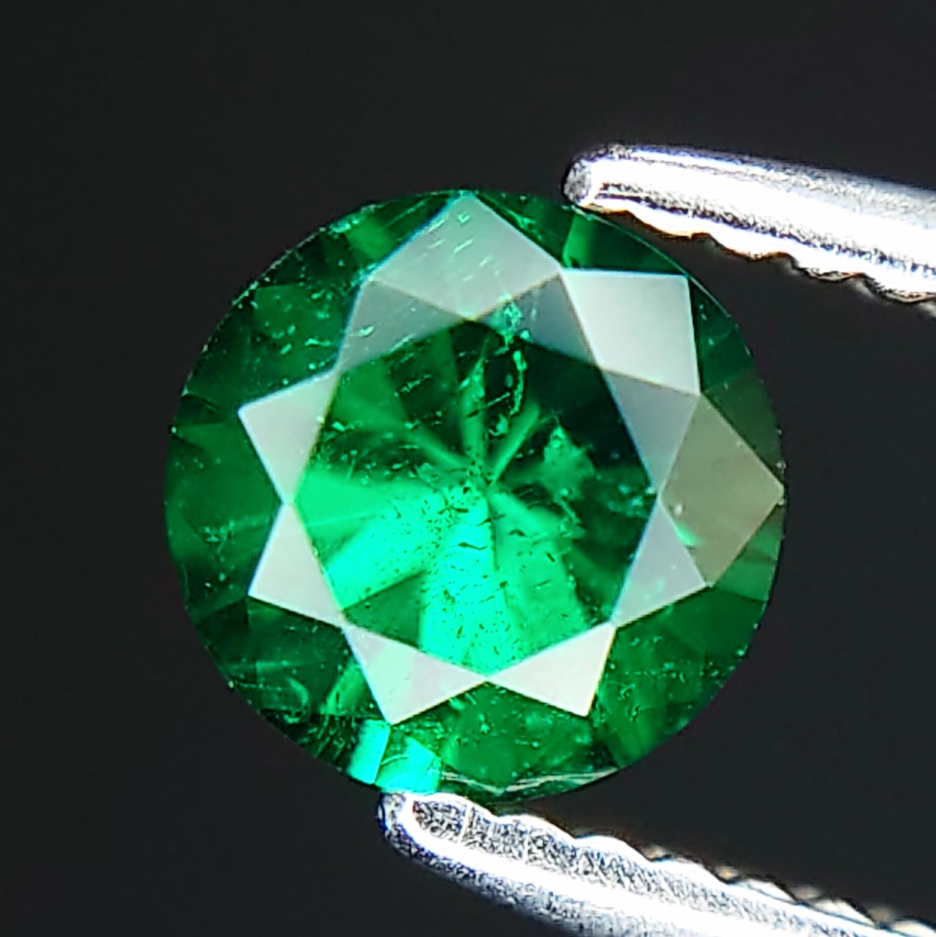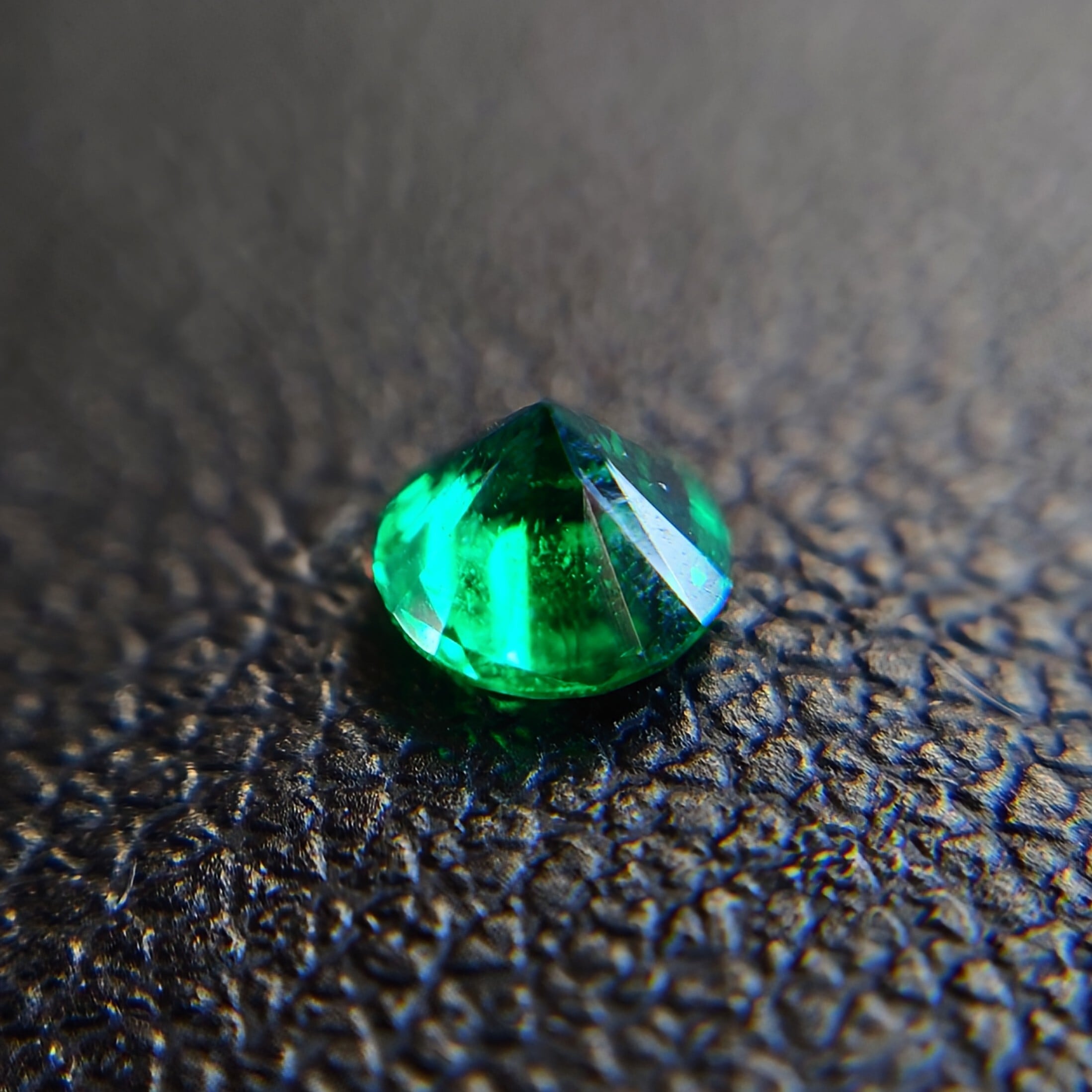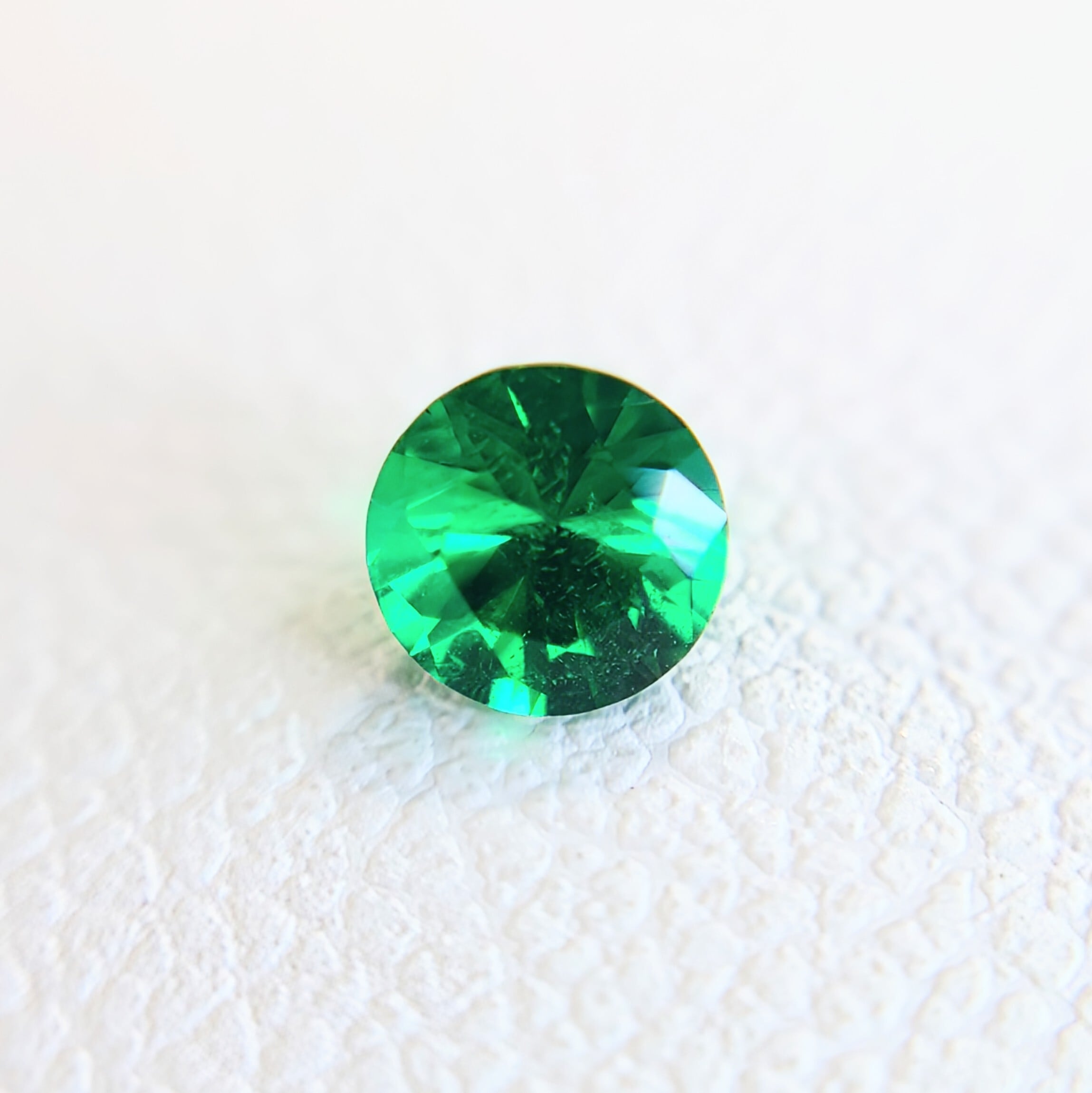 透明感のある鮮やかなグリーンを宿した、ラウンド・ブリリアントカットのエメラルドです。