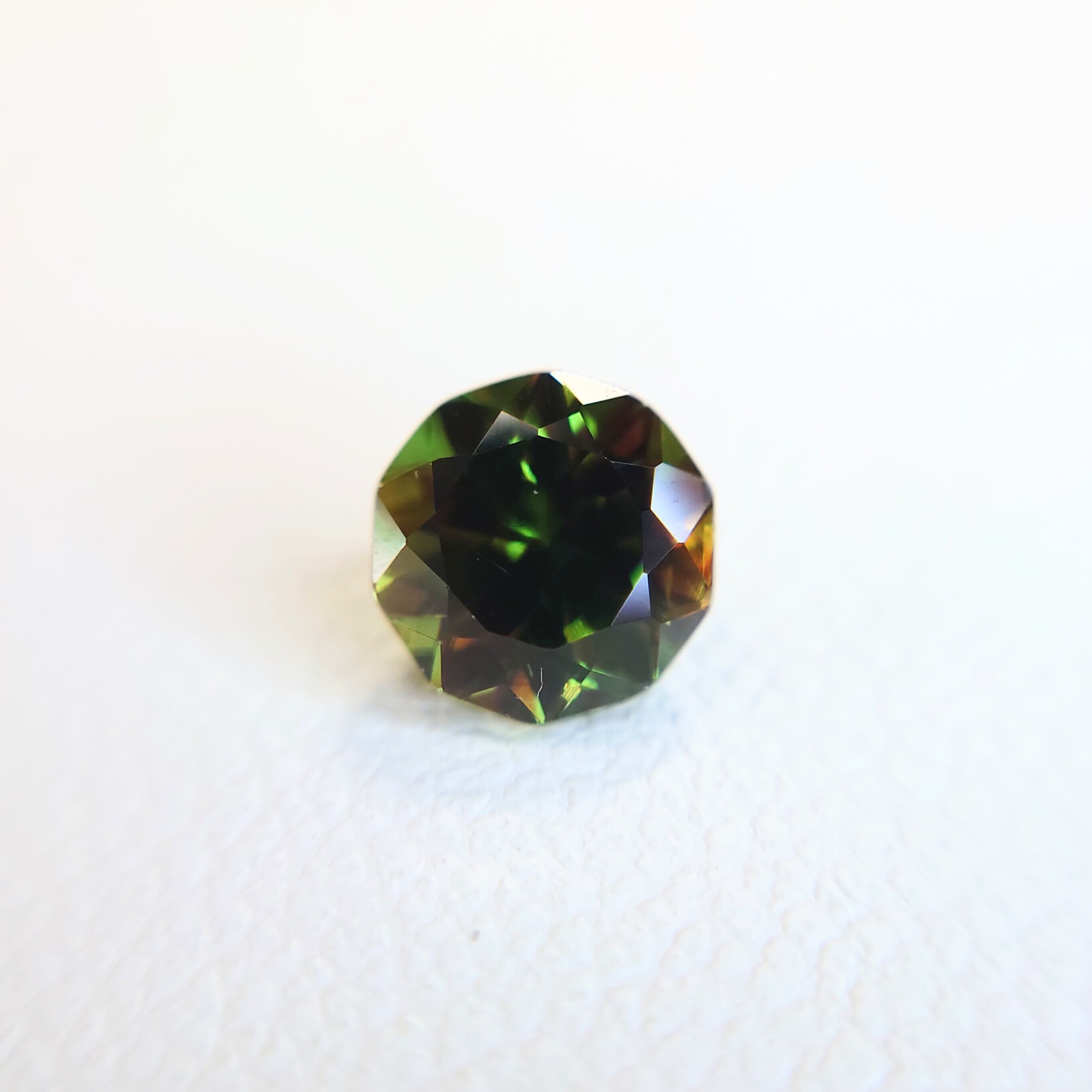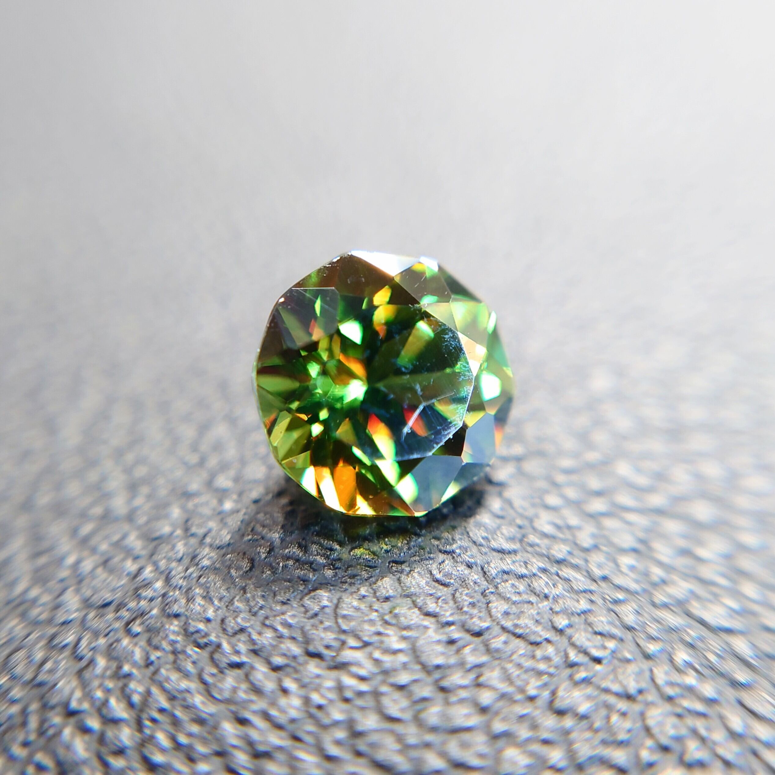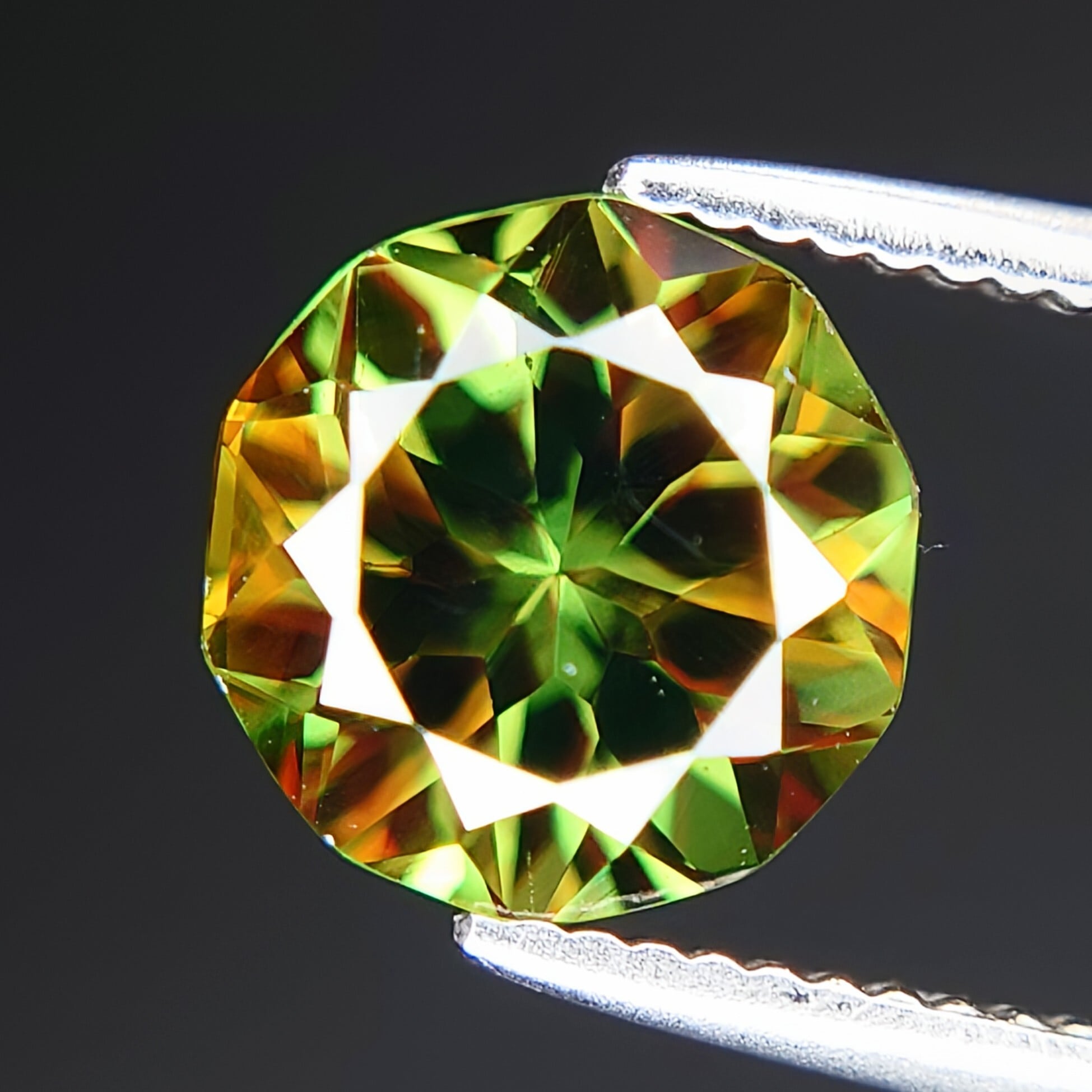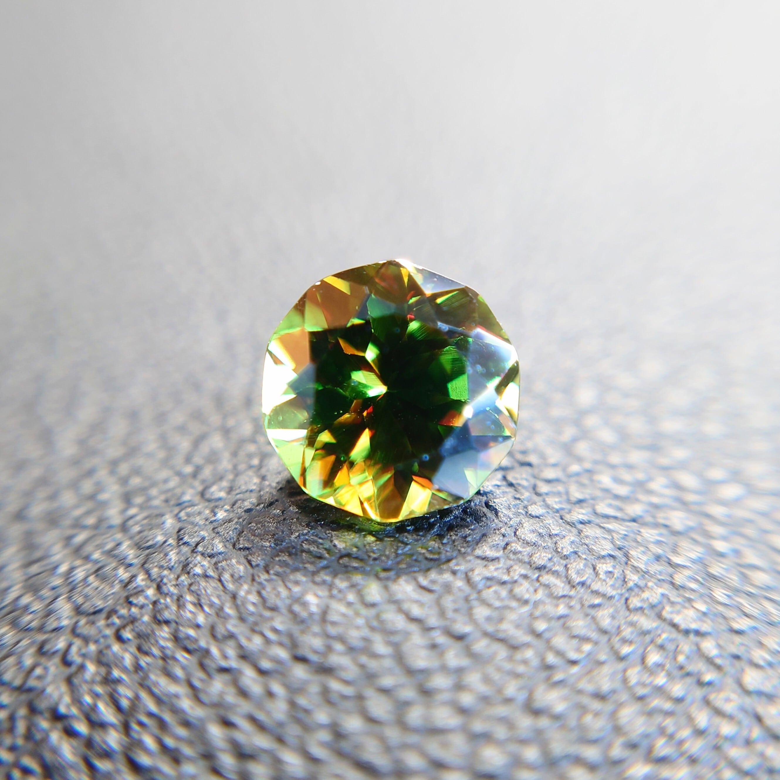 モディファイド ラウンド ブリリアント カットは、スフェーン特有の高い屈折率と分散を最大限に活かし、