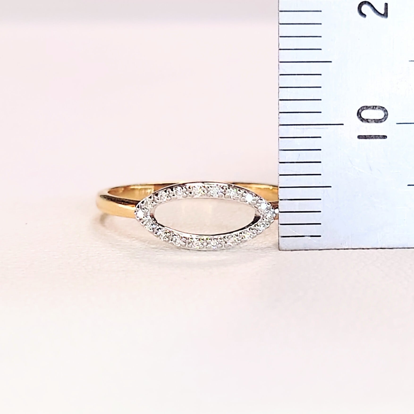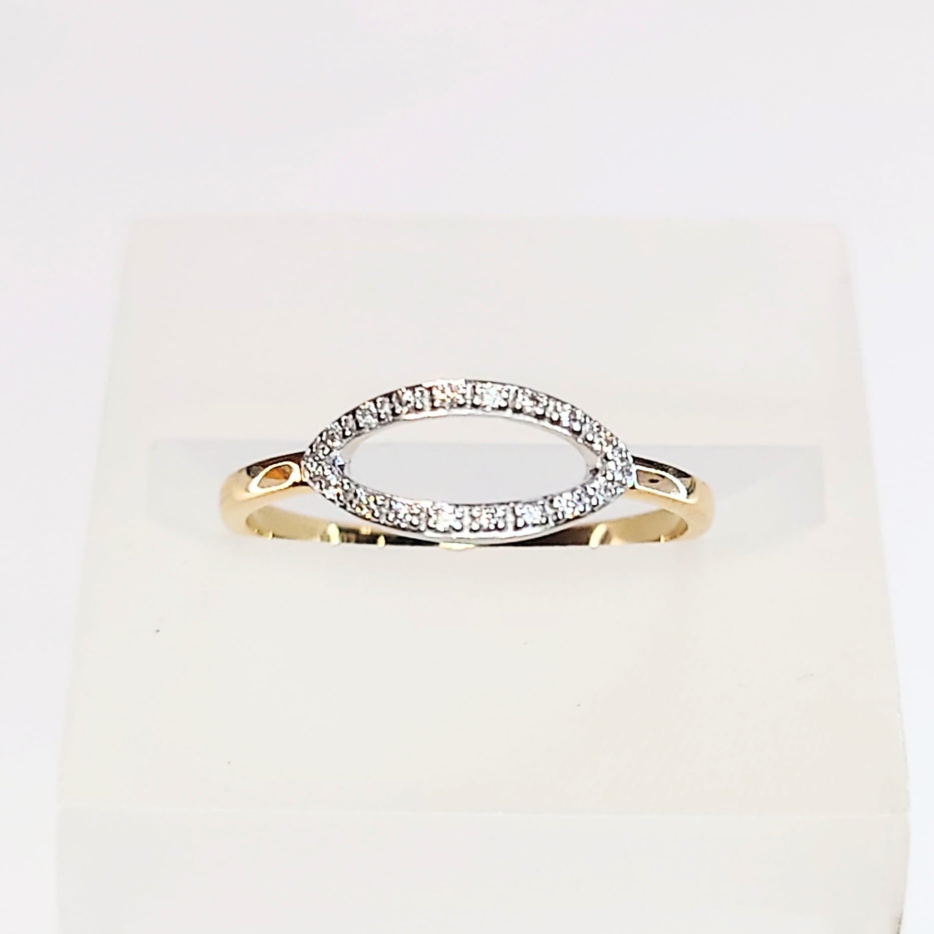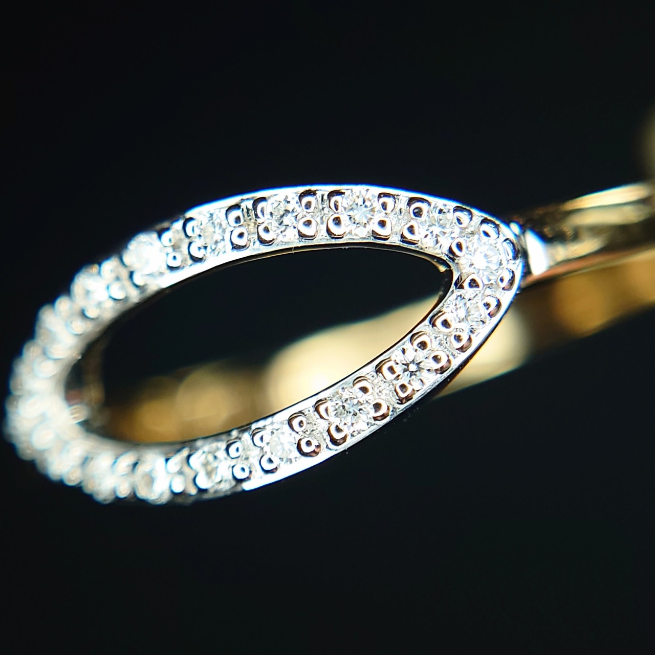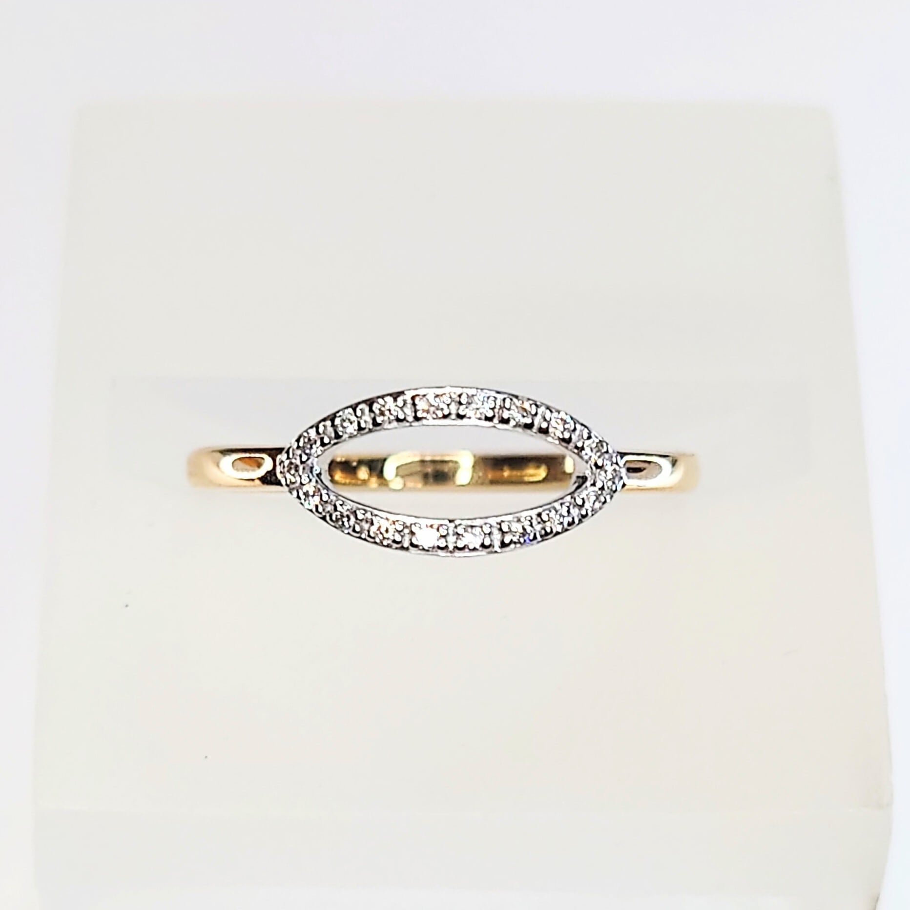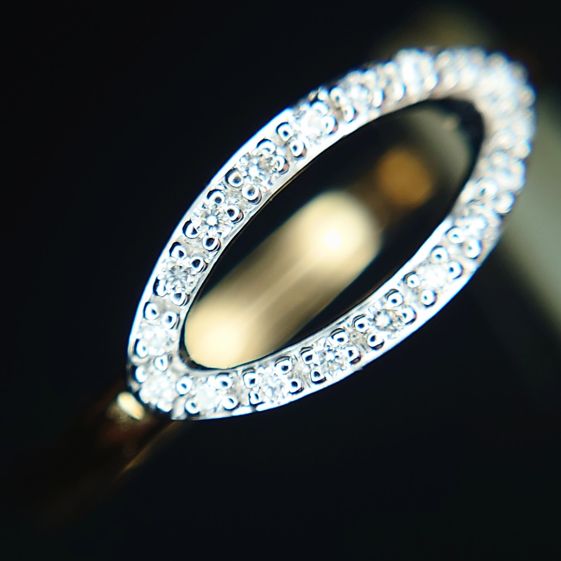 繊細なマーキスシェイプのフレームに、18石・計0.07ctのダイヤモンドを贅沢にセッティングした、洗練されたデザインのダイヤモンドリング。