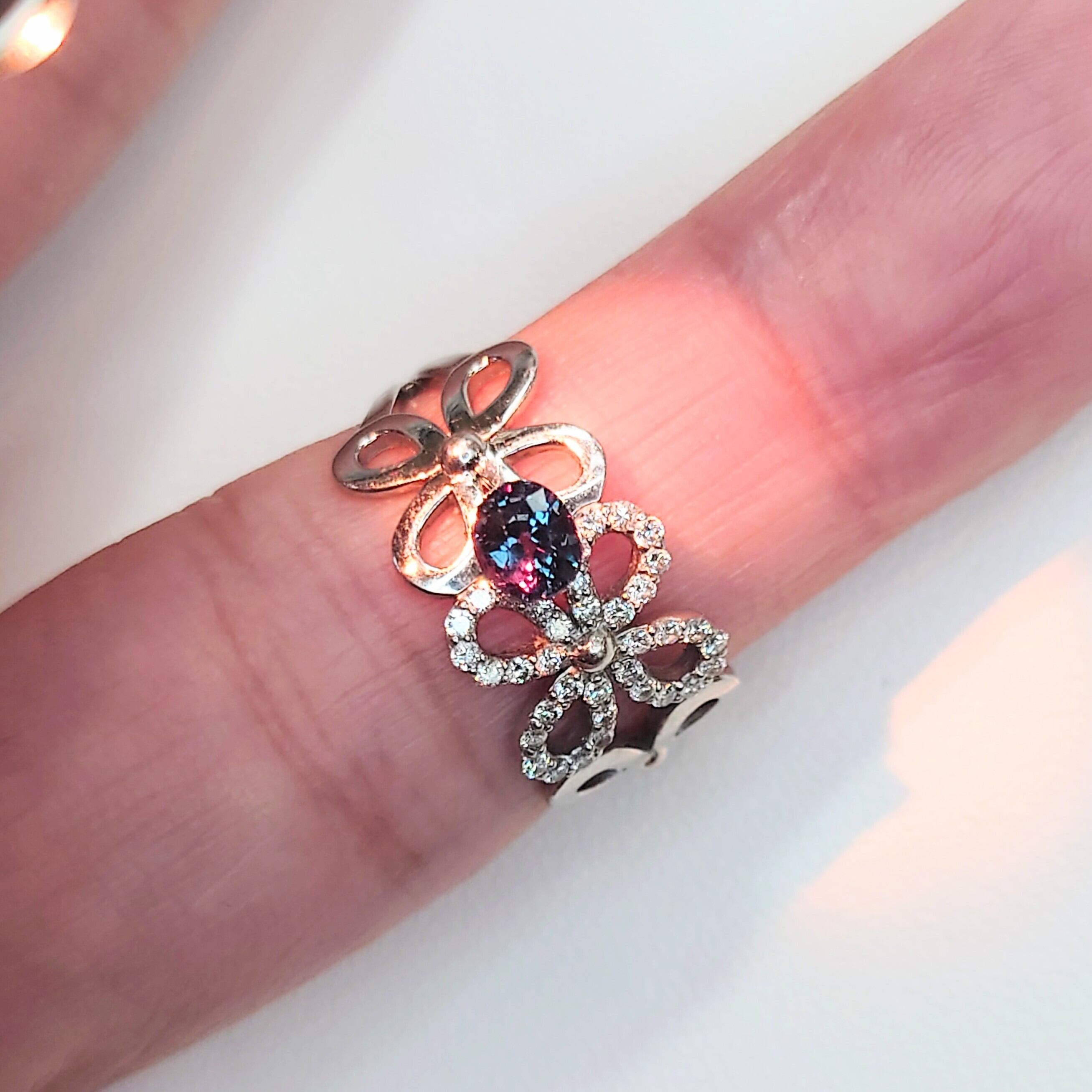 光源によって印象を変える魅惑的な色彩が最大の魅力で、自然光下では深みのあるクールなブルー、暖色光下ではパープル系の華やかな色合いへと表情を変えます。