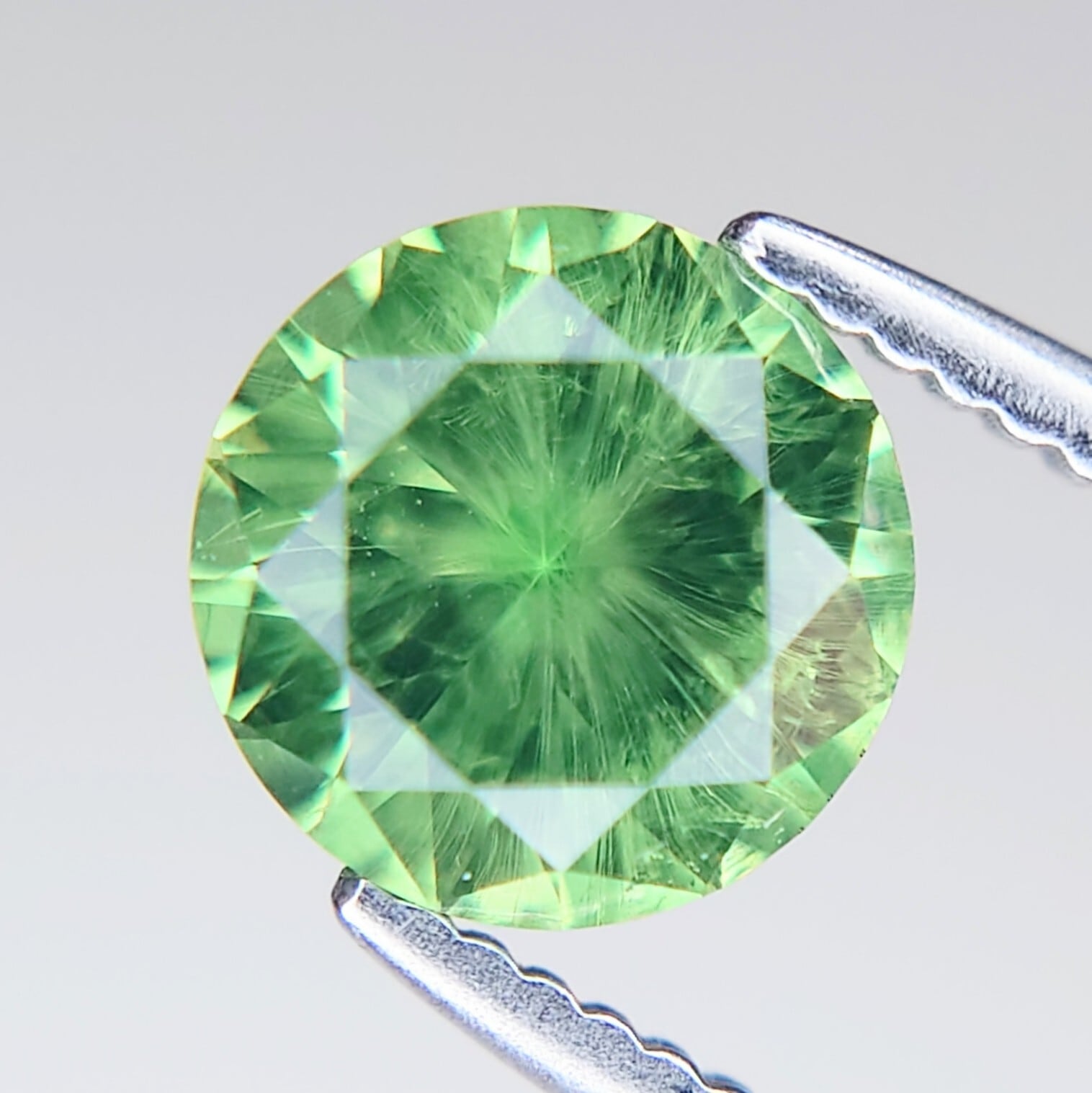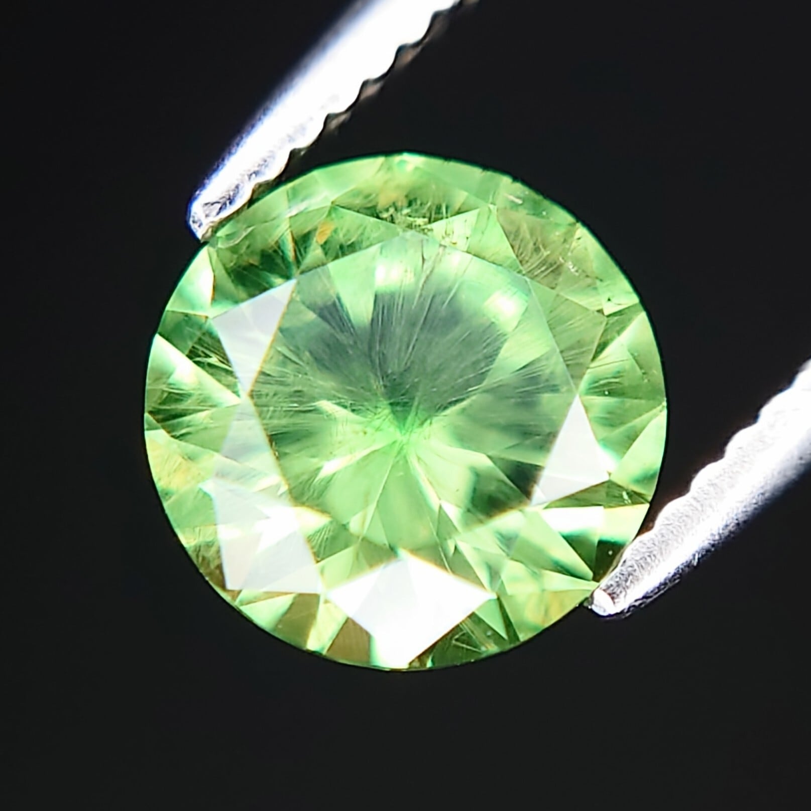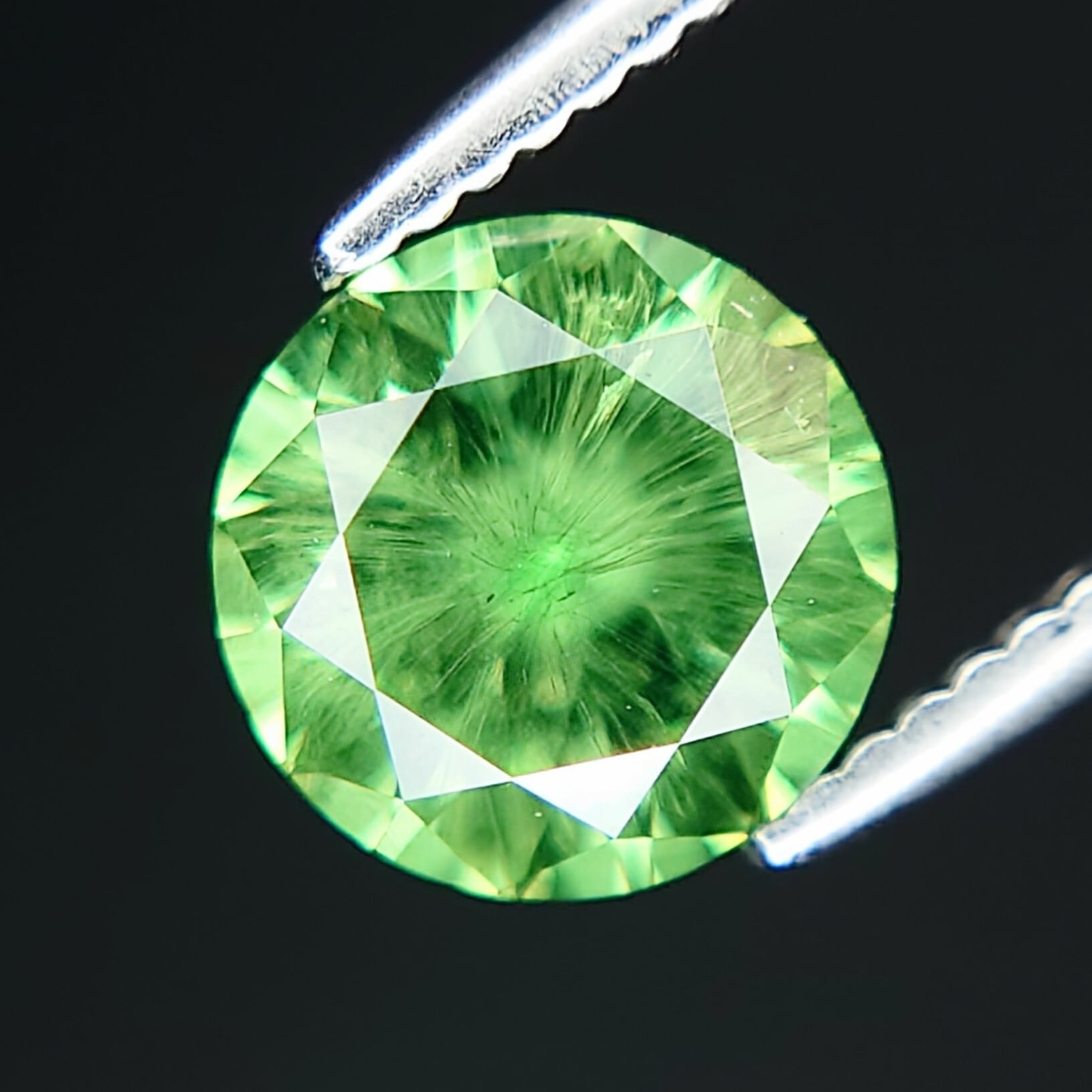 鮮やかなイエローイッシュグリーンのボディカラーに、内側から放射状に広がる特徴的なホーステールインクルージョン。