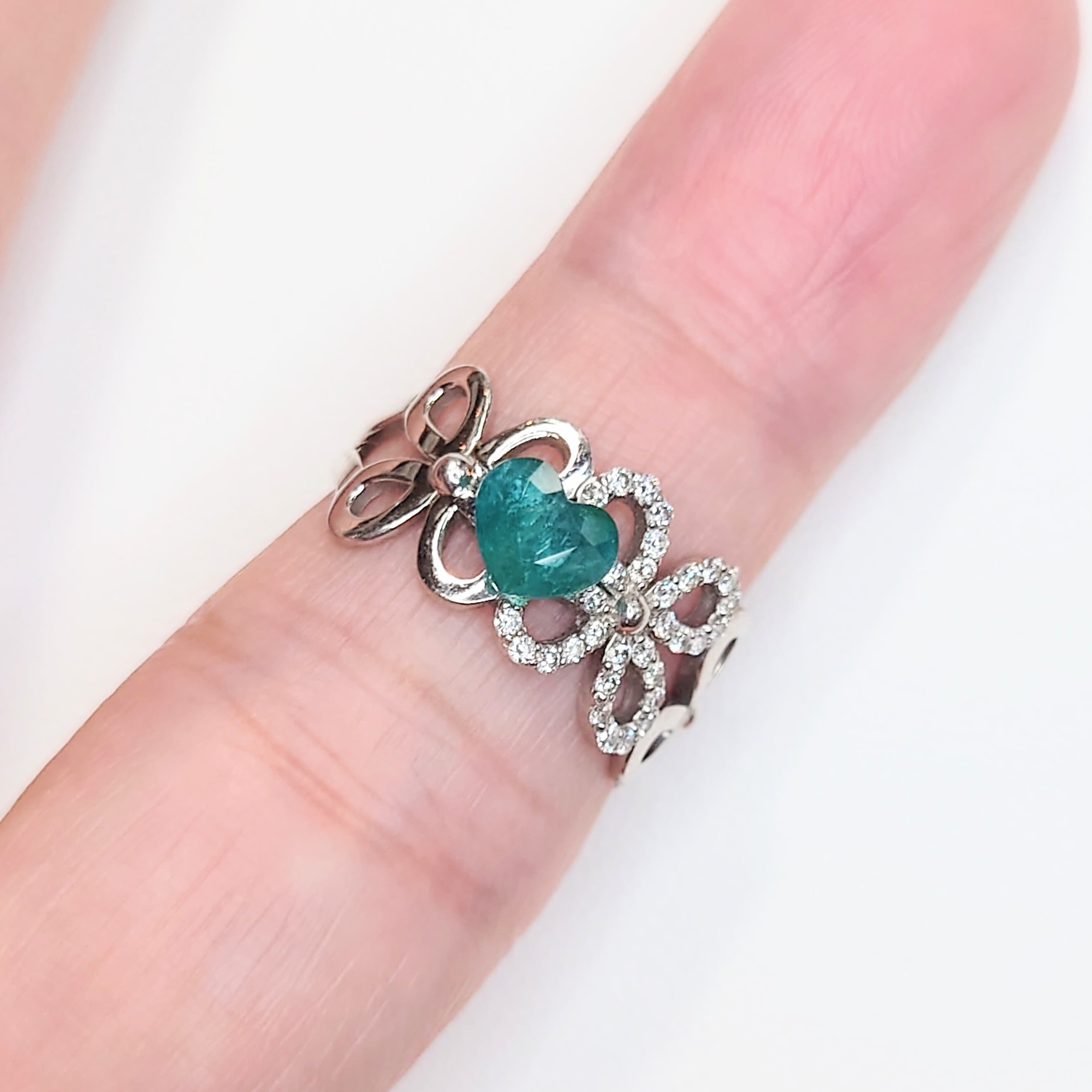 本石はパライバ特有の瑞々しいブルーグリーンカラーを備え、透明感の中に広がるインクルージョンが天然石ならではの表情を演出しています。