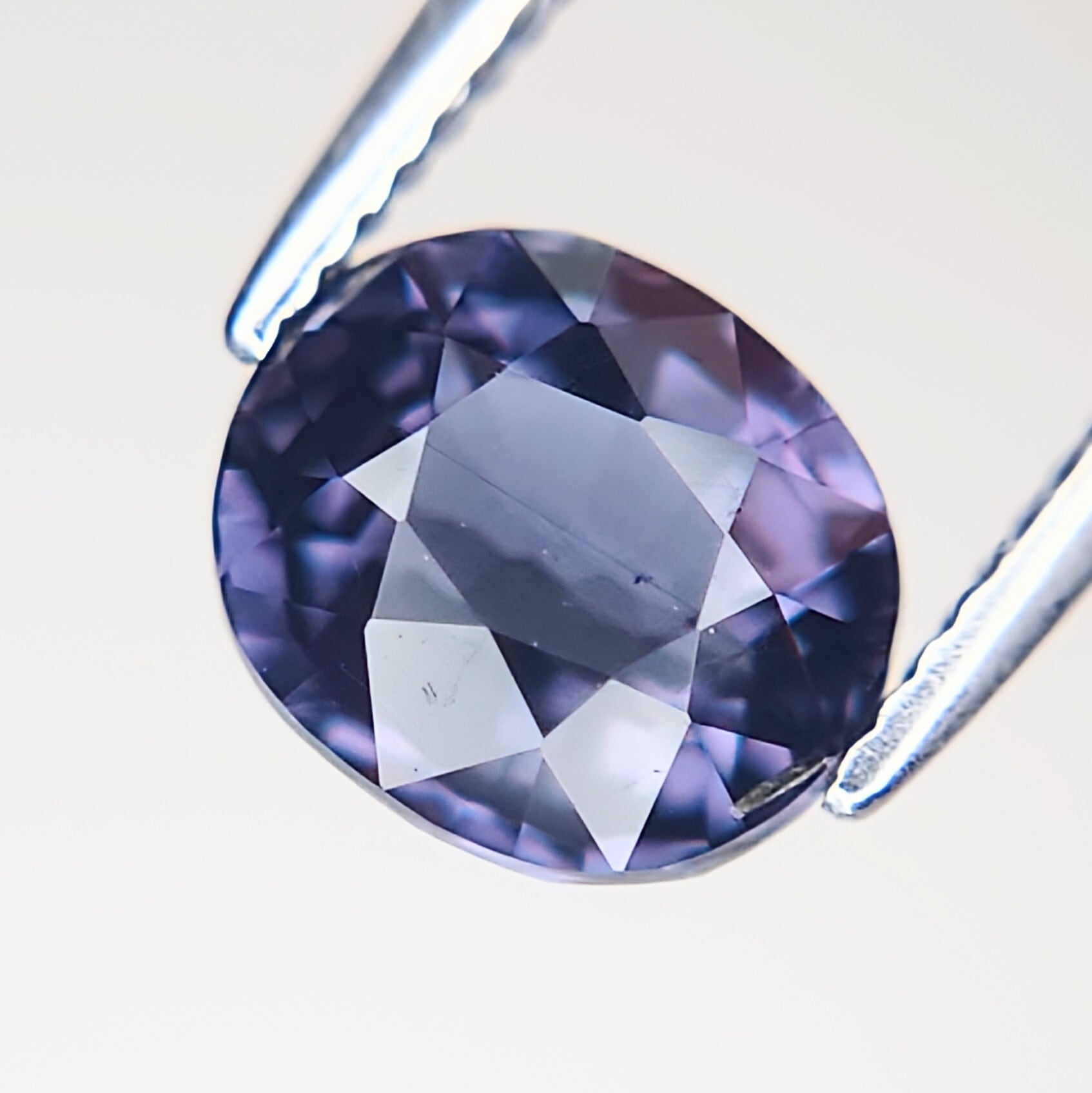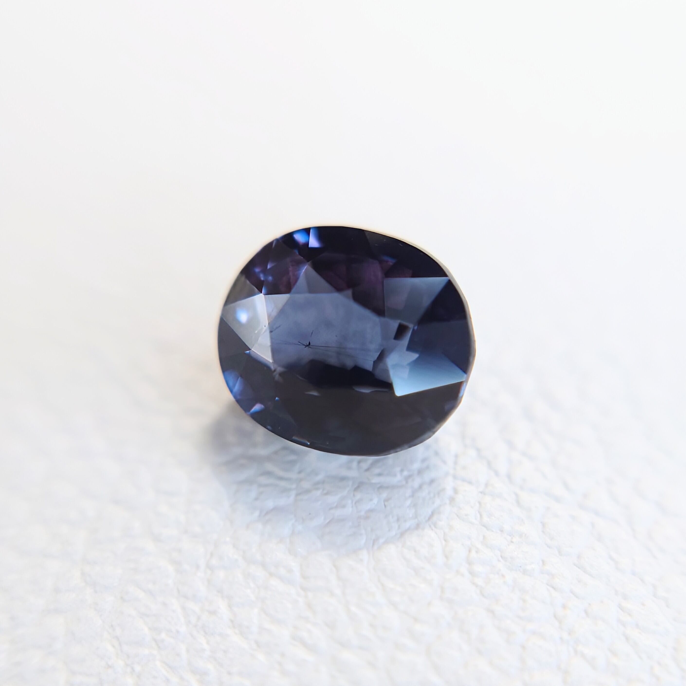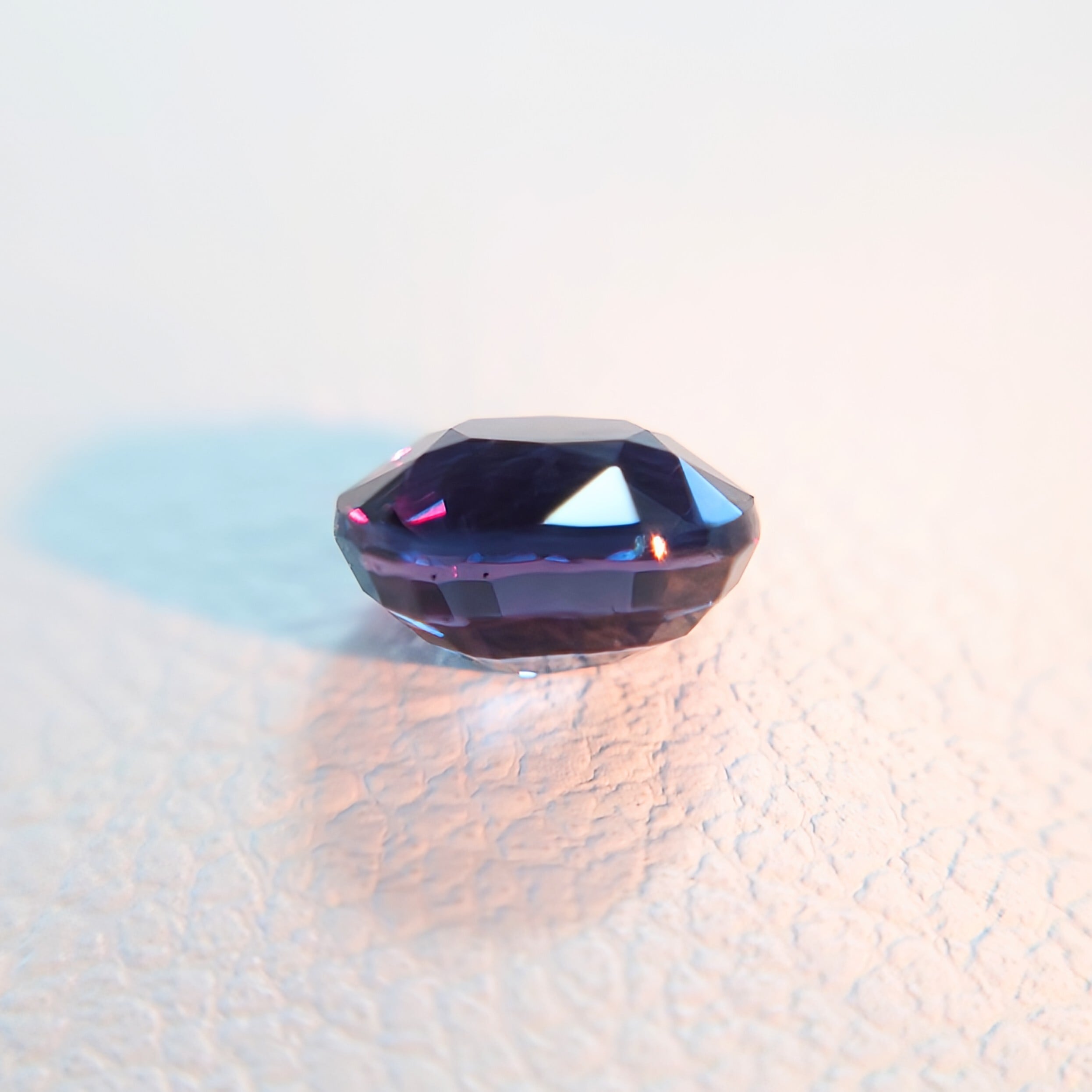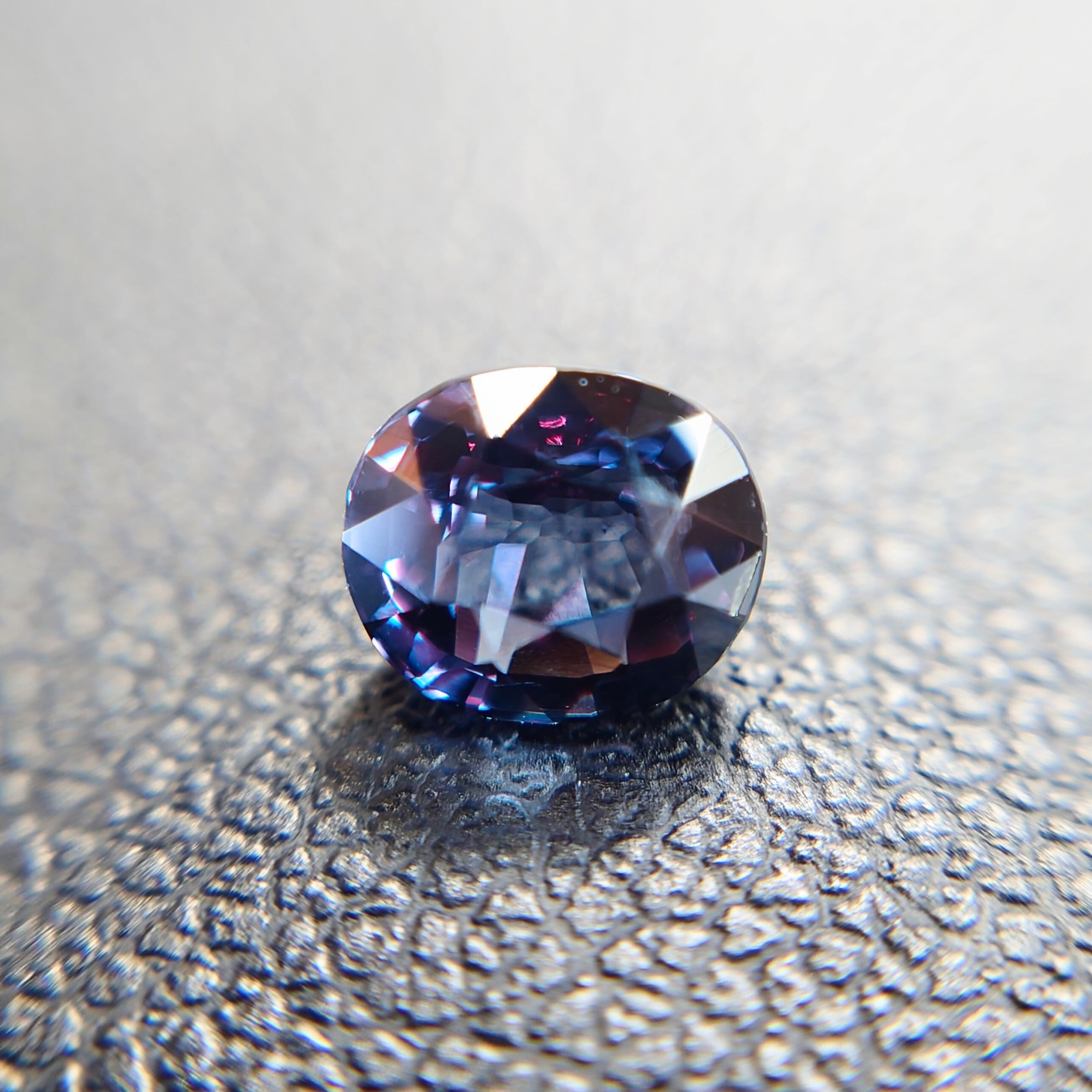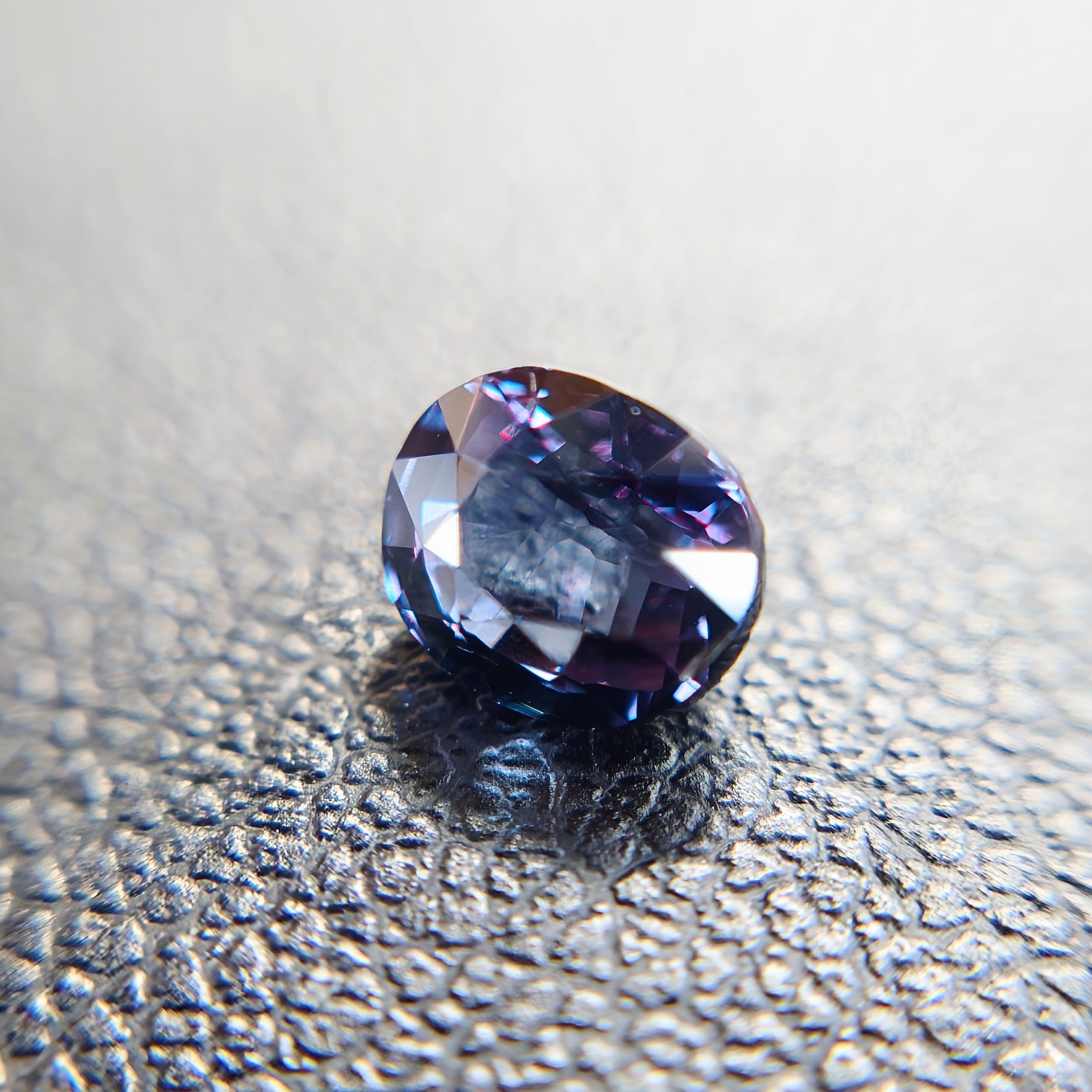 自然光下では深みのあるブルー〜ブルーバイオレットを呈し、白熱灯や暖色光のもとでは鮮やかなレディッシュパープルへと劇的に変化する、神秘的な色彩を備えた一石です。