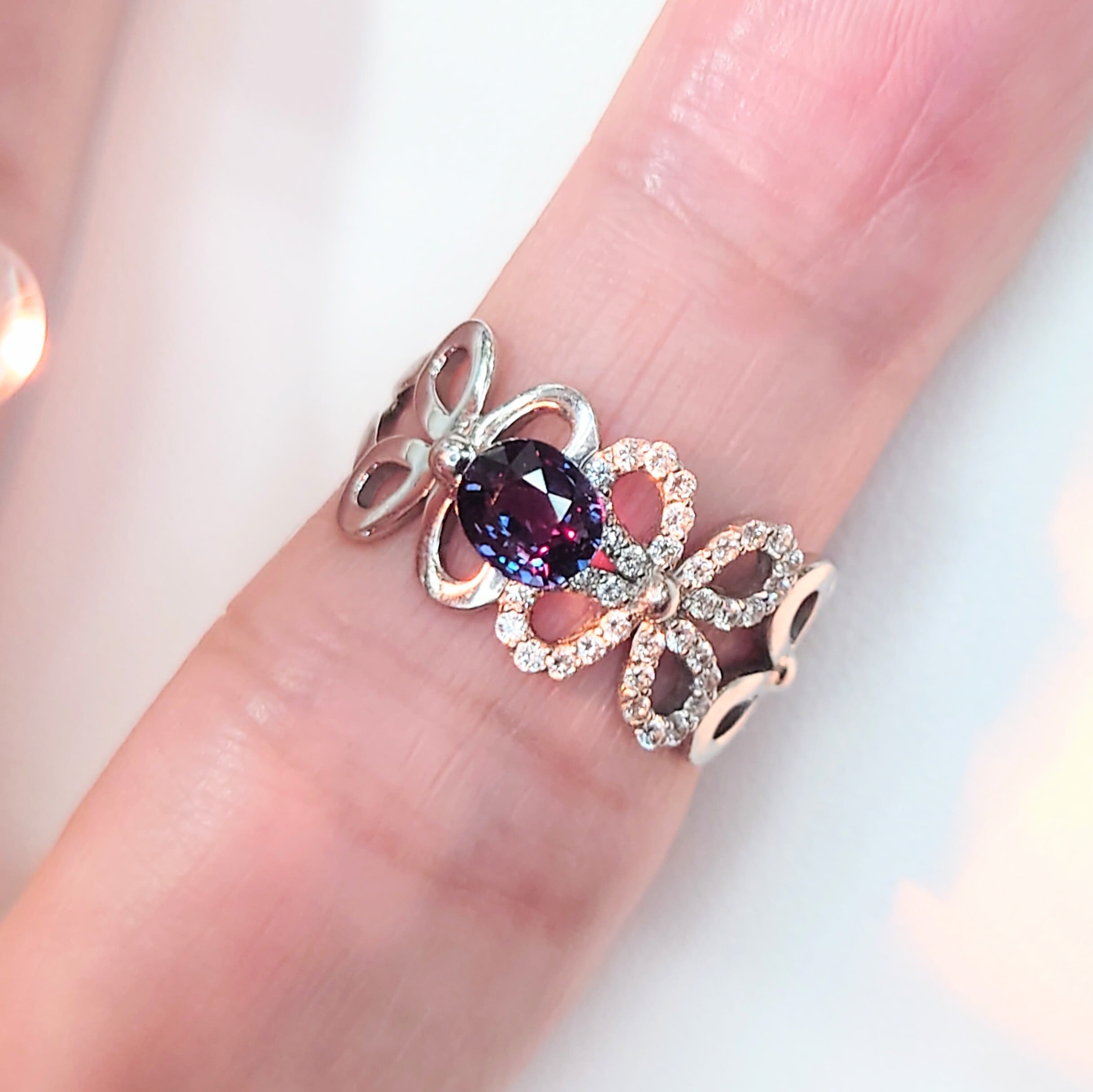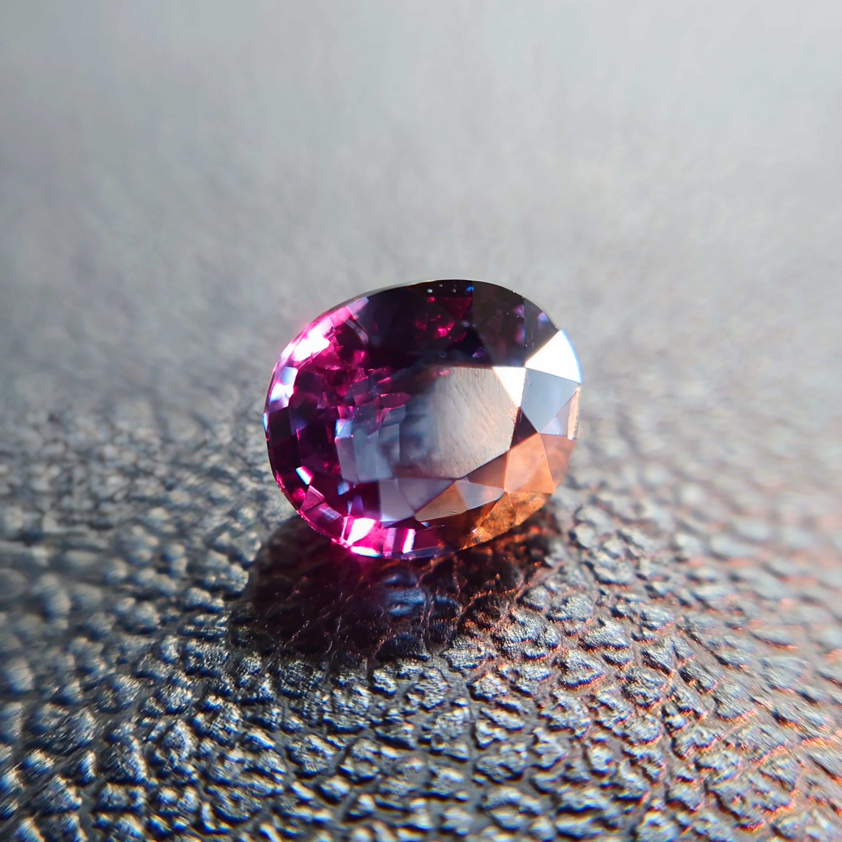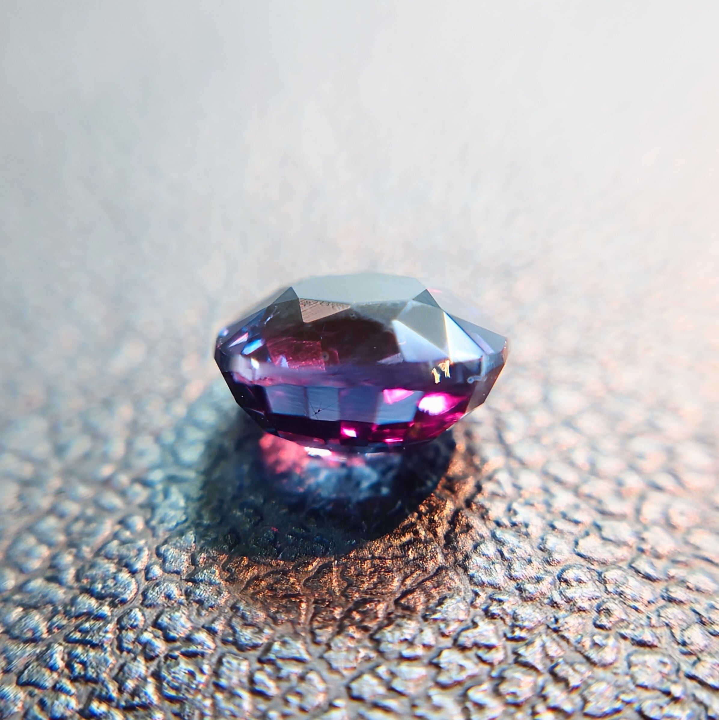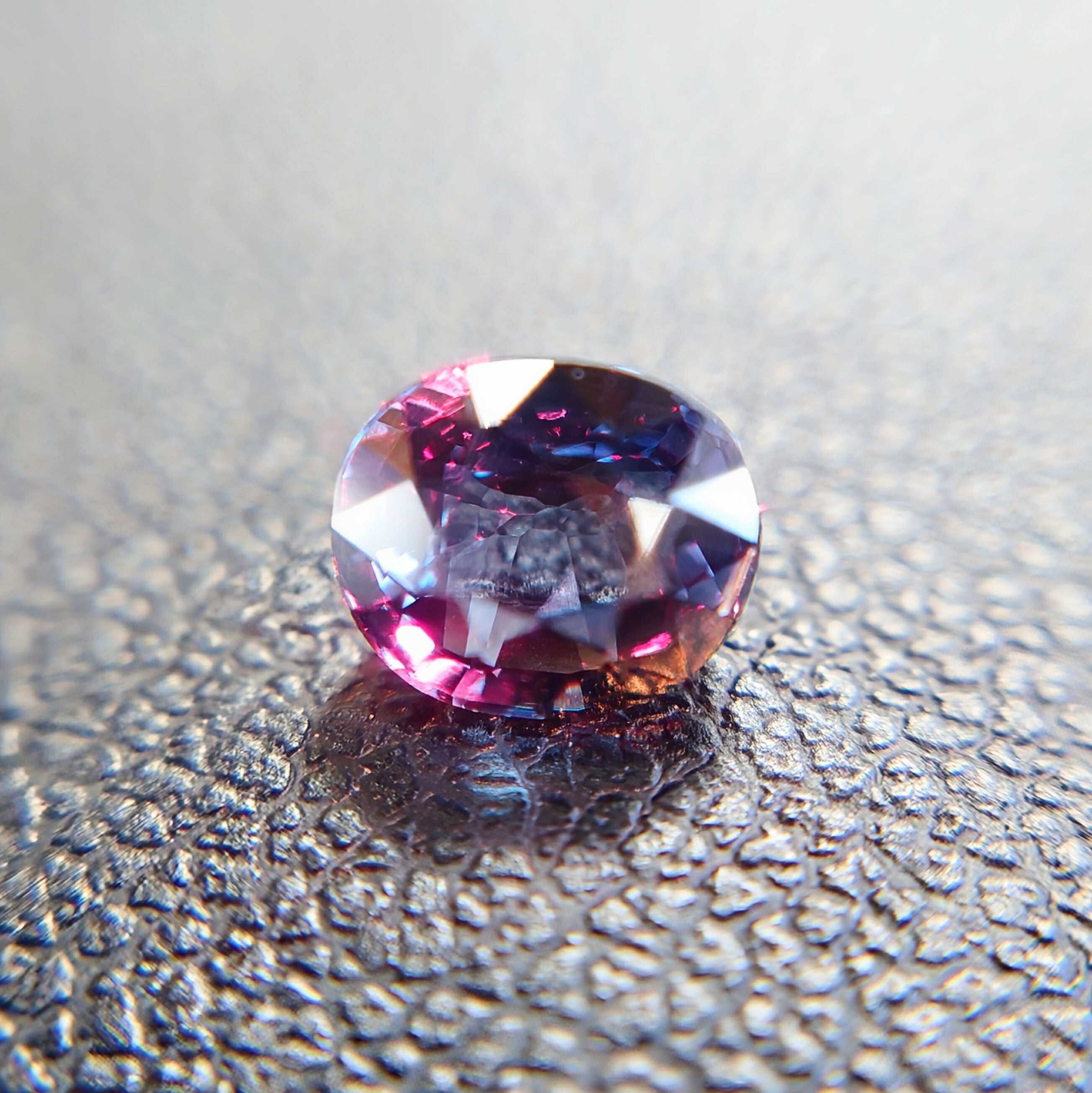 同一の宝石とは思えないほどの明確な色変化は、ガーネットの中でも限られた個体にのみ見られる特性です。