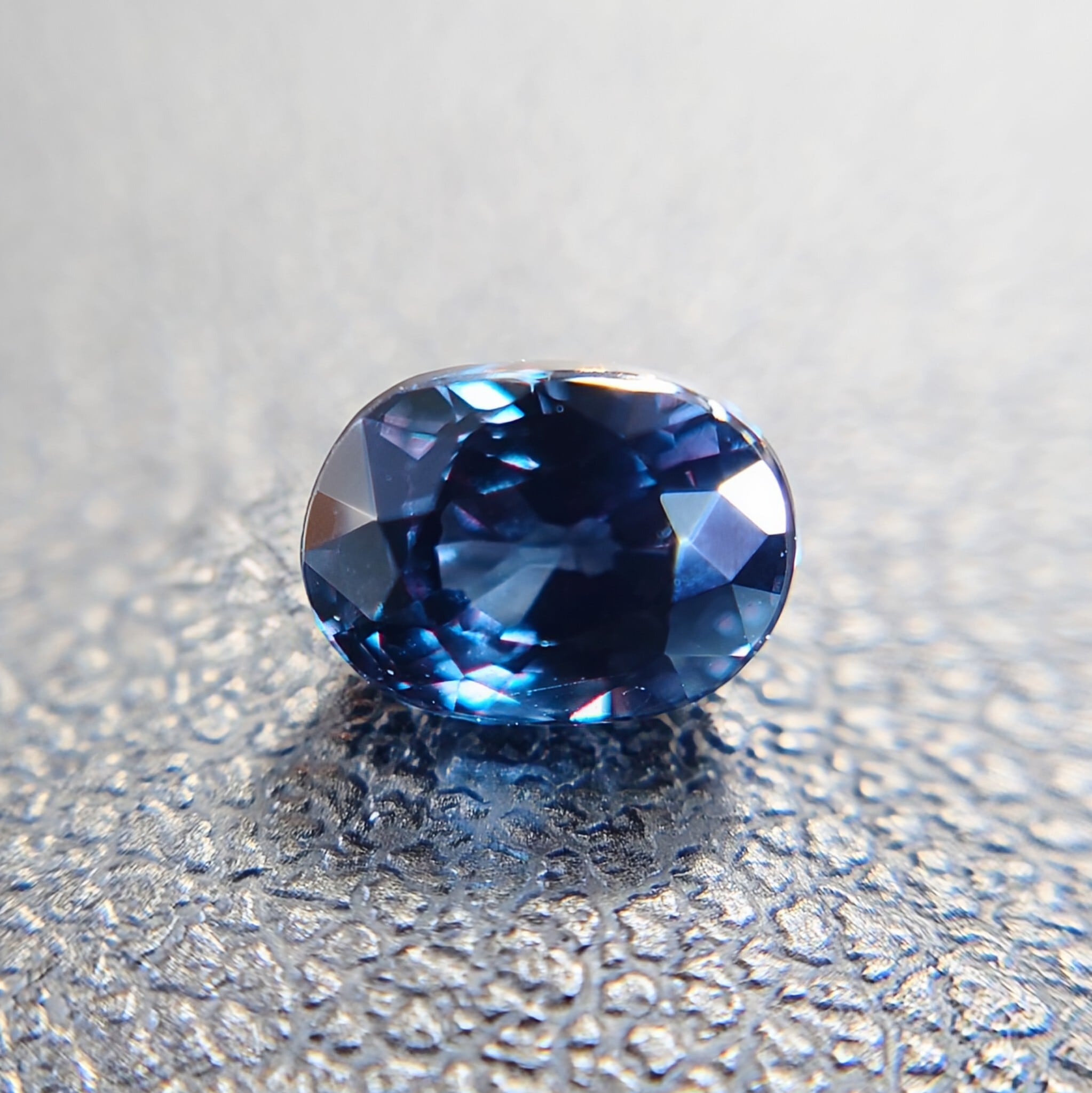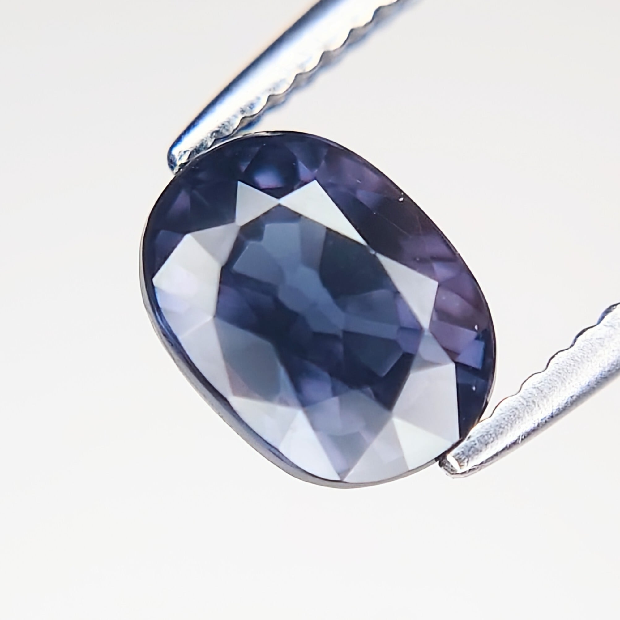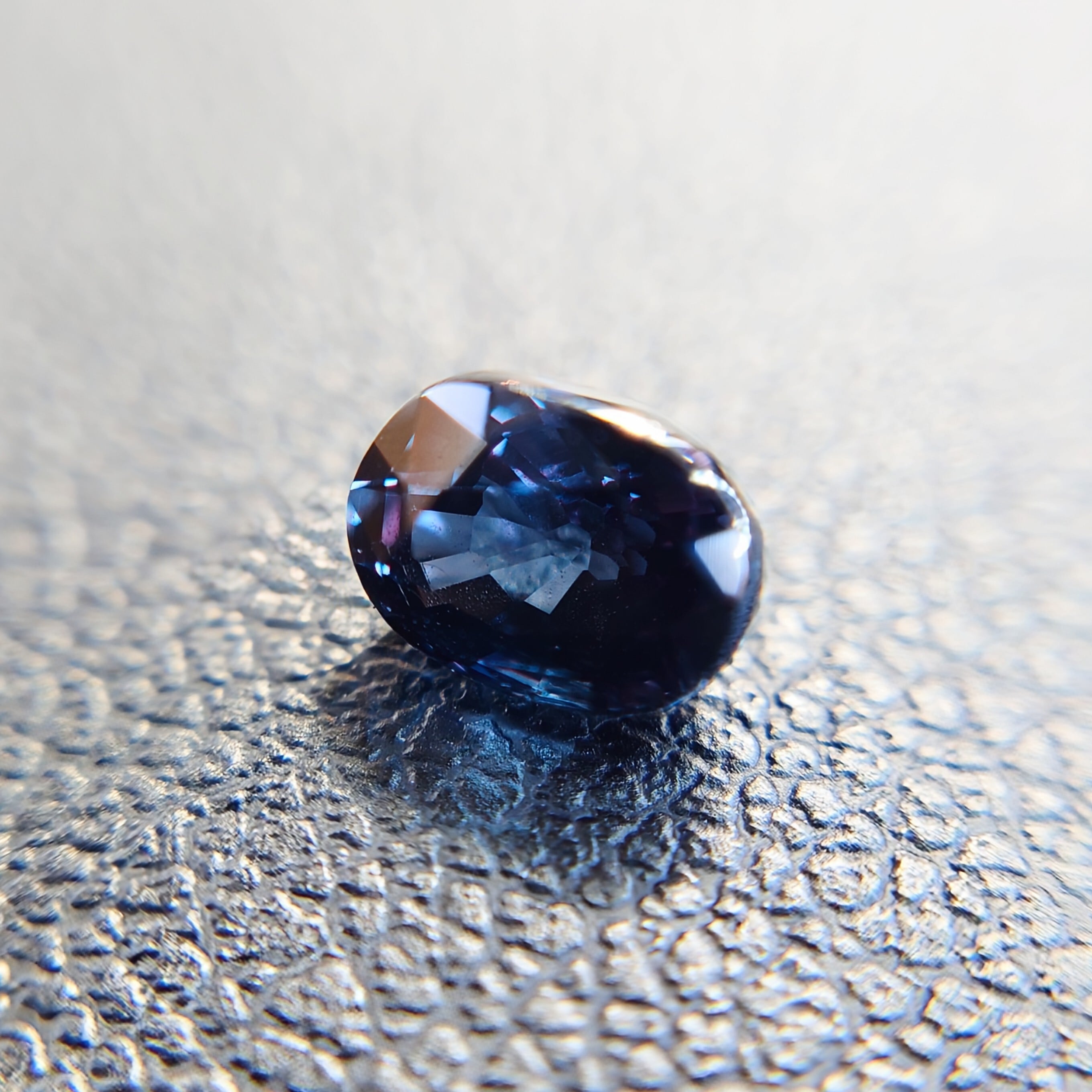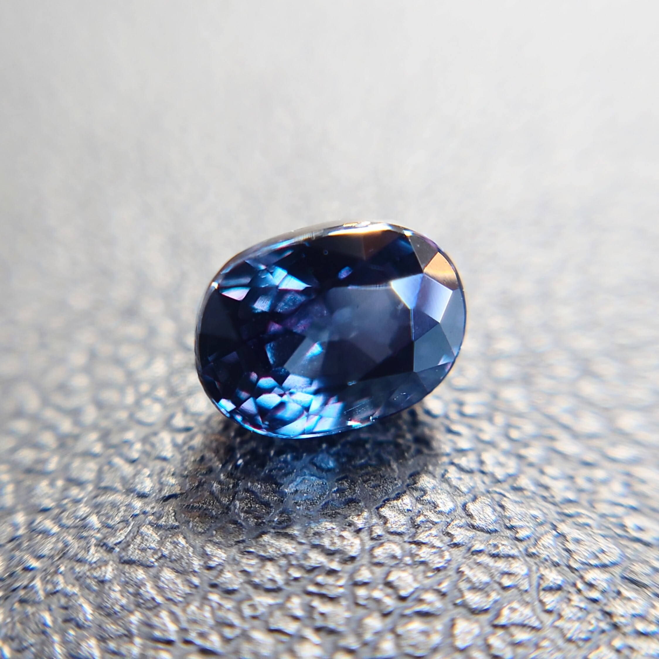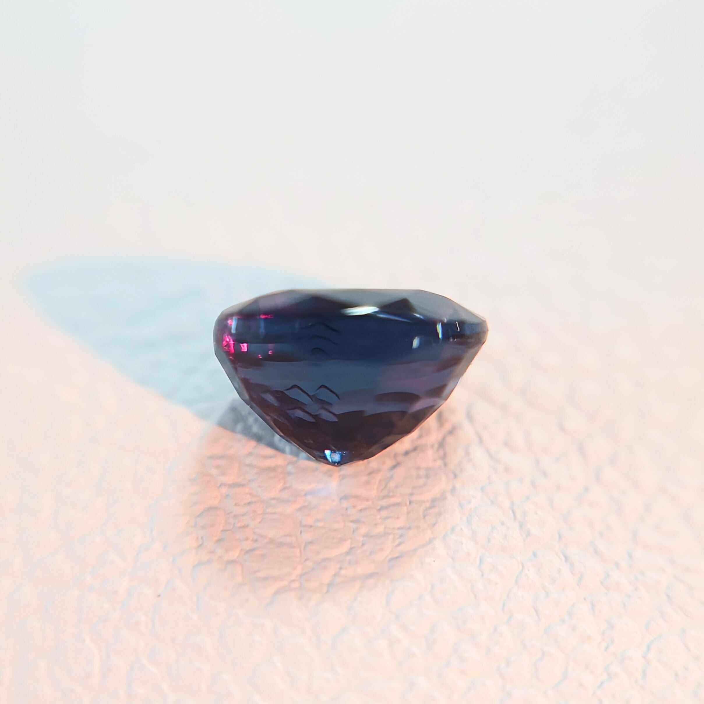 自然光下では深みのあるブルー〜ブルーバイオレットを呈し、白熱灯や暖色光のもとでは鮮やかなレディッシュパープルへと劇的に変化する、神秘的な色彩を備えた一石です。