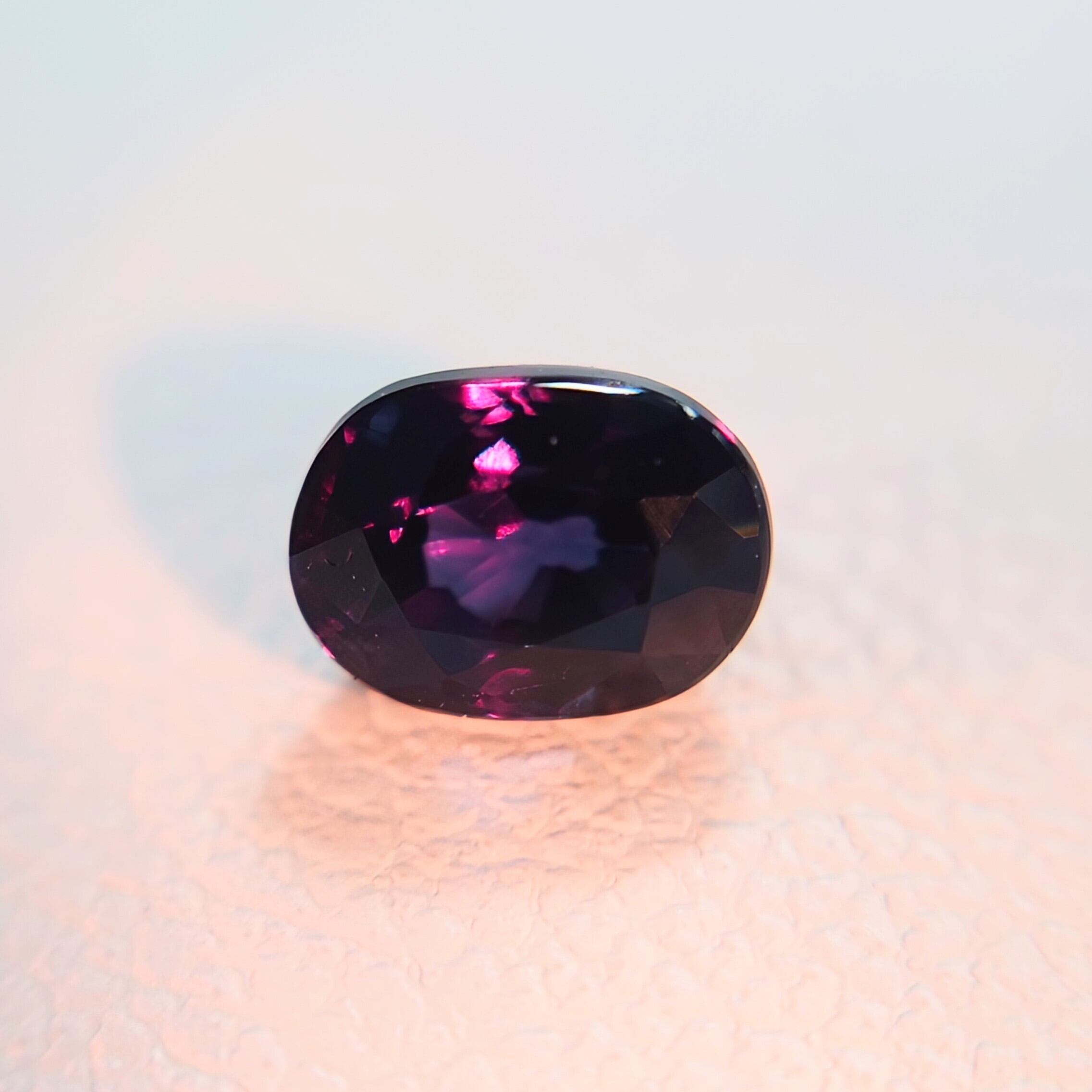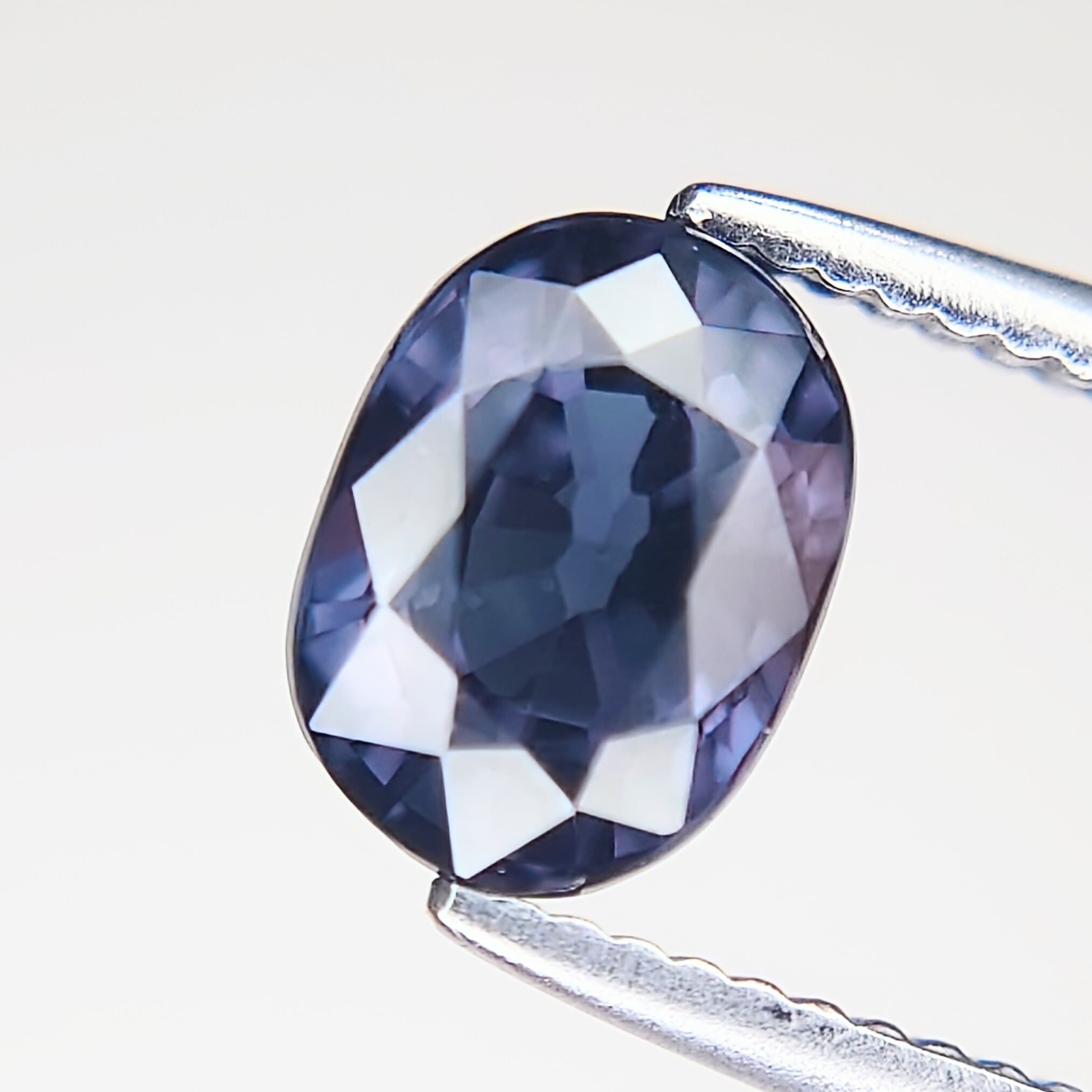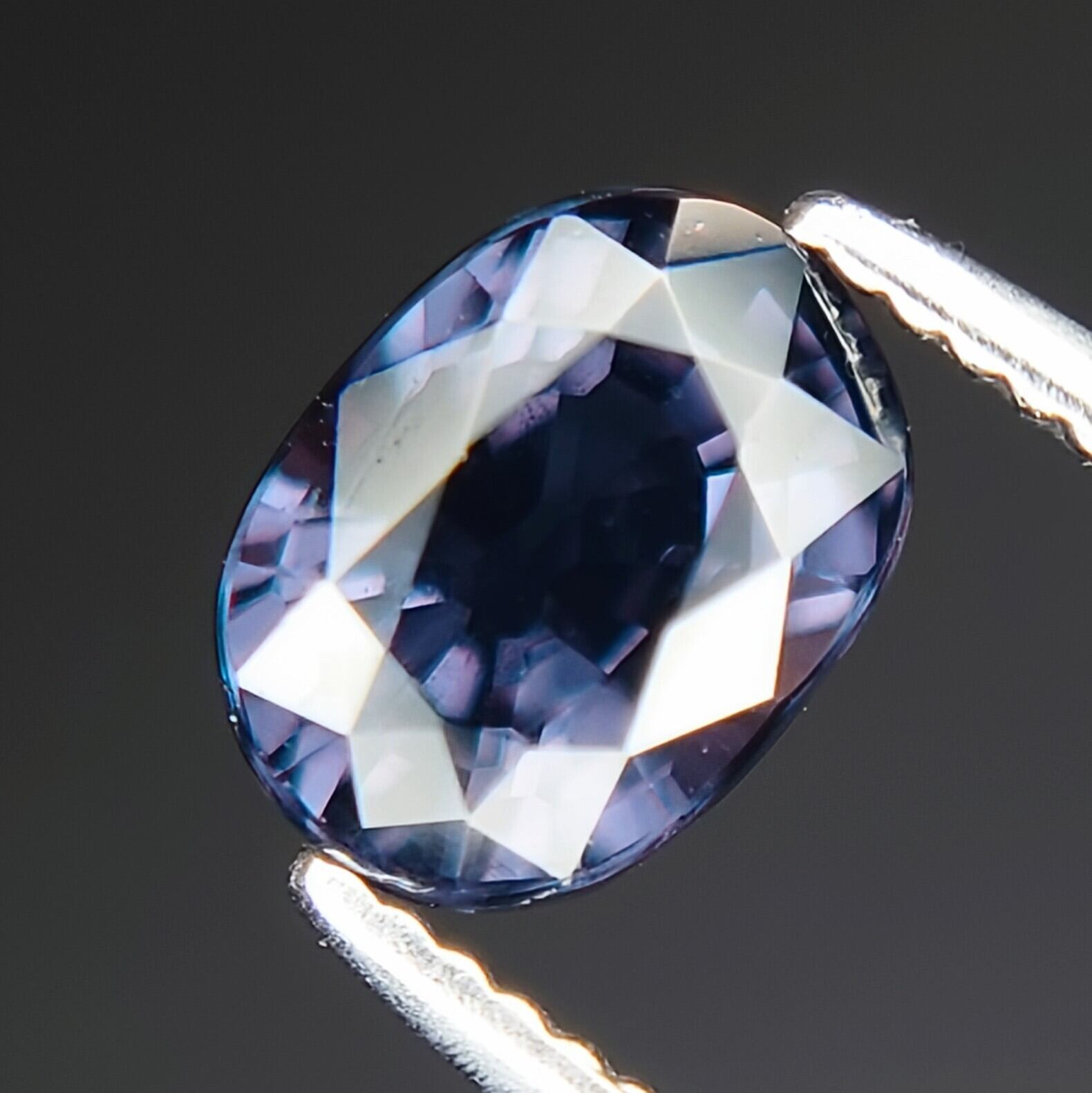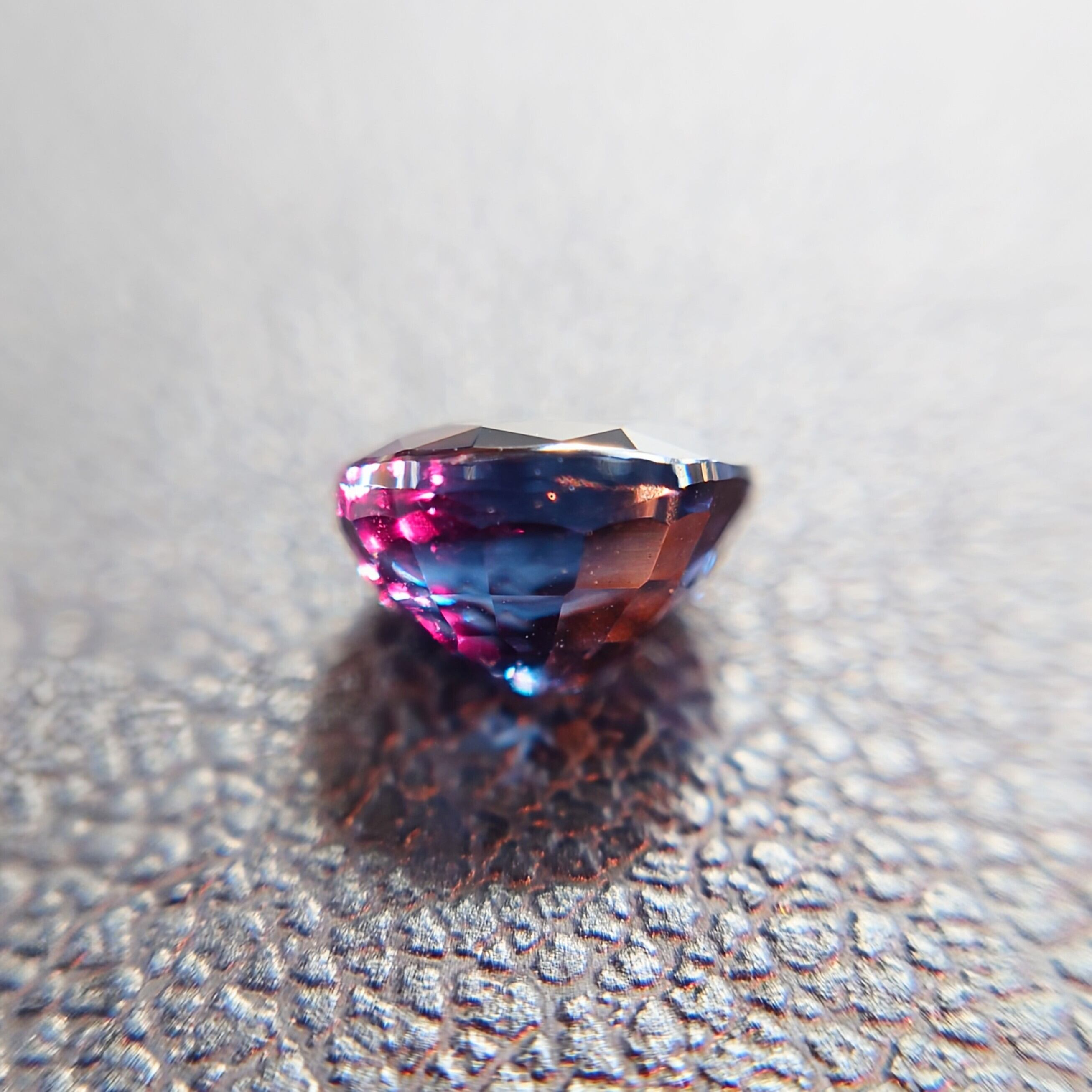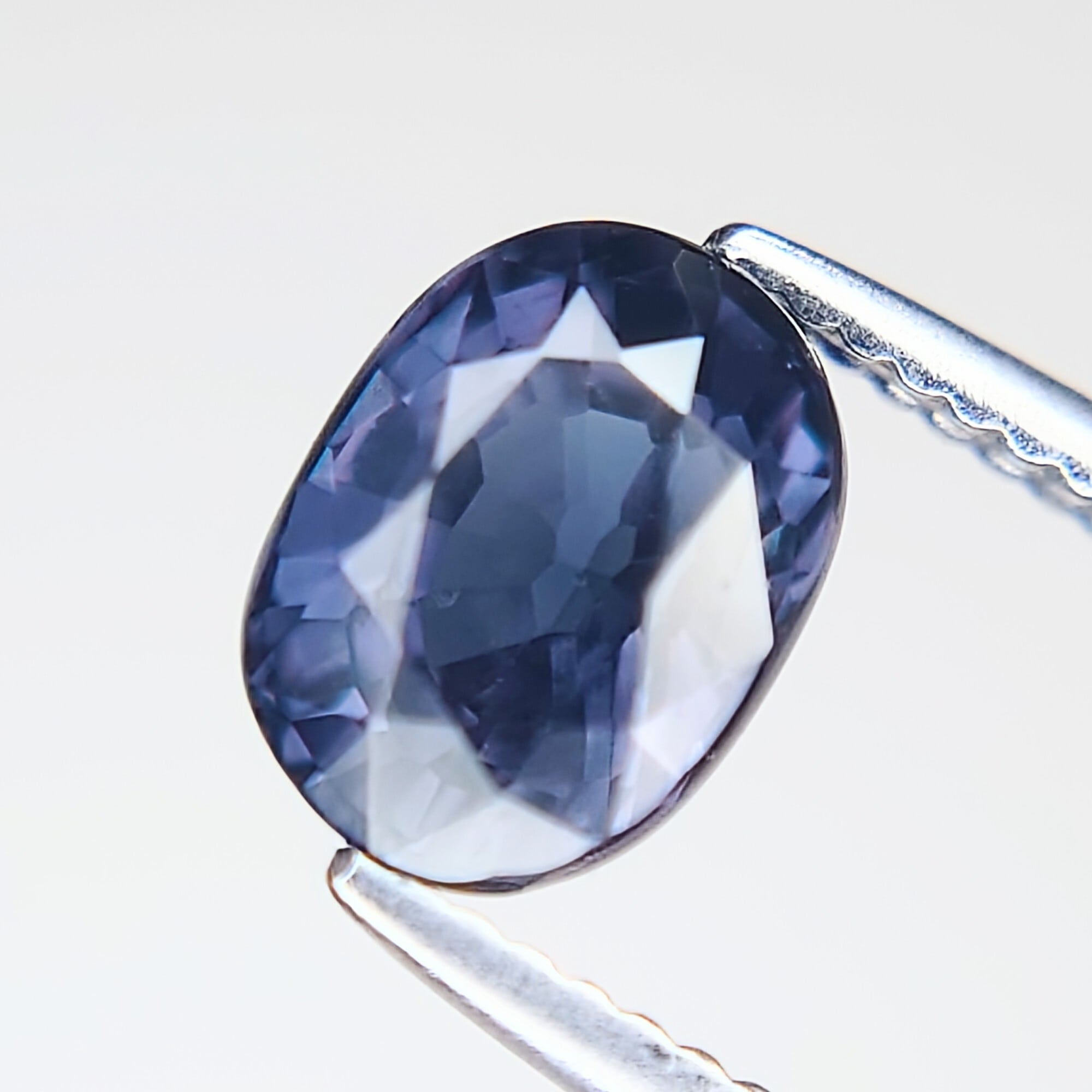 自然光下では深みのあるブルー〜ブルーバイオレットを呈し、白熱灯や暖色光のもとでは鮮やかなレディッシュパープルへと劇的に変化する、神秘的な色彩を備えた一石です。