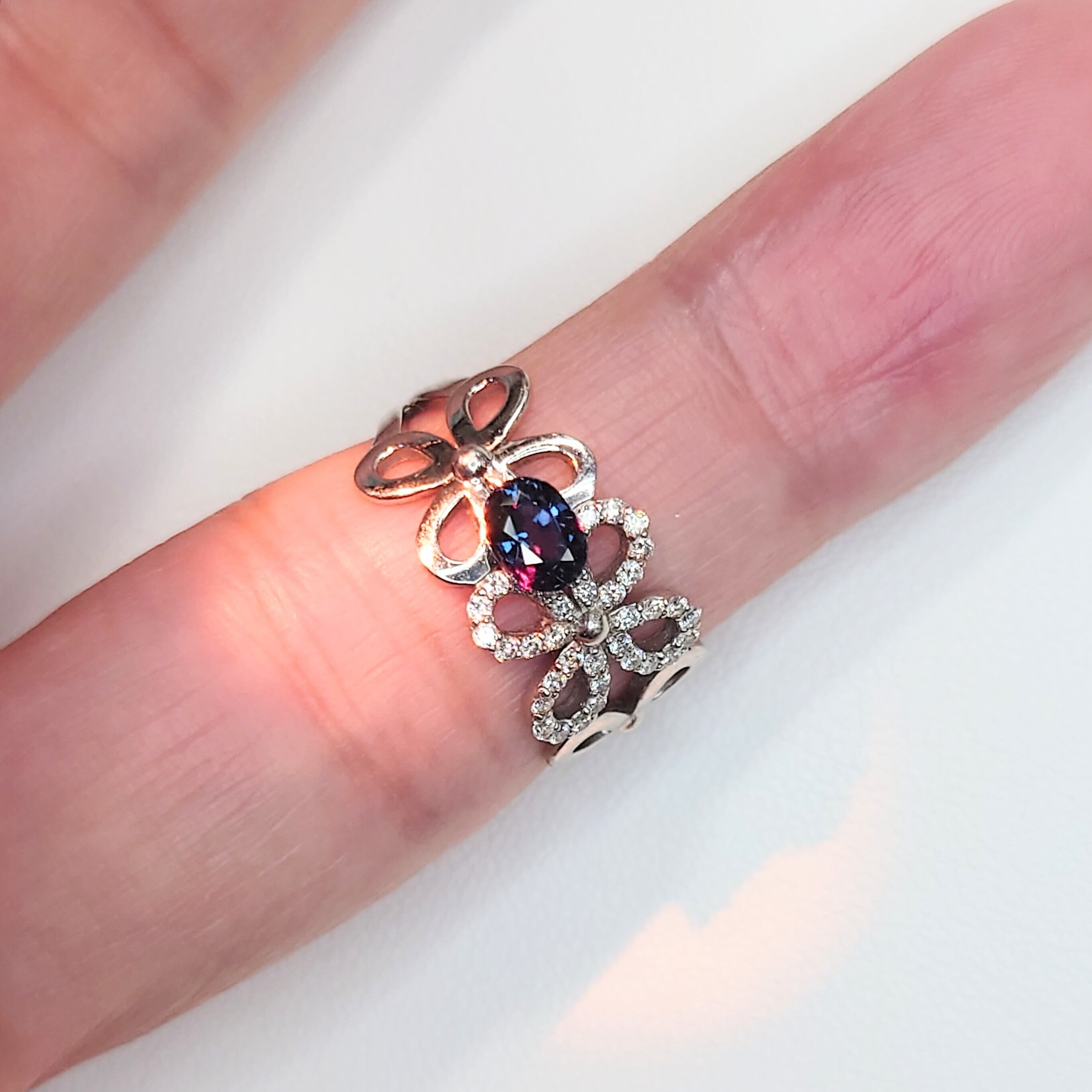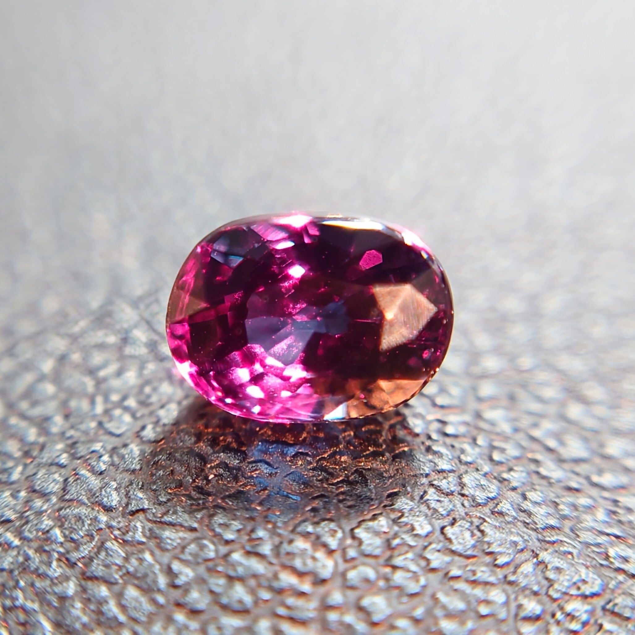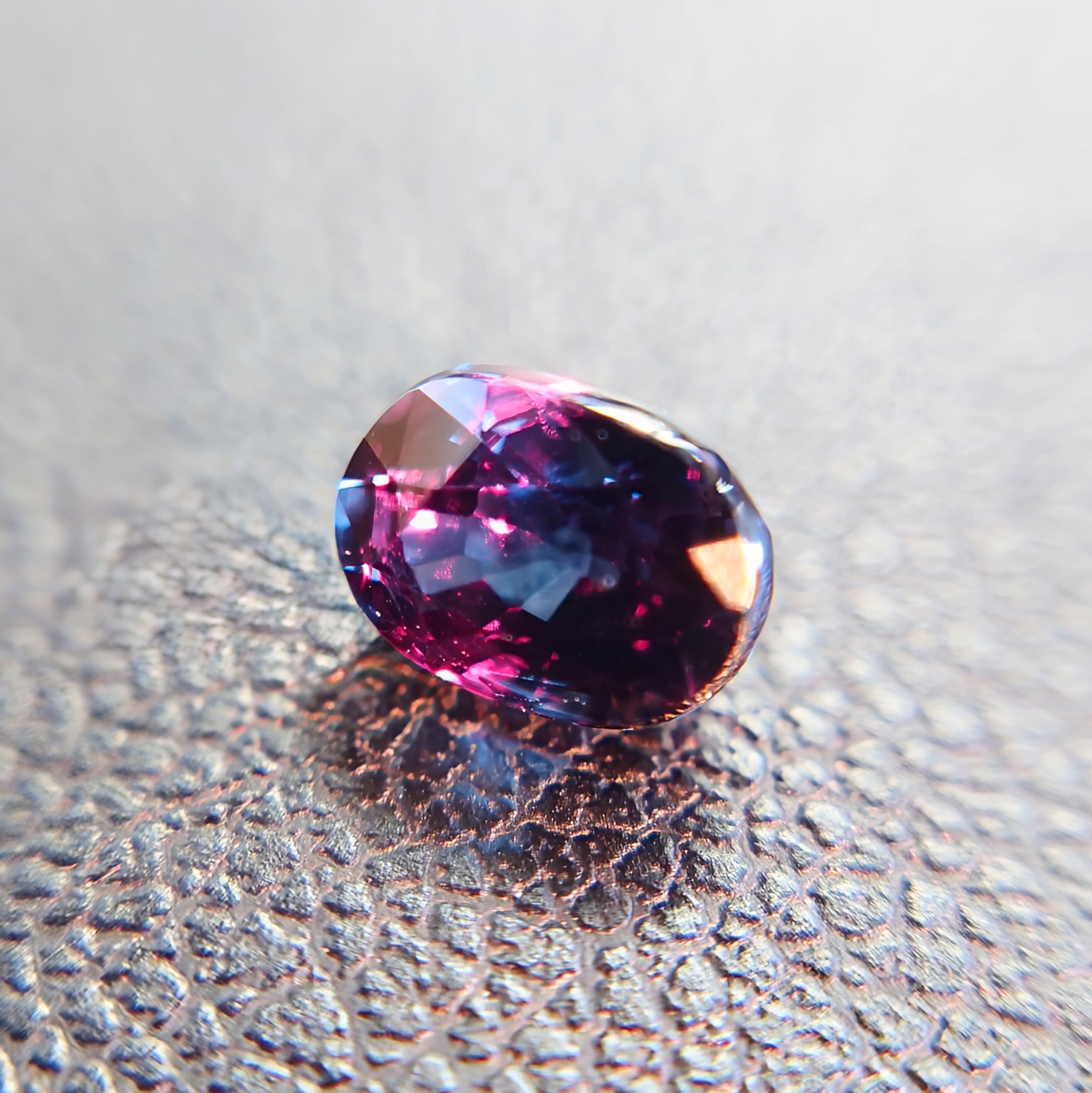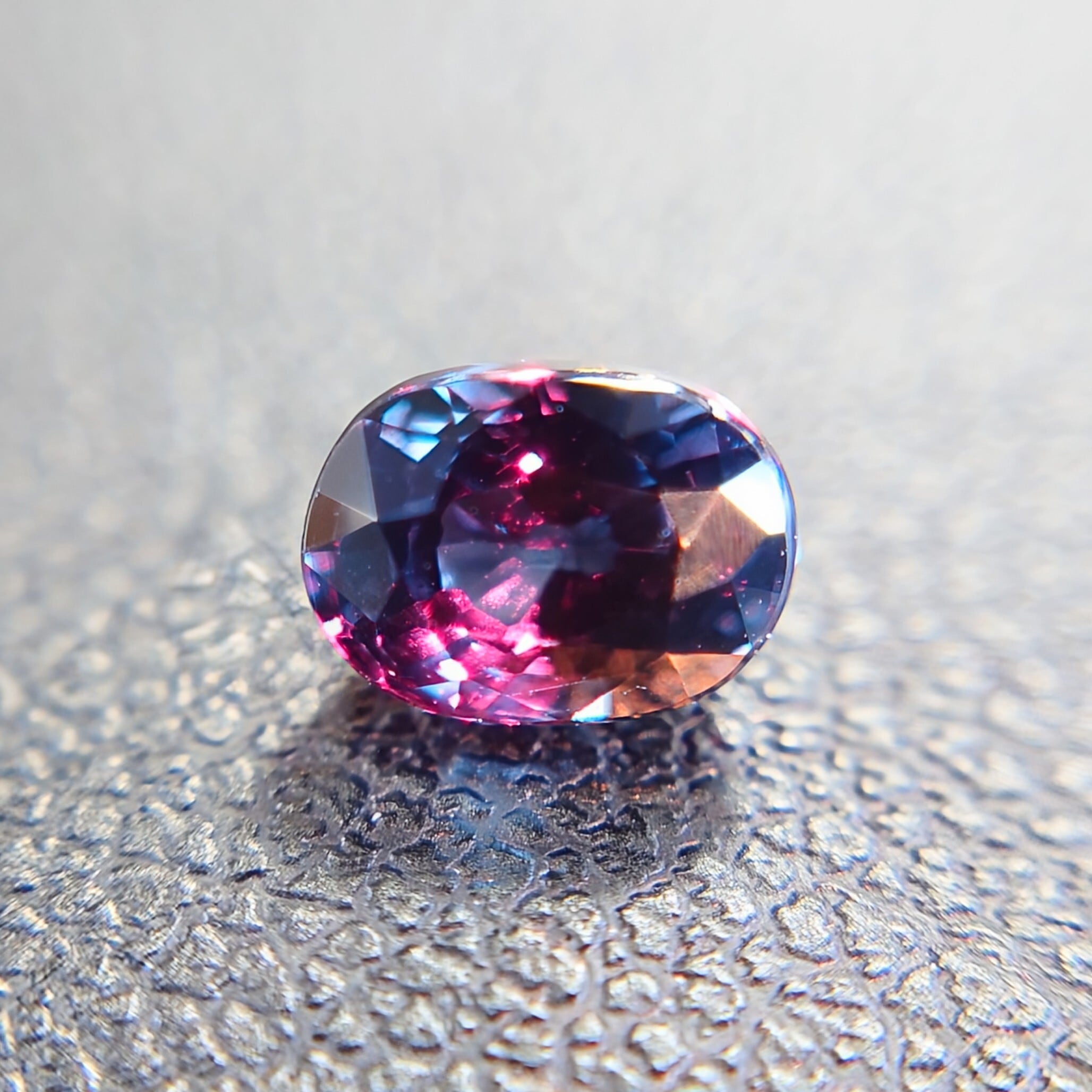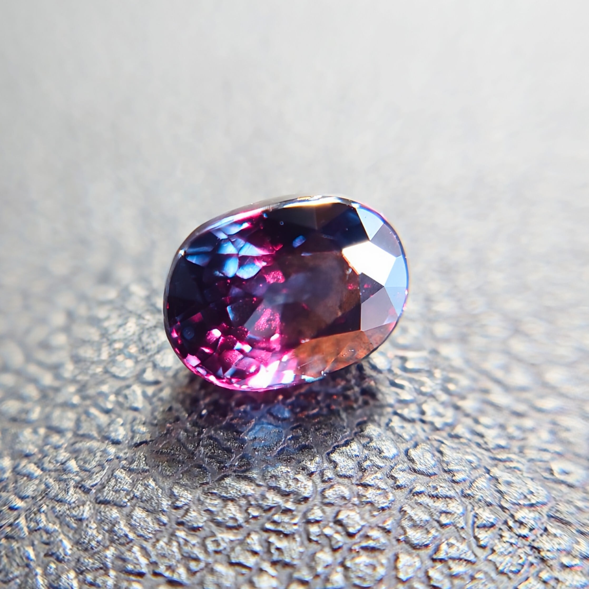 同一の宝石とは思えないほどの明確な色変化は、ガーネットの中でも限られた個体にのみ見られる特性です。
