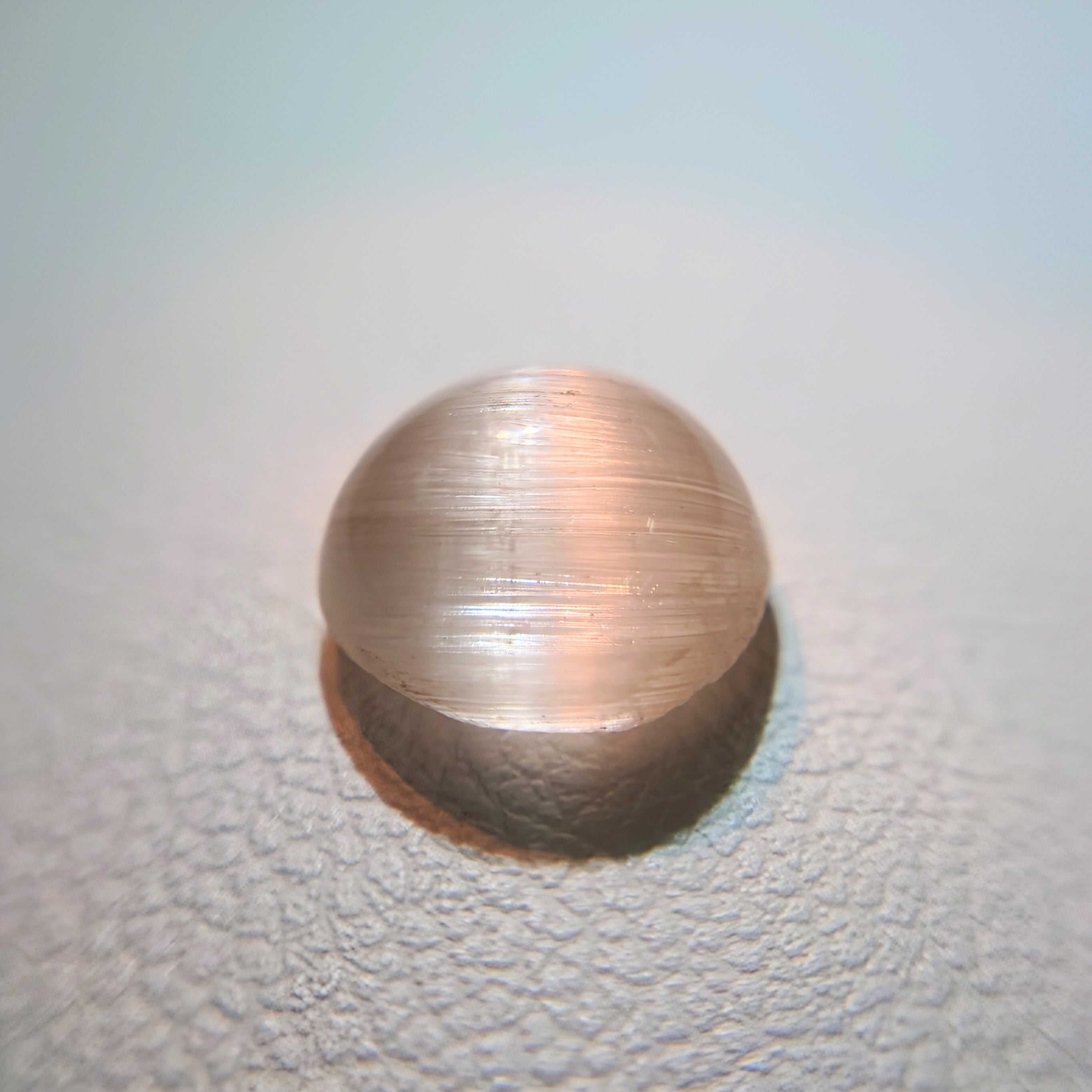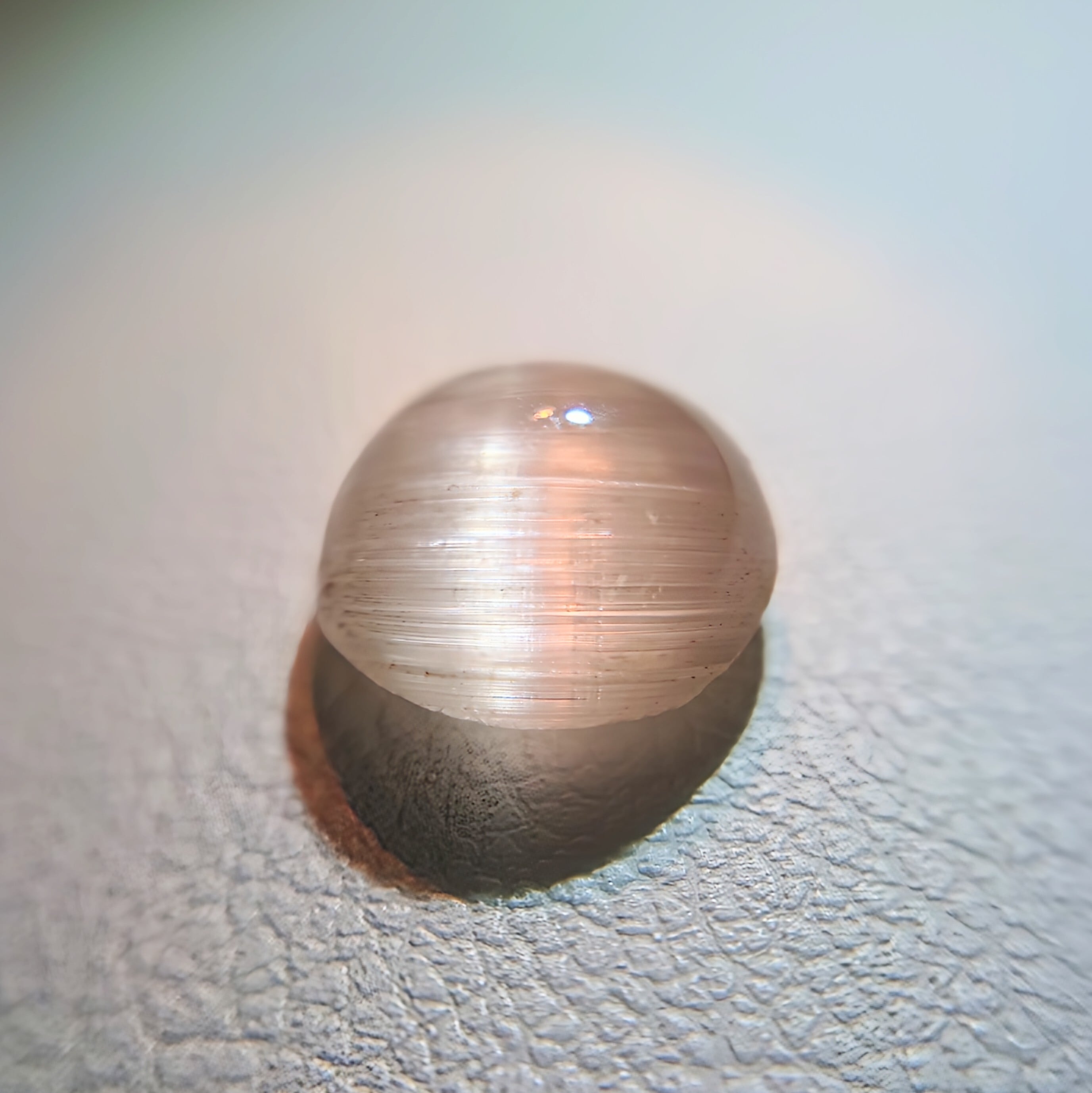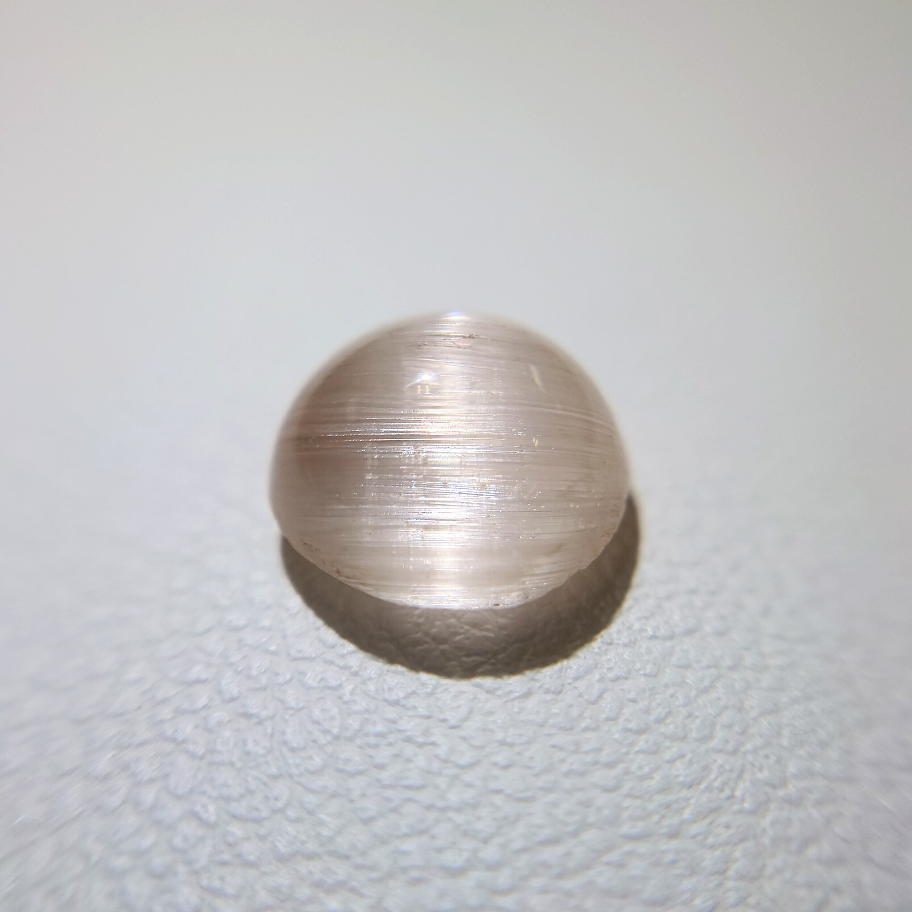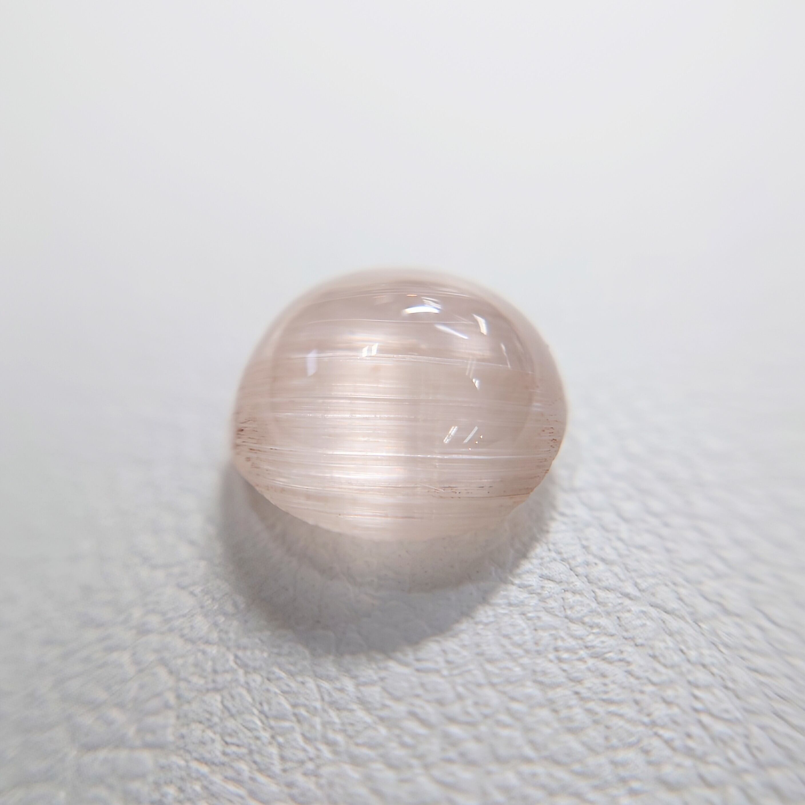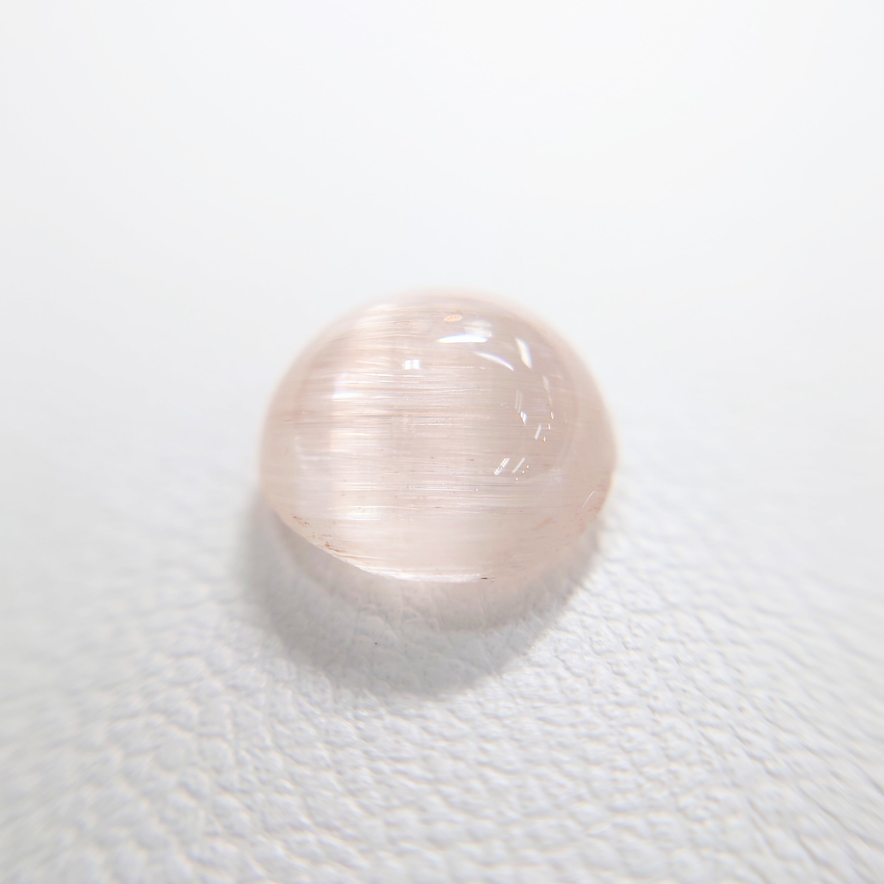 柔らかな桜色を湛えた天然モルガナイトに、一本の光の帯が静かに浮かび上がる希少なキャッツアイストーン。