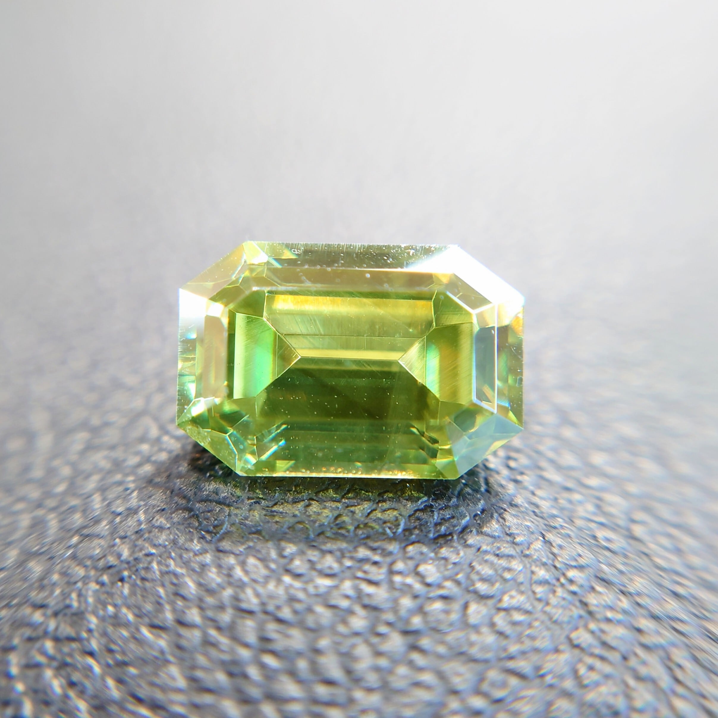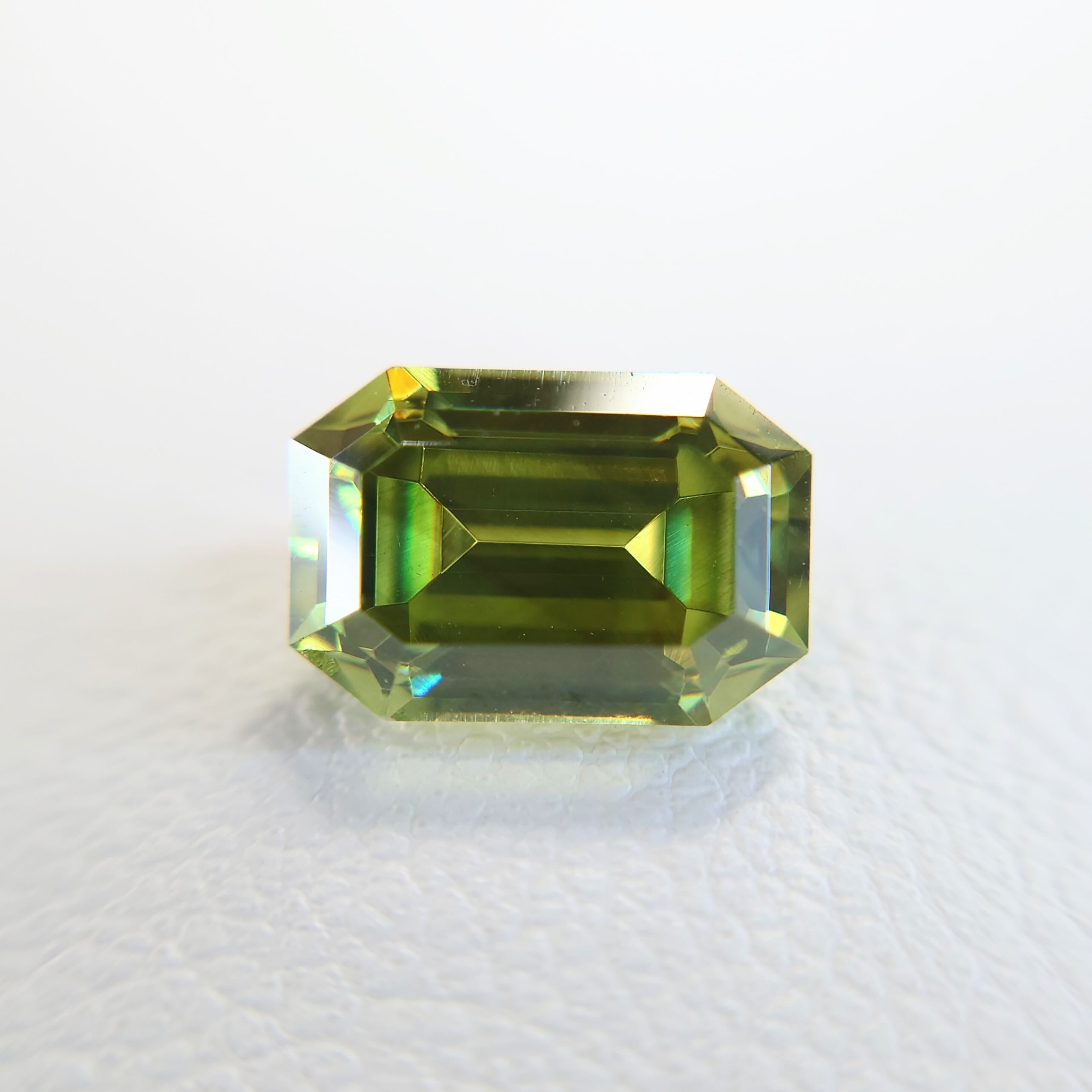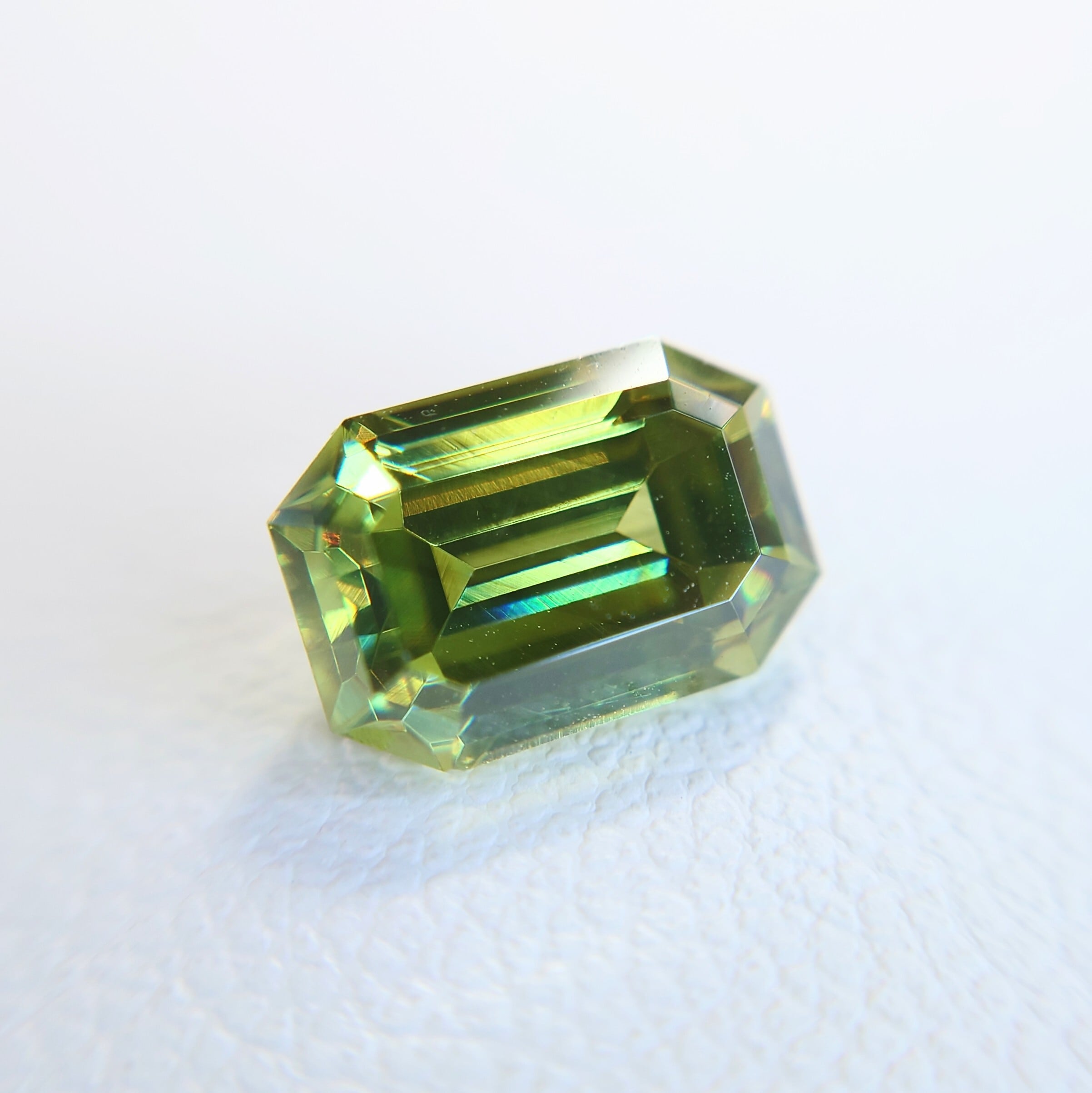 屈折率はダイヤモンドに迫る高さを持ちながら、硬度は3.5〜4と低く、ファセットカット自体が難しい宝石。本石のような整ったカット石は希少価値の高い存在です。