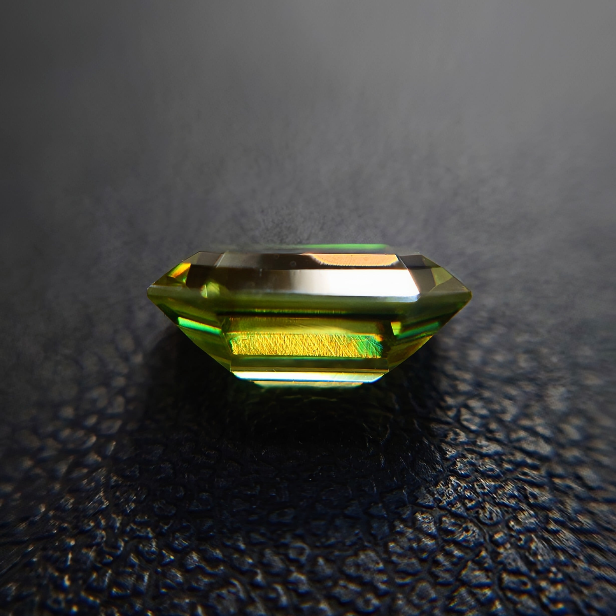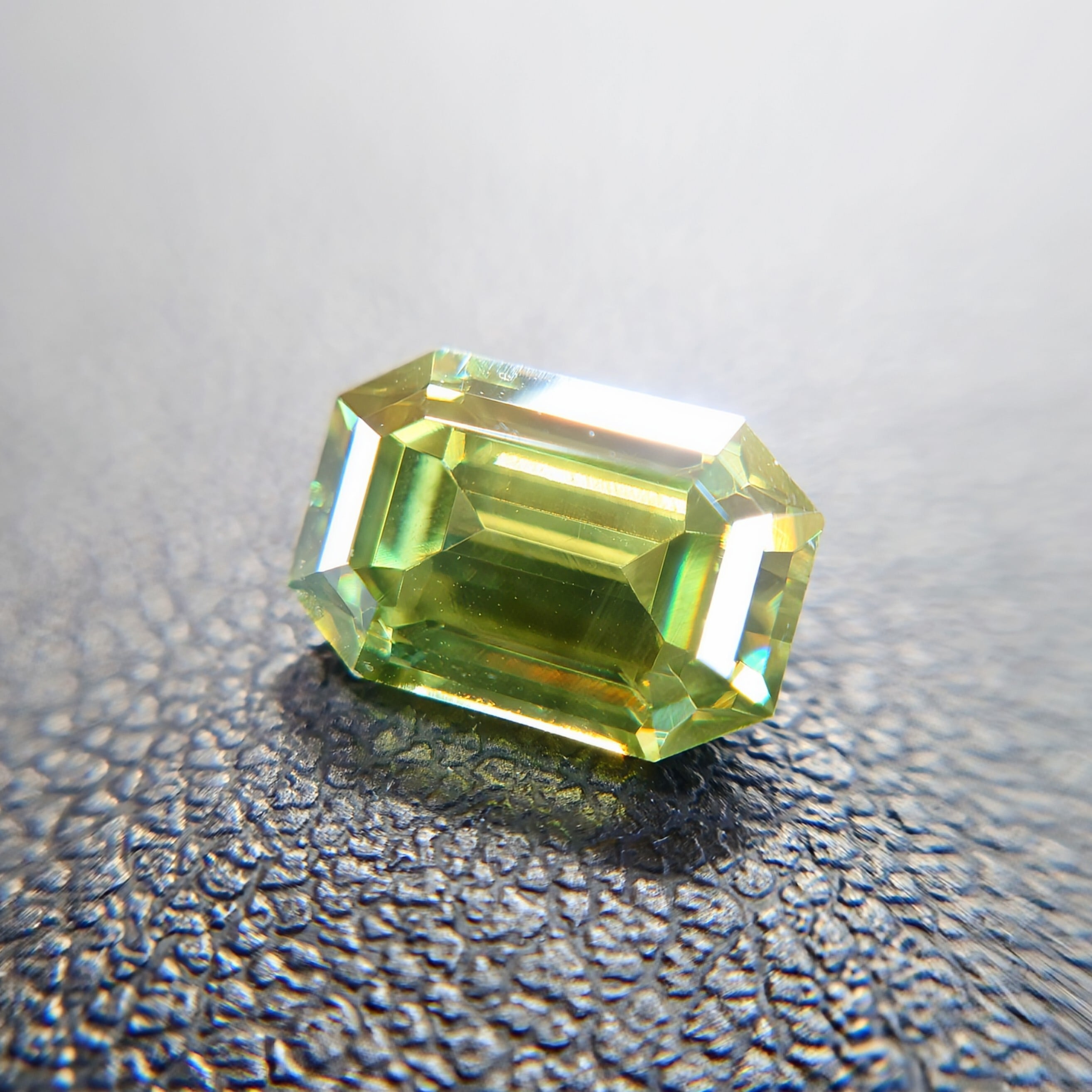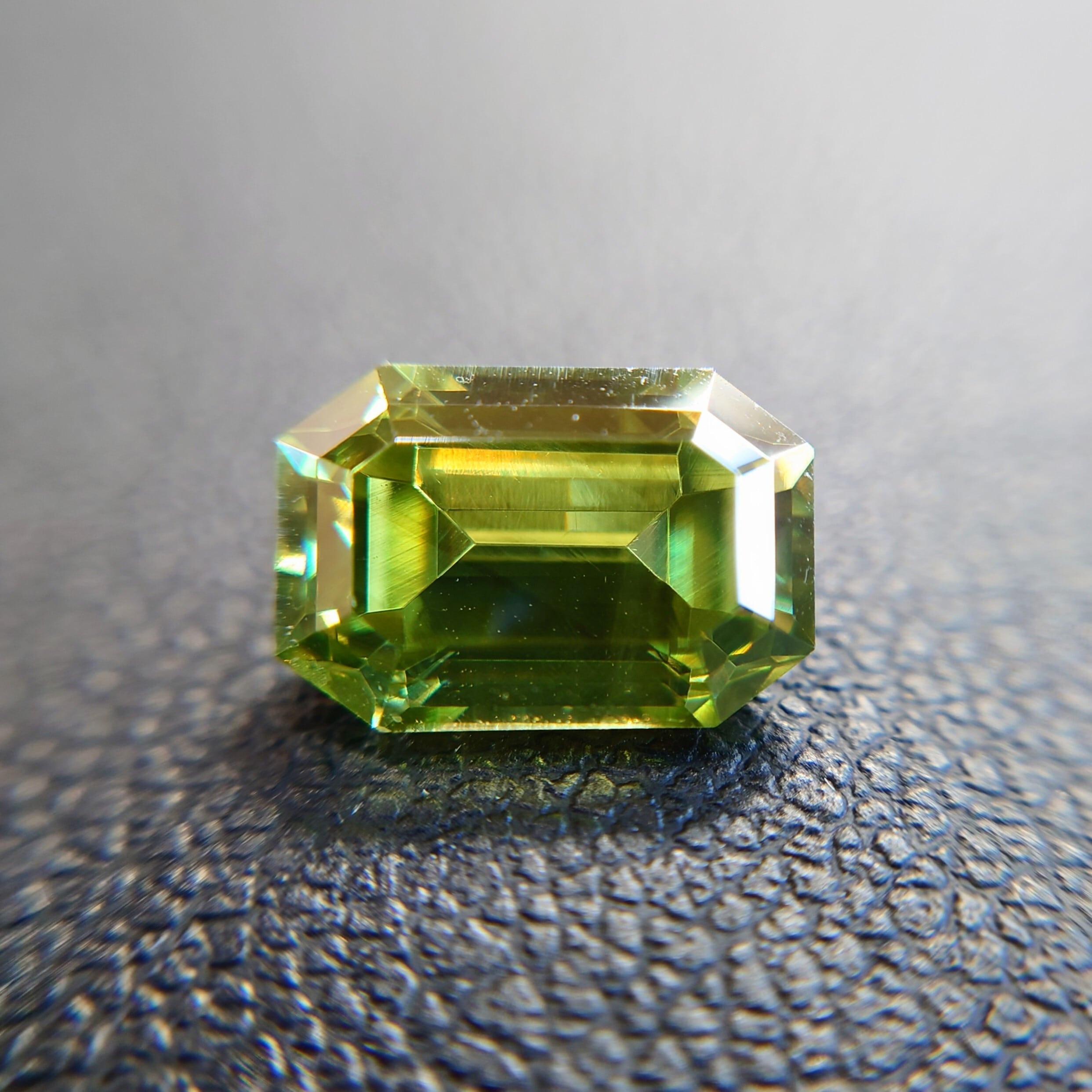 屈折率はダイヤモンドに迫る高さを持ちながら、硬度は3.5〜4と低く、ファセットカット自体が難しい宝石。本石のような整ったカット石は希少価値の高い存在です。