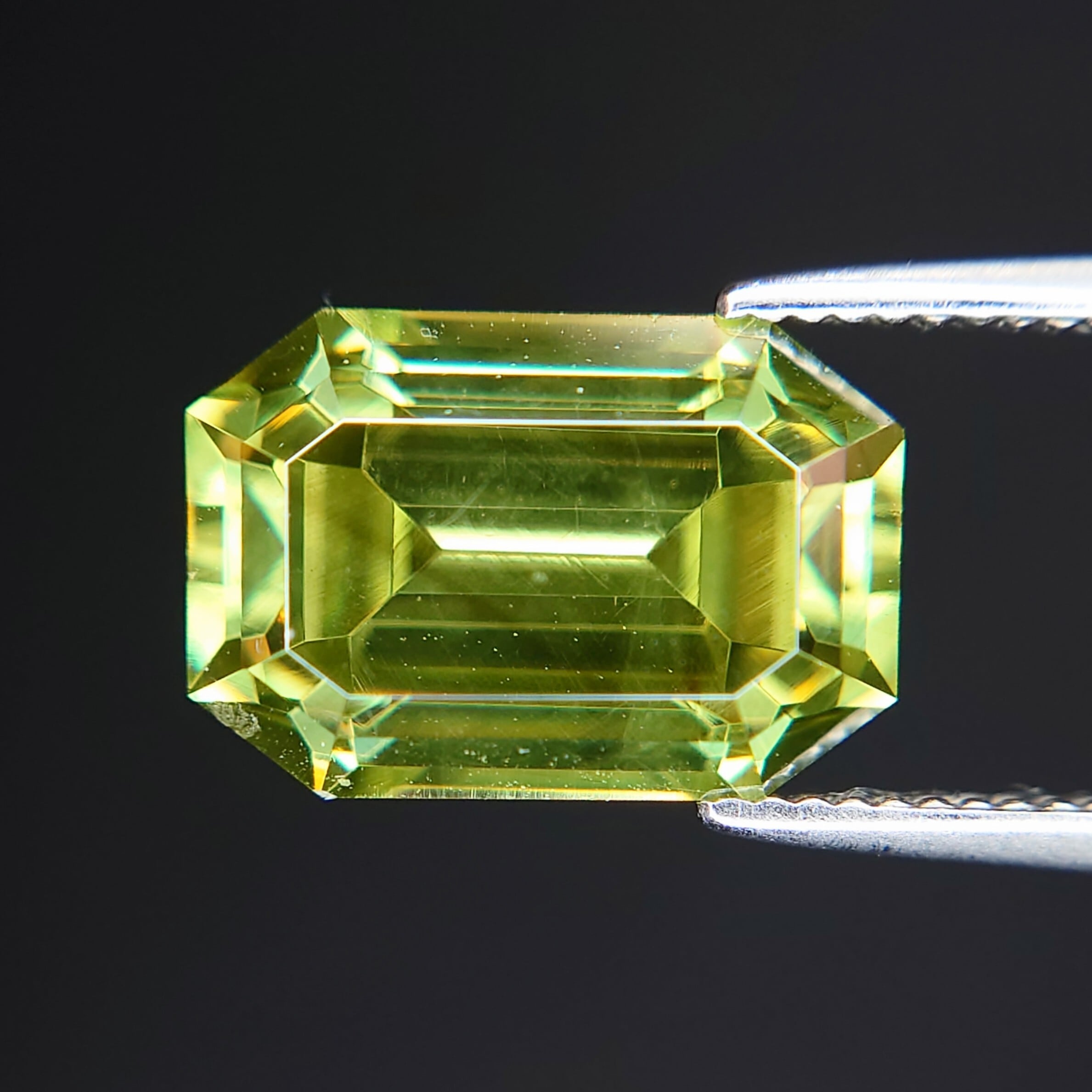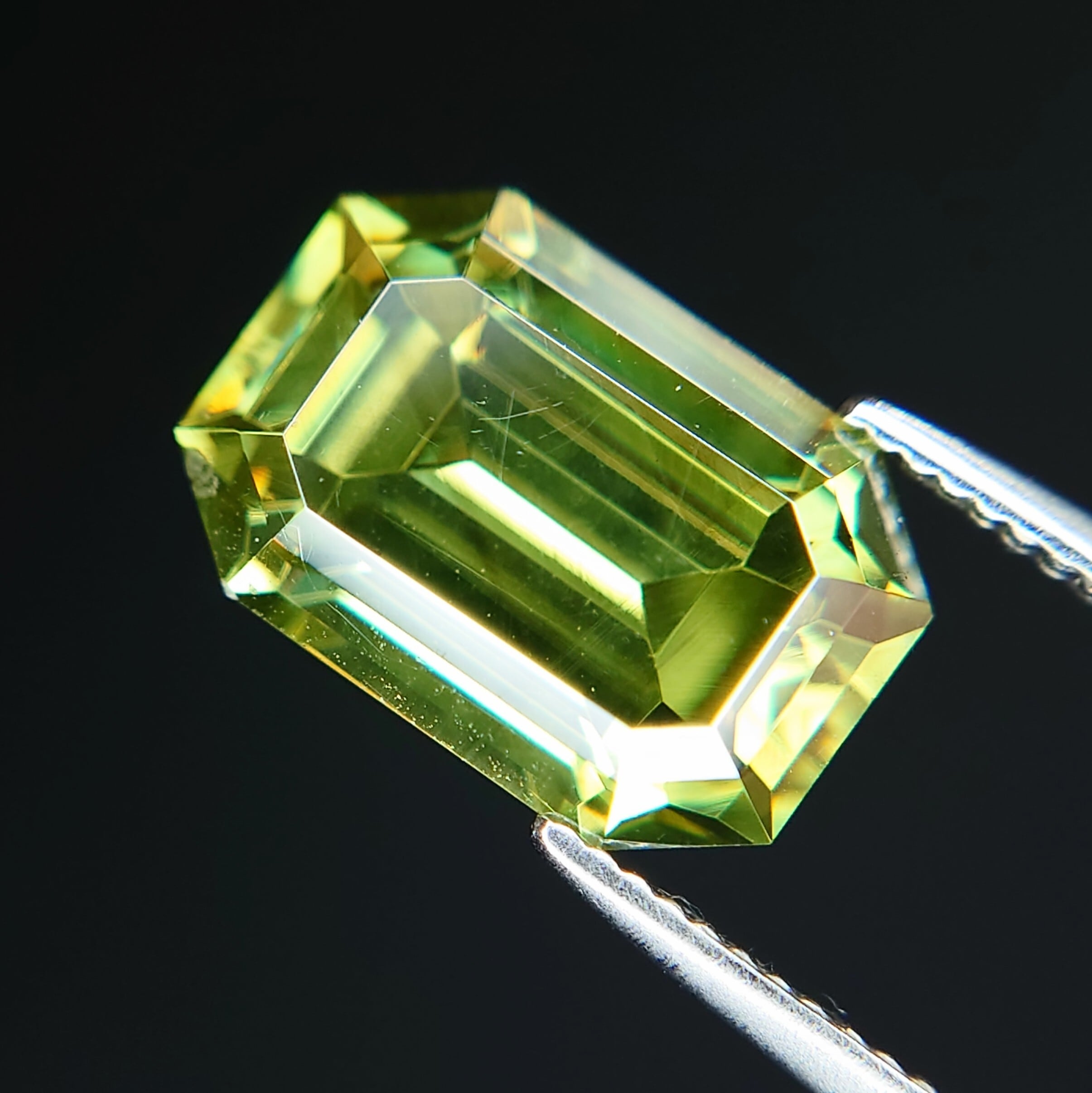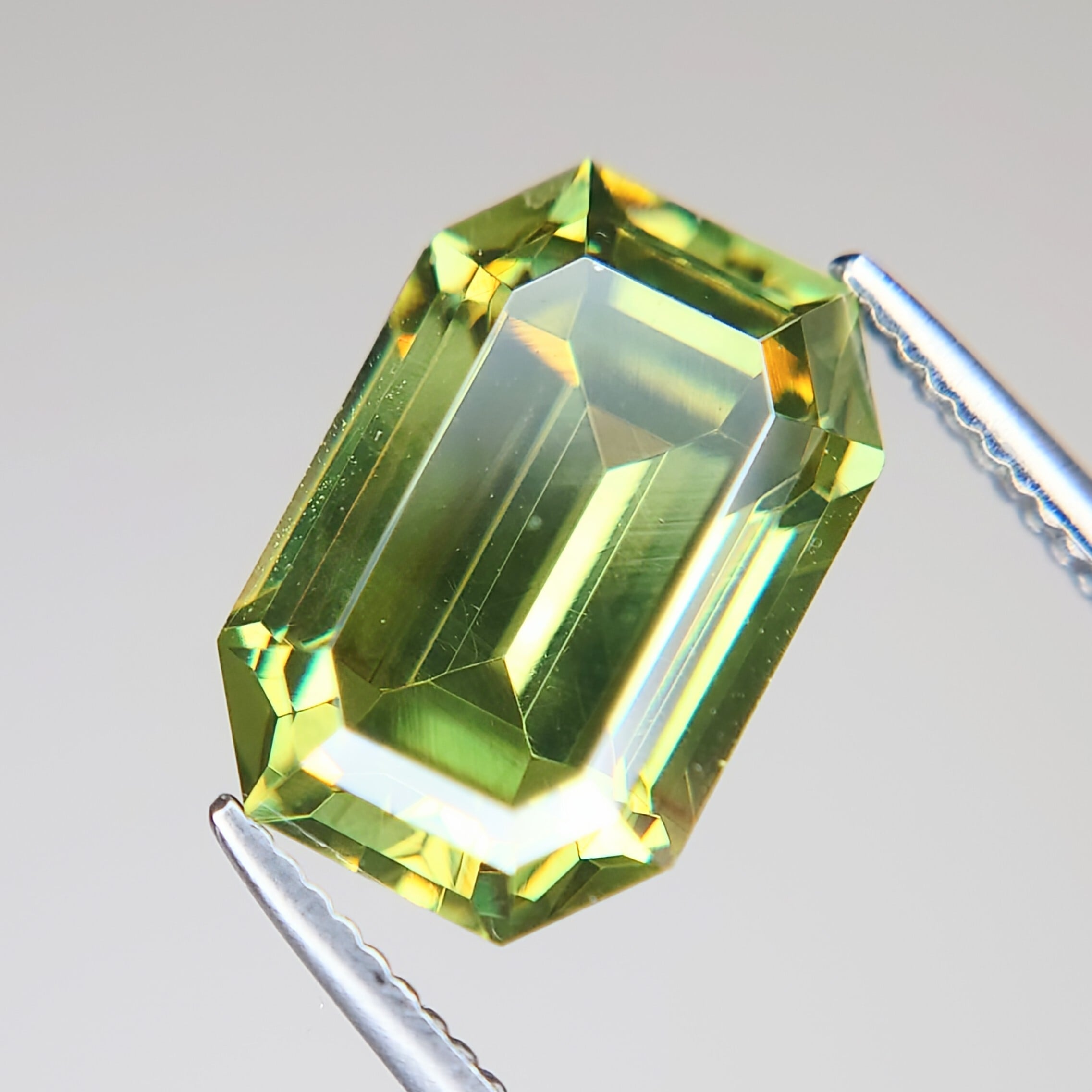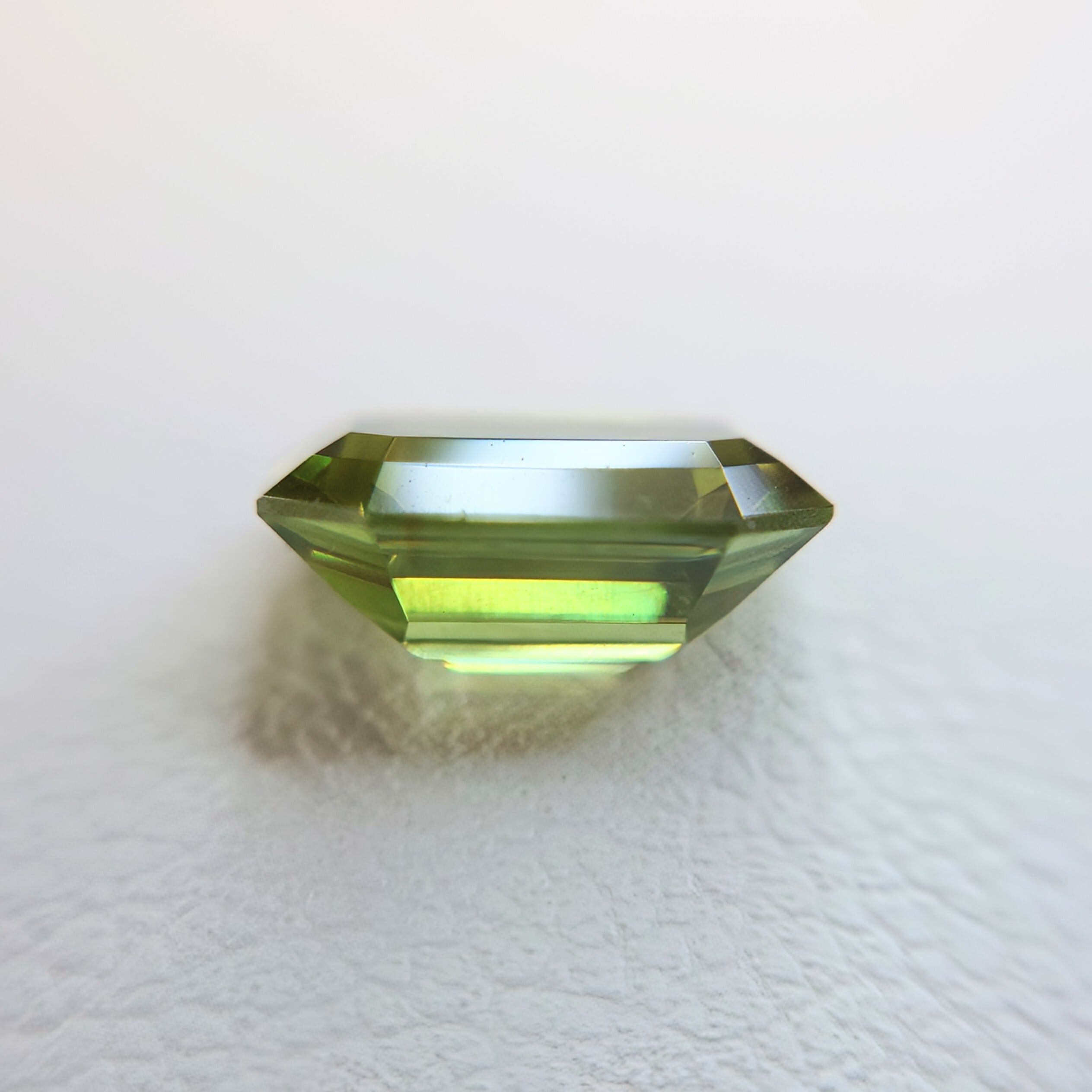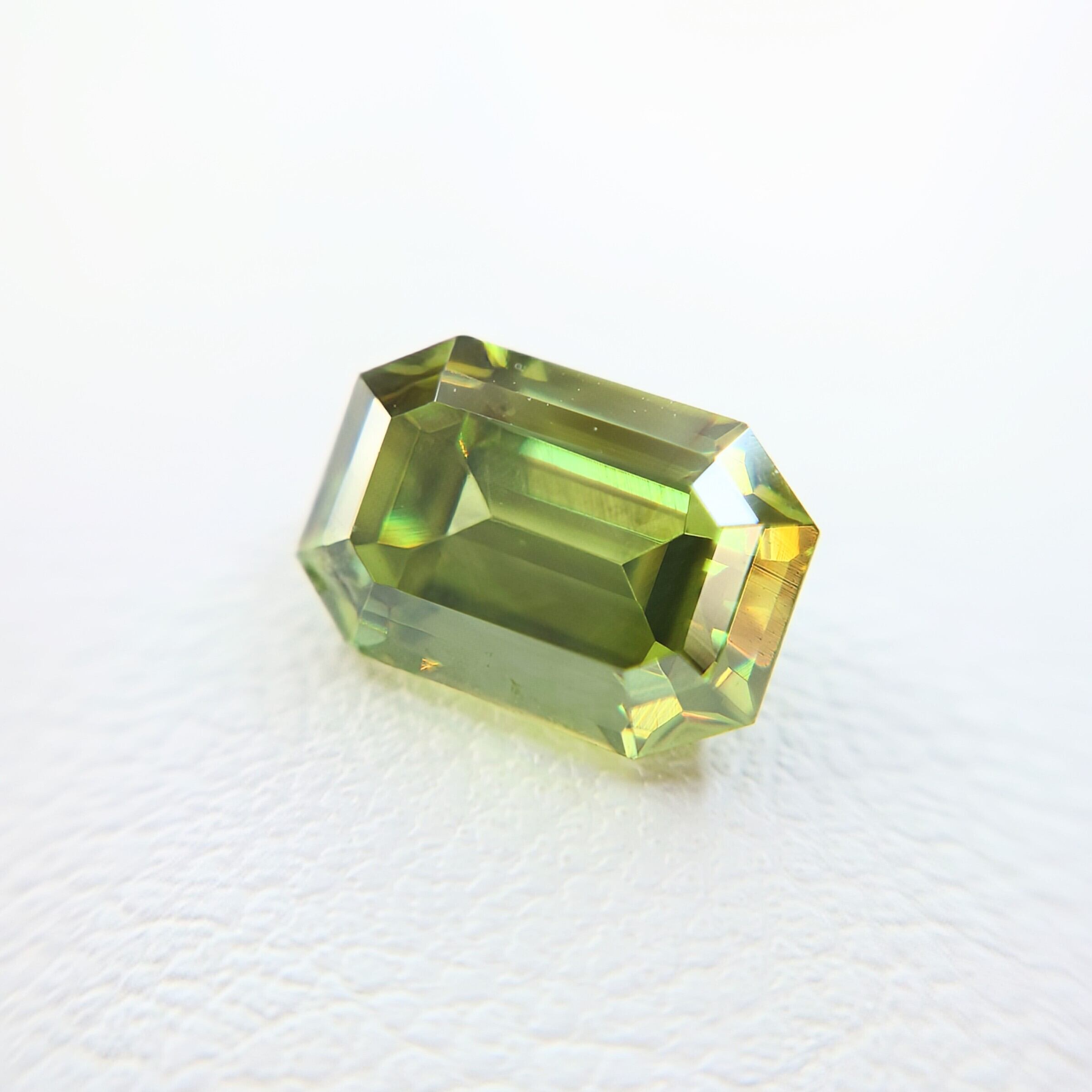 エメラルドカットに丁寧に研磨された本石は、シャープなファセット面が光を効率よく取り込み、内部から湧き上がるような強い輝きを演出。
