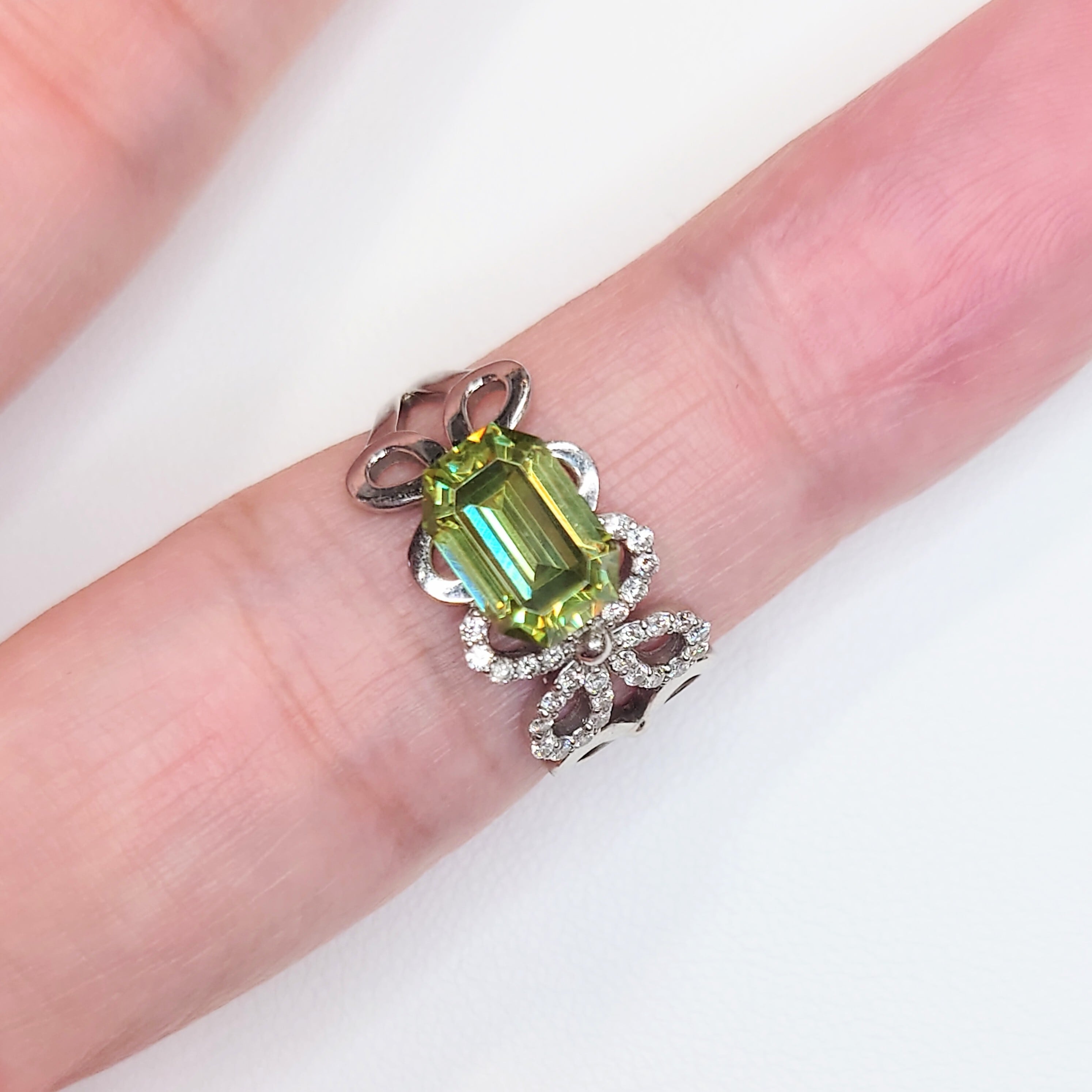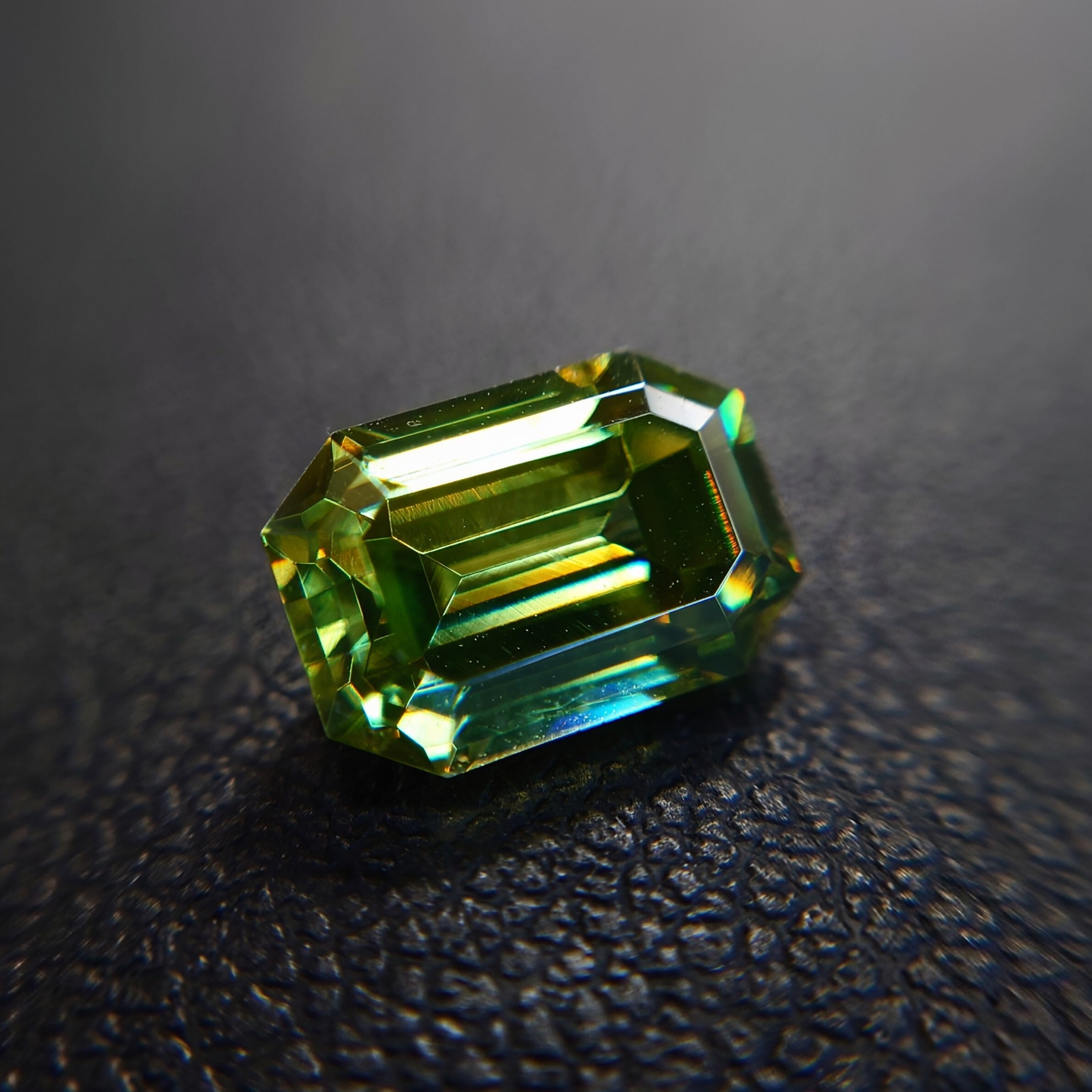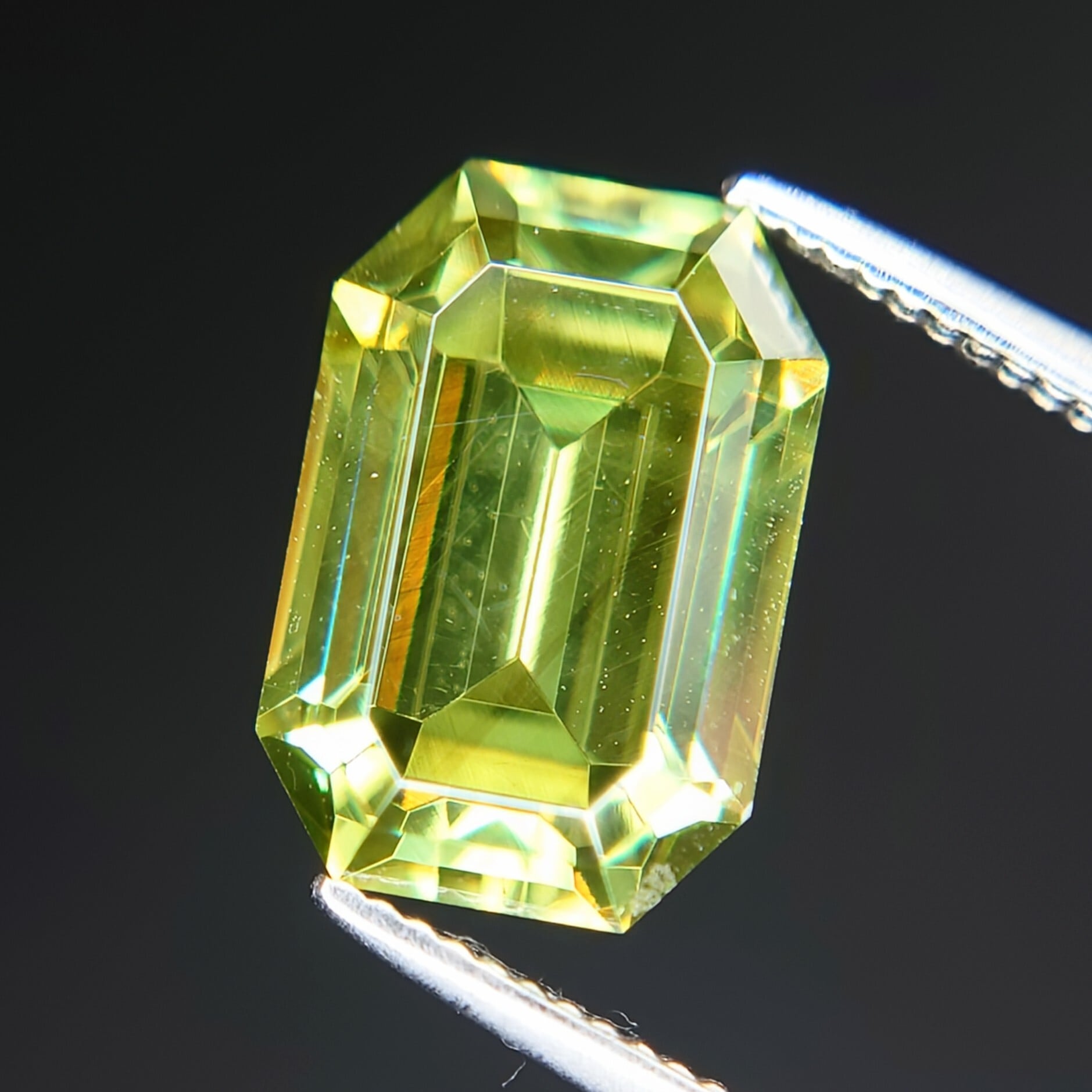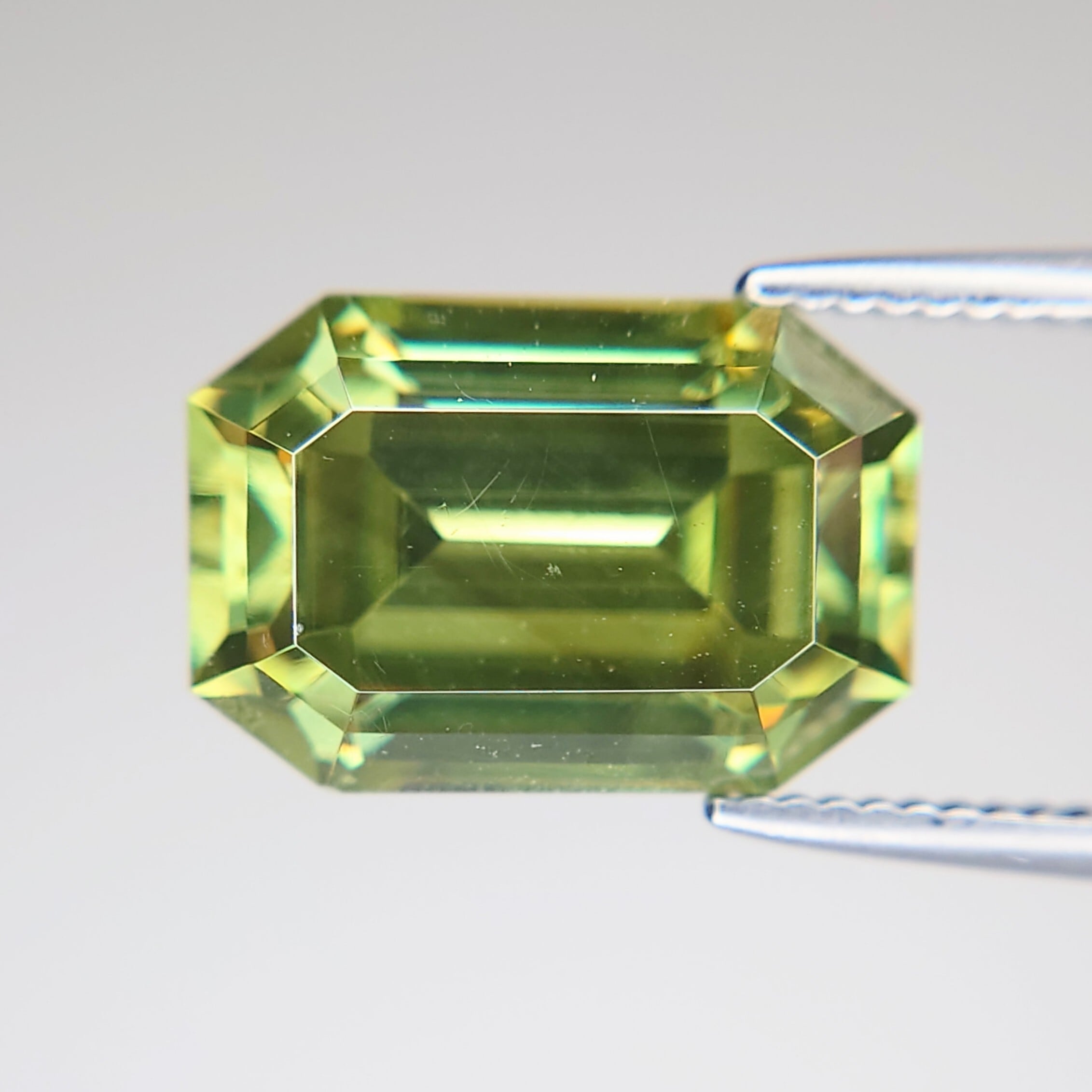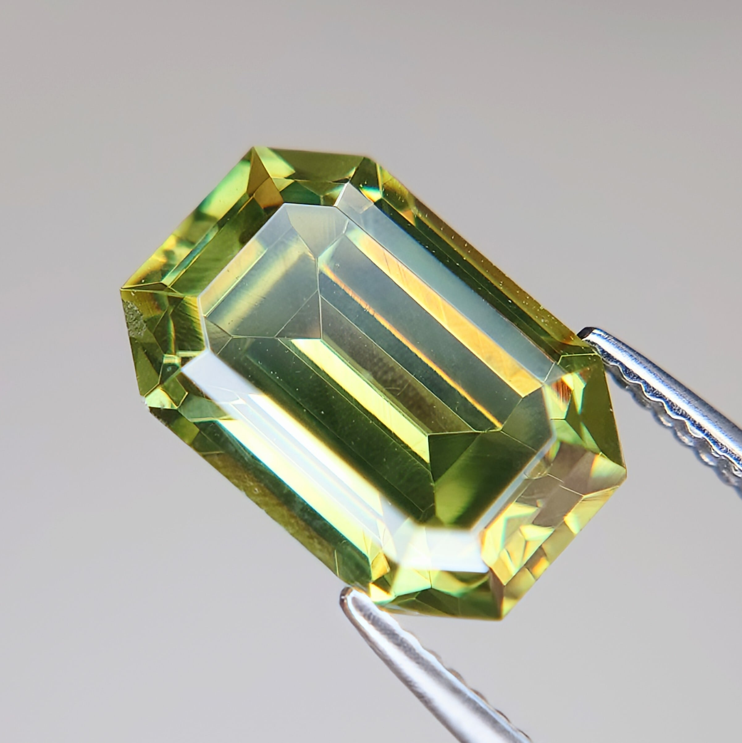 エメラルドカットに丁寧に研磨された本石は、シャープなファセット面が光を効率よく取り込み、内部から湧き上がるような強い輝きを演出。