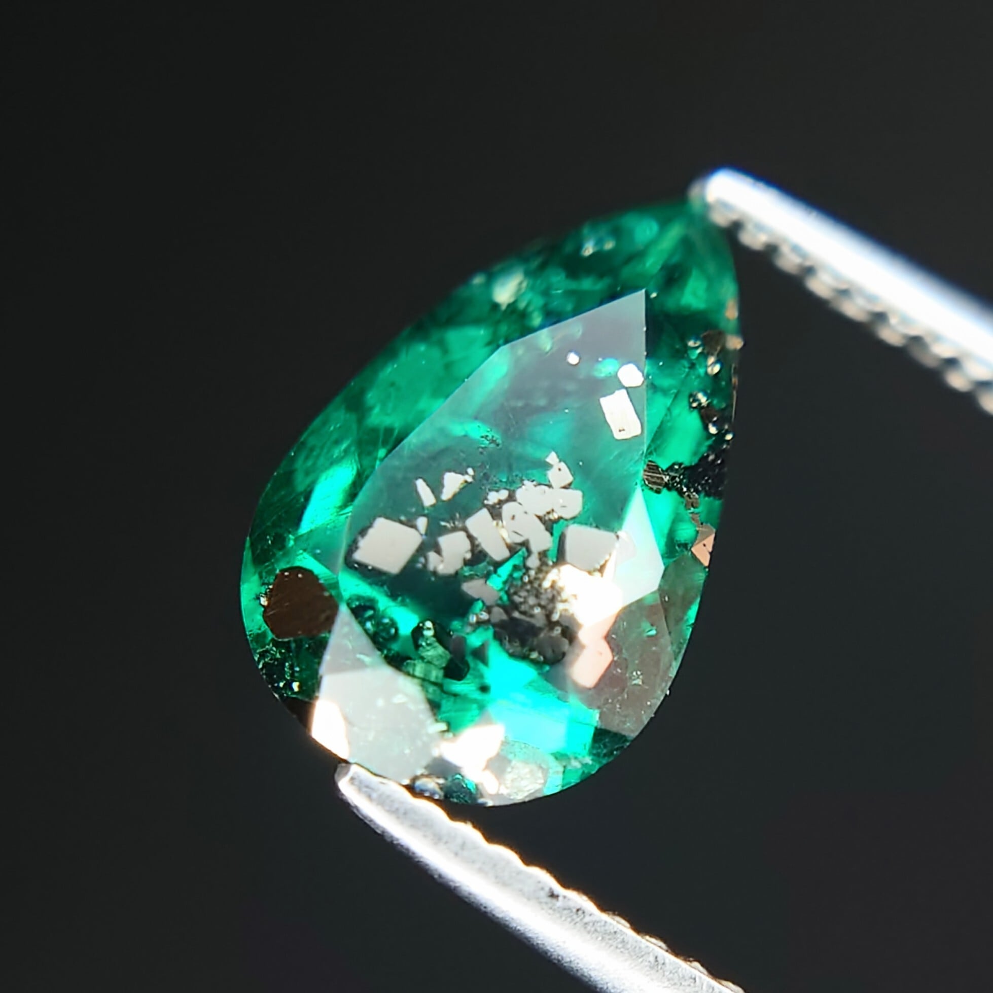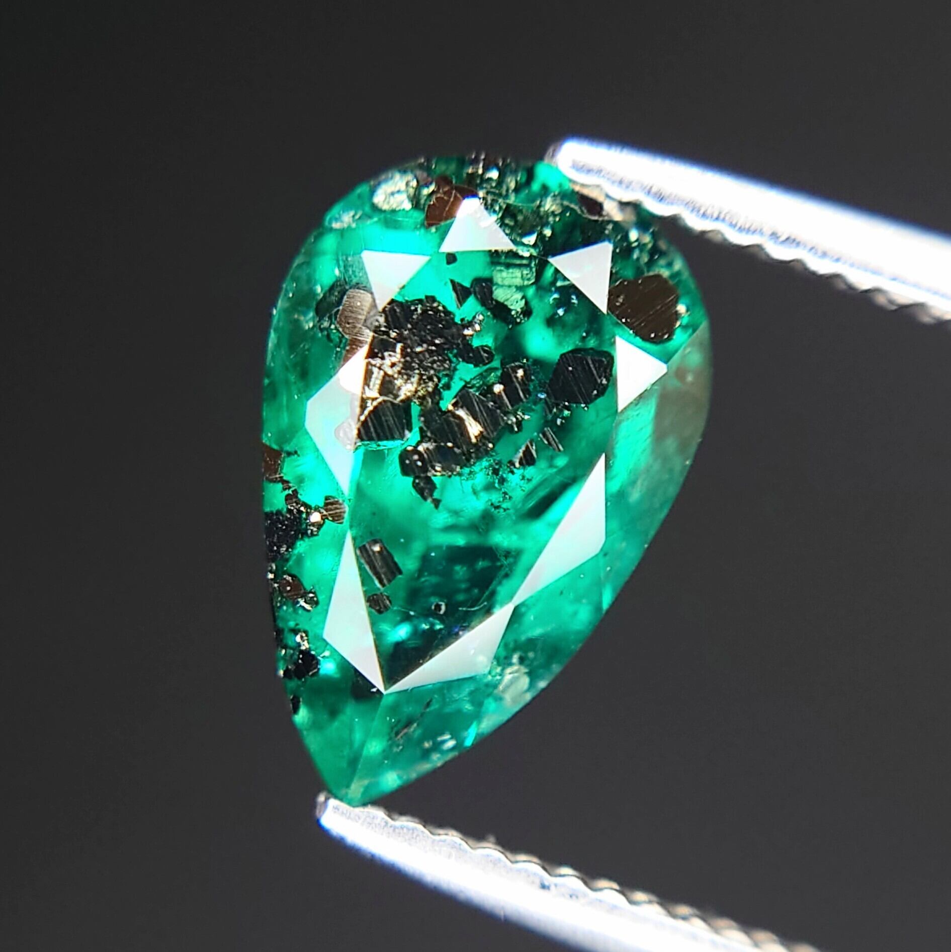 一般的なエメラルドに見られるジャルダンとは異なり、黒色〜金色のパイライトが結晶の形を保ったまま内包されており、天然鉱物ならではの景色を楽しむことができます。