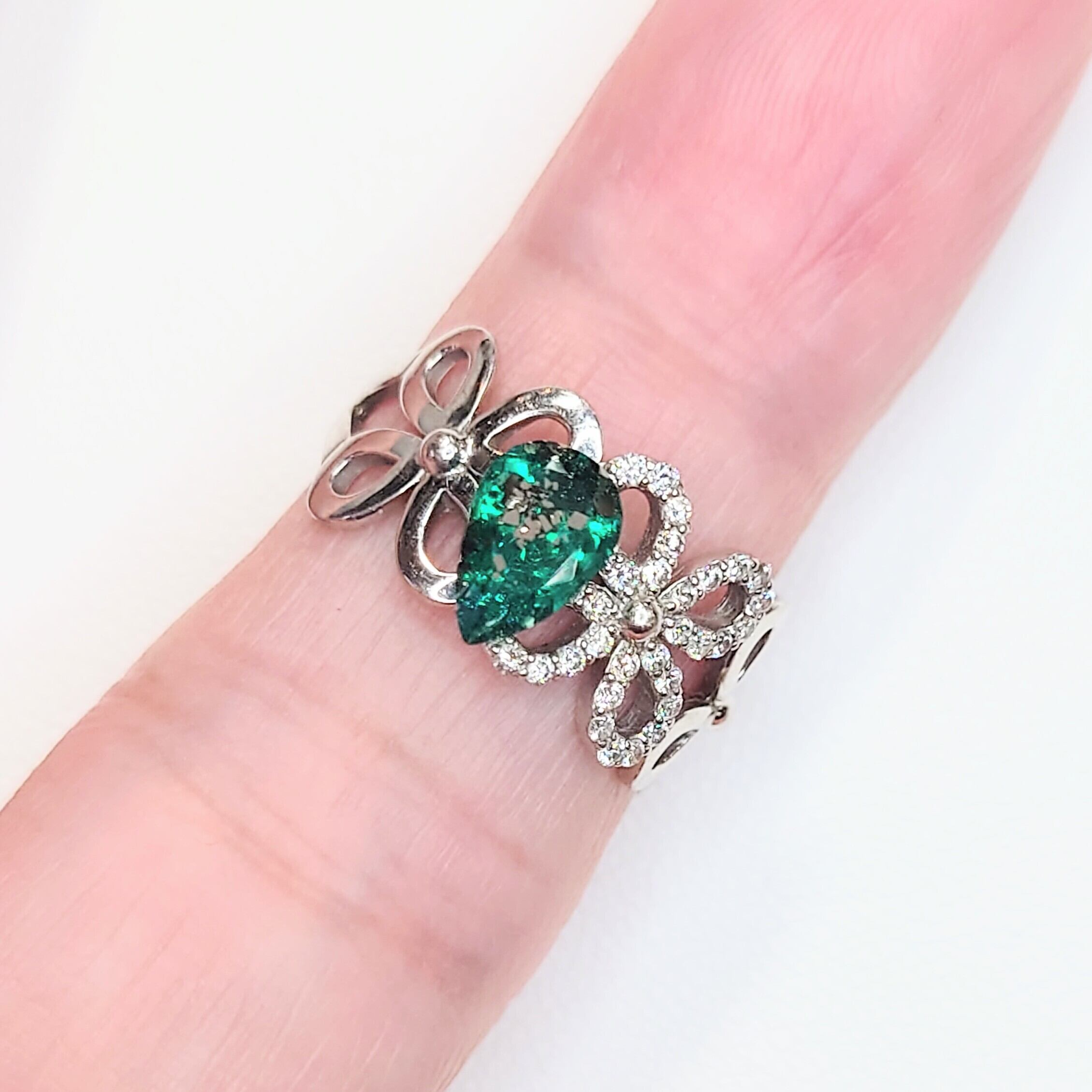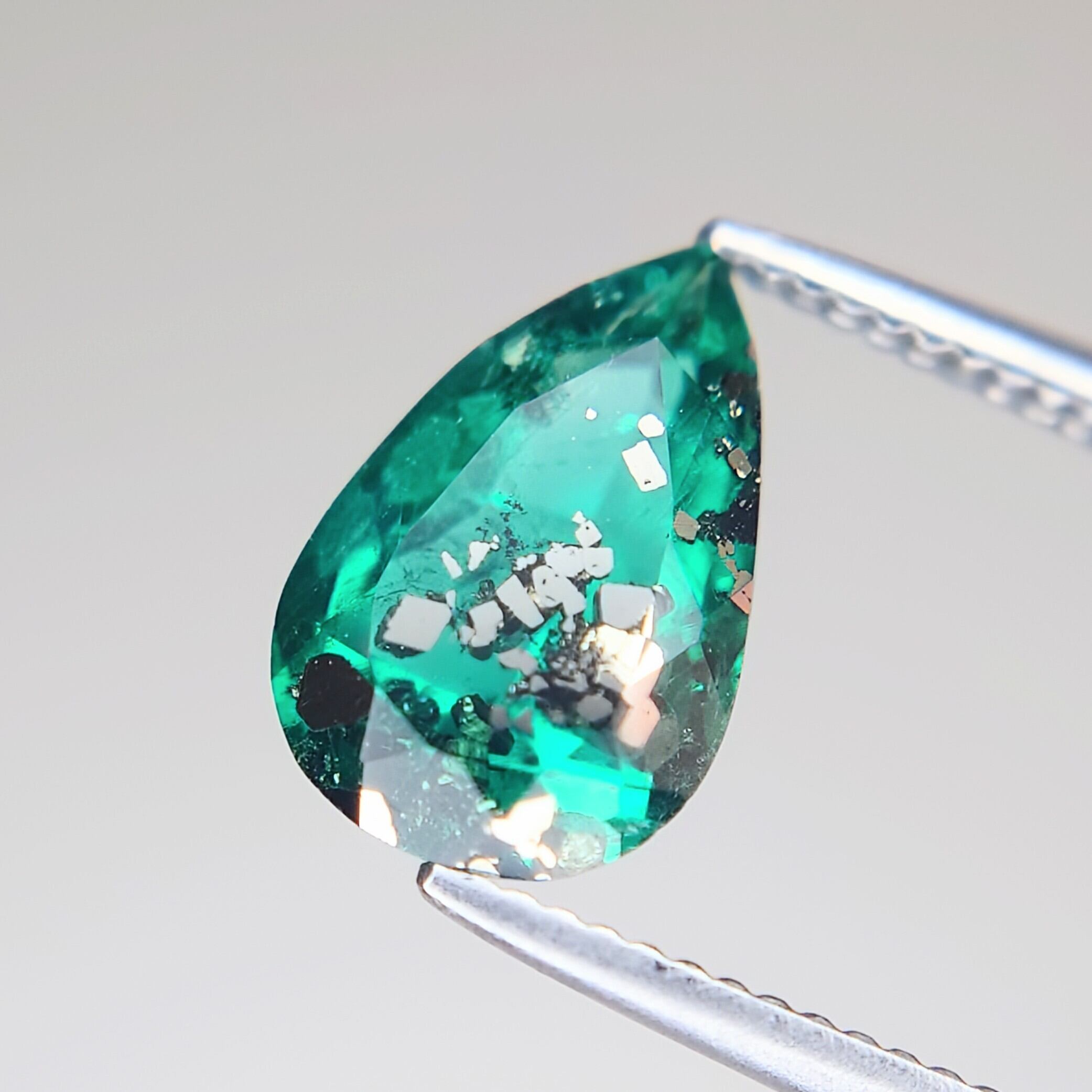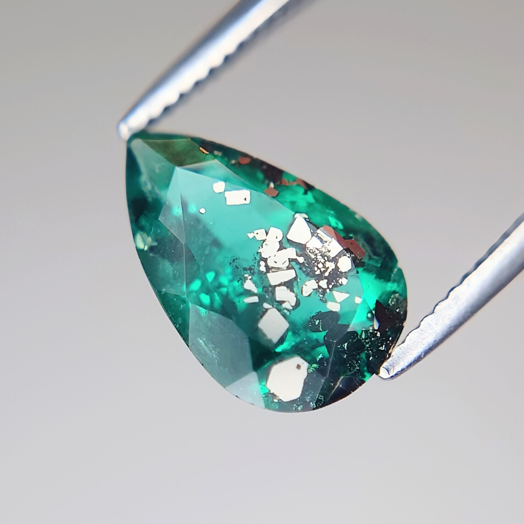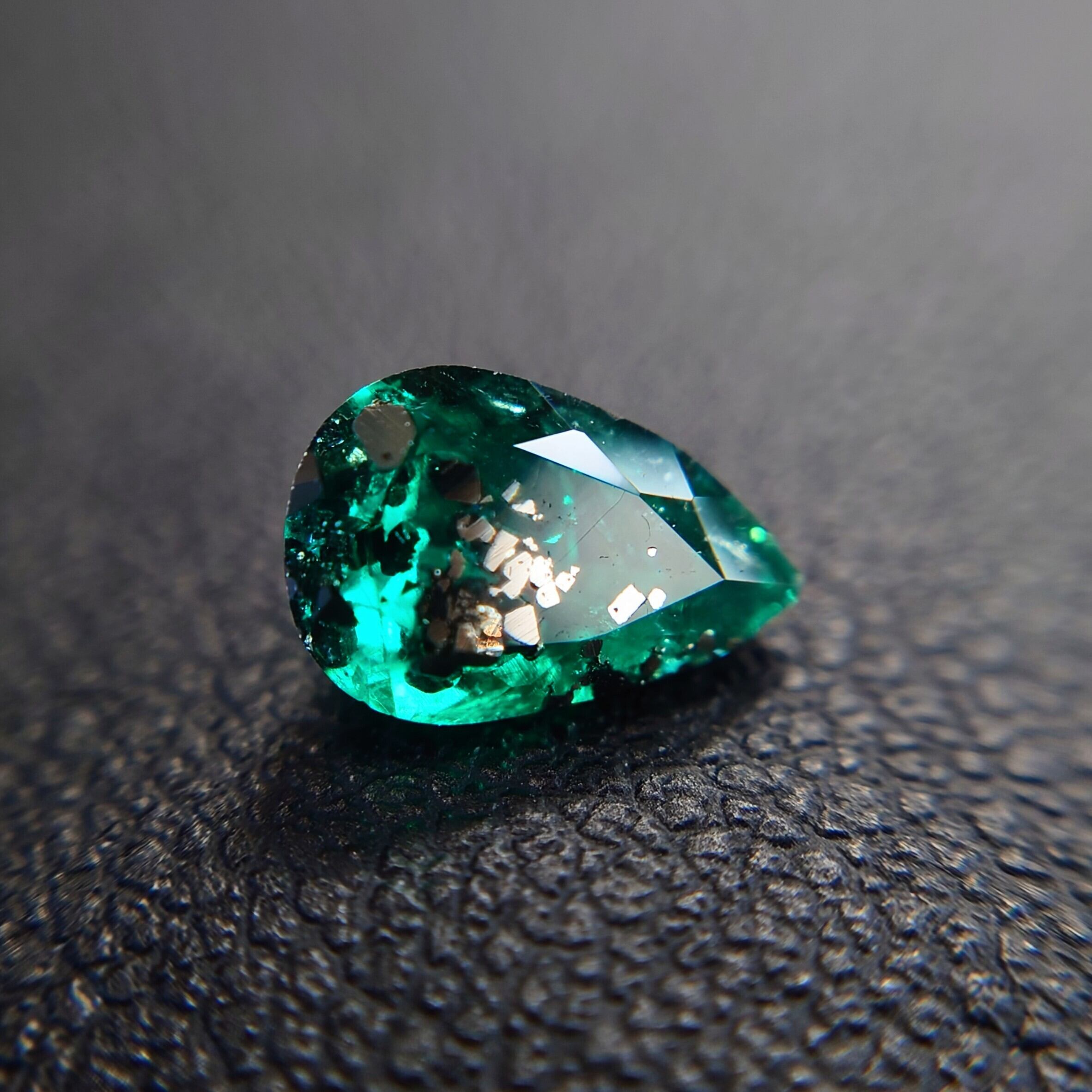 深みのあるエメラルドグリーンの中に浮かぶパイライトは、まるで宇宙や鉱物標本を閉じ込めたかのような独特の表情を見せ、通常の宝石質エメラルドとは一線を画すコレクターズストーンです。