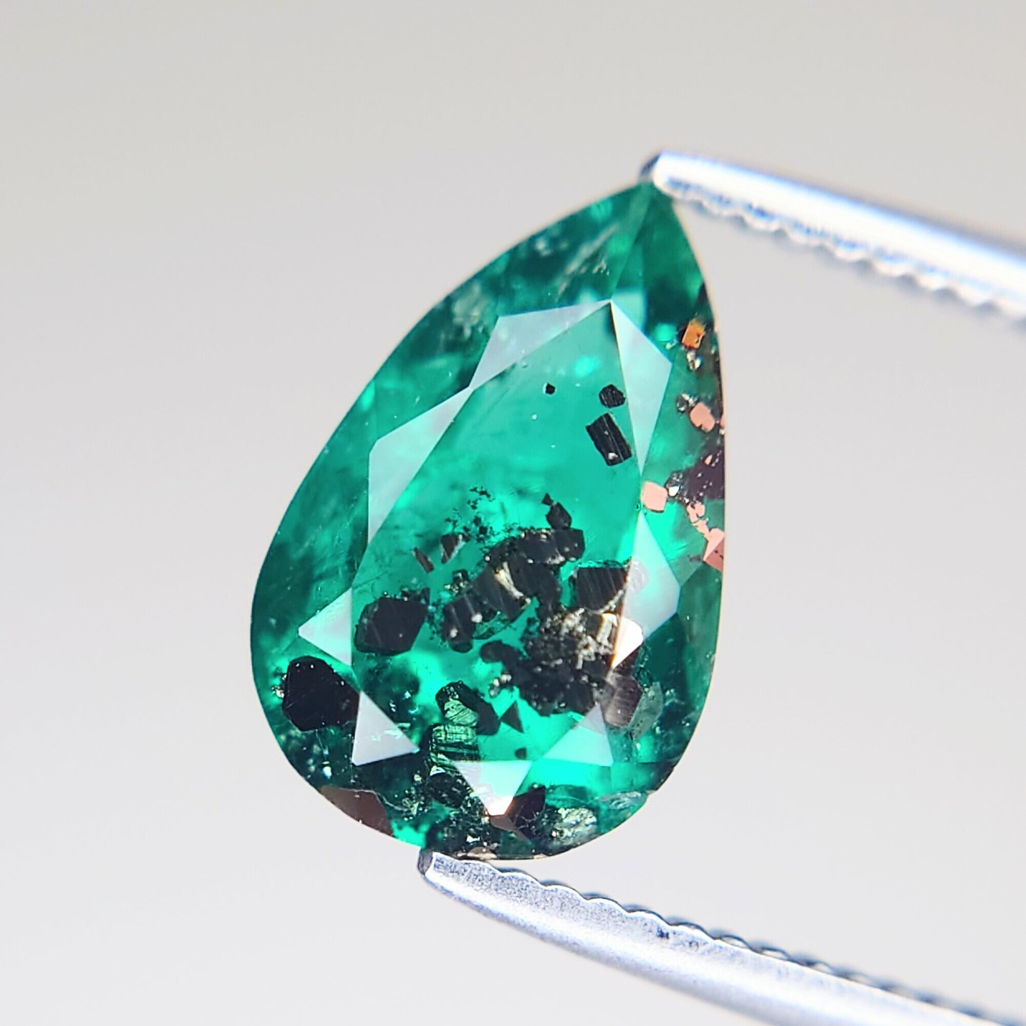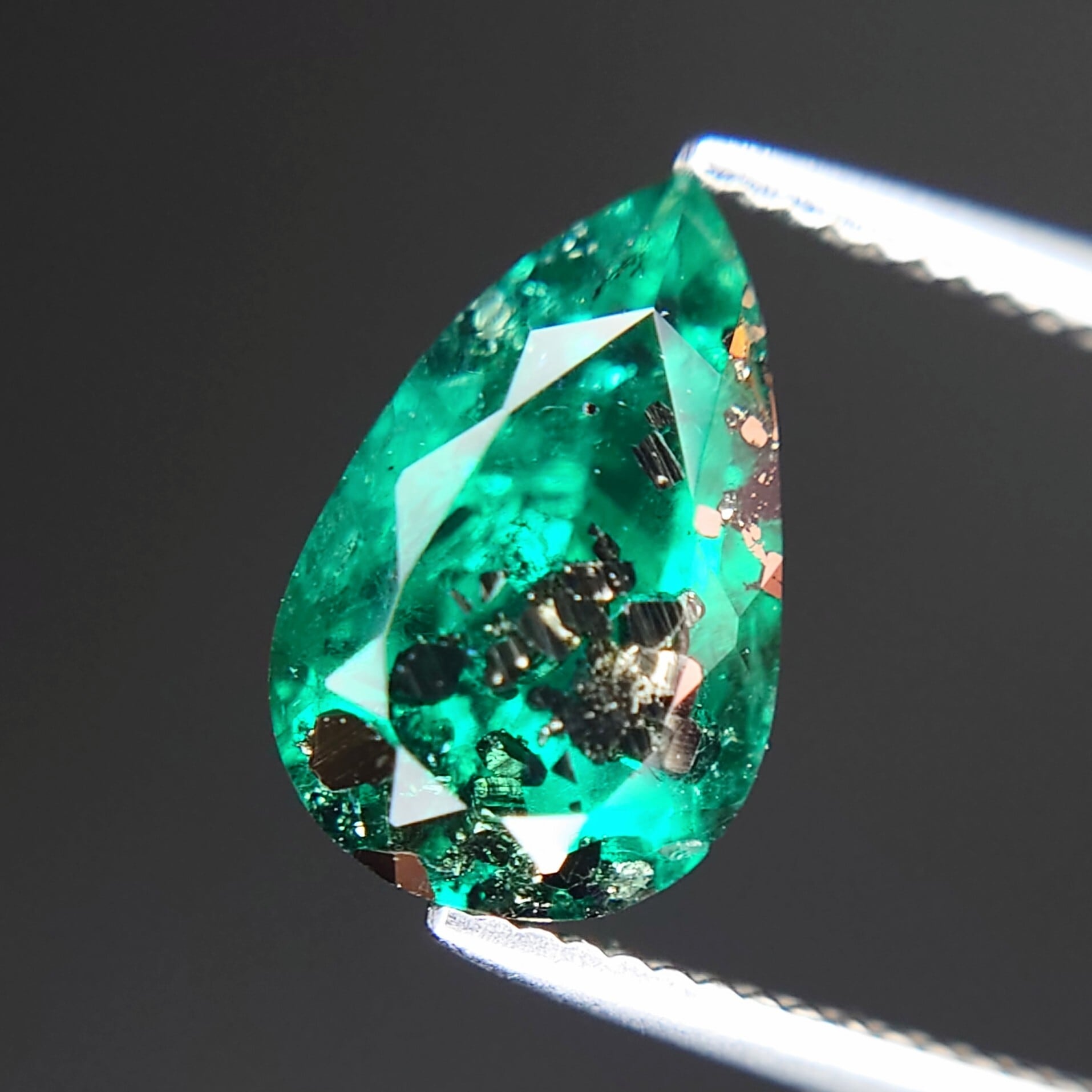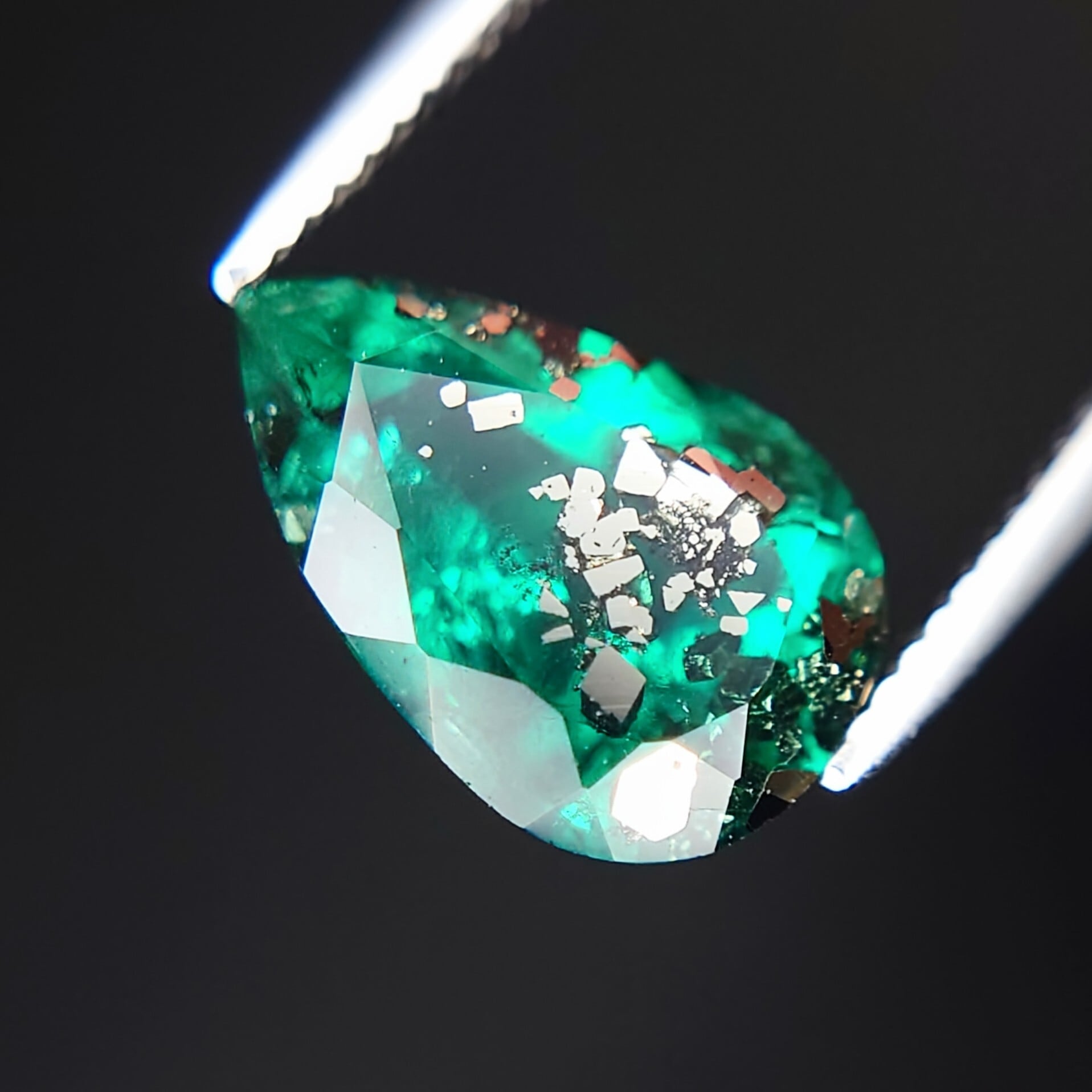 鮮やかなグリーンのエメラルドの内部に、金属光沢を放つパイライト結晶が内包された非常に個性的な一石です。