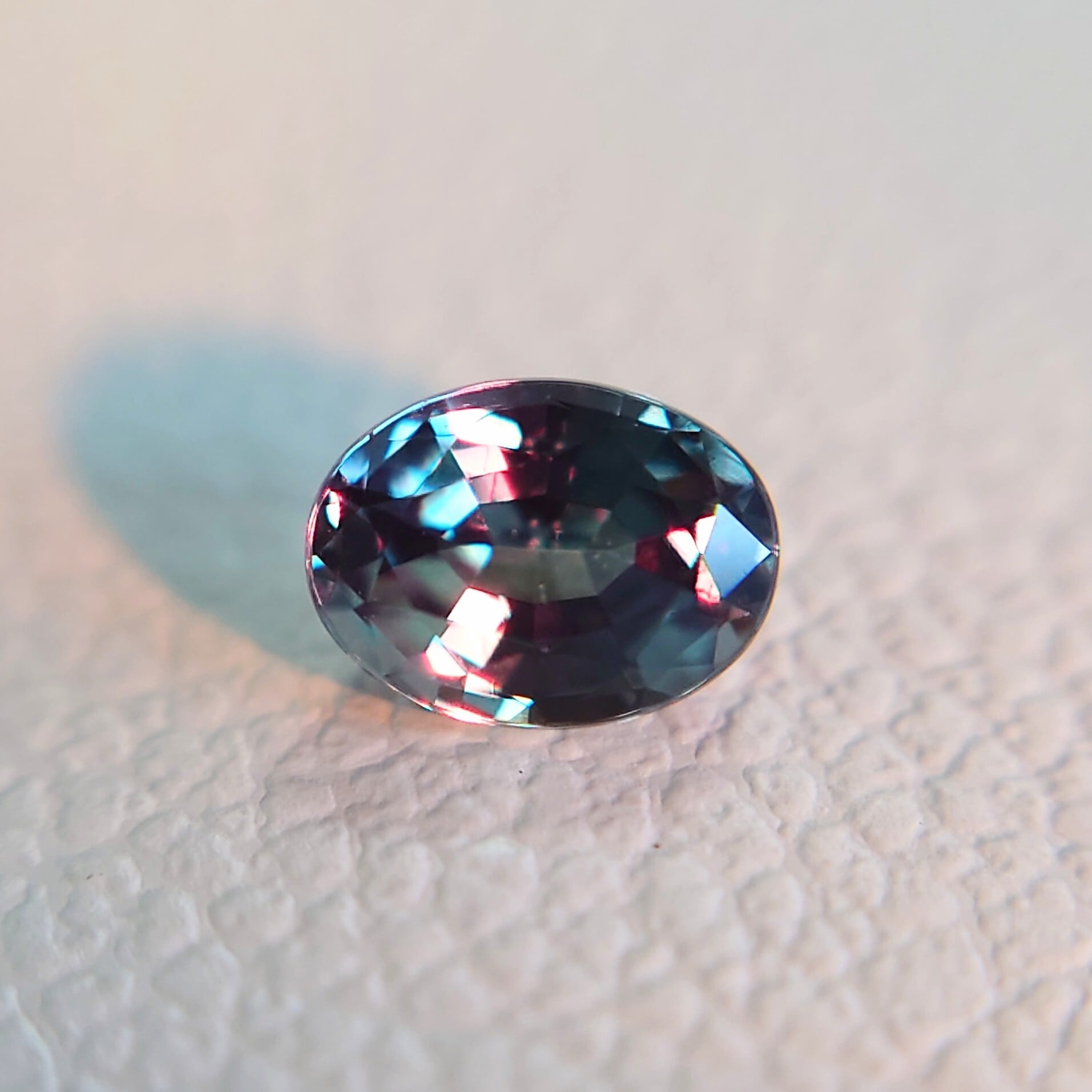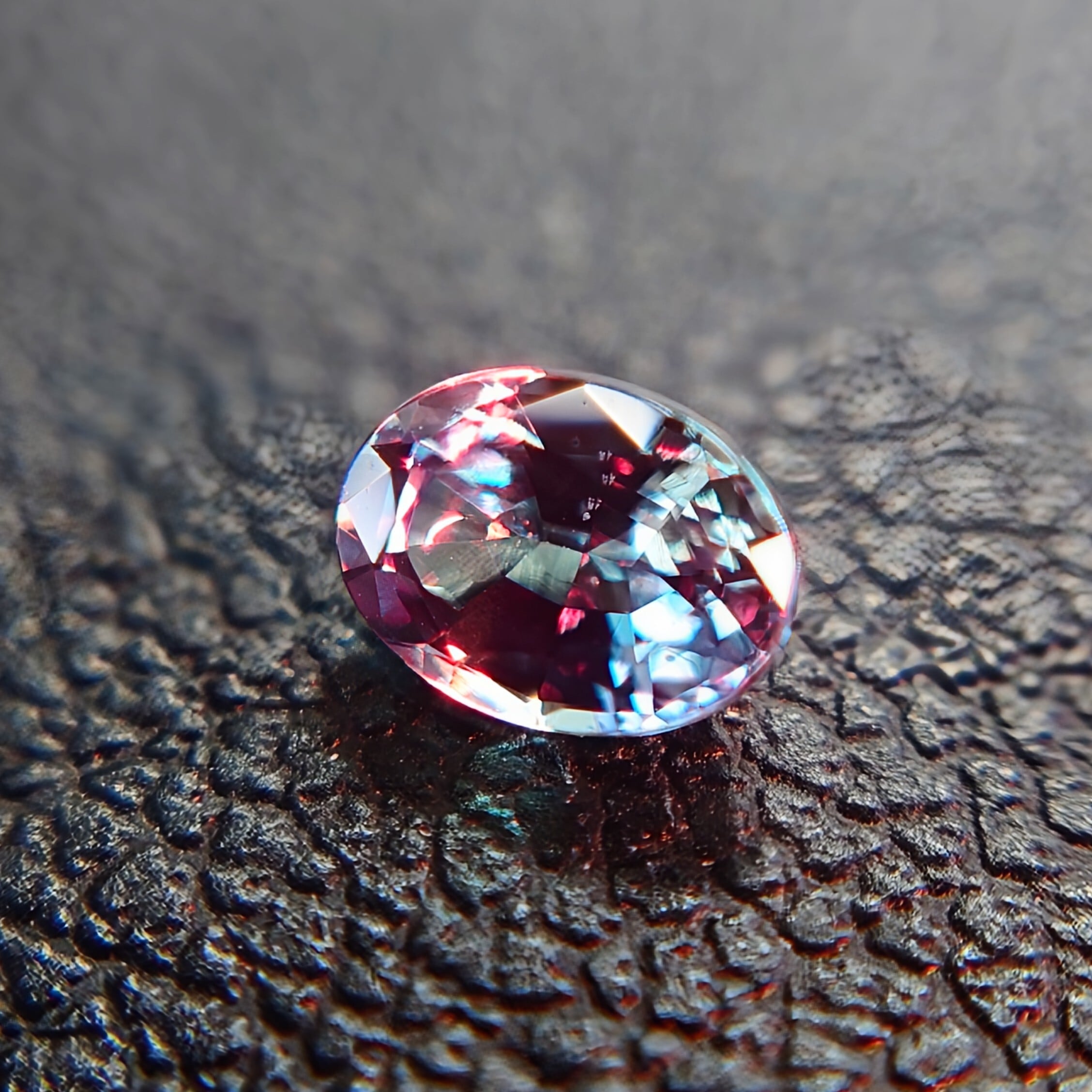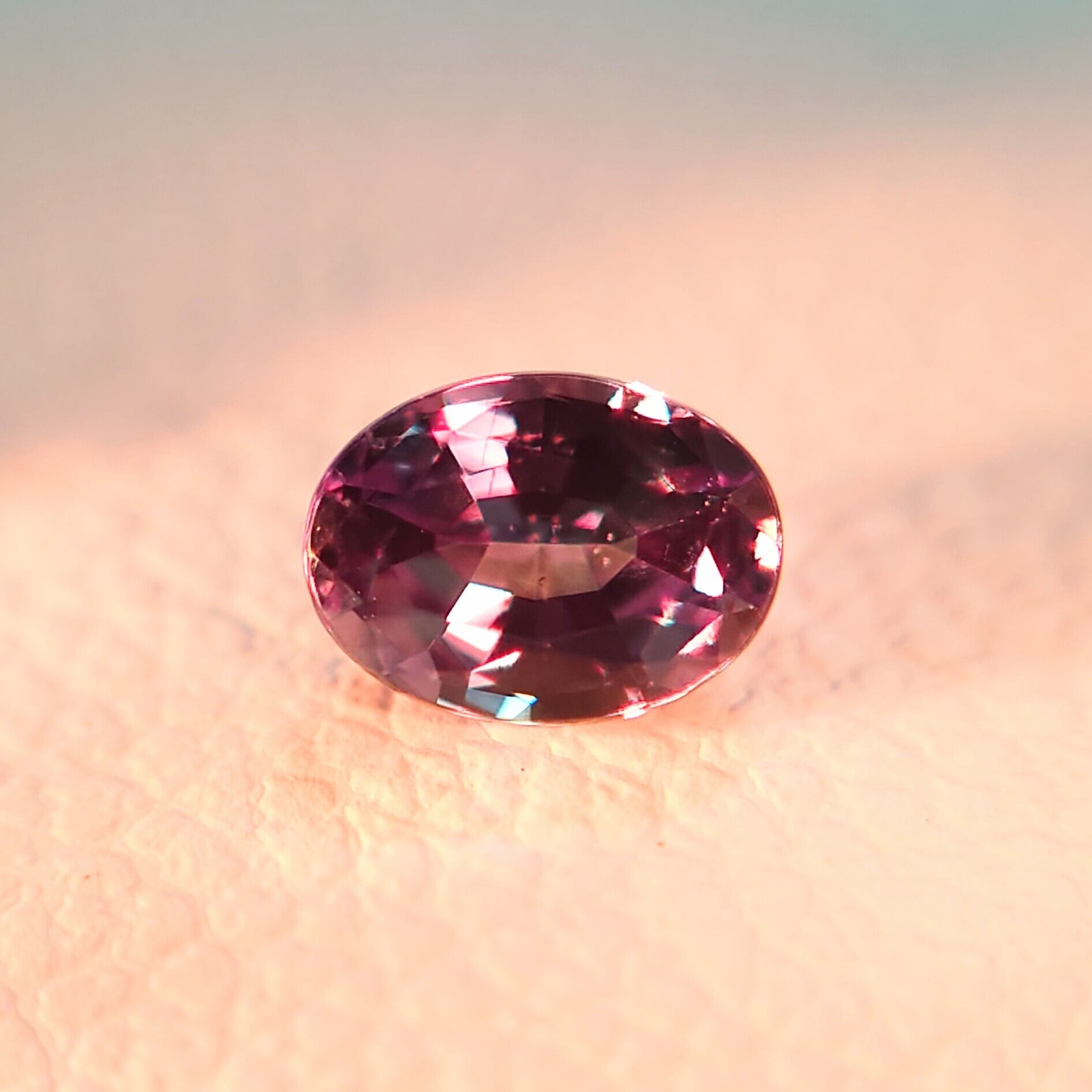 一方、白熱灯や暖色光の下では深みのあるパープル〜ラズベリーレッドへと変化し、アレキサンドライトならではのドラマティックなカラーチェンジをお楽しみいただけます。