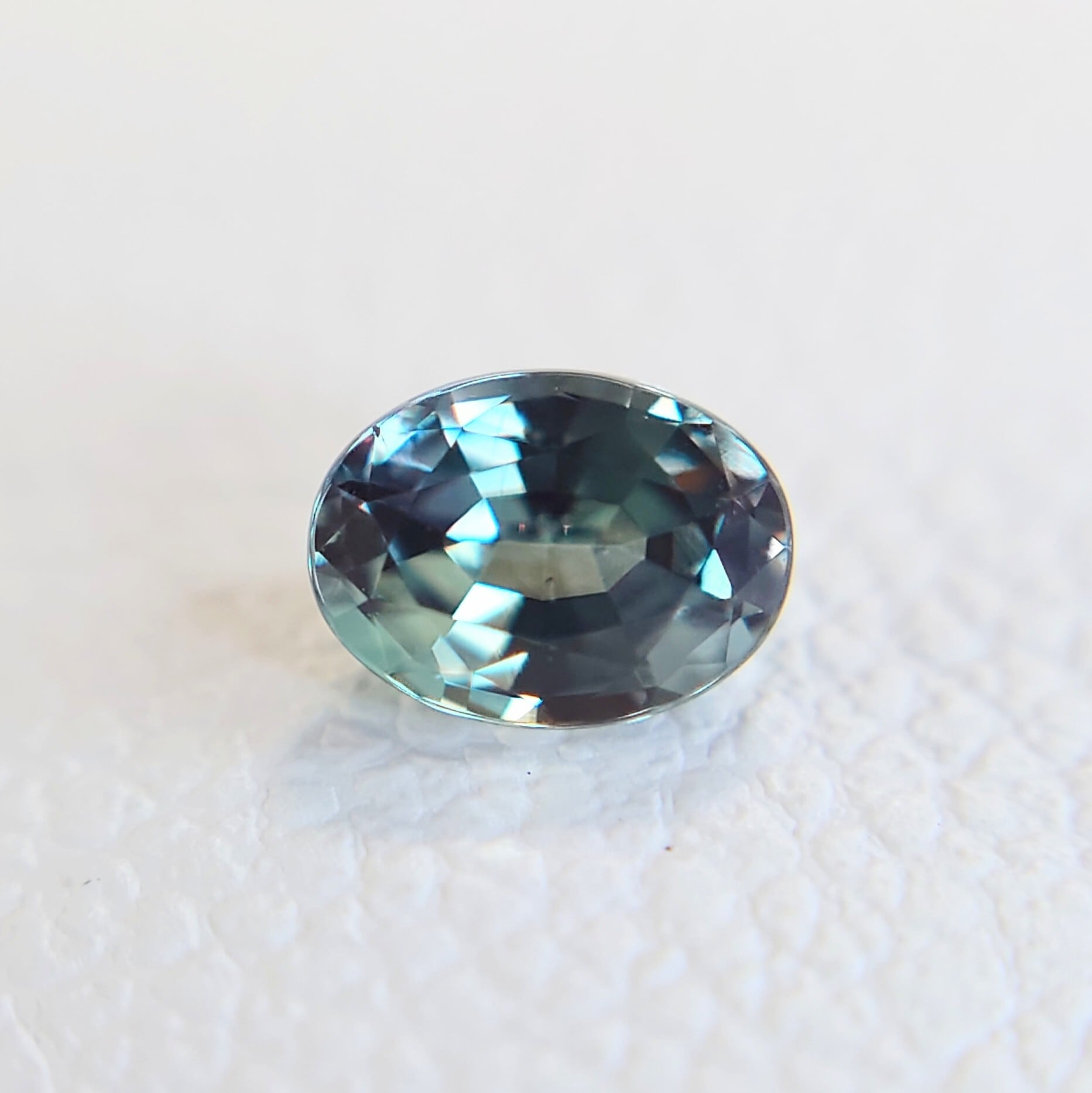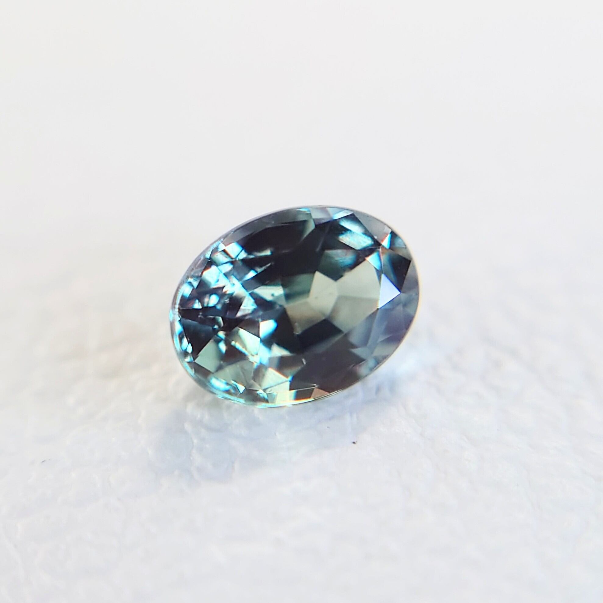 自然光やLEDなどの白色光下では、爽やかなブルーグリーン〜青みを帯びたグリーンカラーを呈し、落ち着いた透明感のある表情を見せます。