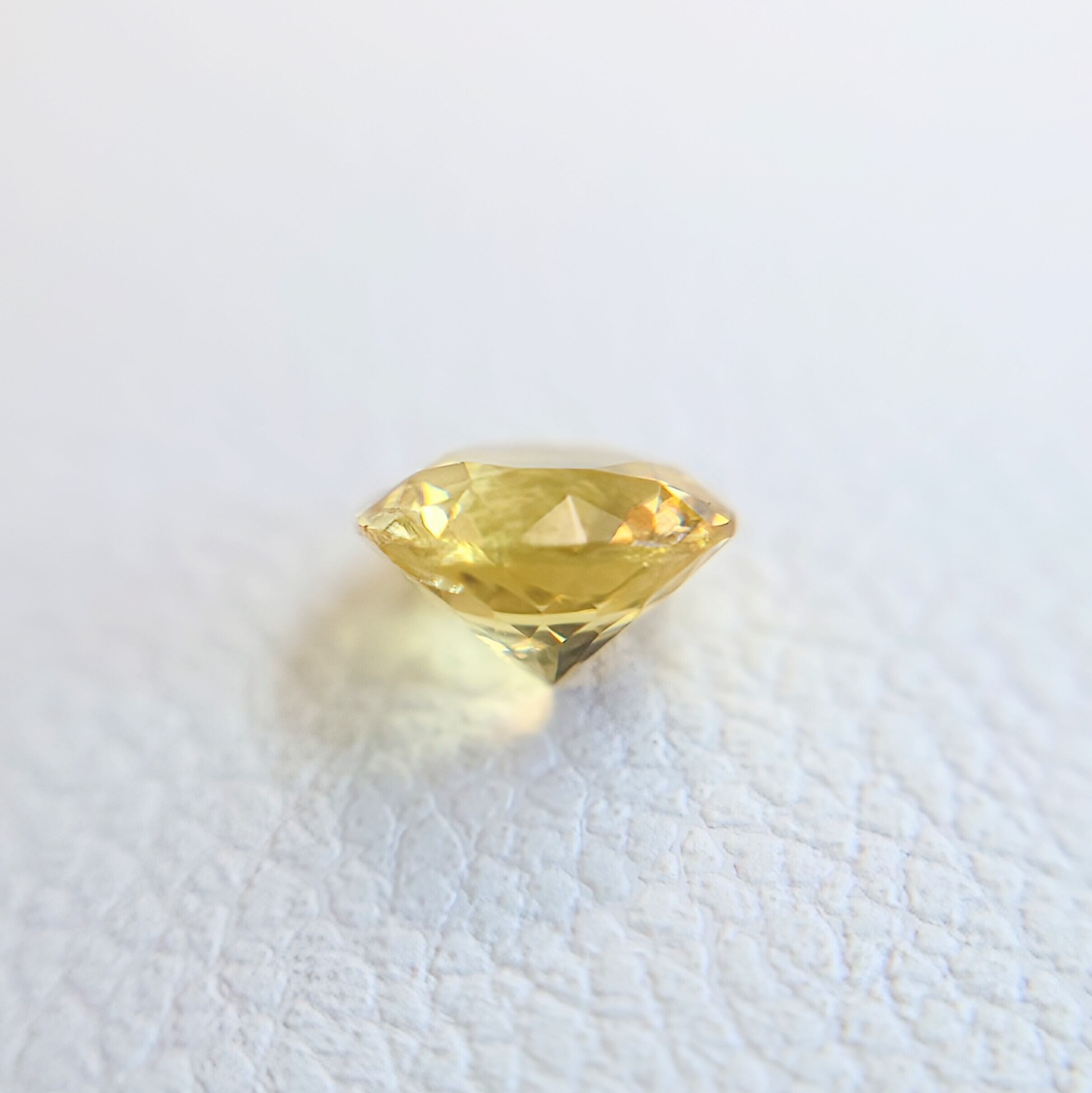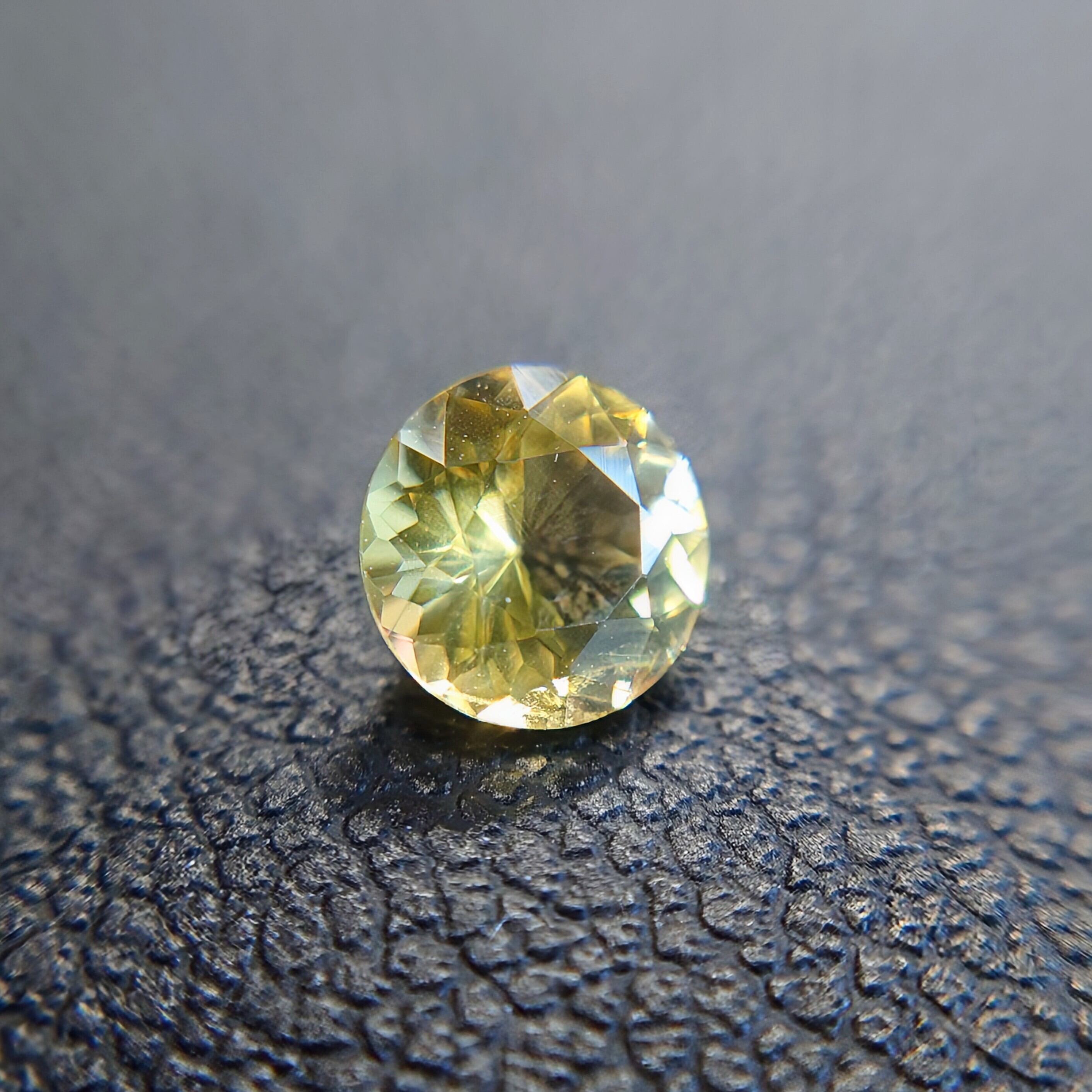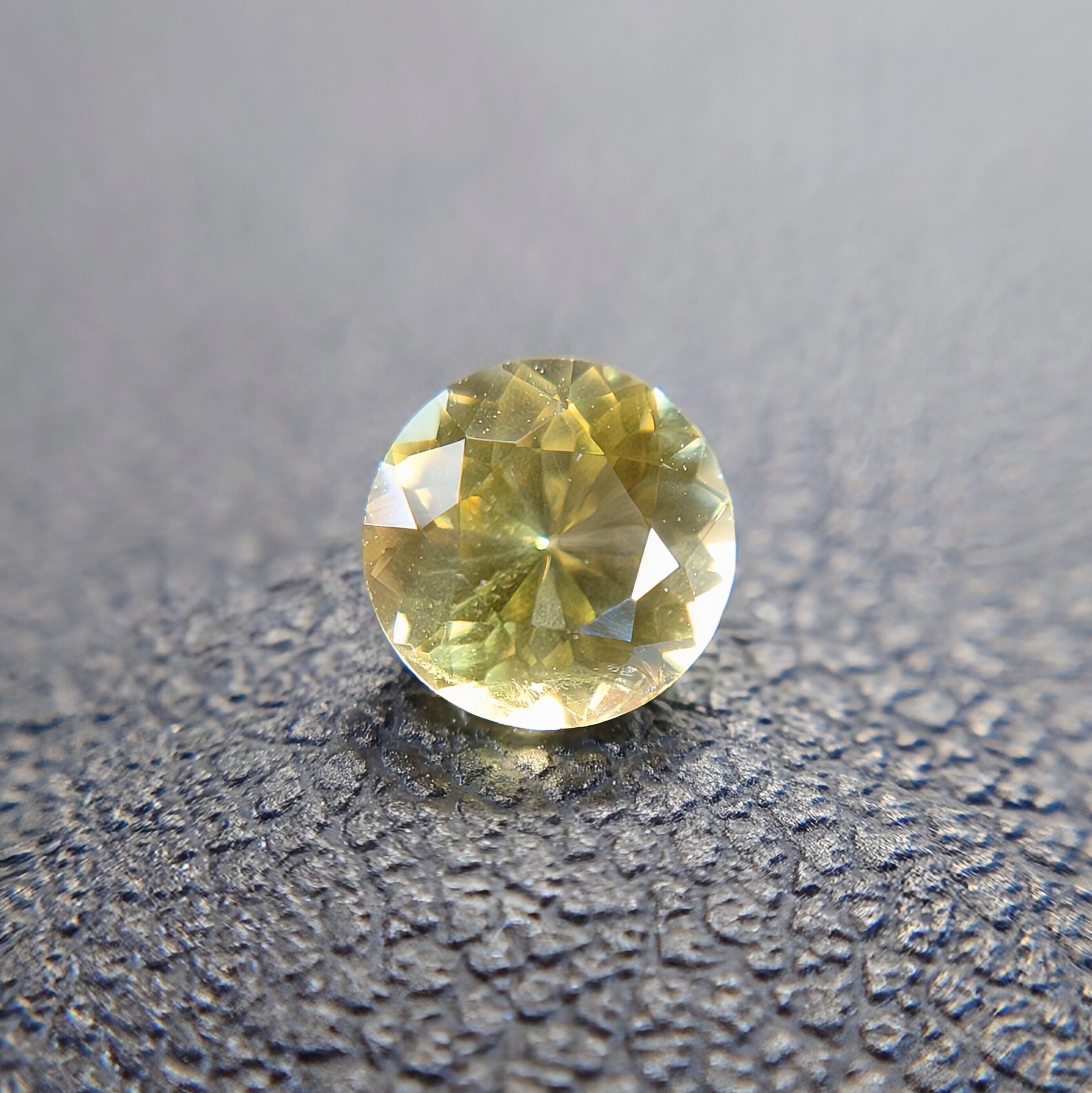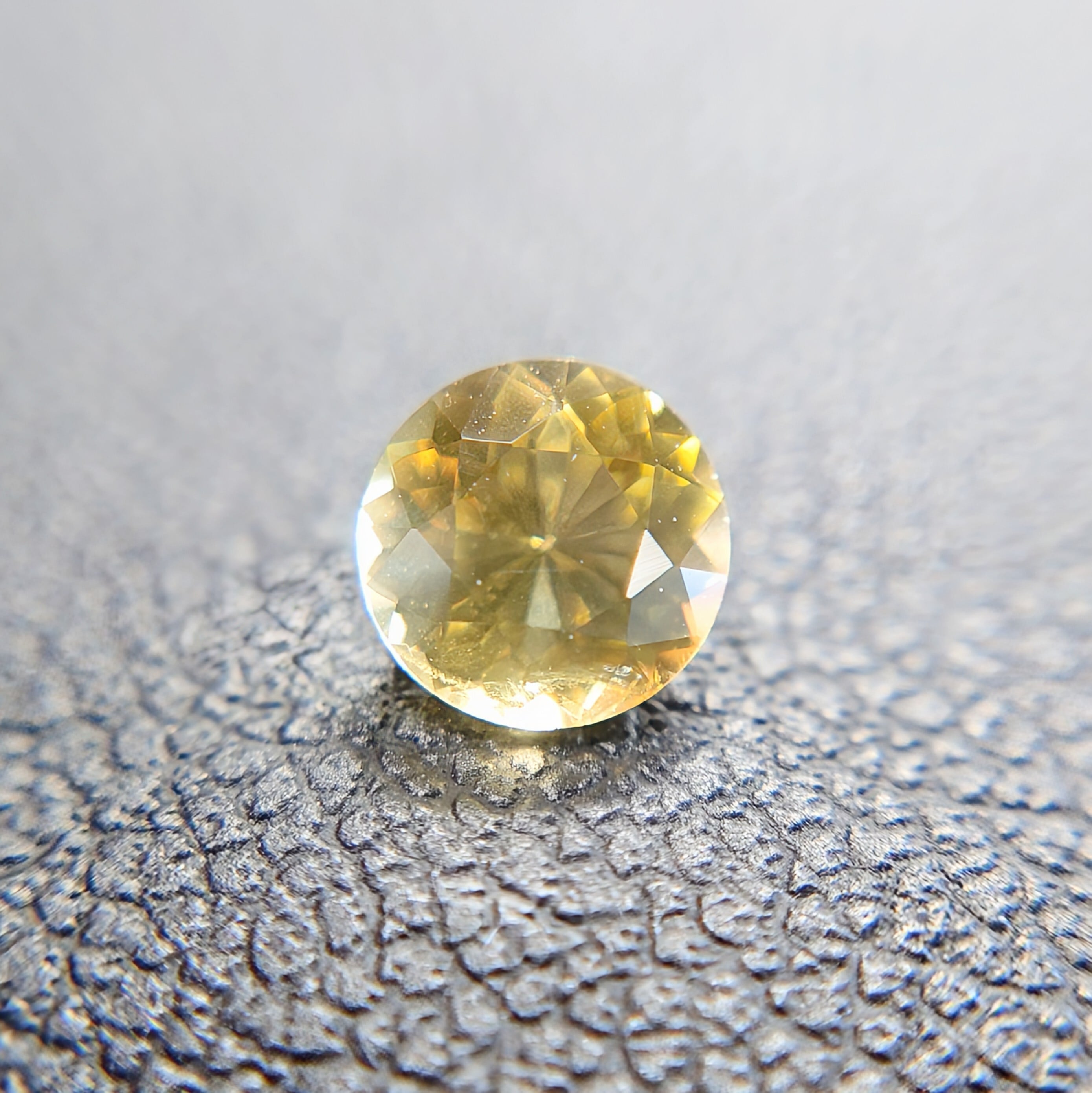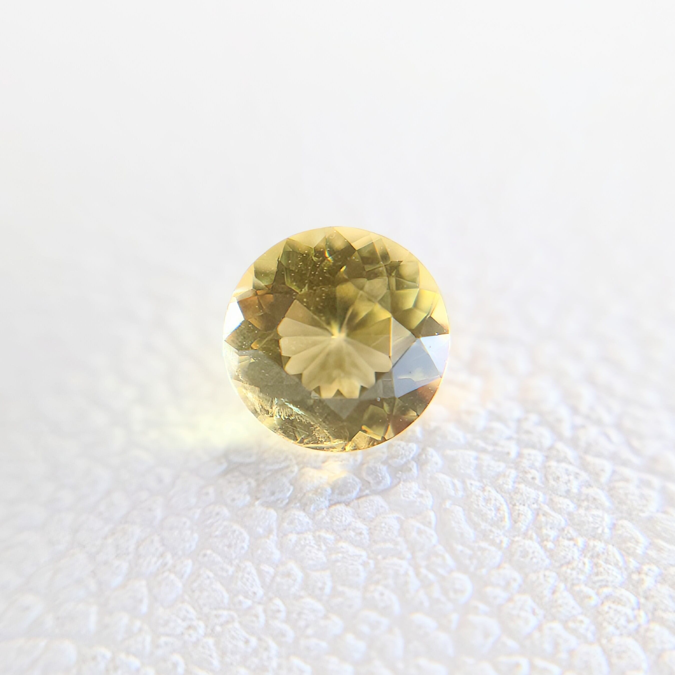 本石は、落ち着いた イエロー〜ゴールドカラー が美しく、光を受けると内部から星状に広がるようなファセットの輝きが印象的。ラウンドモディファイドブリリアントカットにより、コンドロダイト特有の温かみのある色彩と透明感がしっかりと引き出されています。