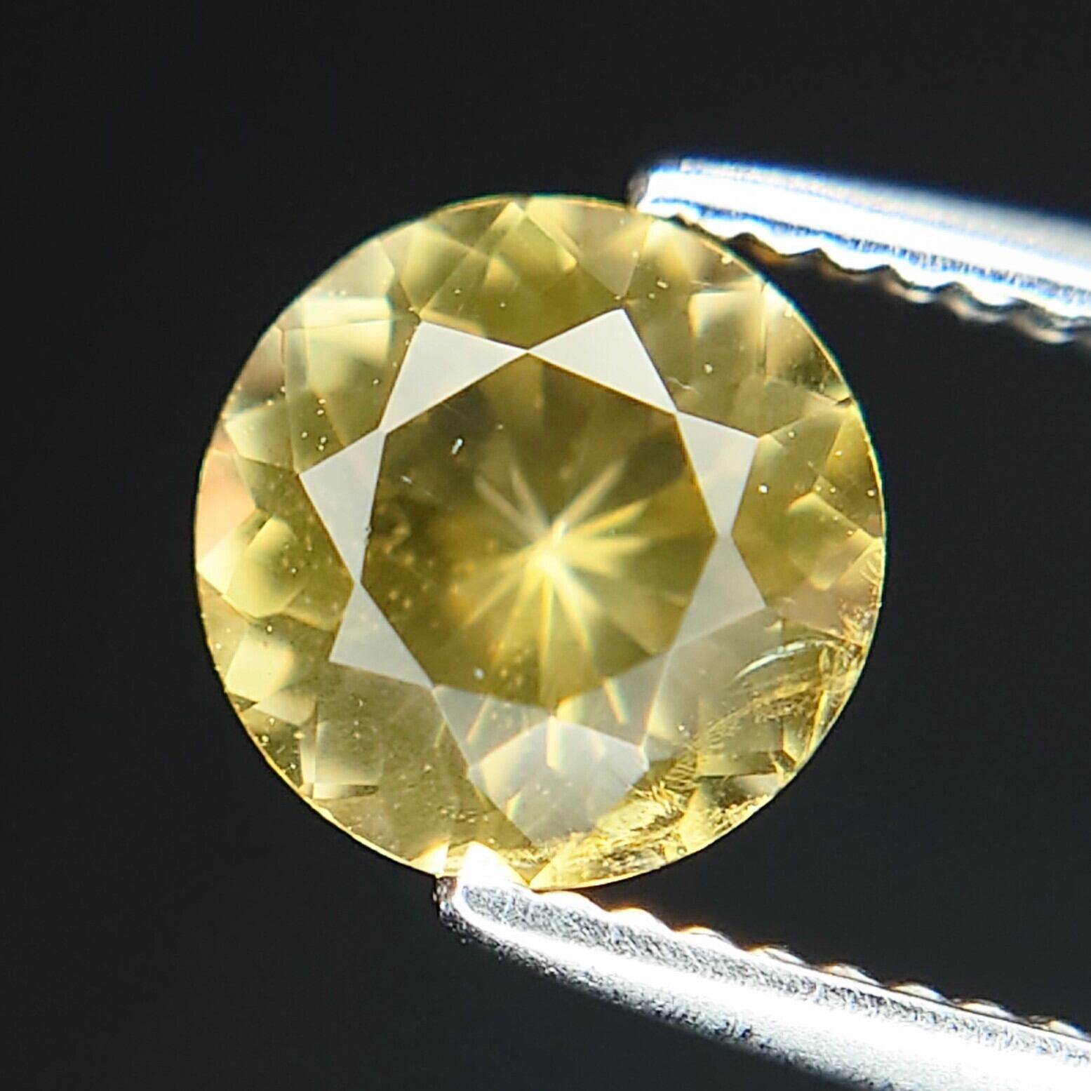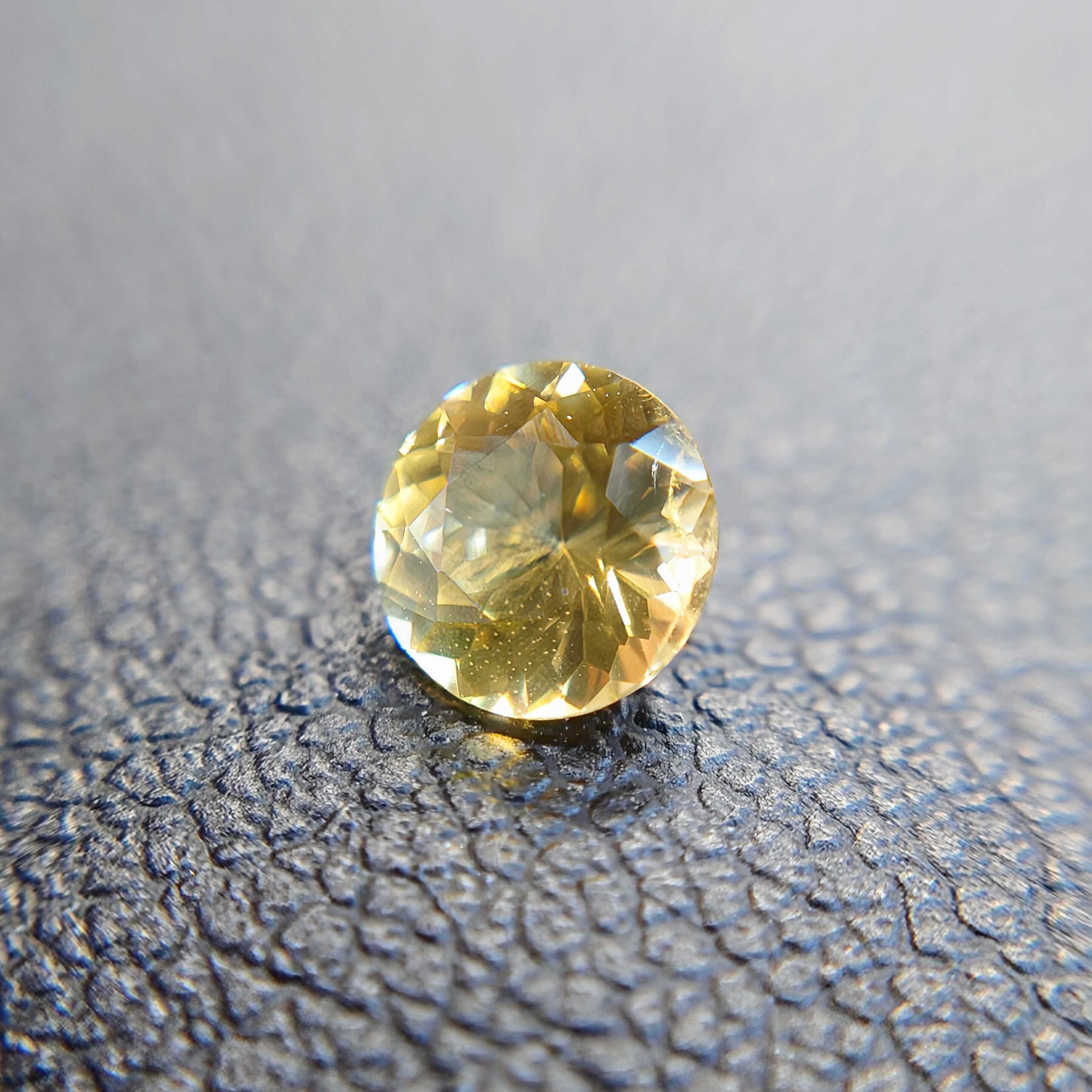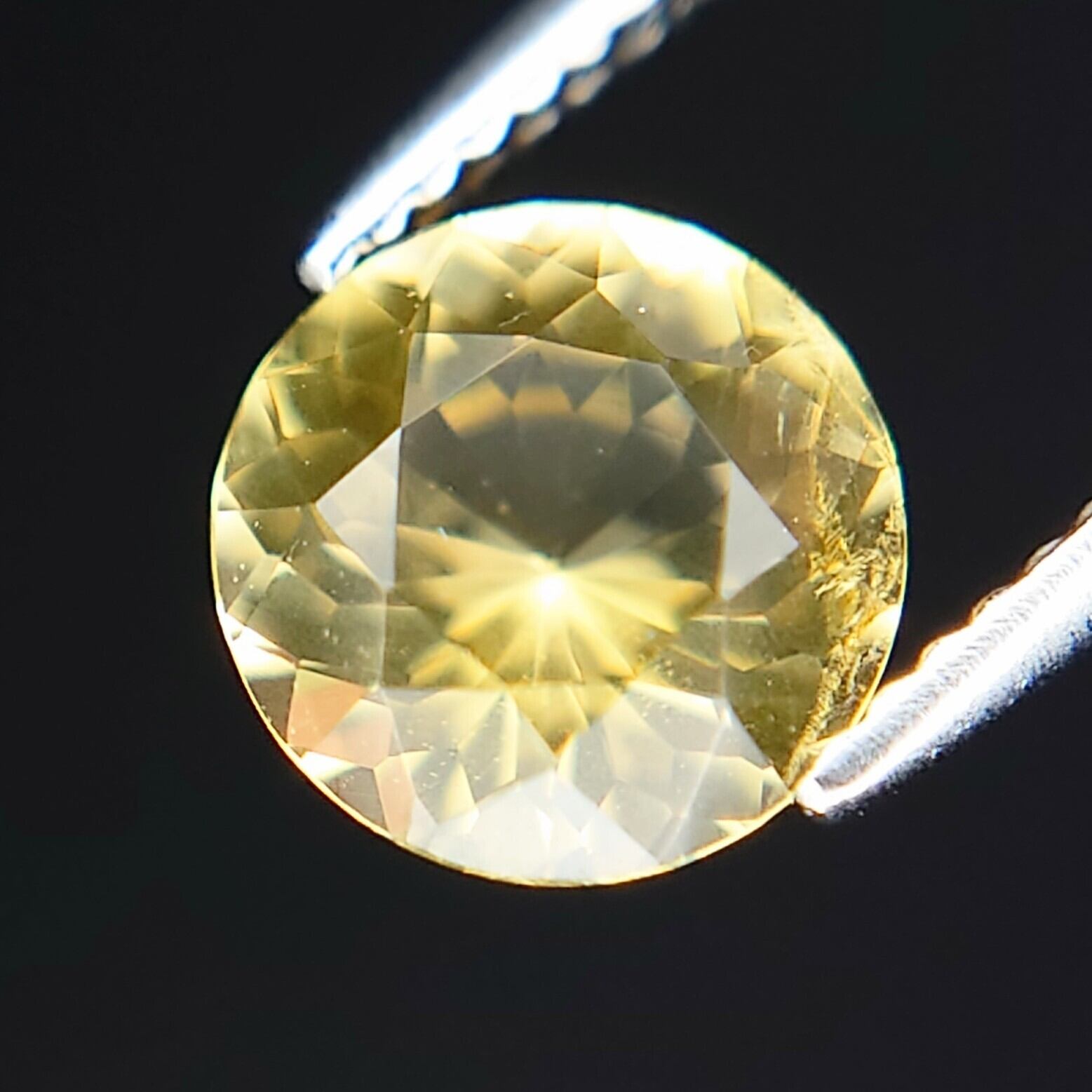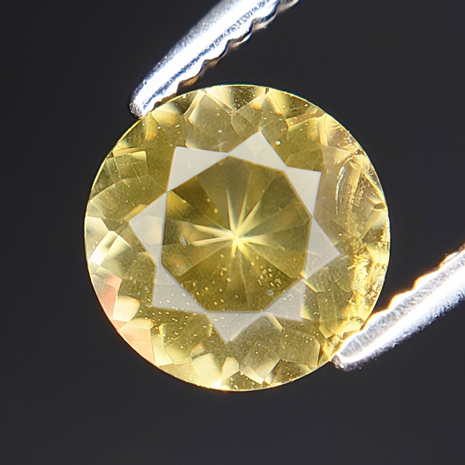 本石は、落ち着いた イエロー〜ゴールドカラー が美しく、光を受けると内部から星状に広がるようなファセットの輝きが印象的。ラウンドモディファイドブリリアントカットにより、コンドロダイト特有の温かみのある色彩と透明感がしっかりと引き出されています。